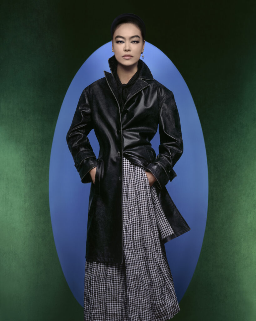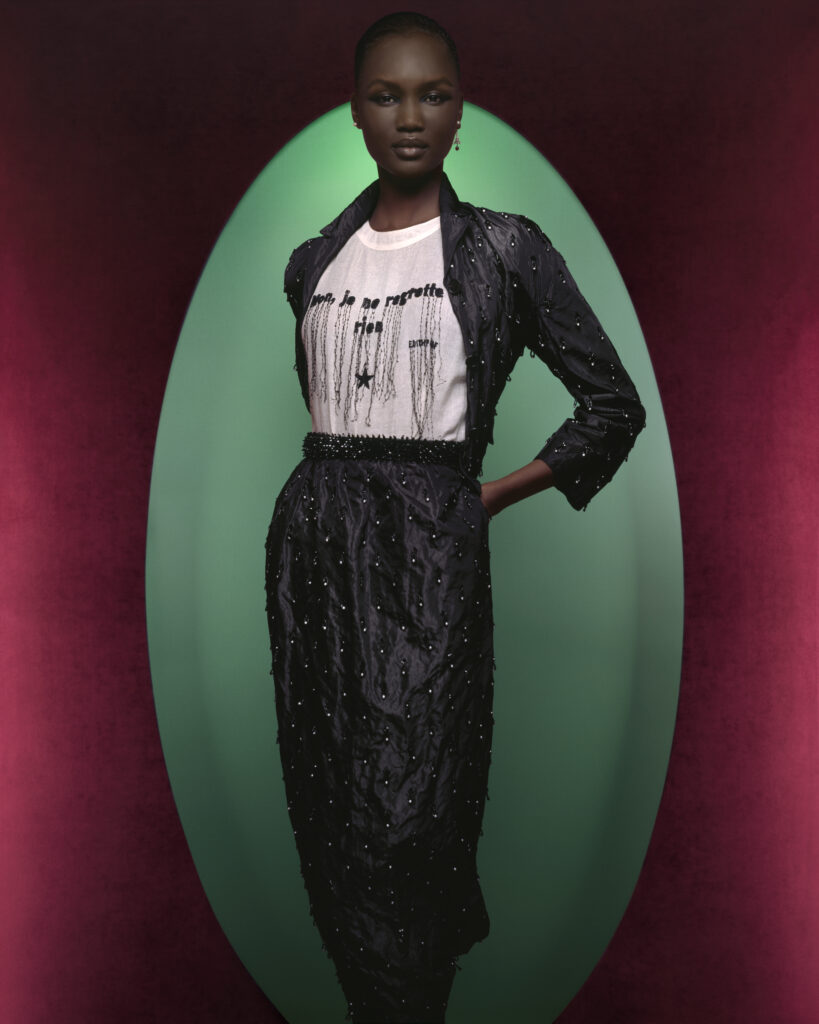 Maria Grazia Chiuri continue d’explorer, avec la ligne Dior prêt-à-porter automne-hiver 2023-2024, le rôle et l’essence du vêtement dans sa relation au(x) corps et à la mode. Redessinant les contours fondateurs du vestiaire des années 1950, la Directrice Artistique célèbre plus que jamais l’histoire de Dior et l’élégance parisienne autour de trois personnalités extraordinaires : Catherine Dior, Édith Piaf et Juliette Gréco. Des figures iconiques animées par un esprit d’indépendance, un élan d’audace et de liberté se lisant au sein d’une campagne unique. Une (re)lecture de l’allure Dior qui prend vie au gré d’une série de clichés capturés par la photographe Brigitte Niedermair*, exaltant une féminité réinventée, puissante, presque rebelle. Entre ombre et lumière, le décor, épuré et graphique, s’habille d’un jeu de couleurs vives faisant écho à celles ponctuant subtilement la collection – rubis, émeraude, bleu – qui contrastent avec les déclinaisons de noir magnifiant les créations. Les looks racontent cette rencontre symbolique entre un travail précis de référence aux archives et le désir d’innovation cher à la Maison. Les modèles allient passé et futur : les motifs léopard et pied-de-poule – codes Dior éternels –, parent des manteaux, mais aussi des jupes longues, tandis que des tissus froissés, structurés de fils métalliques, subliment les tenues, reflétant ainsi l’inventivité sans cesse renouvelée des Ateliers.
