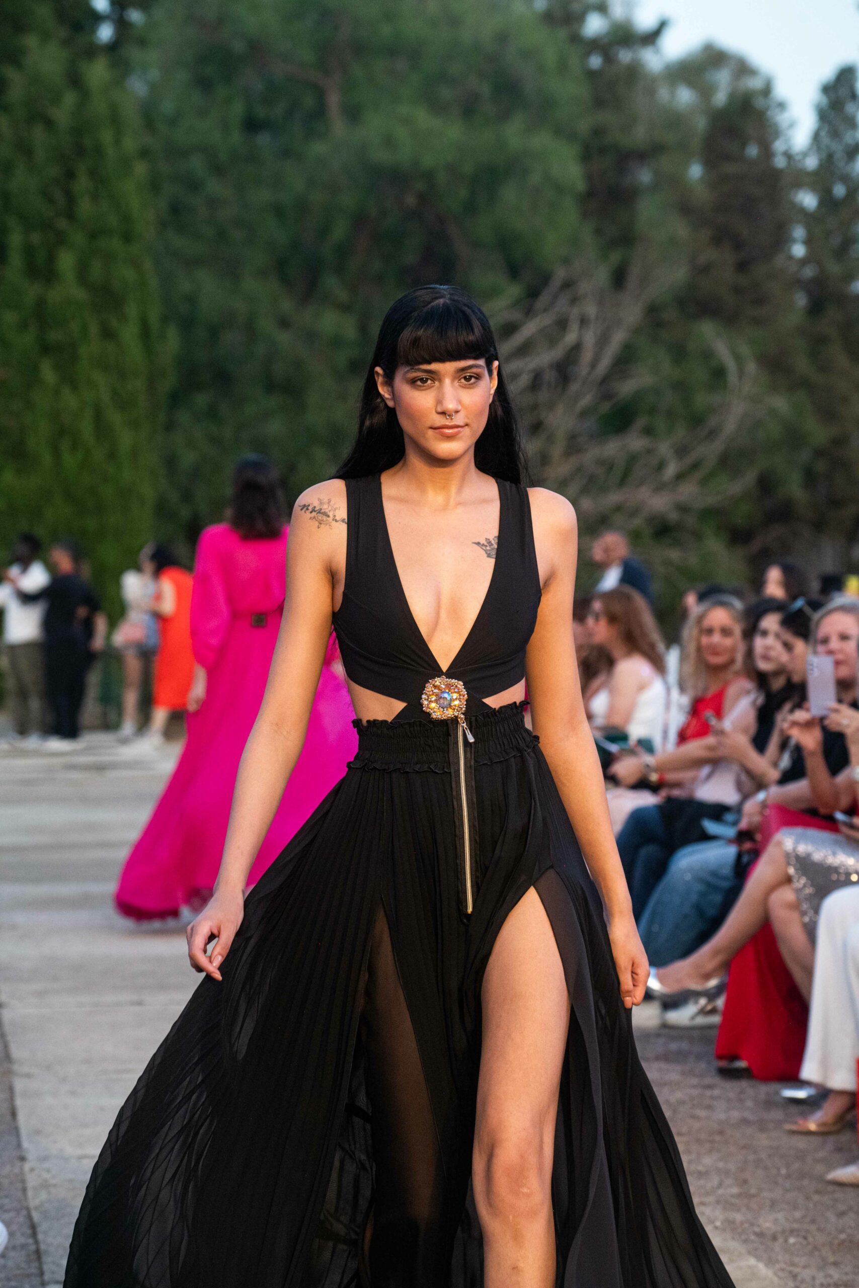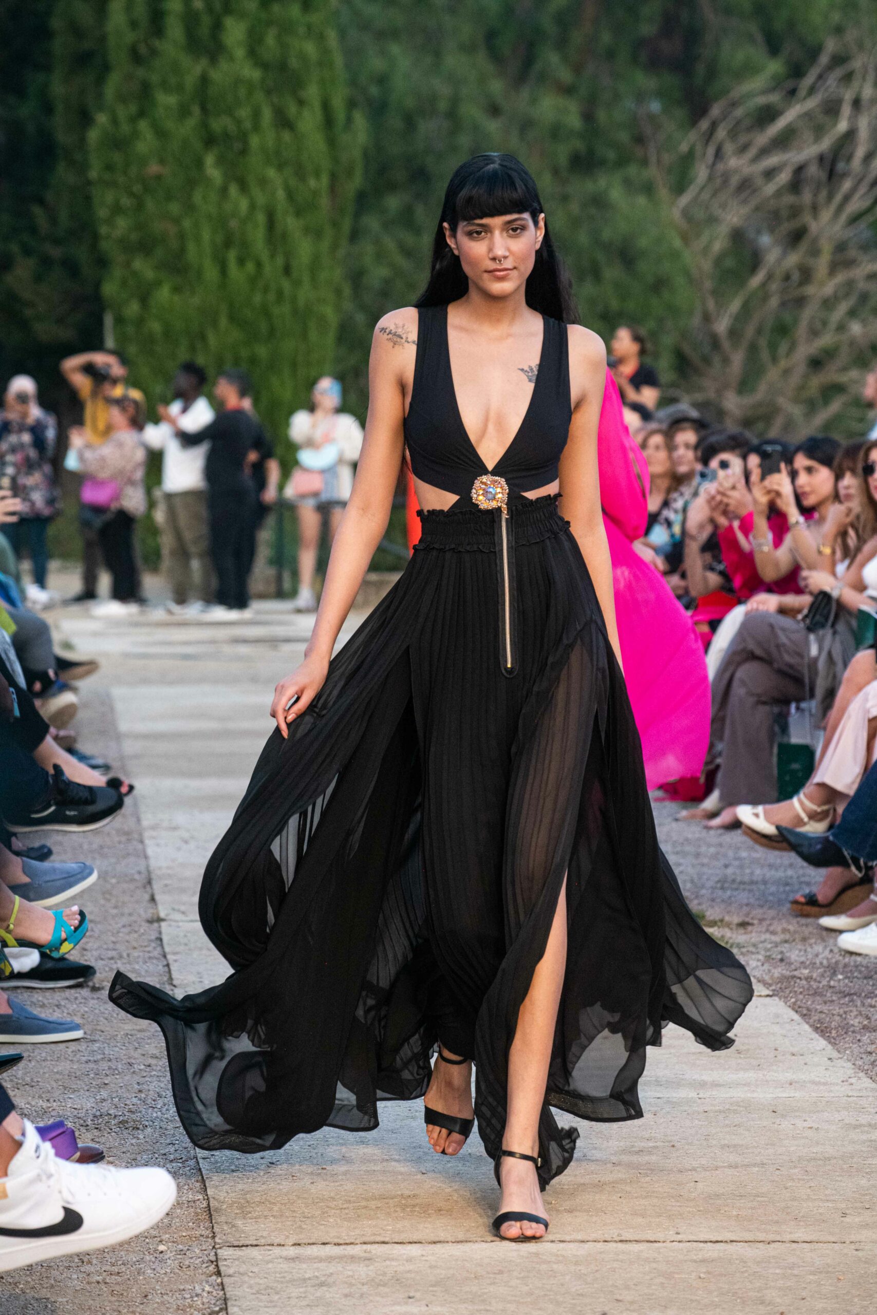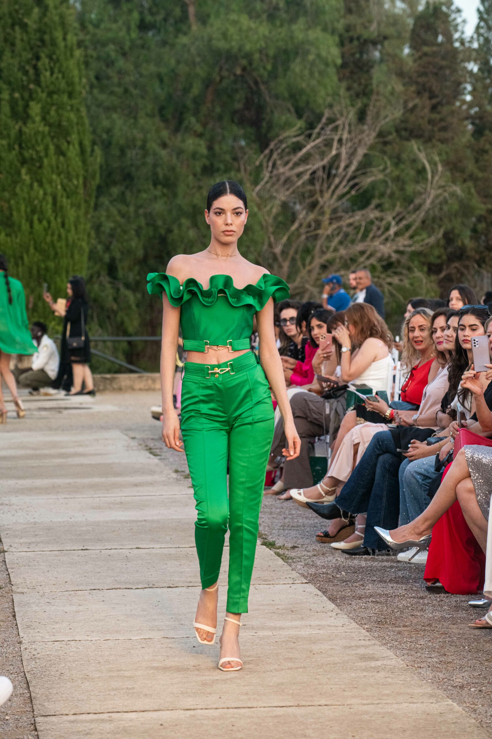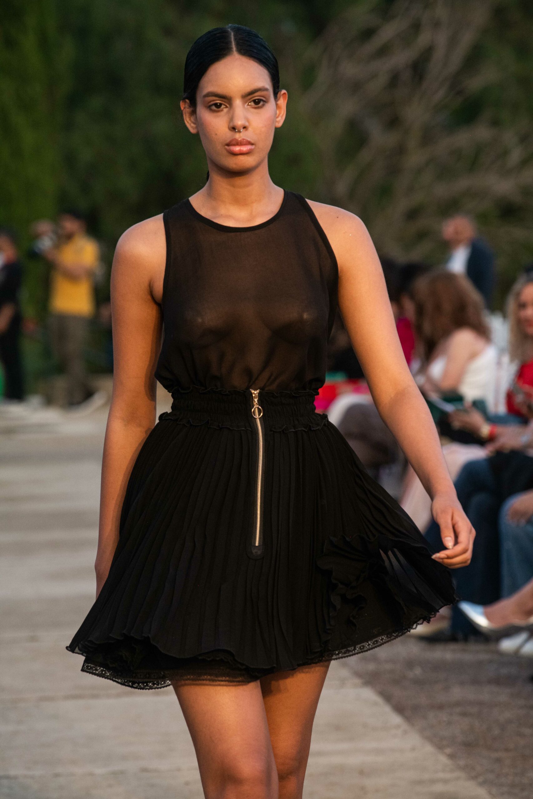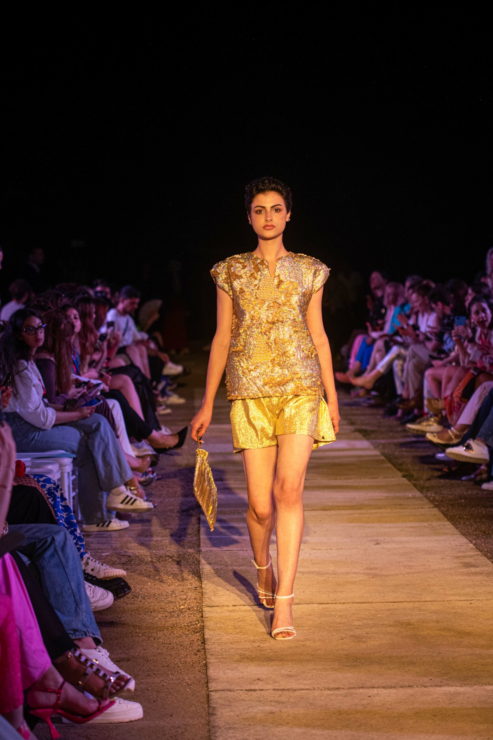 Cependant, ce qui diffère de ces dernières années, après deux ans de présence dans le désert de Tozeur, est l’influence orientale. Cela est particulièrement visible dans les premiers rangs, largement occupés par des influenceuses ou des VIP qui renouvellent le genre en recourant à une esthétique influencée par le modèle libanais.