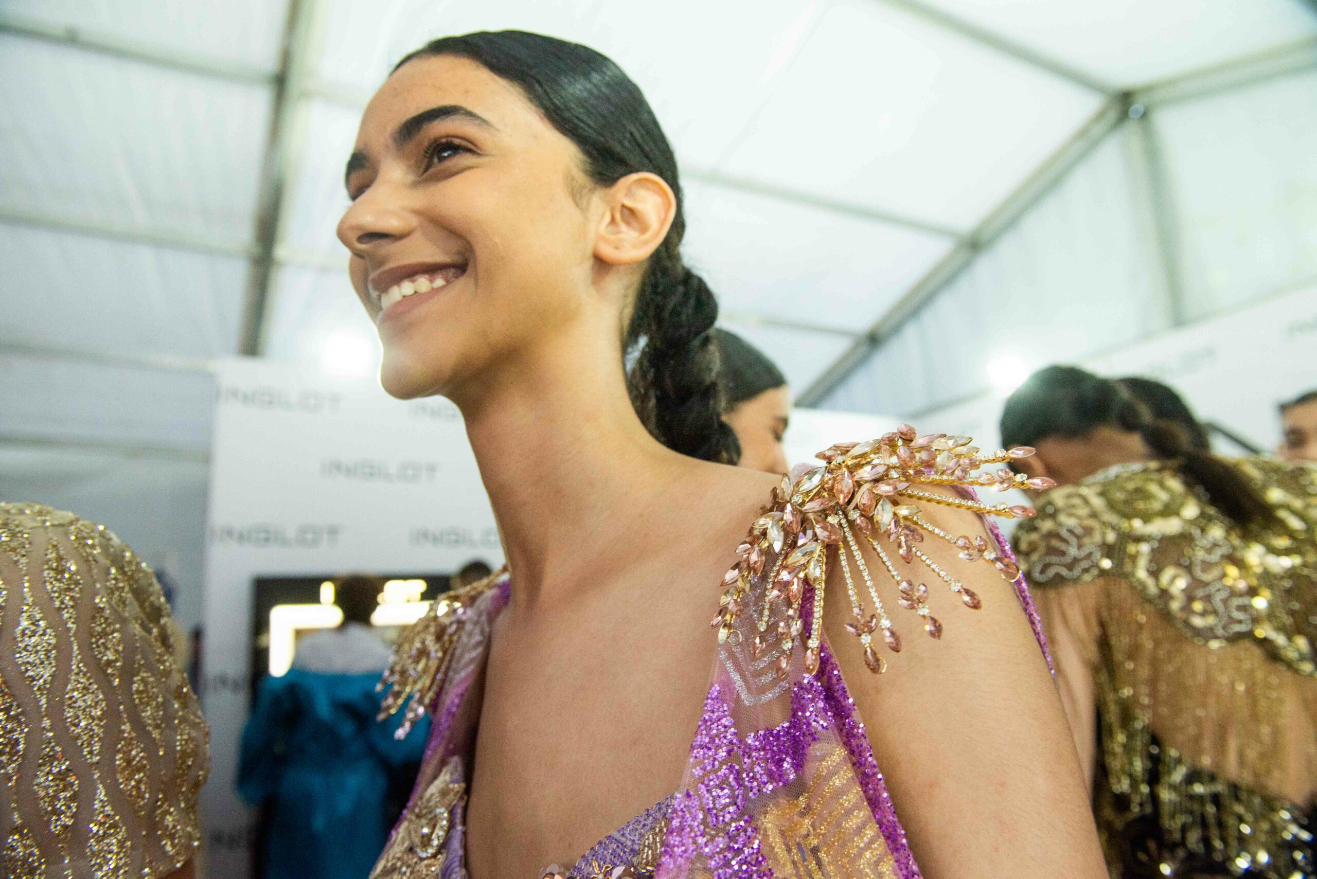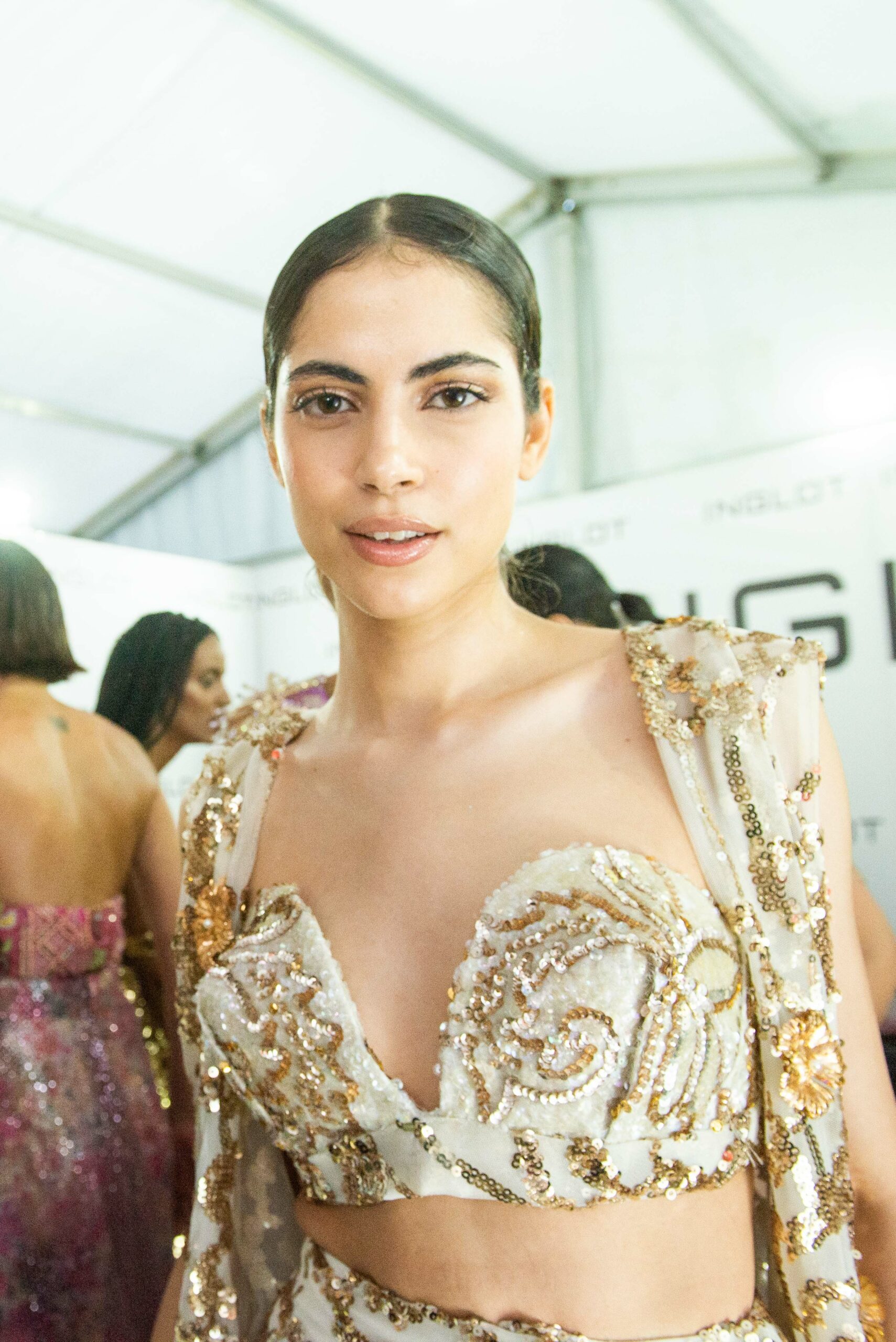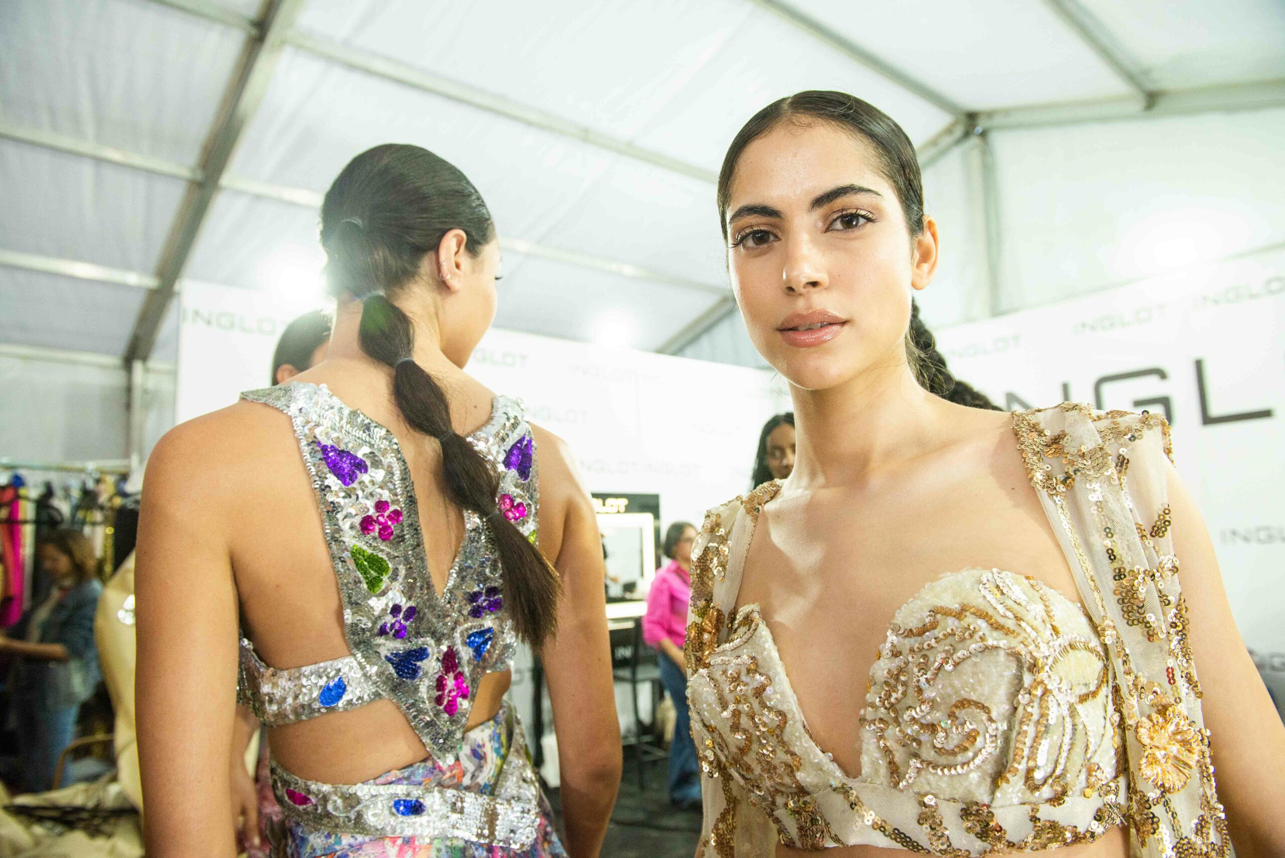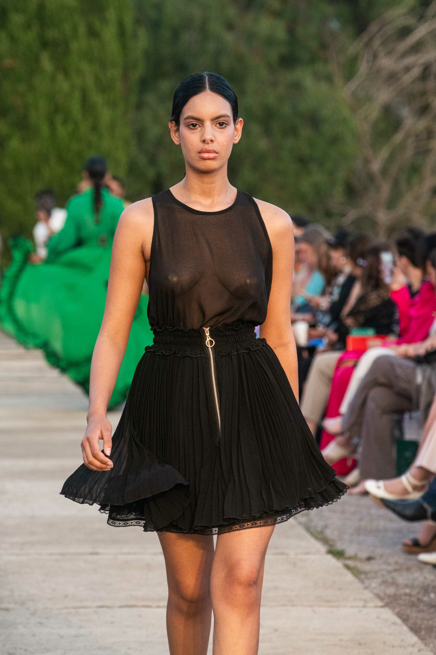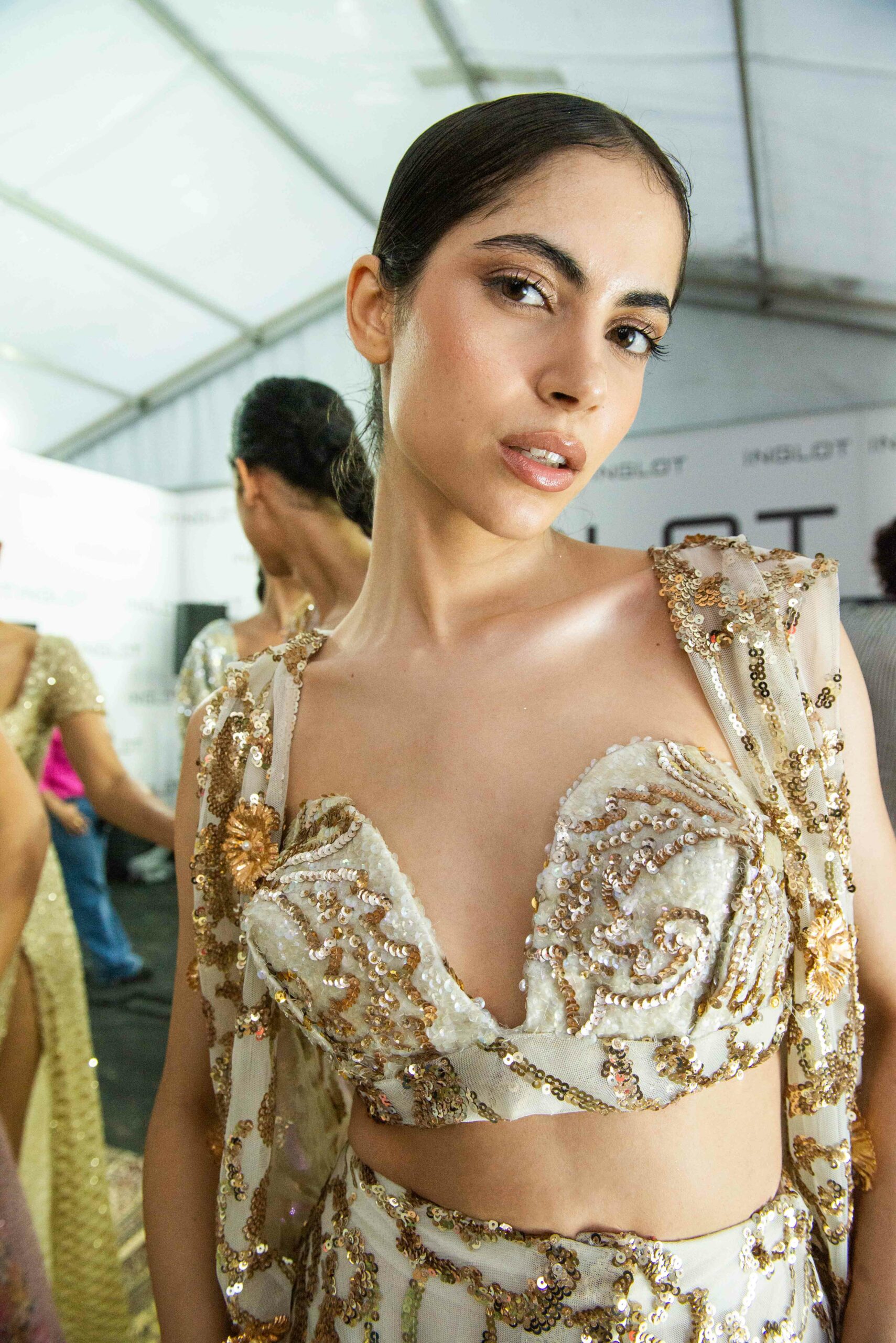 Cependant, ce qui diffère de ces dernières années, après deux ans de présence dans le désert de Tozeur, est l’influence orientale. Cela est particulièrement visible dans les premiers rangs, largement occupés par des influenceuses ou des VIP qui renouvellent le genre en recourant à une esthétique influencée par le modèle libanais.