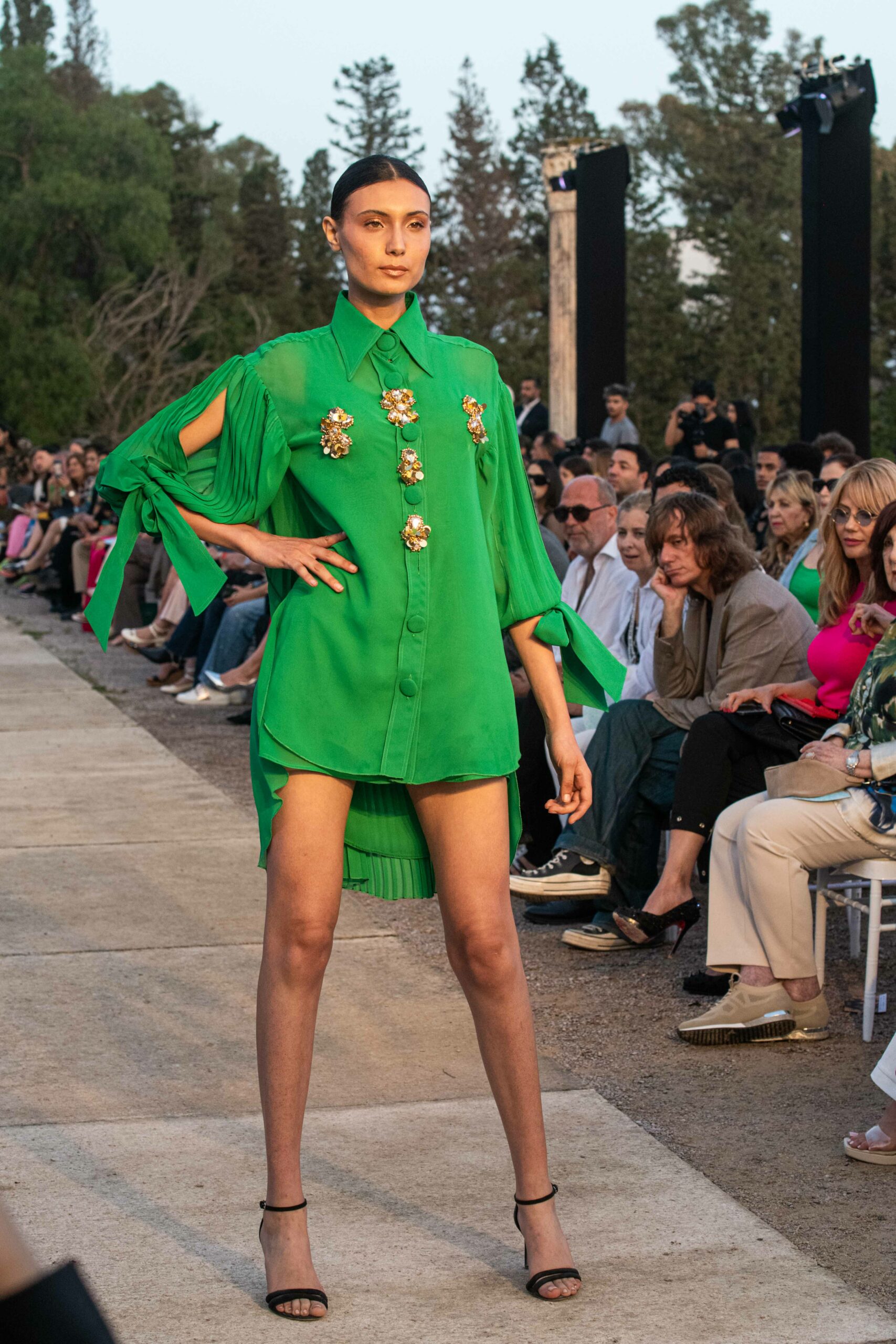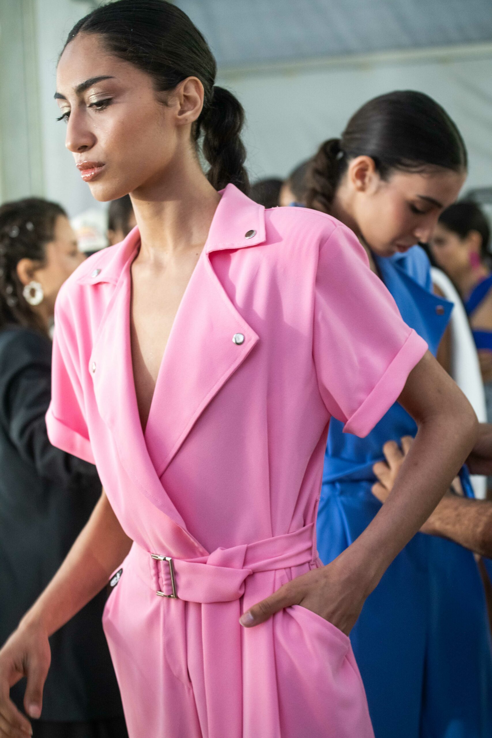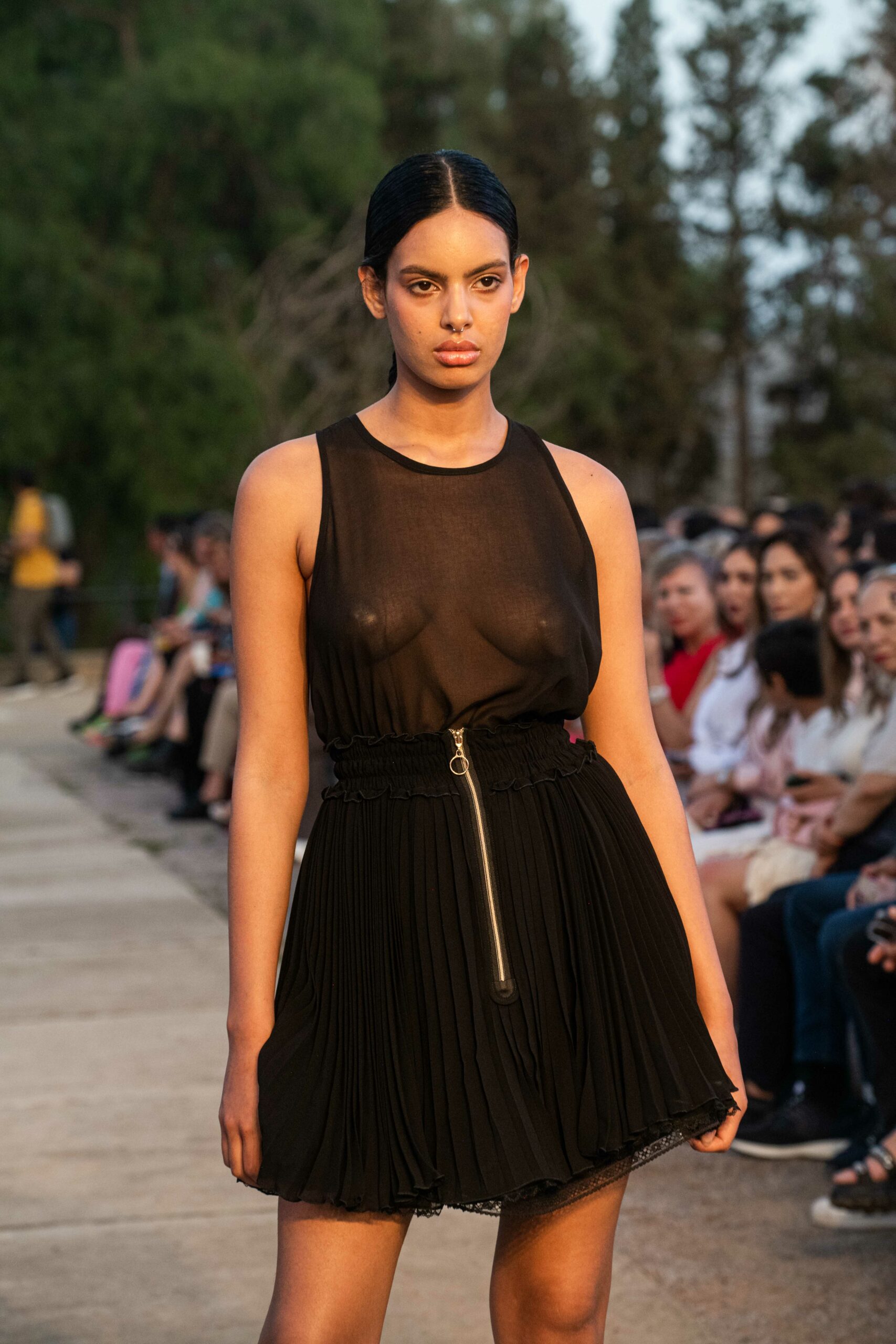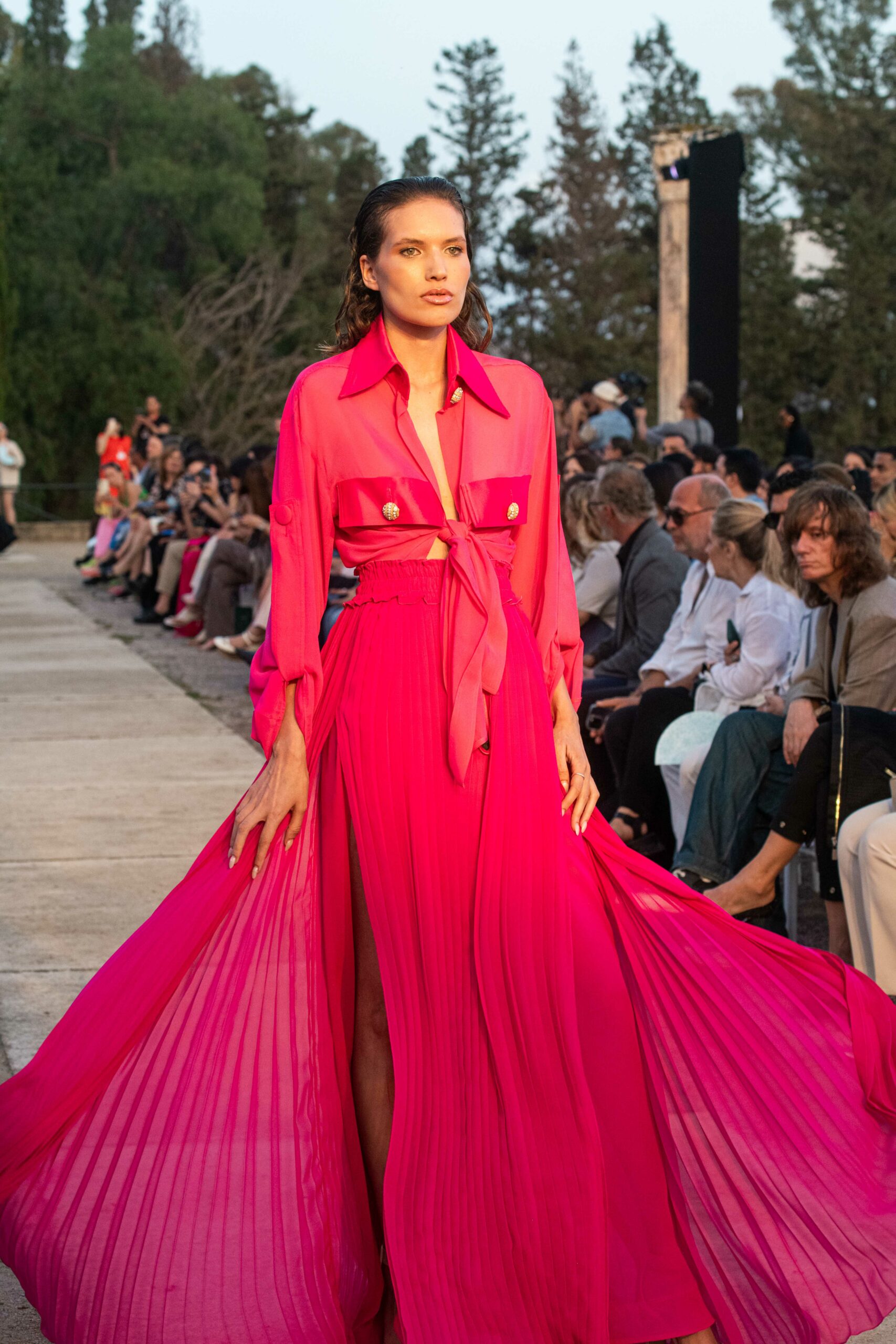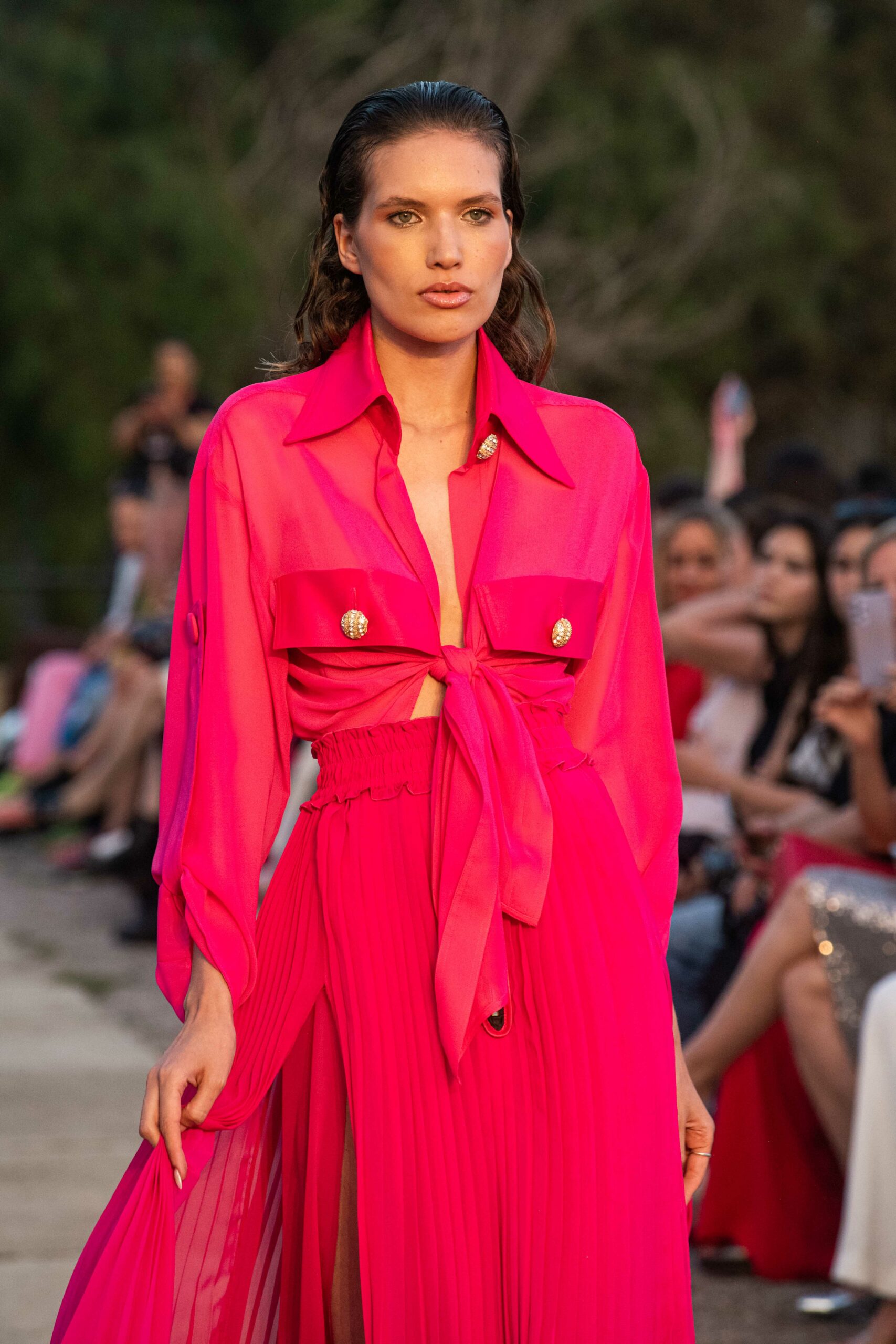 Cependant, ce qui diffère de ces dernières années, après deux ans de présence dans le désert de Tozeur, est l’influence orientale. Cela est particulièrement visible dans les premiers rangs, largement occupés par des influenceuses ou des VIP qui renouvellent le genre en recourant à une esthétique influencée par le modèle libanais.
