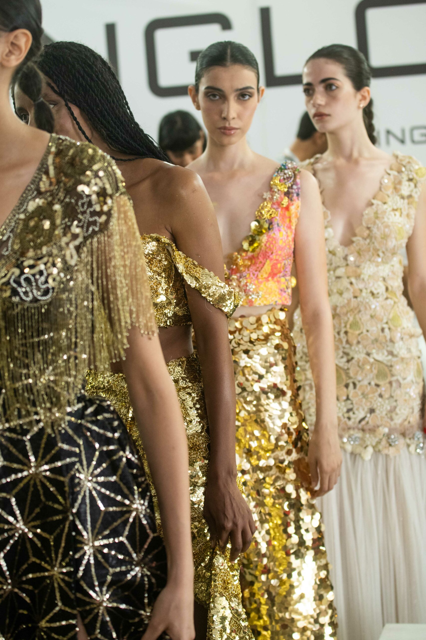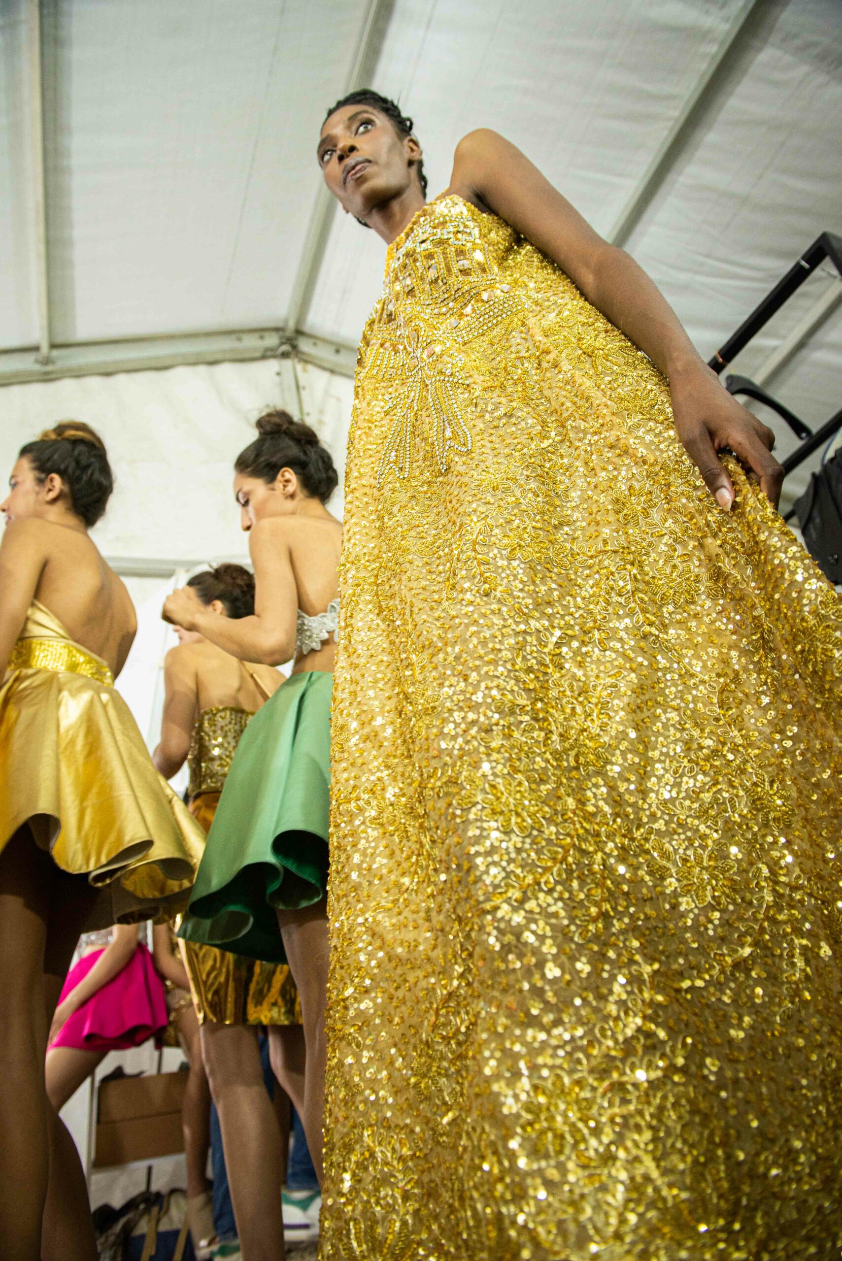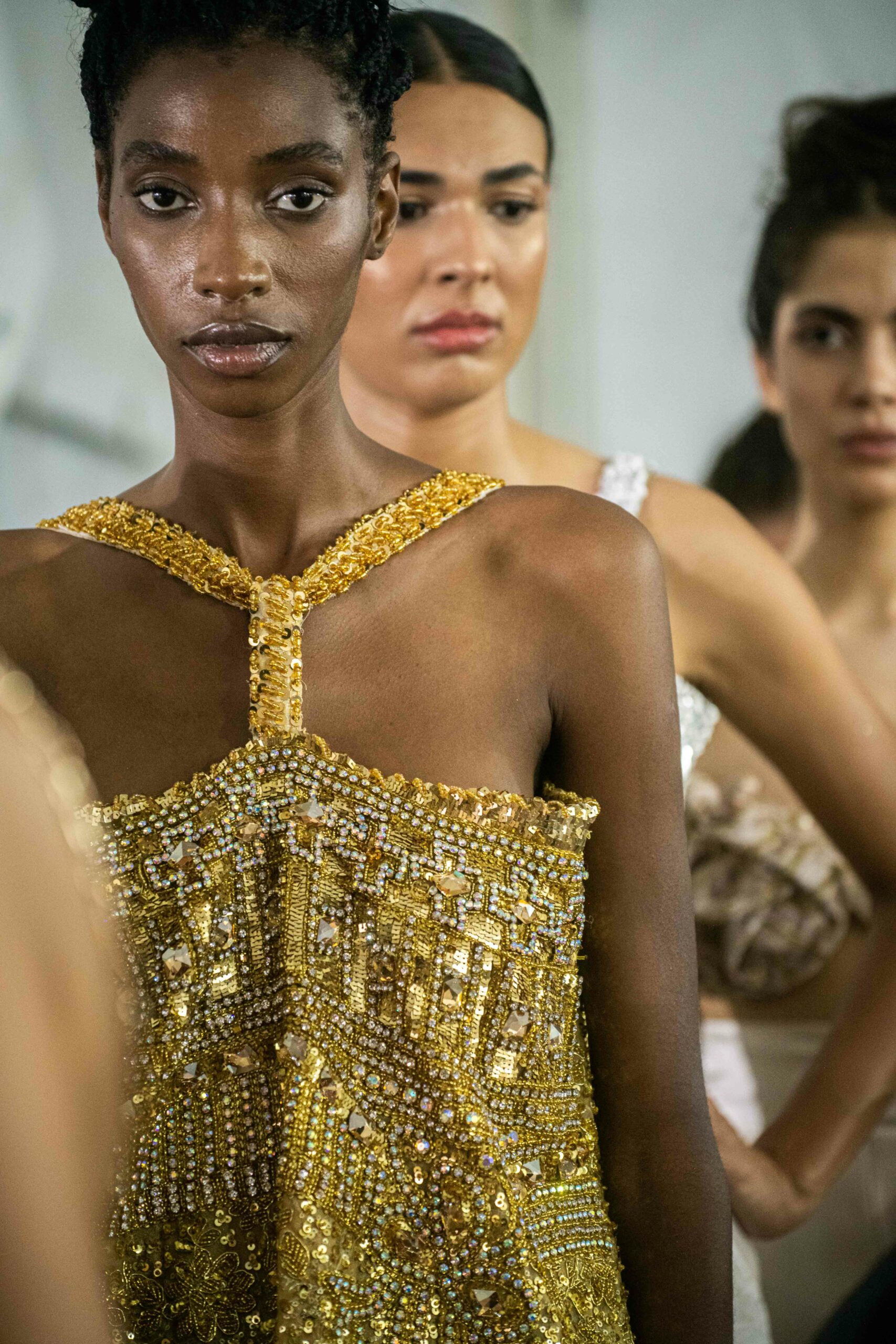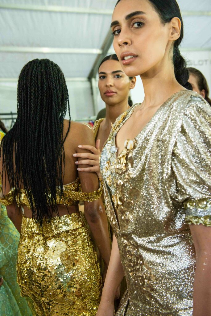 Sans doute inspirés par le succès d’Ali Karoui, créateur phare de la nouvelle génération basé à Dubaï, et sans aucun doute conscients des difficultés de pénétrer le marché occidental quand l’outil de production n’est pas adapté, certains créateurs ont présenté, plus que jamais auparavant, des tenues dorées, des matières scintillantes, des strass et d’autres éléments esthétiques propres à séduire les riches femmes algériennes, marocaines, saoudiennes, etc.