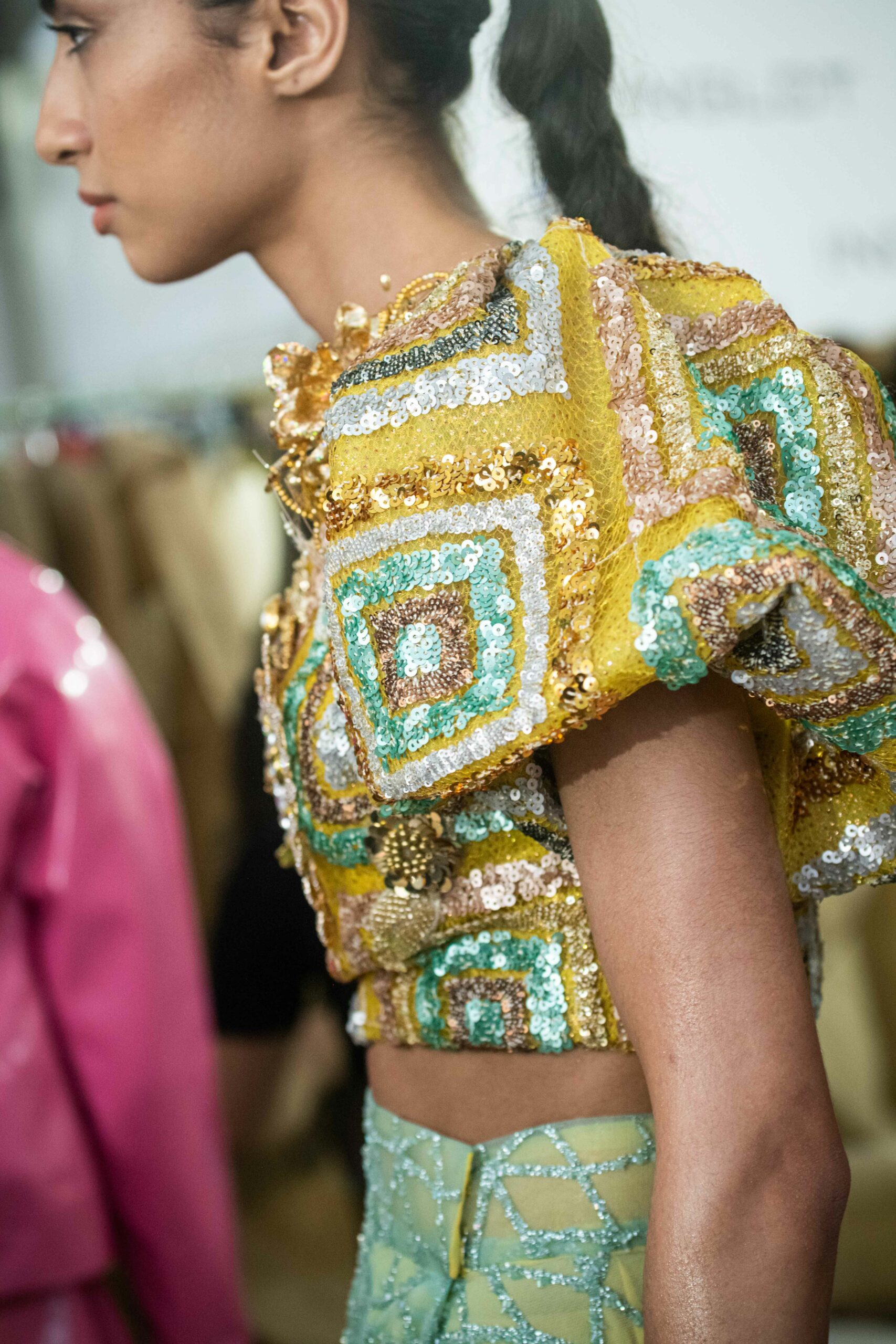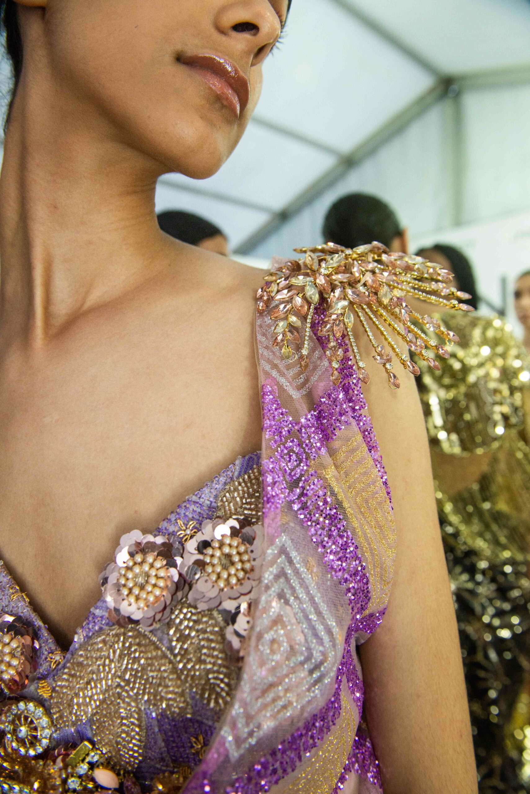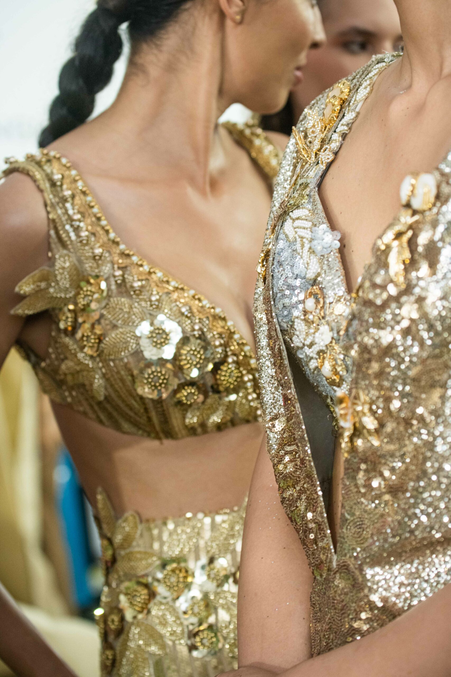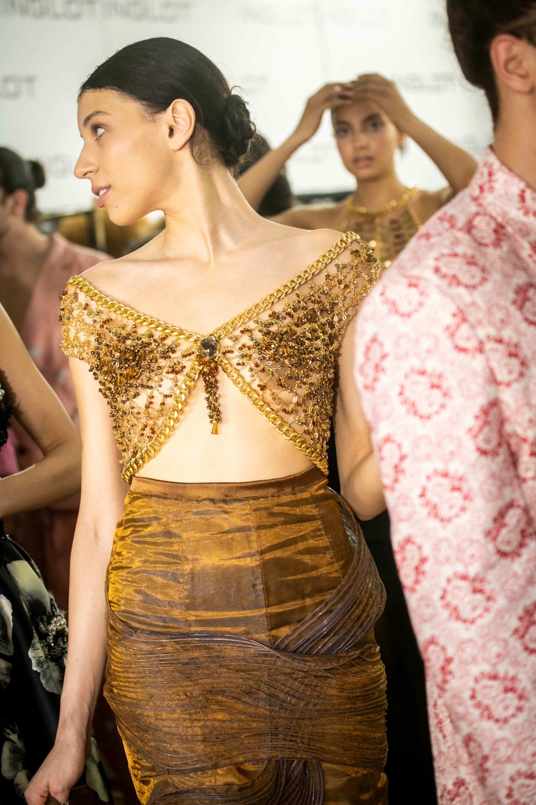 Sans doute inspirés par le succès d’Ali Karoui, créateur phare de la nouvelle génération basé à Dubaï, et sans aucun doute conscients des difficultés de pénétrer le marché occidental quand l’outil de production n’est pas adapté, certains créateurs ont présenté, plus que jamais auparavant, des tenues dorées, des matières scintillantes, des strass et d’autres éléments esthétiques propres à séduire les riches femmes algériennes, marocaines, saoudiennes, etc.