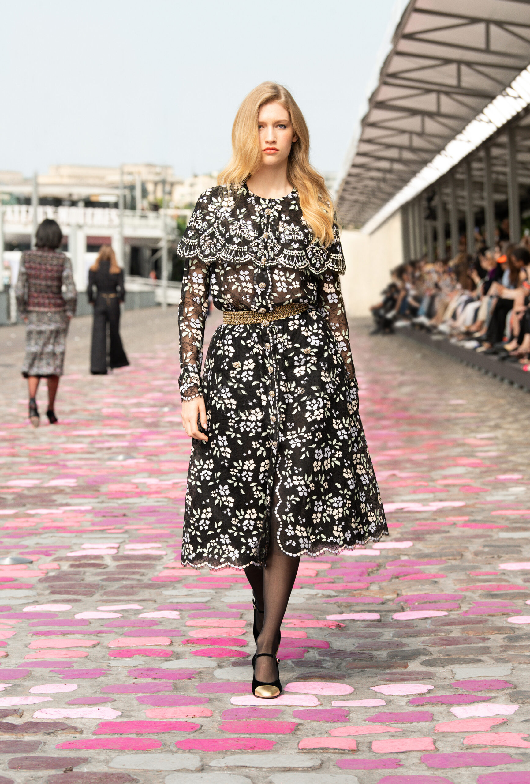 Ce que la Parisienne porte, lit ou pense, ainsi que son attitude face à la vie, sont scrutés et étudiés de près. Aux quatre coins du monde, que ce soit par opposition ou imitation, son modèle en inspire d’autres. Son allure voyage à travers le cinéma, la littérature, la musique, se réinventant de collection en collection. Dans cette collection, l’assemblage de tweeds, de mousselines de soie, d’organzas et de dentelles incrustées, ainsi que la composition de motifs floraux et graphiques, témoignent de l’effervescence d’un univers créatif riche et féminin.
