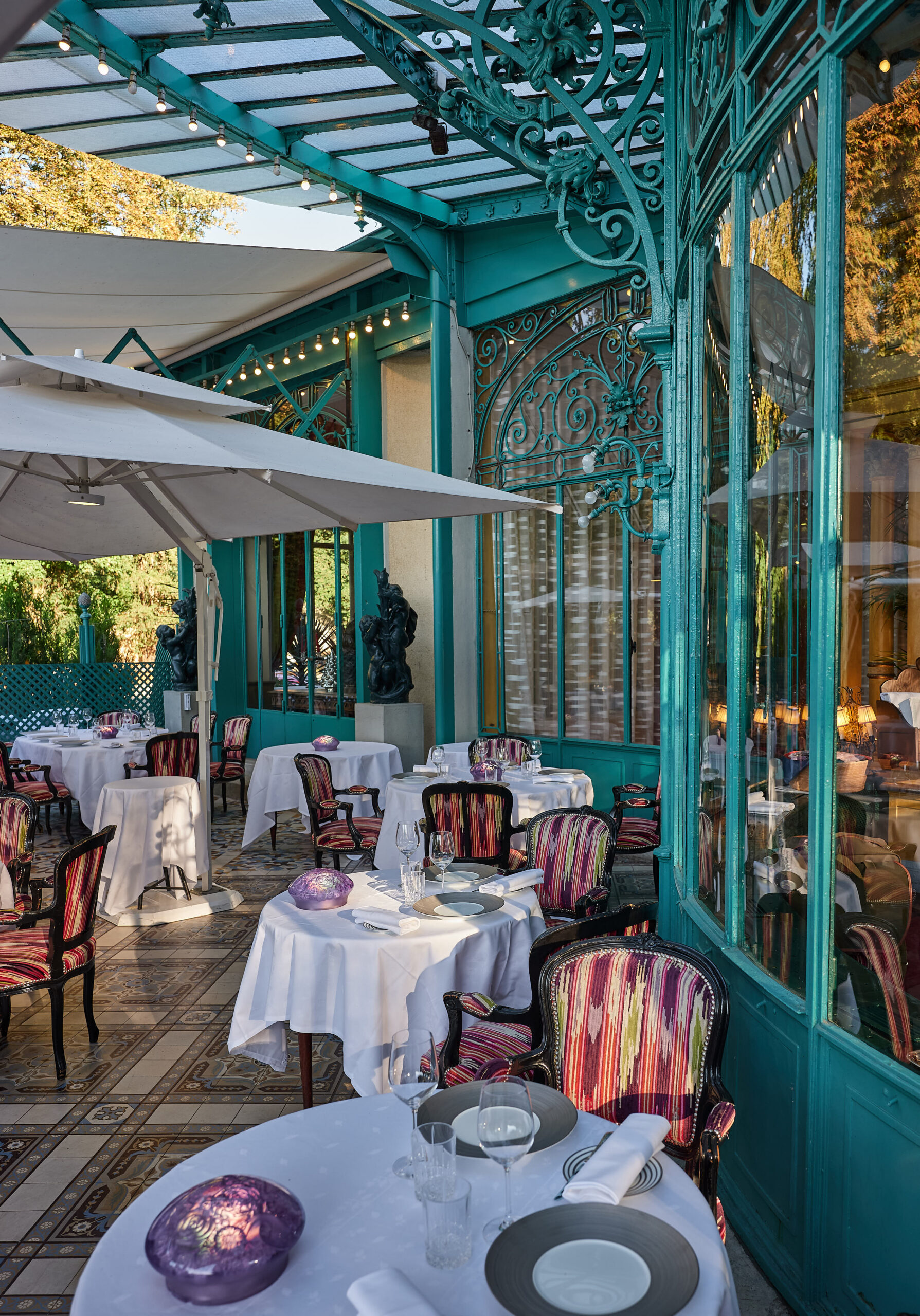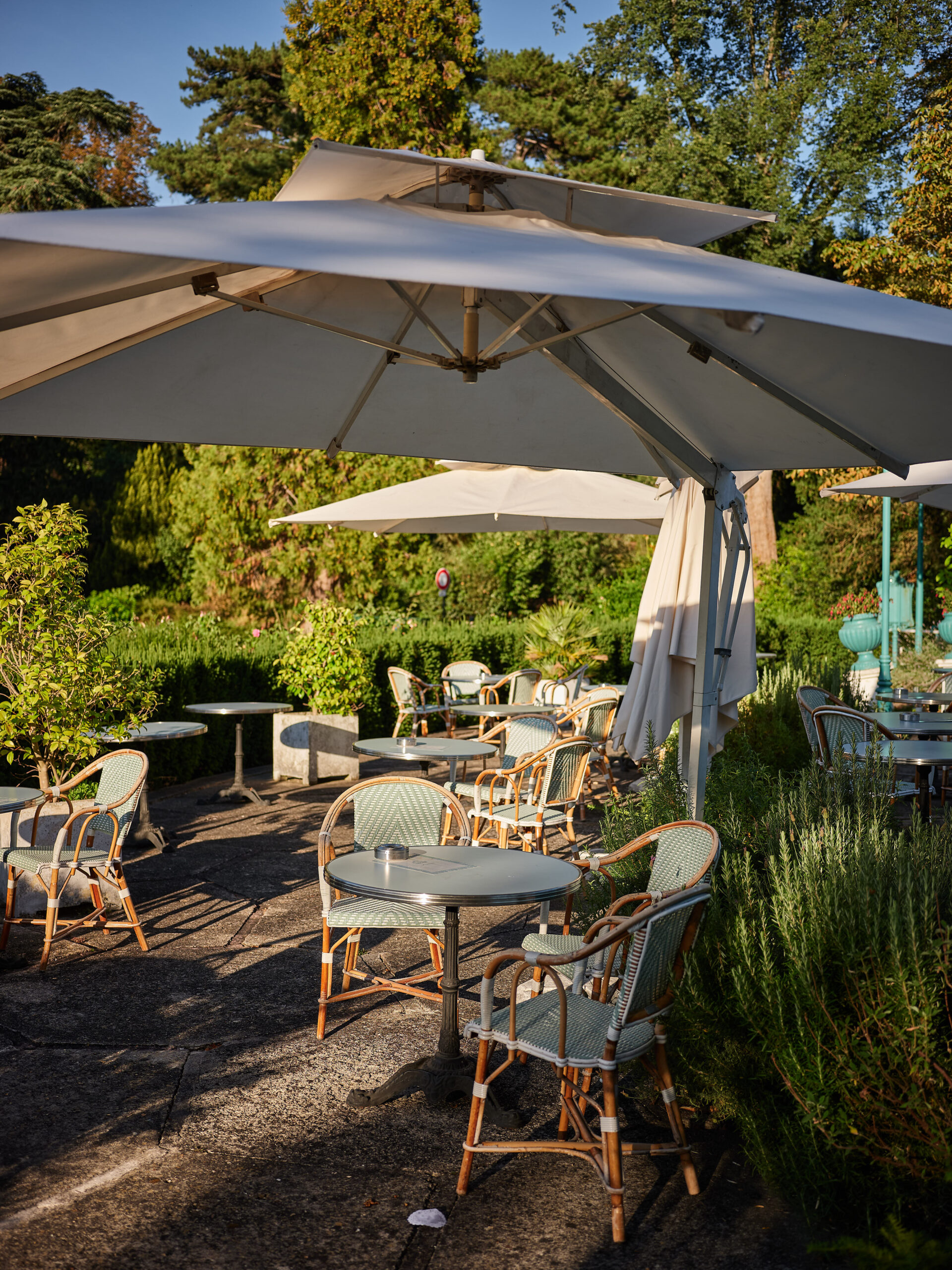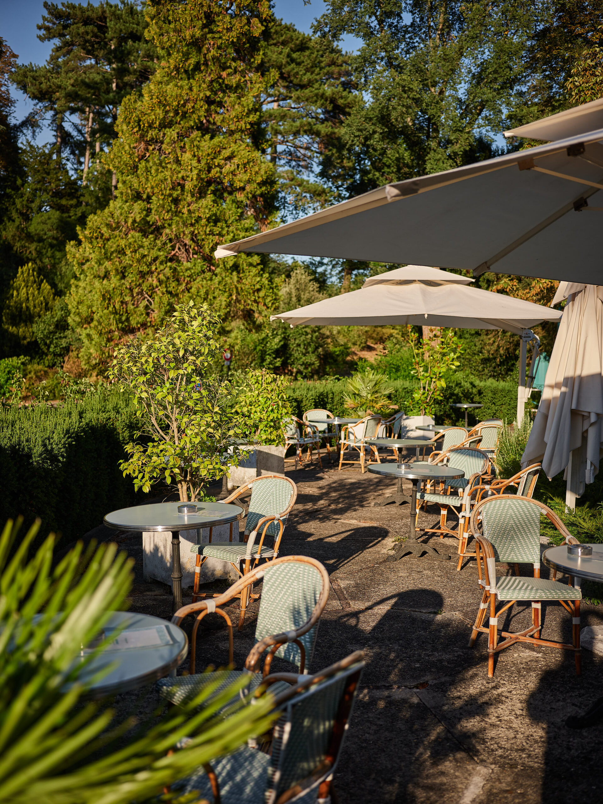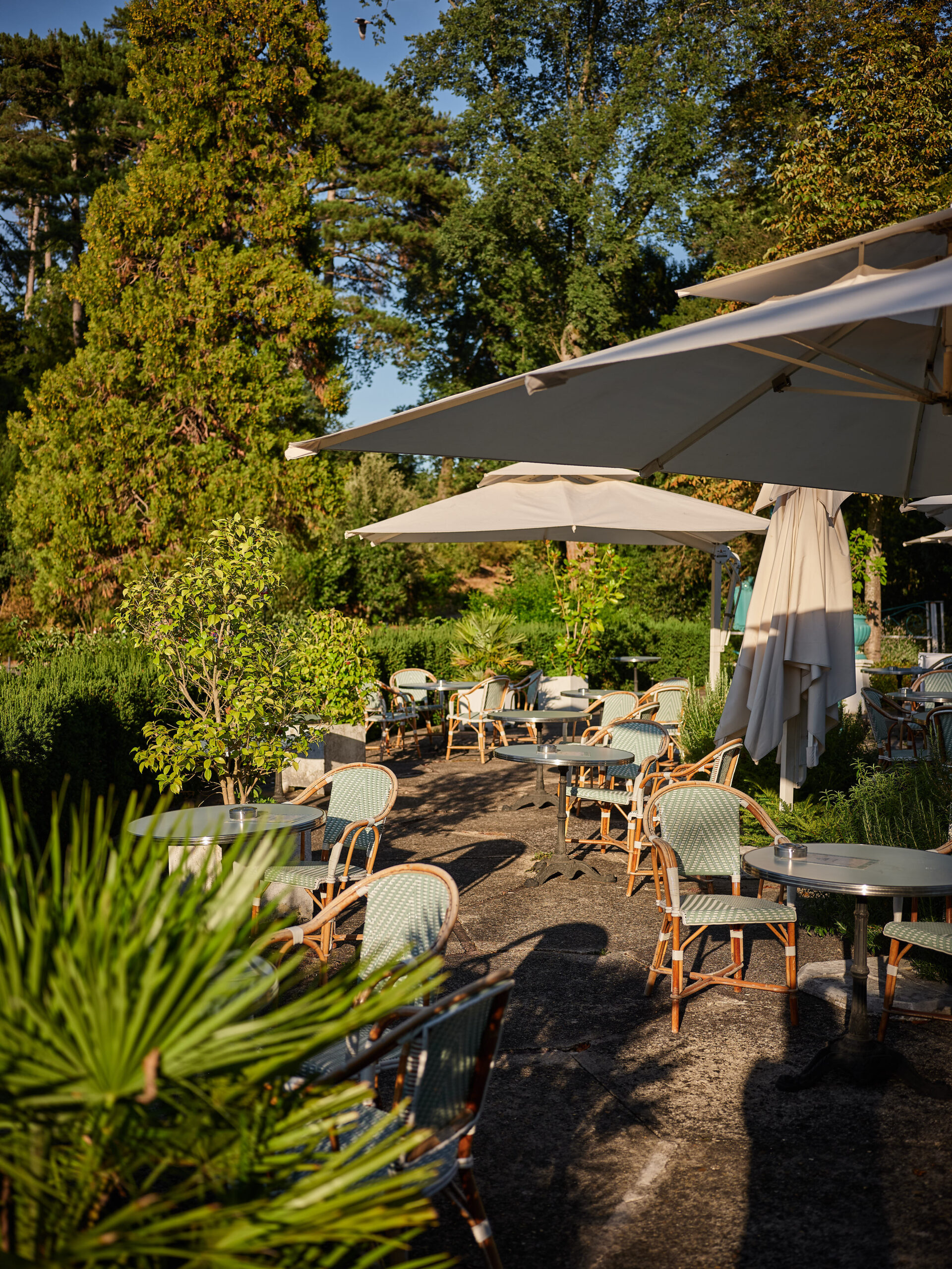 En été, le restaurant s’ouvre vers l’extérieur, la terrasse devient le cœur de l’établissement, offrant aux convives une parenthèse enchantée baignée de soleil. À quelques mètres, l’eau de la cascade ruisselle, tandis que la végétation luxuriante du Bois de Boulogne et le calme environnant procurent un sentiment d’isolement bienvenu loin du tumulte de la ville.