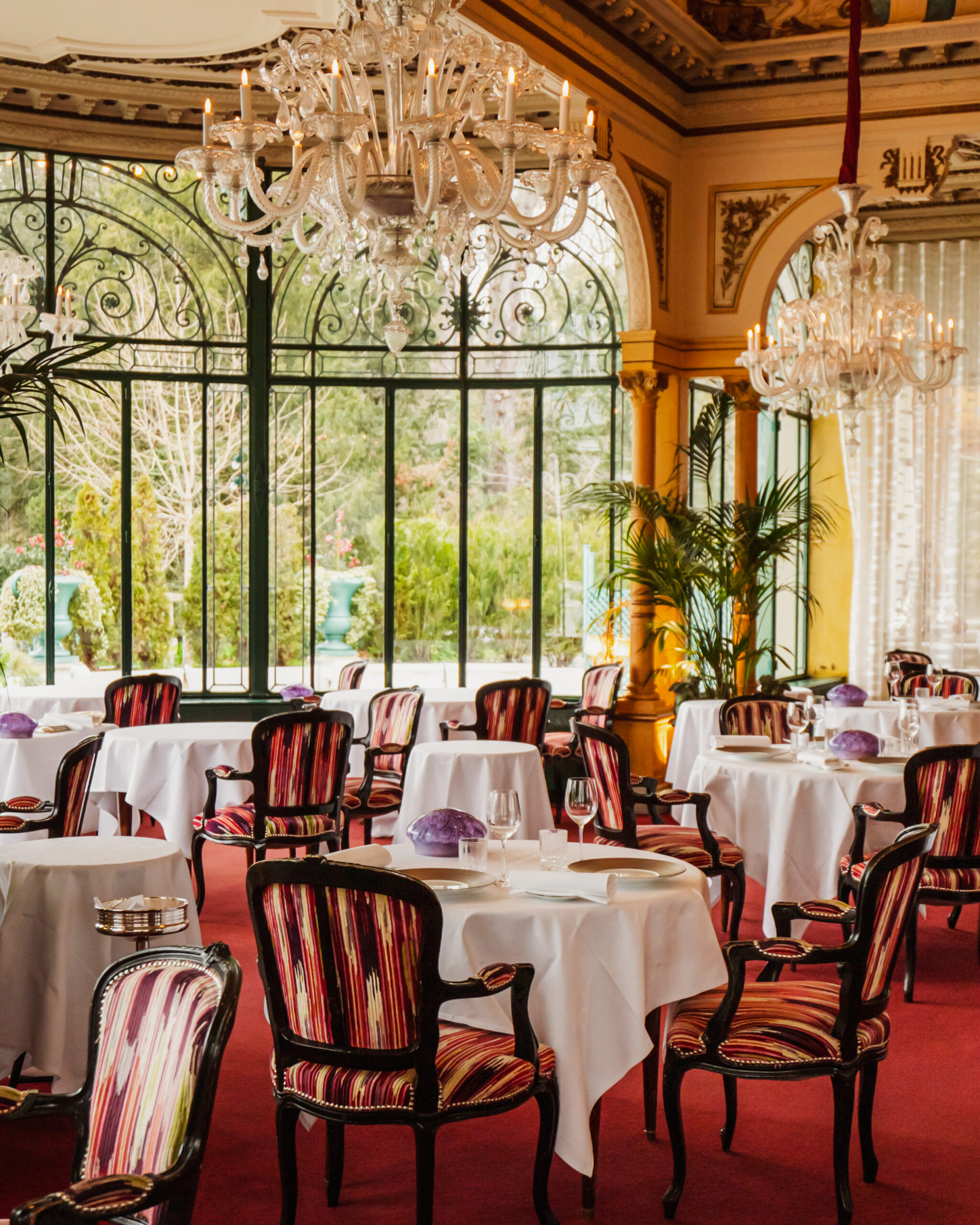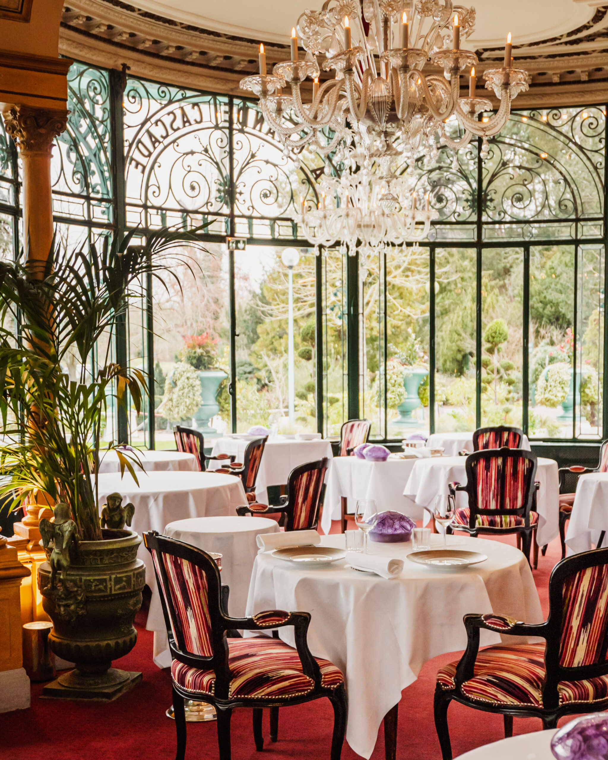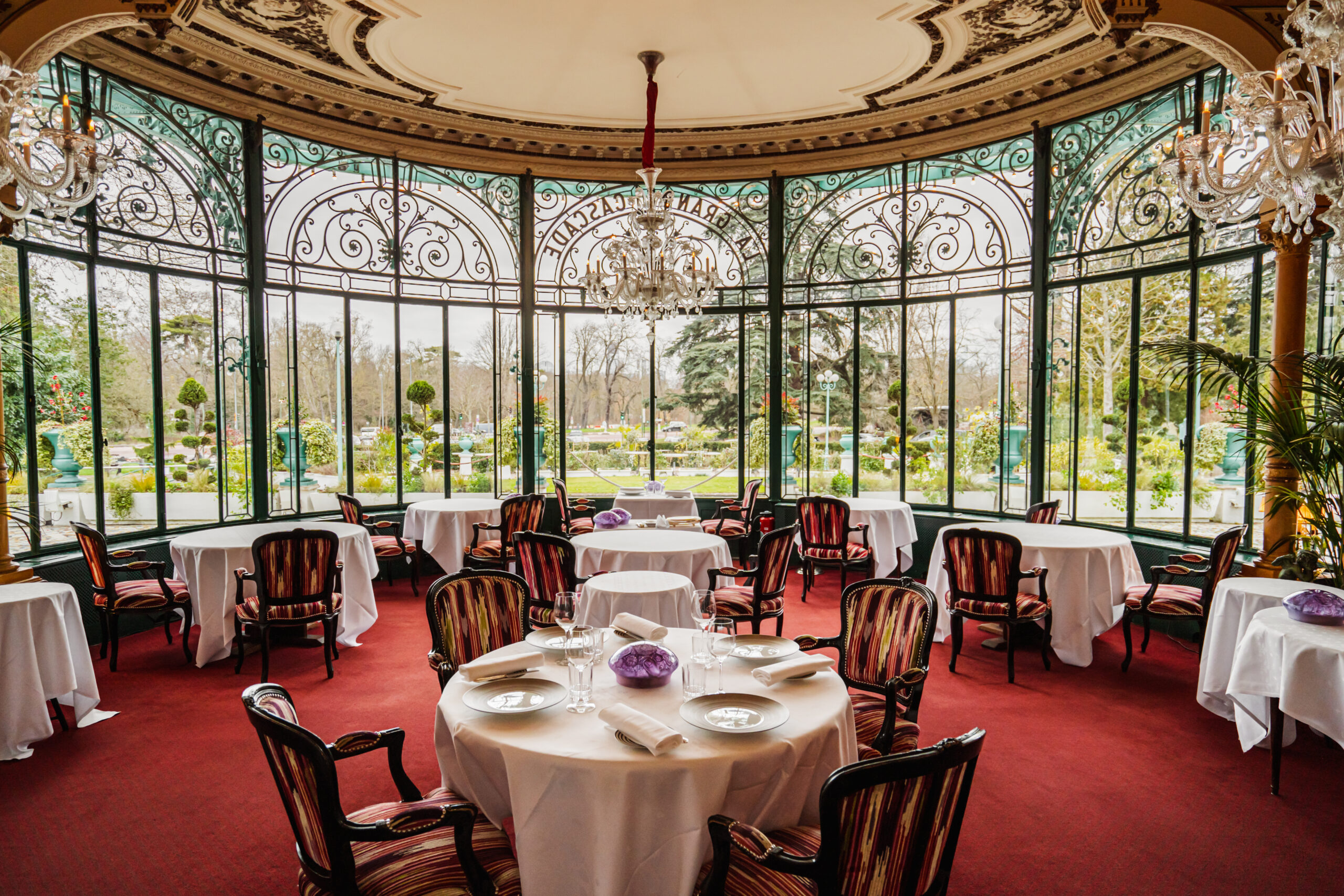 Ce sanctuaire gastronomique séduit dès le premier regard. Vêtu de verre et de métal, agrémenté d’une marquise majestueuse qui surplombe sa vaste terrasse, La Grande Cascade évoque l’élégance et le raffinement. Une fois franchie la porte d’entrée, vous pénétrez dans un monde intemporel. Boiseries, dorures et lustres en cristal créent une atmosphère sophistiquée, sublimée par un ciel peint en trompe-l’œil qui couvre la verrière zénithale.