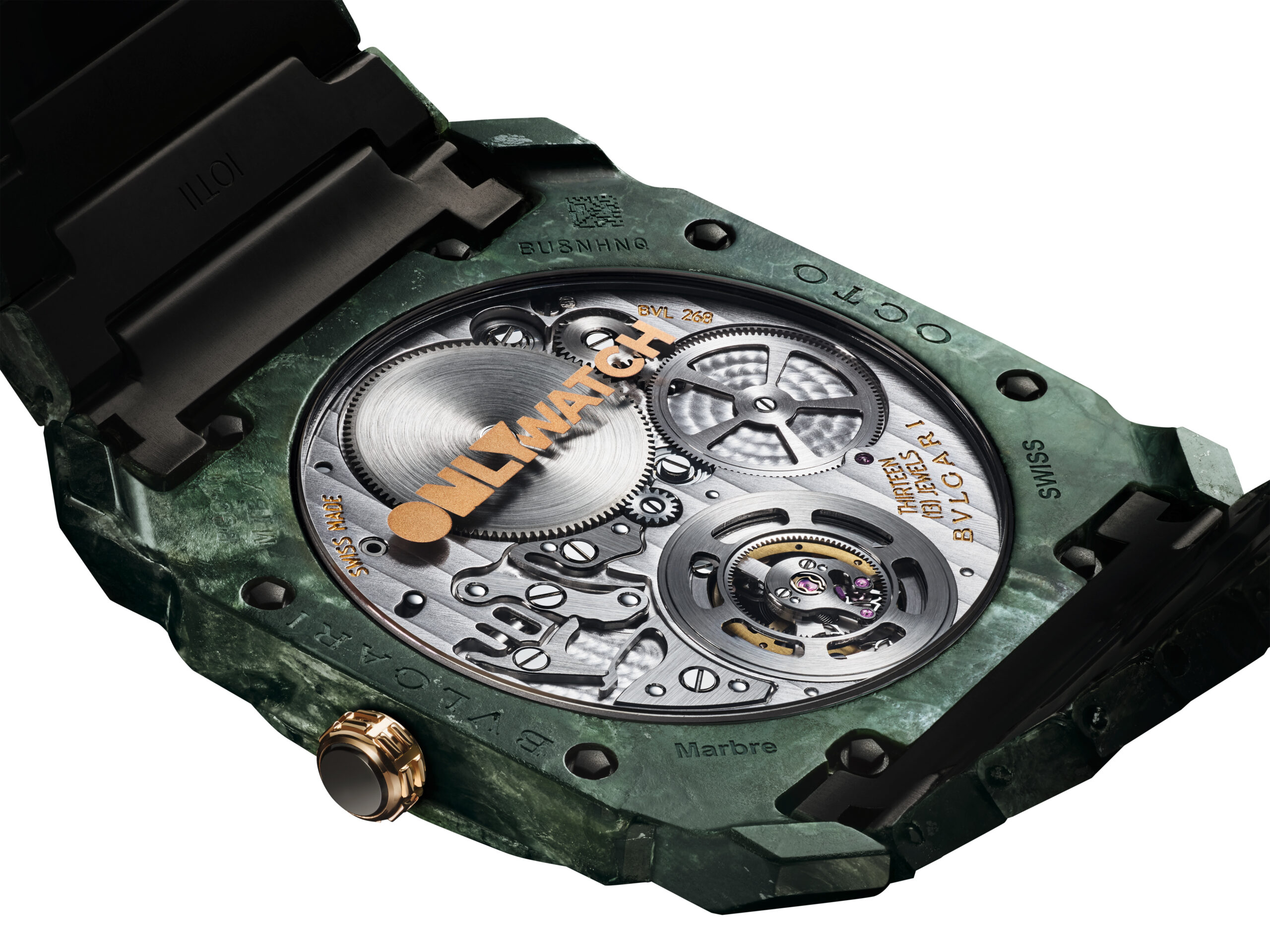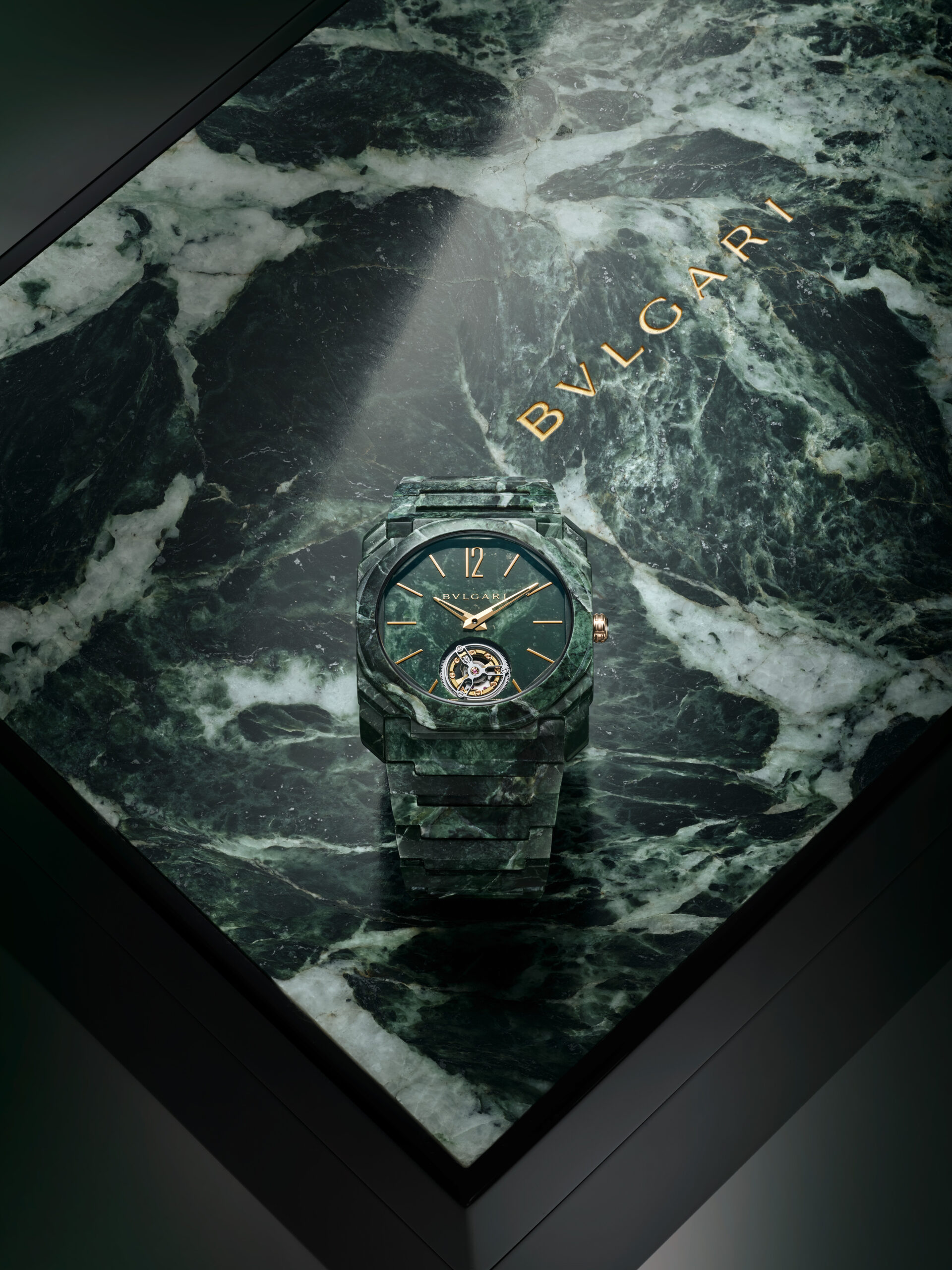 Le marbre, un matériau cher à Bulgari et souvent associé à l’art et à l’architecture, est utilisé ici pour transformer un exploit horloger en chef-d’œuvre artistique. Il n’y a pas de meilleur matériau pour exprimer l’unicité de Bulgari et la capacité de la Maison romaine à transformer un exploit horloger en œuvre d’art.