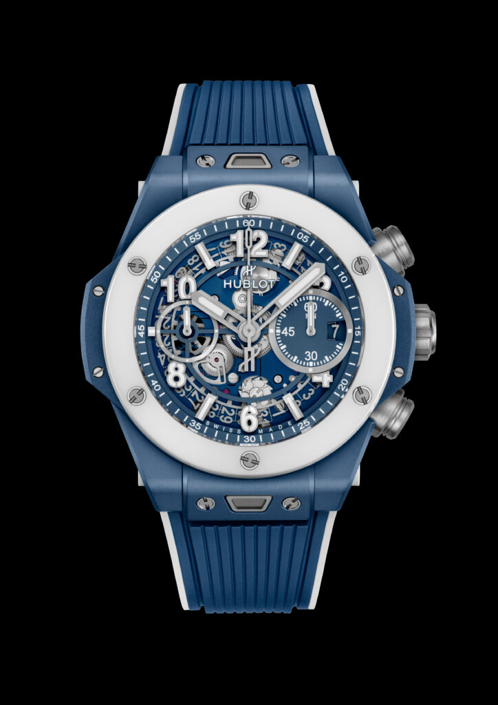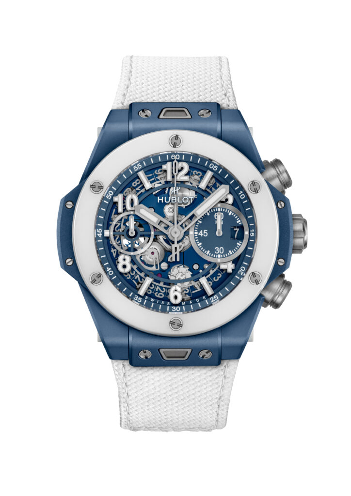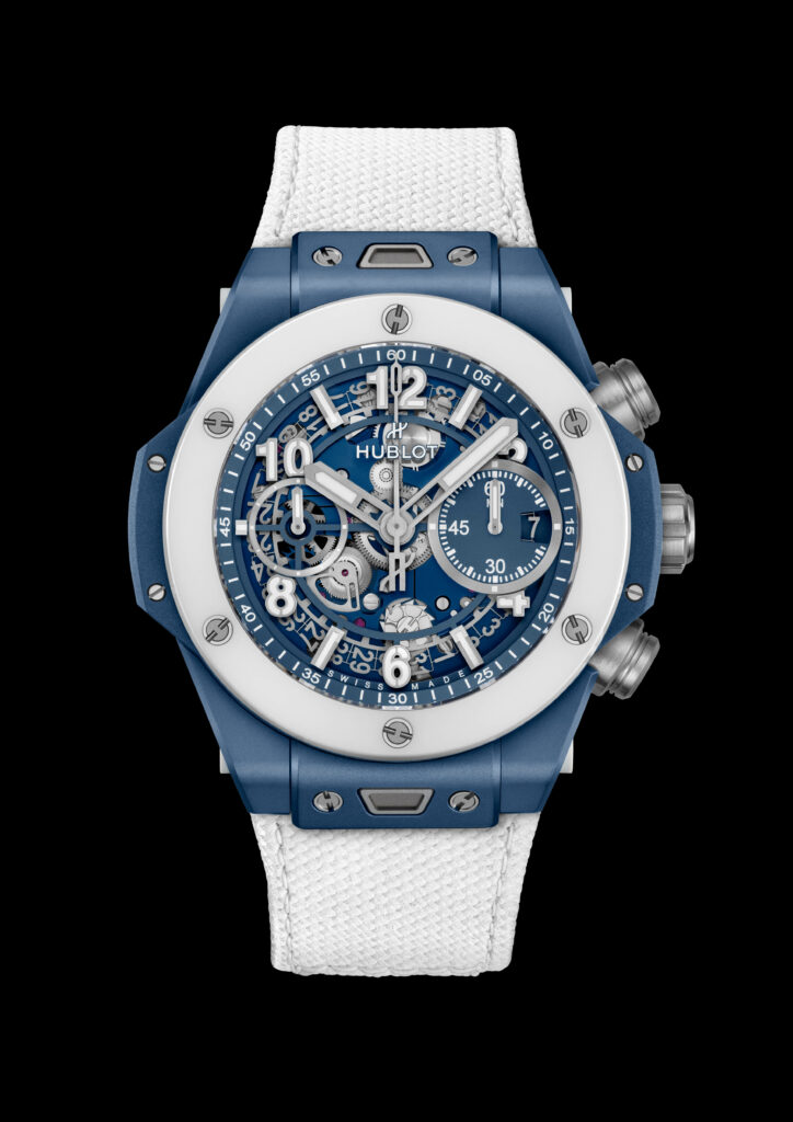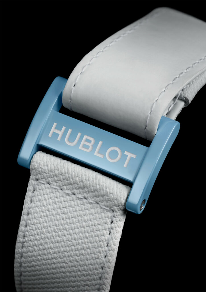 Avec un boîtier de 42 mm en céramique blanche, un matériau high-tech inoxydable et hypoallergénique, la montre abrite le mouvement 100% manufacture Unico chronographe à remontage automatique HUB1280. L’esthétique est complétée par deux bracelets, l’un en caoutchouc naturel ligné et l’autre en cuir de veau blanc, tous deux assortis au cadran.
