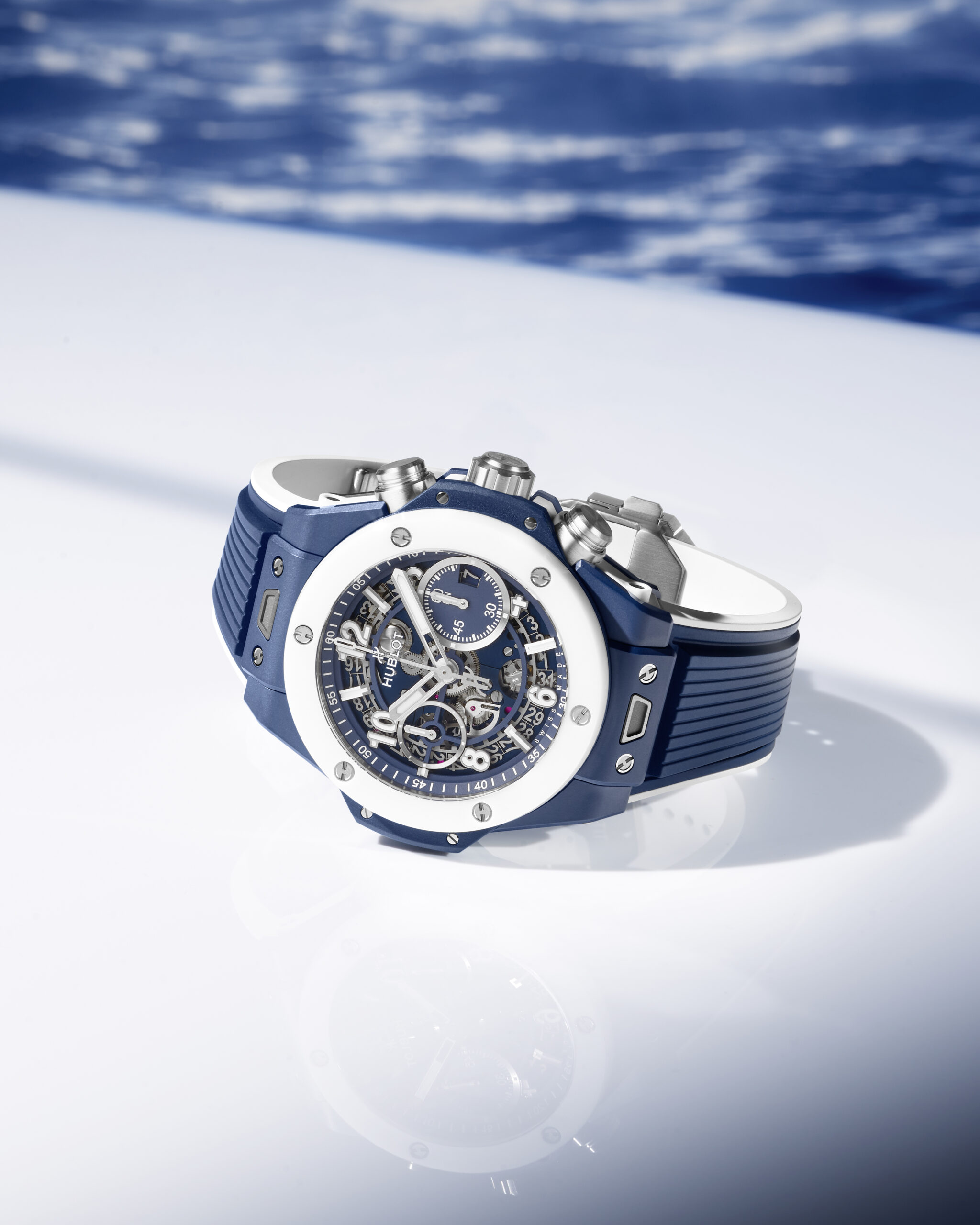 La Big Bang Unico Azur est une interprétation horlogère de l’azur infini de la Méditerranée. Ses nuances profondes se reflètent dans chaque élément de la montre, du cadran aux bracelets. Les aiguilles et index luminescents se croisent comme les sillages de bateaux, et le ciel se confond avec la mer, évoquant une scène sereine observée à travers un hublot.