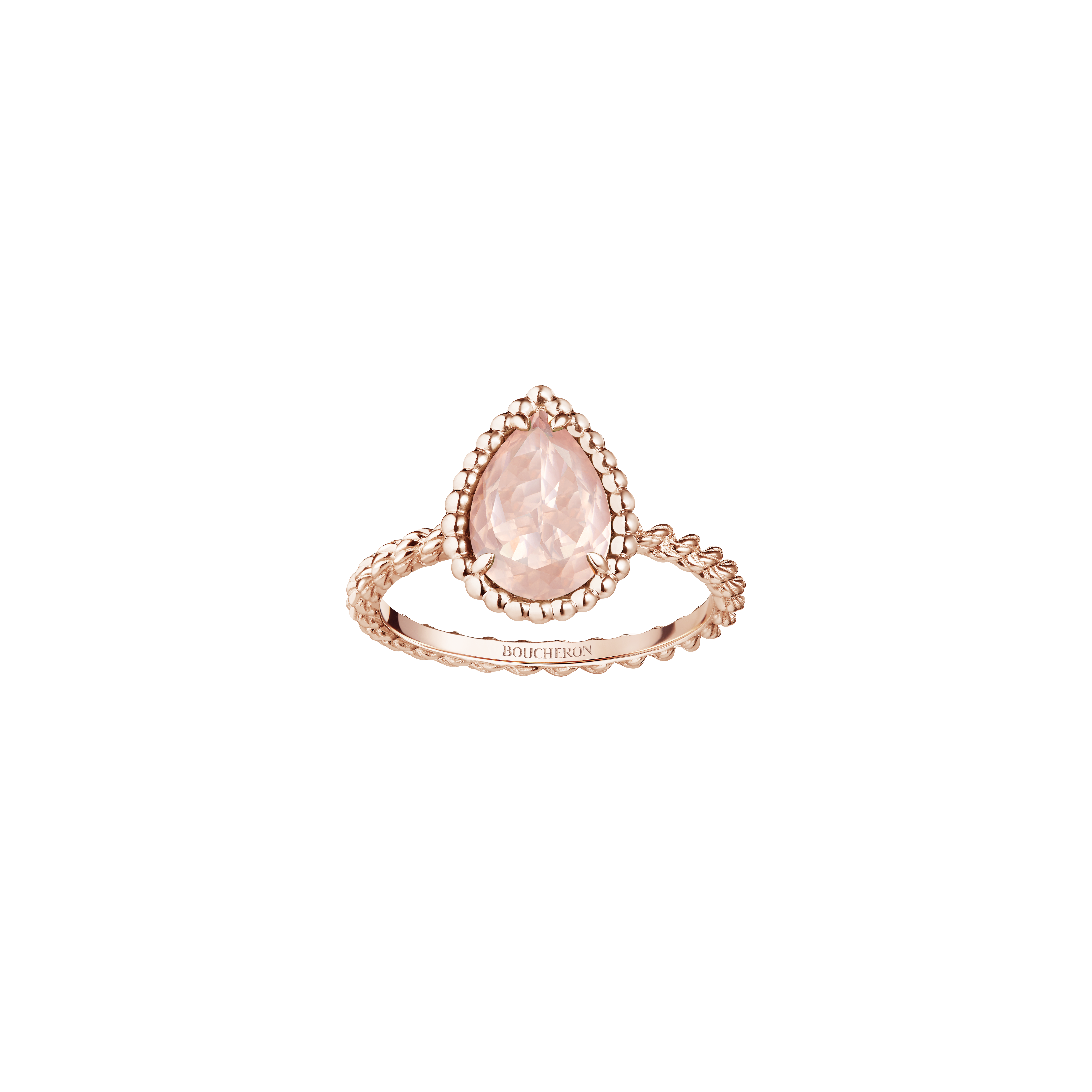 Les anneaux des bagues, finement torsadés, semblent s’enrouler délicatement autour du doigt. Les pendentifs sont sertis avec une grande minutie pour suspendre avec légèreté le quartz rose.