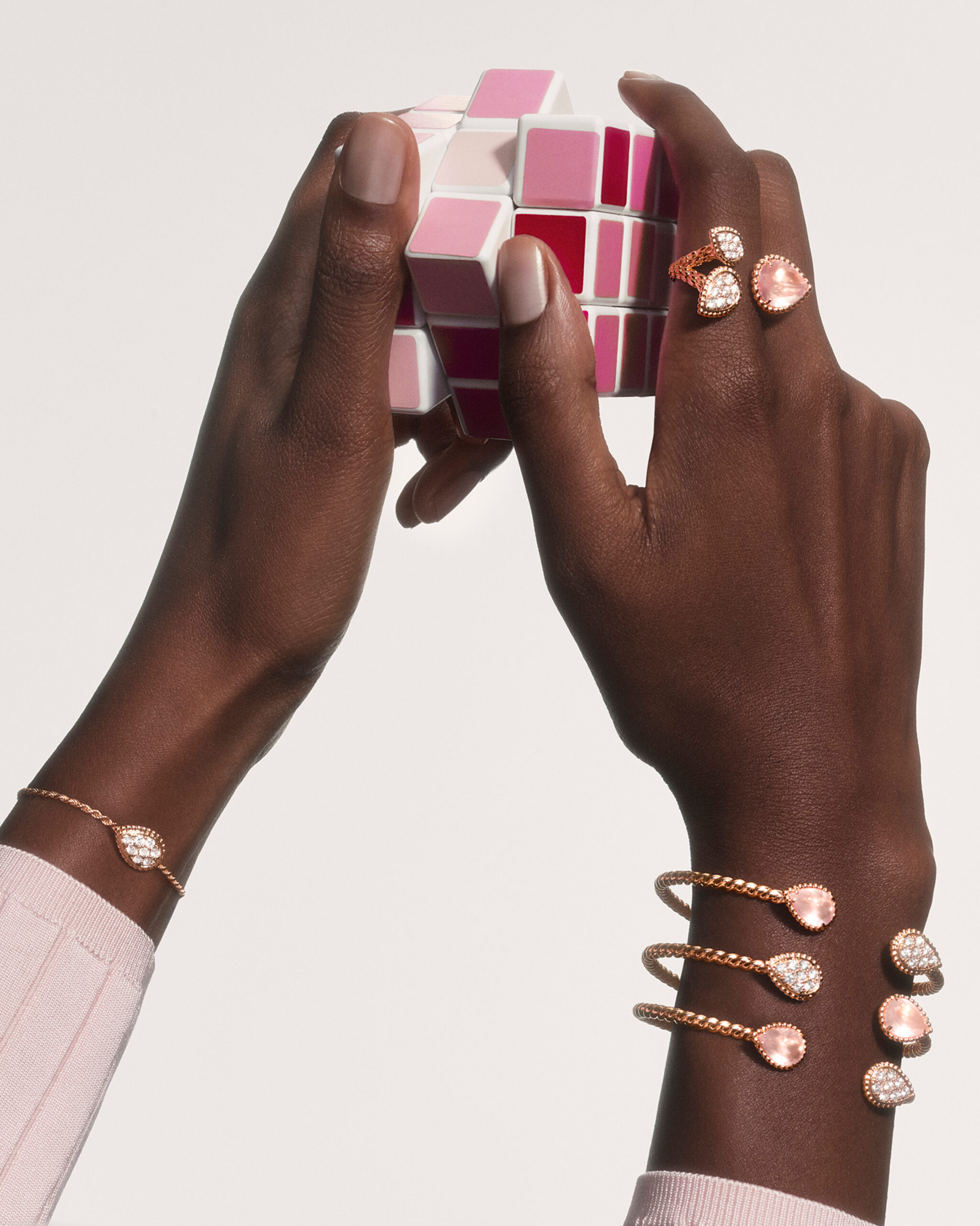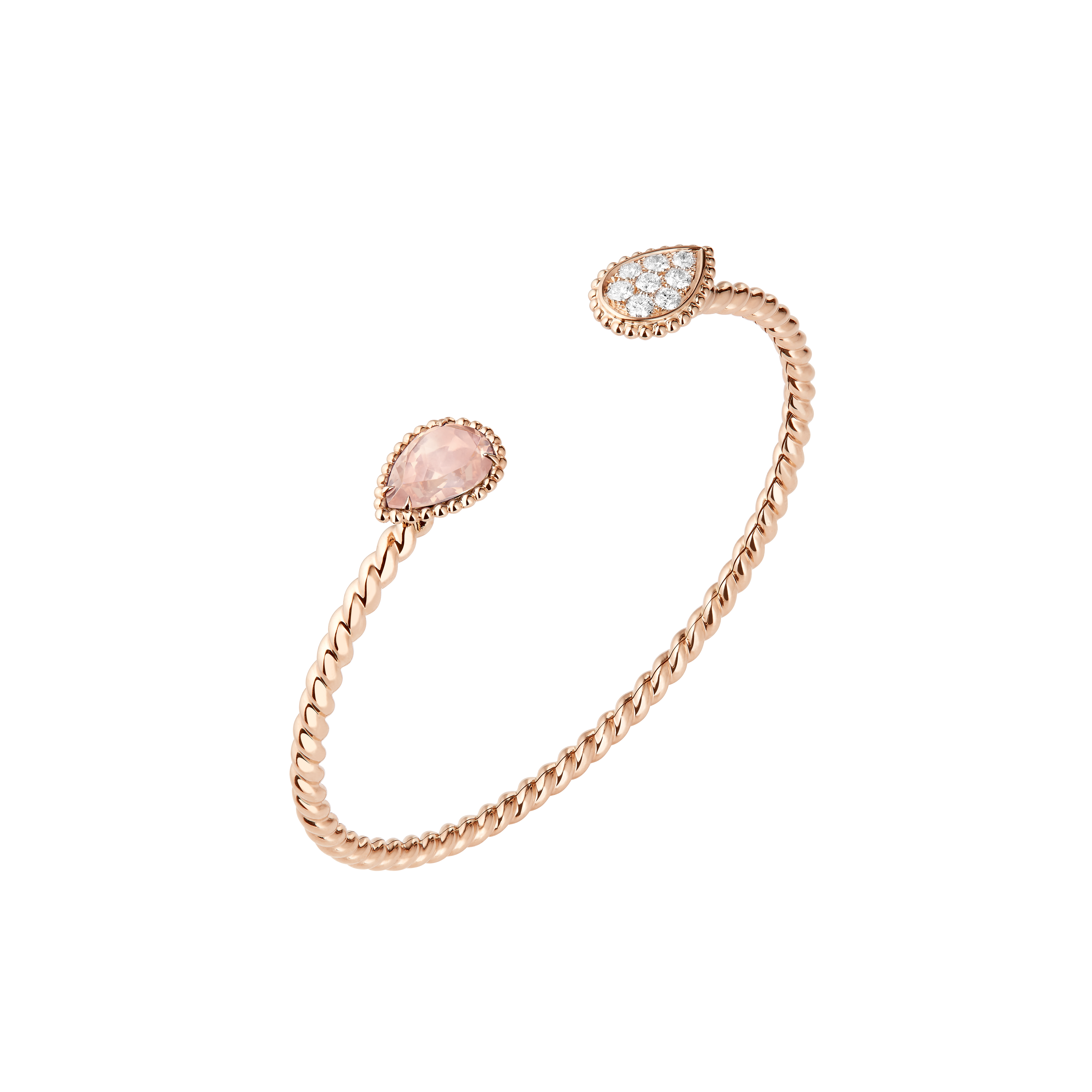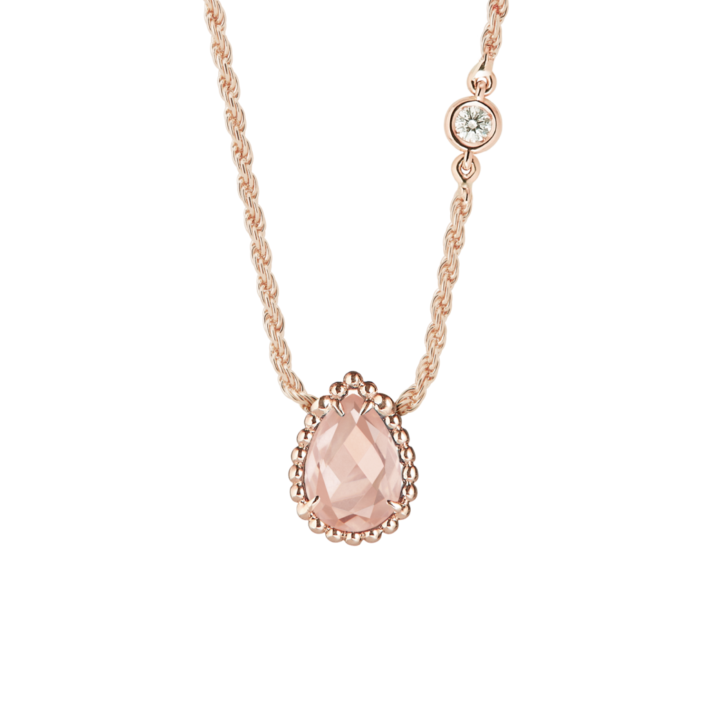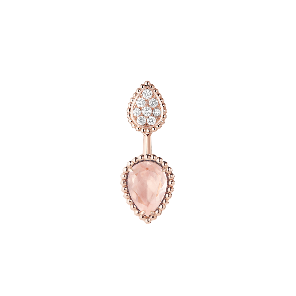 Cette ligne célèbre l’harmonie entre la créativité de la haute joaillerie et l’excellence des métiers d’art. Le contraste entre le scintillement des diamants et la rondeur du quartz rose confère à ces pièces une grâce aérienne, presque sensuelle.
