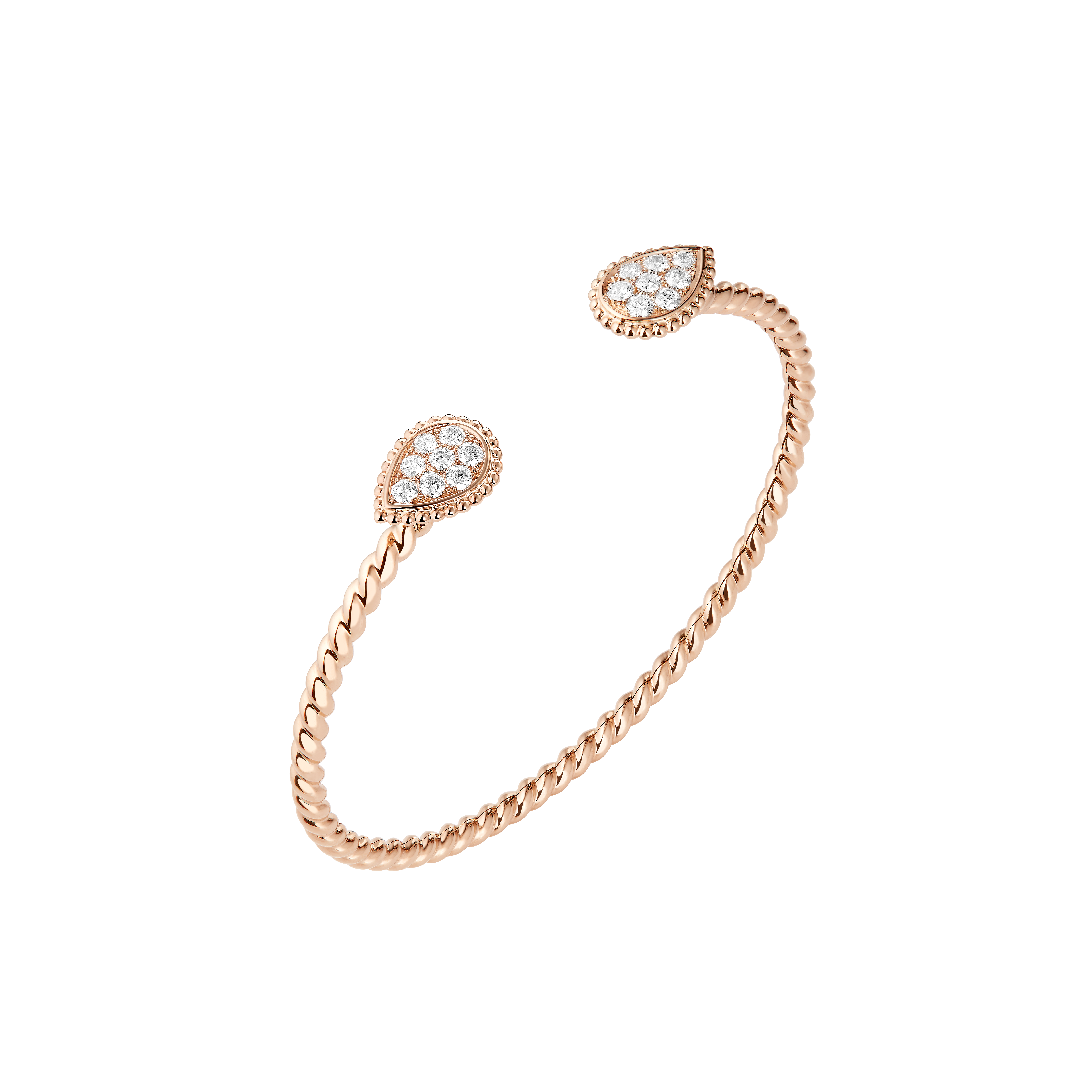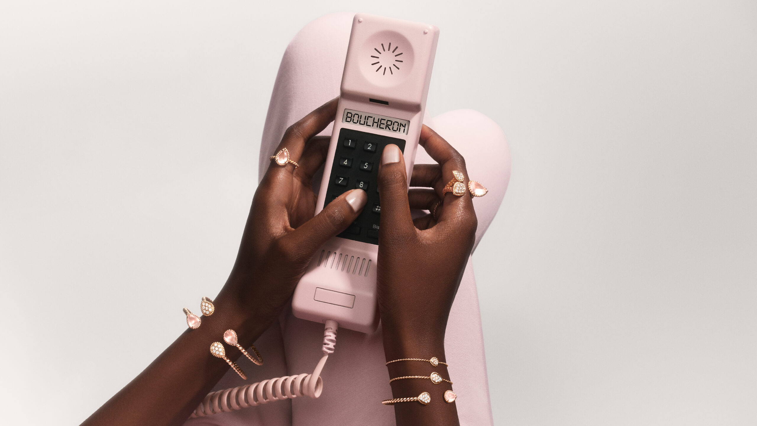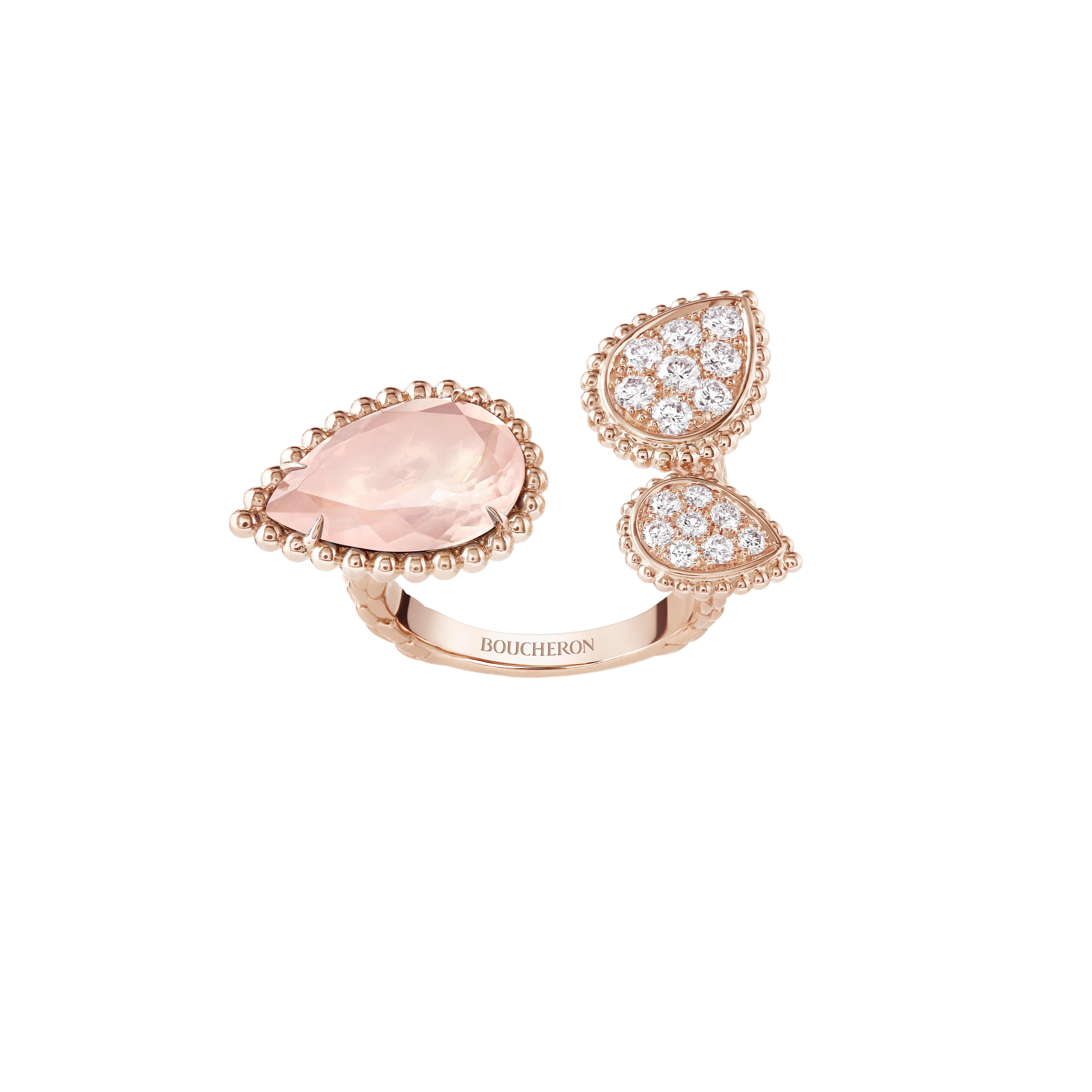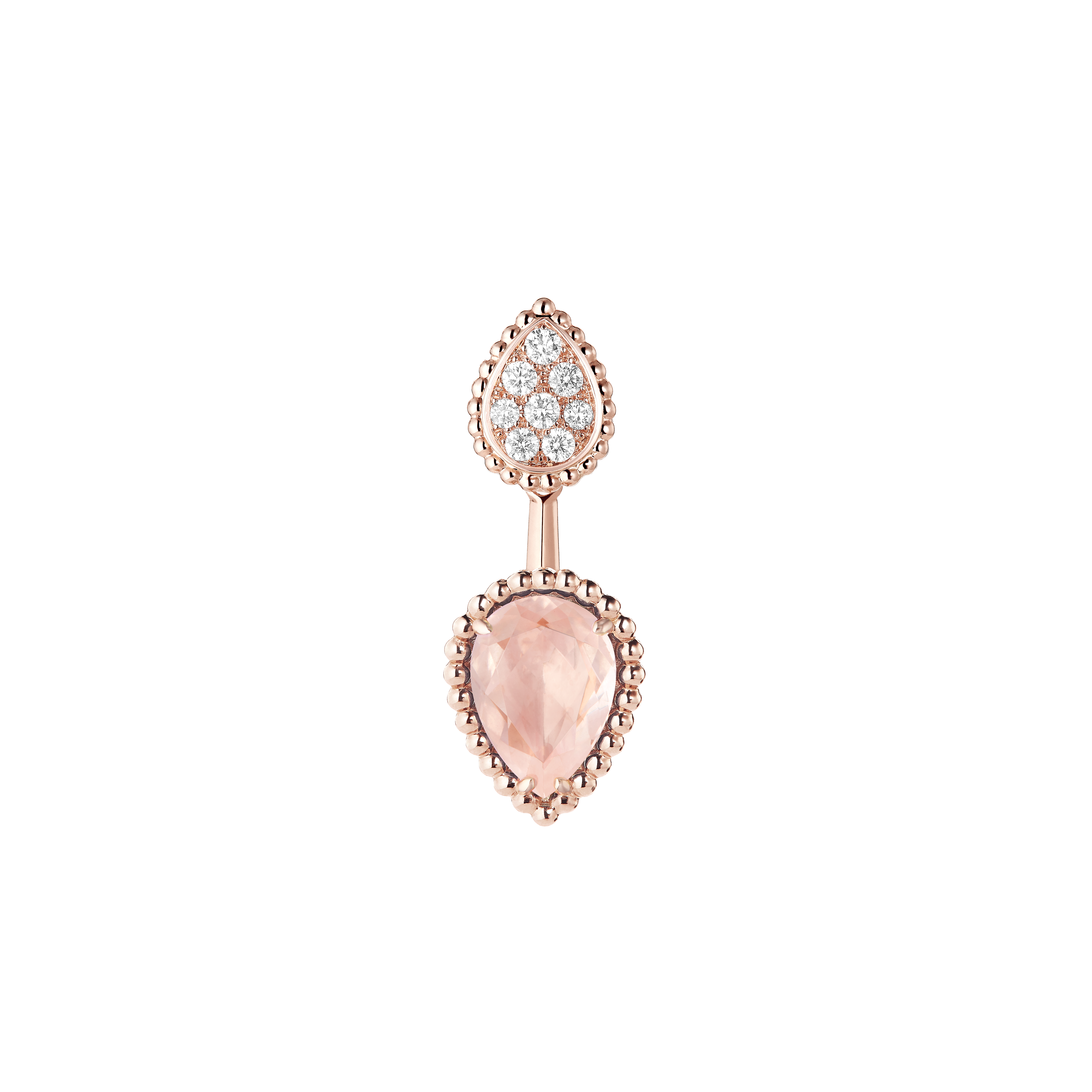 Cette ligne célèbre l’harmonie entre la créativité de la haute joaillerie et l’excellence des métiers d’art. Le contraste entre le scintillement des diamants et la rondeur du quartz rose confère à ces pièces une grâce aérienne, presque sensuelle.