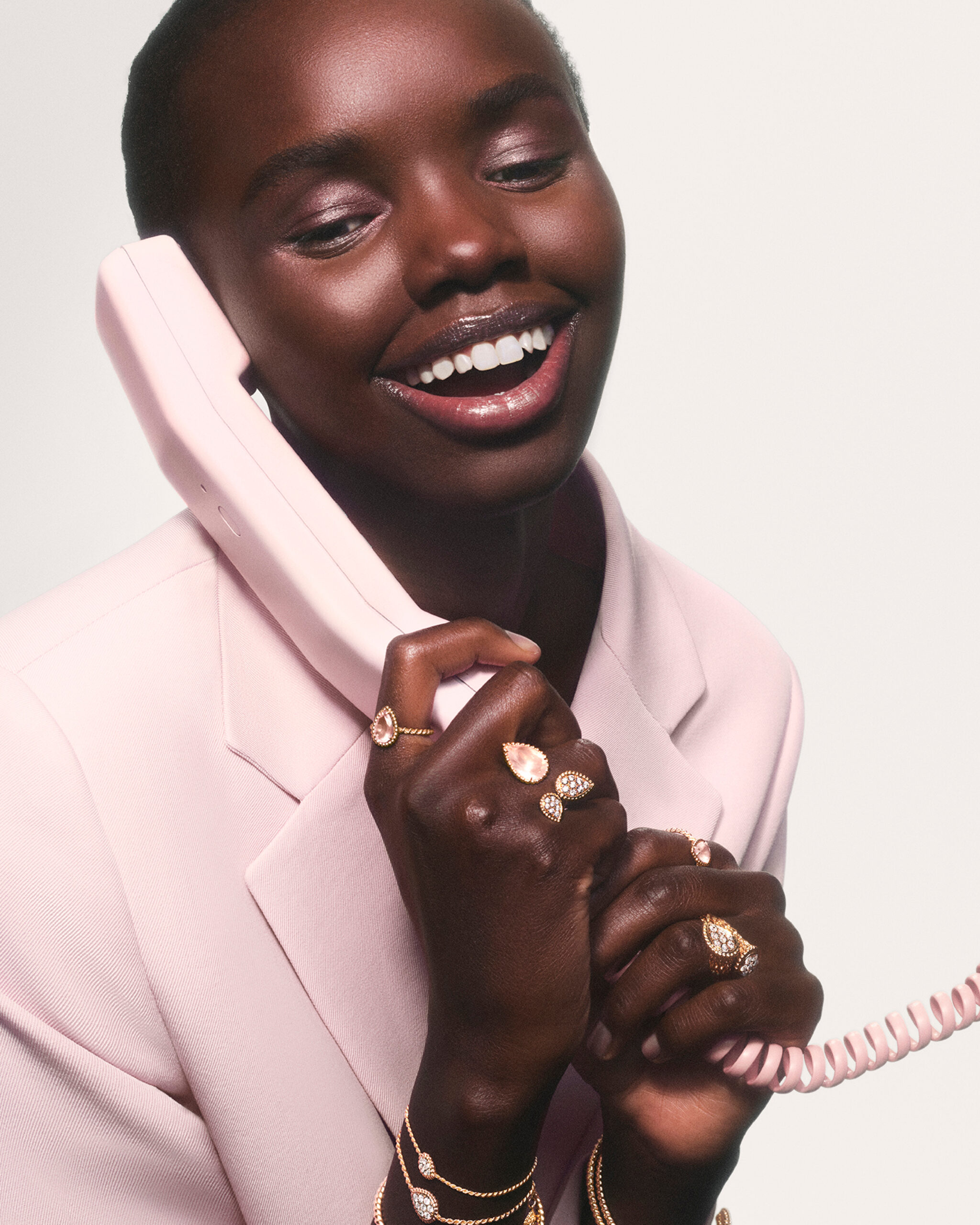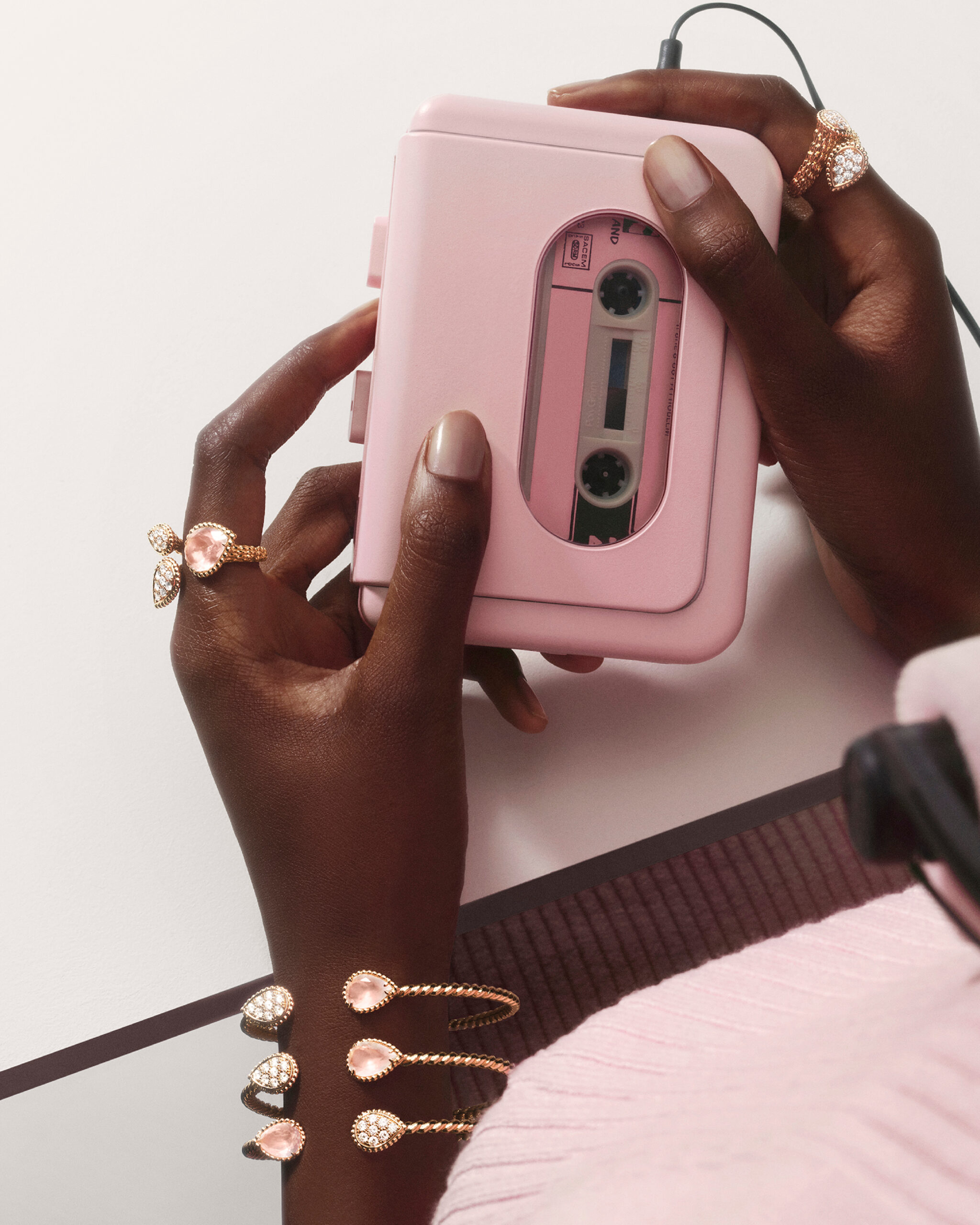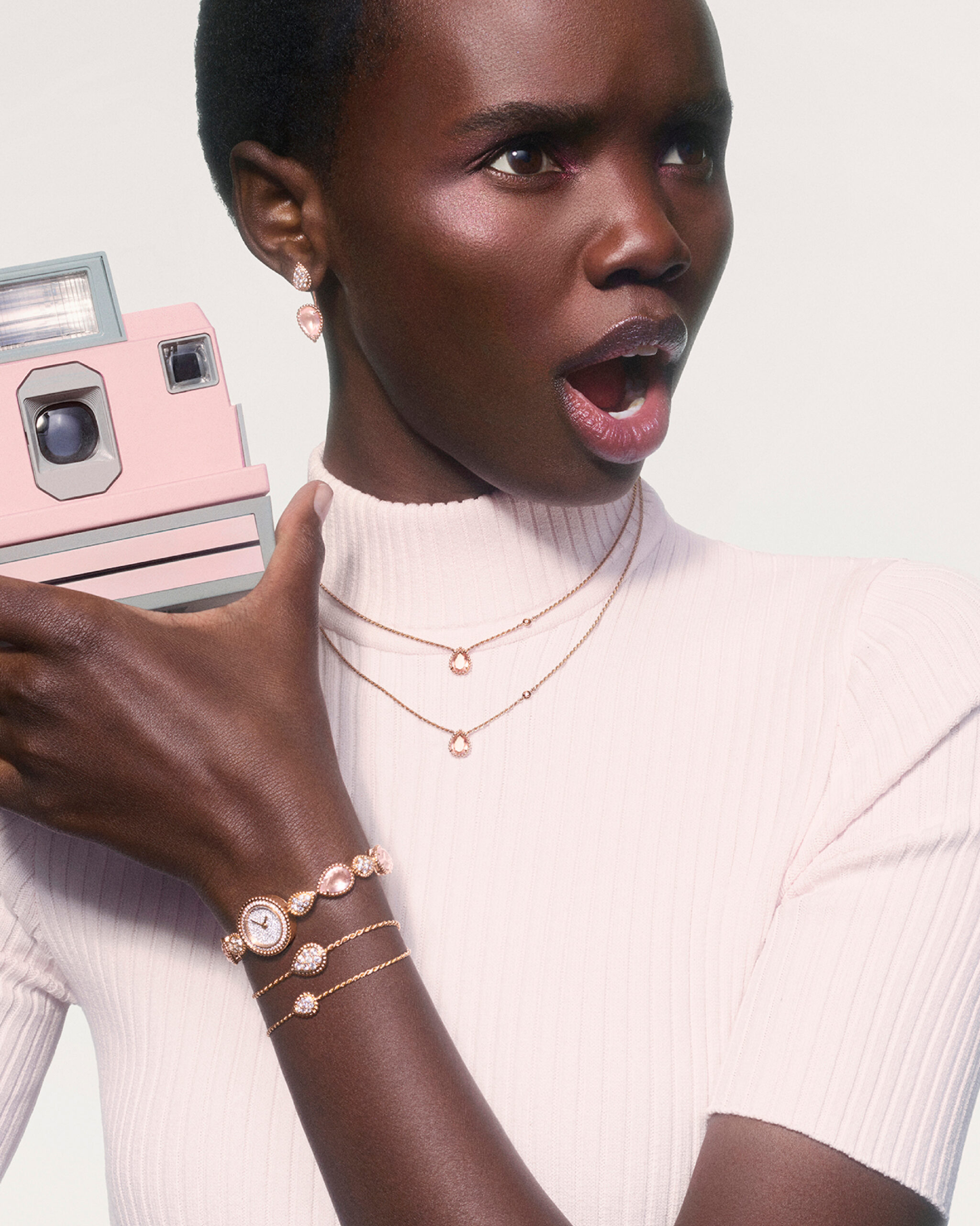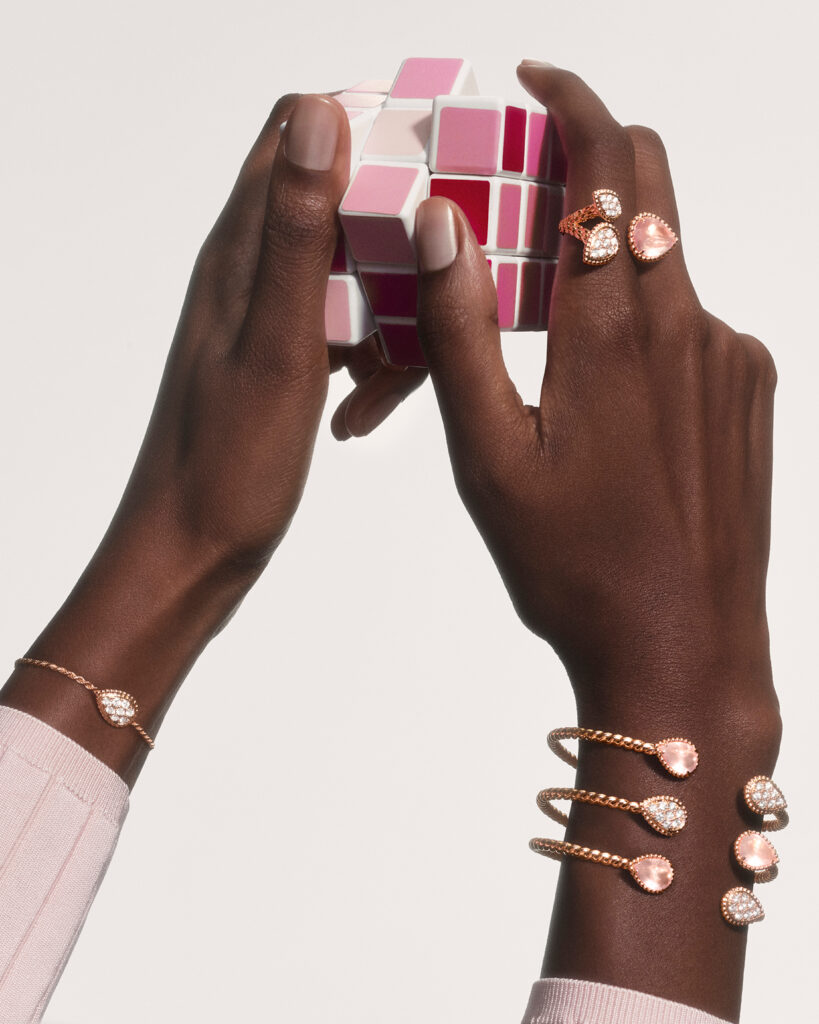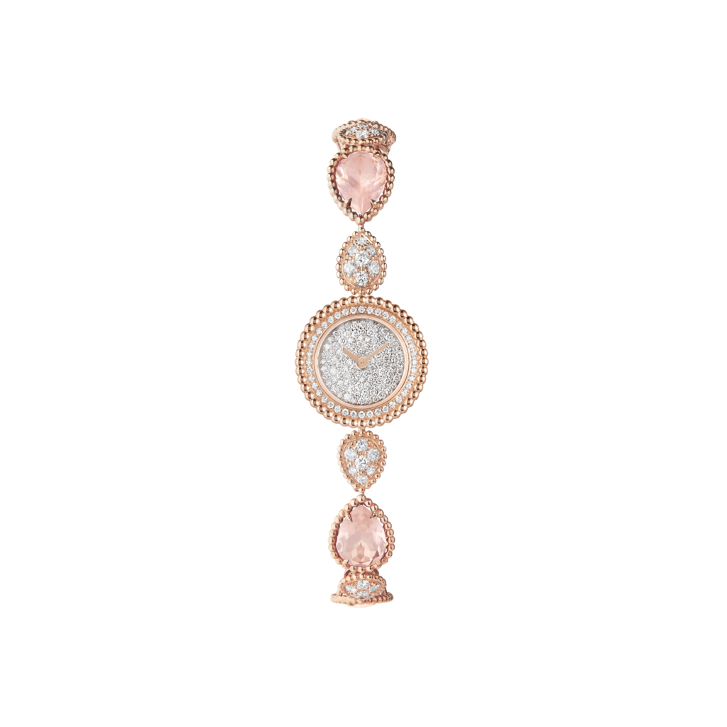 Bagues, bracelets, boucles d’oreilles et pendentifs s’illuminent délicatement de ces teintes pastel, pour une féminité assumée. Même la montre Serpent Bohème arbore un cadran pavé de diamants, entouré d’un bracelet orné de quartz rose.