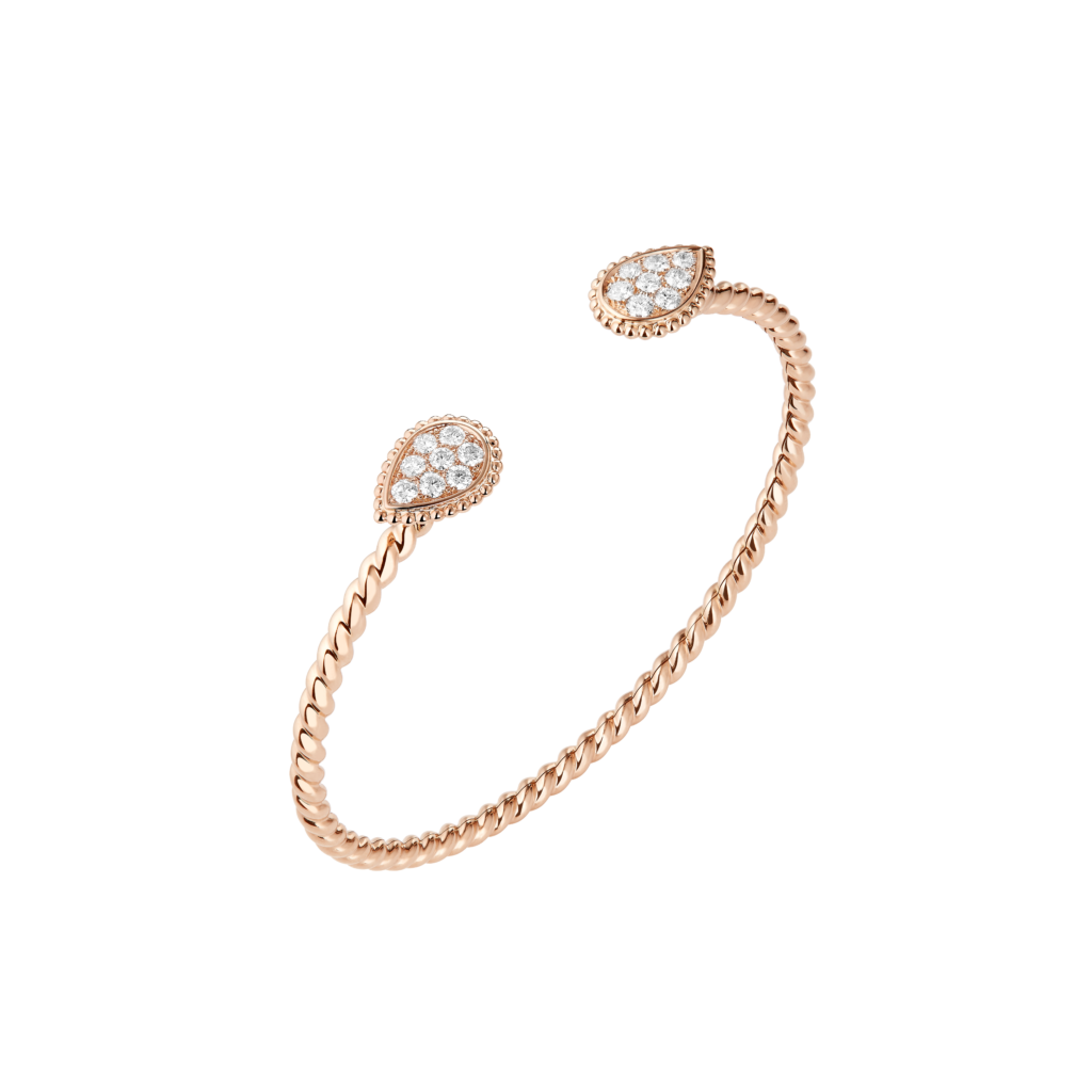 Cet été, la maison française revisite son iconique Serpent Bohème dans une nouvelle palette chromatique : l’or rose et le quartz rose. La finesse de l’orfèvrerie souligne les lignes sinueuses du serpent, sublimées par l’éclat doux et romantique de cette pierre semi-précieuse.