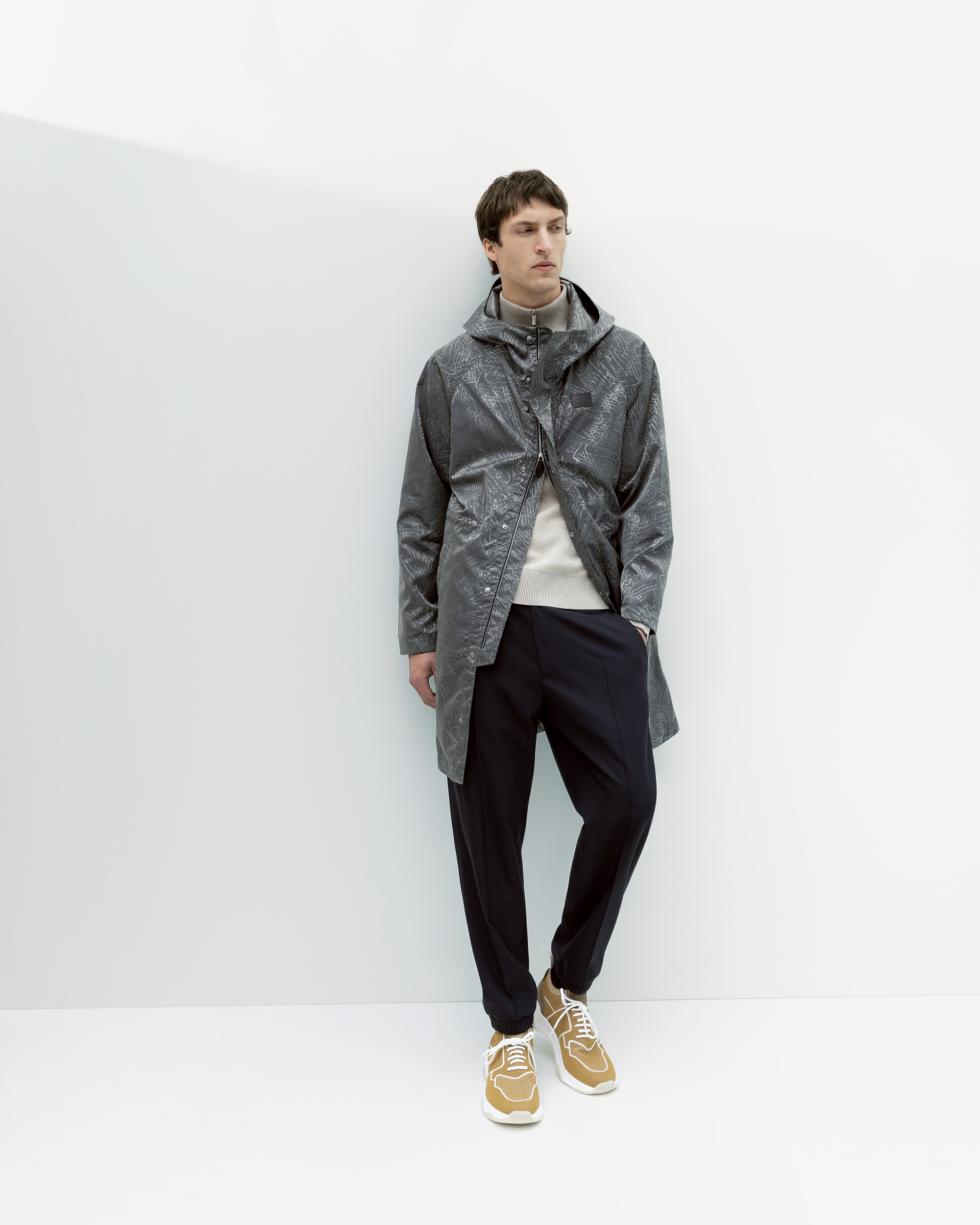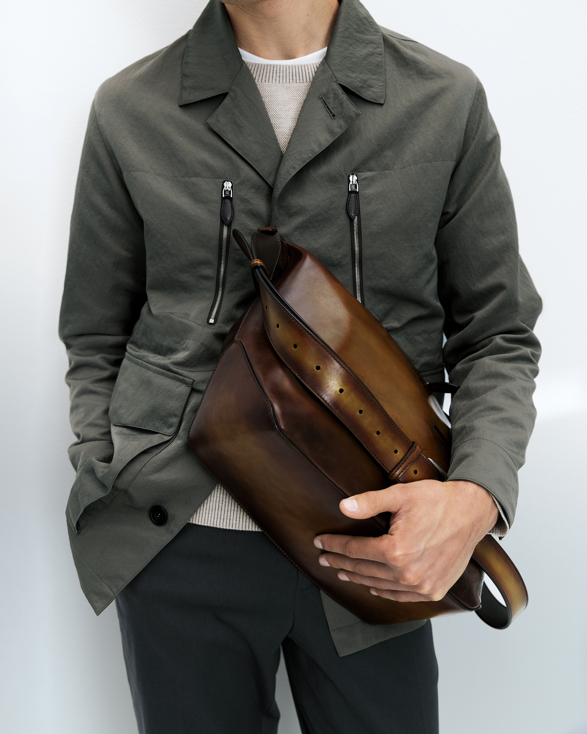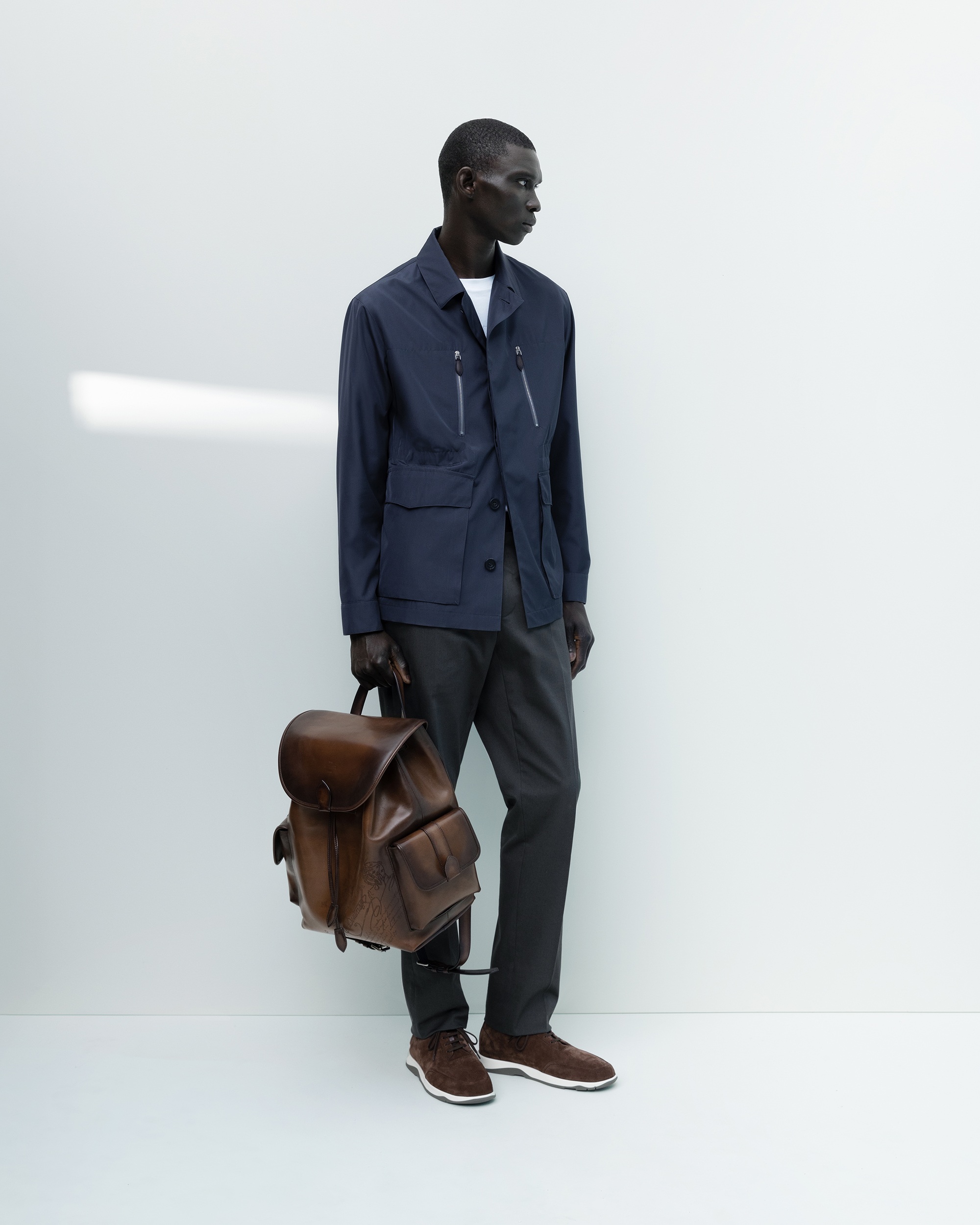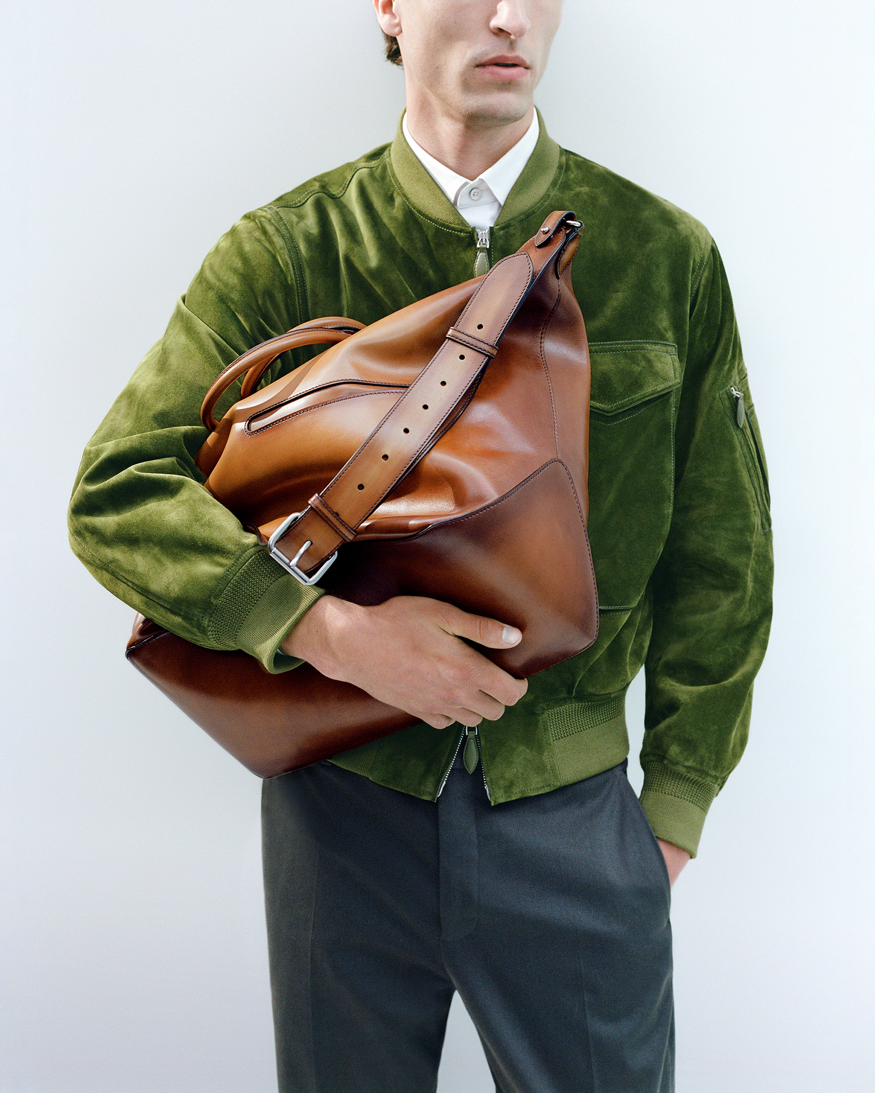Le motif Scritto, héritage de Berluti, s’intègre aux vêtements, évoqué dans le tissu technique métallique d’un parka pliable, ou subtilement rappelé dans le tricot. Les vêtements adoptent des éléments des accessoires historiques de la Maison comme ornement, de la couture caractéristique de la sneaker Shadow au demi-zip emblématique du sac Un Jour. De même, les blousons en daim et en cuir s’inspirent des couleurs et des textures de la Patina.