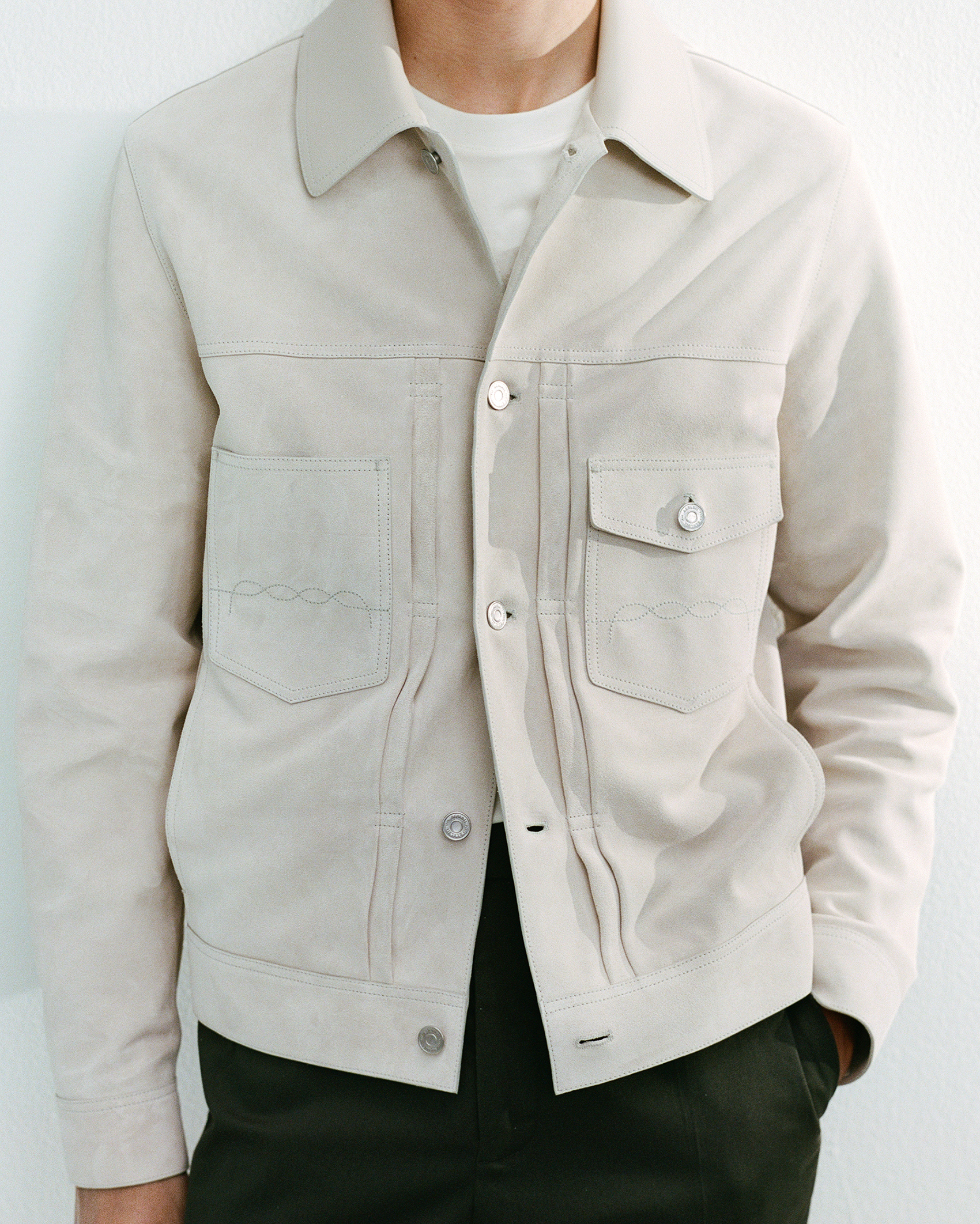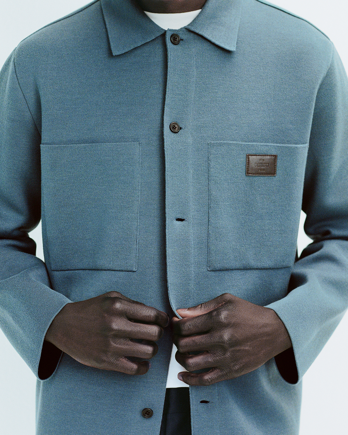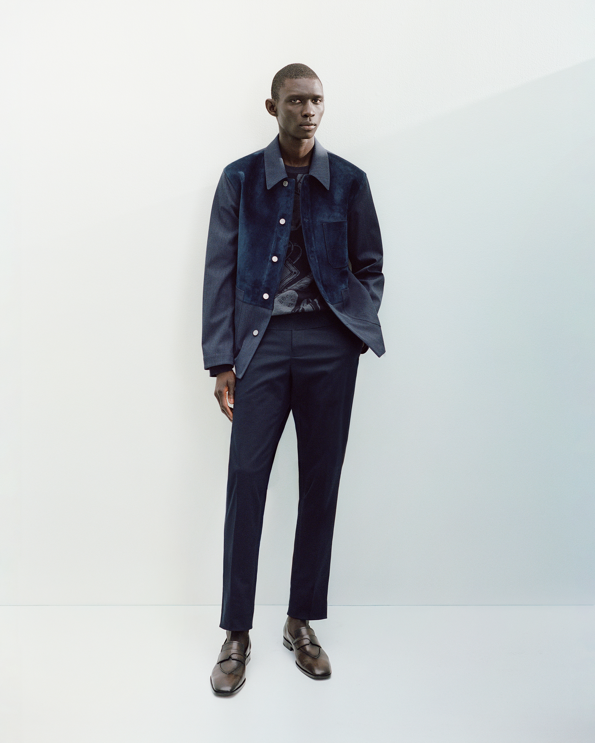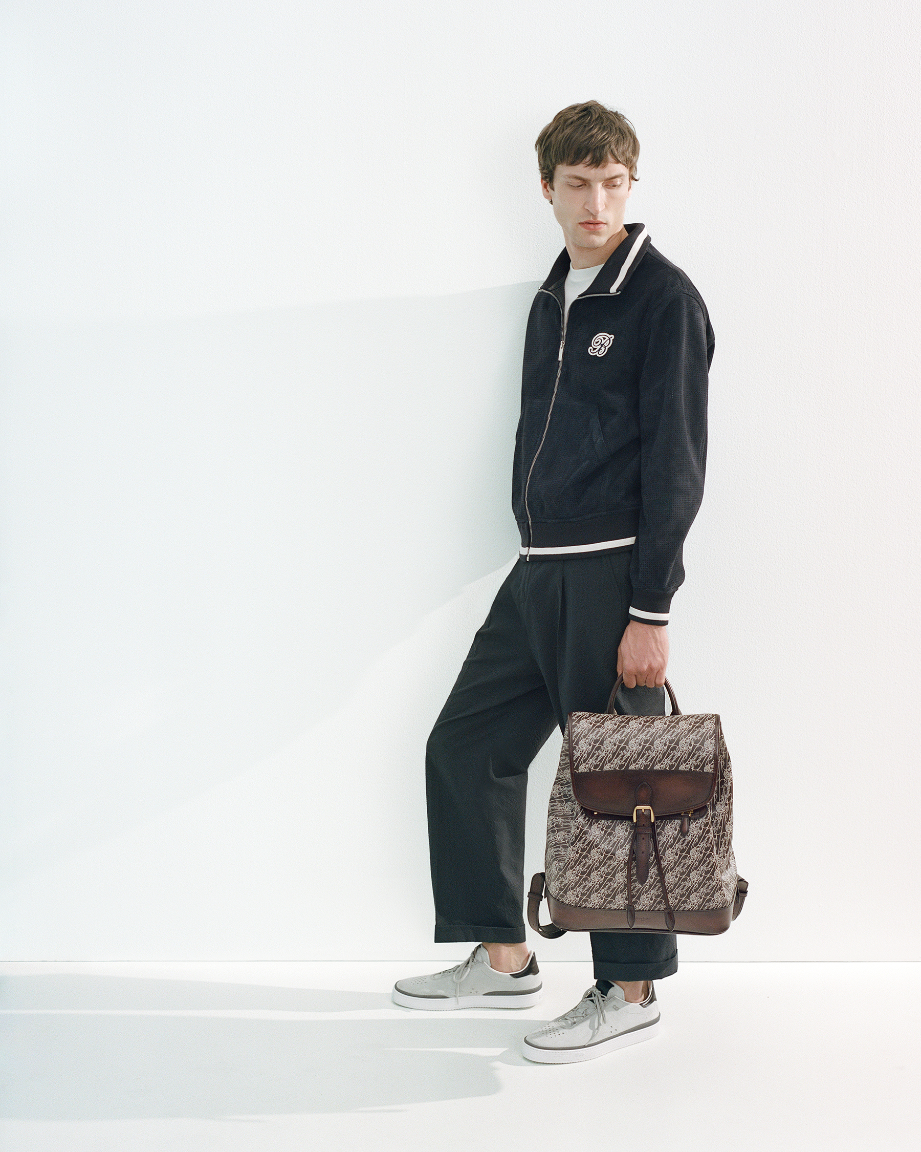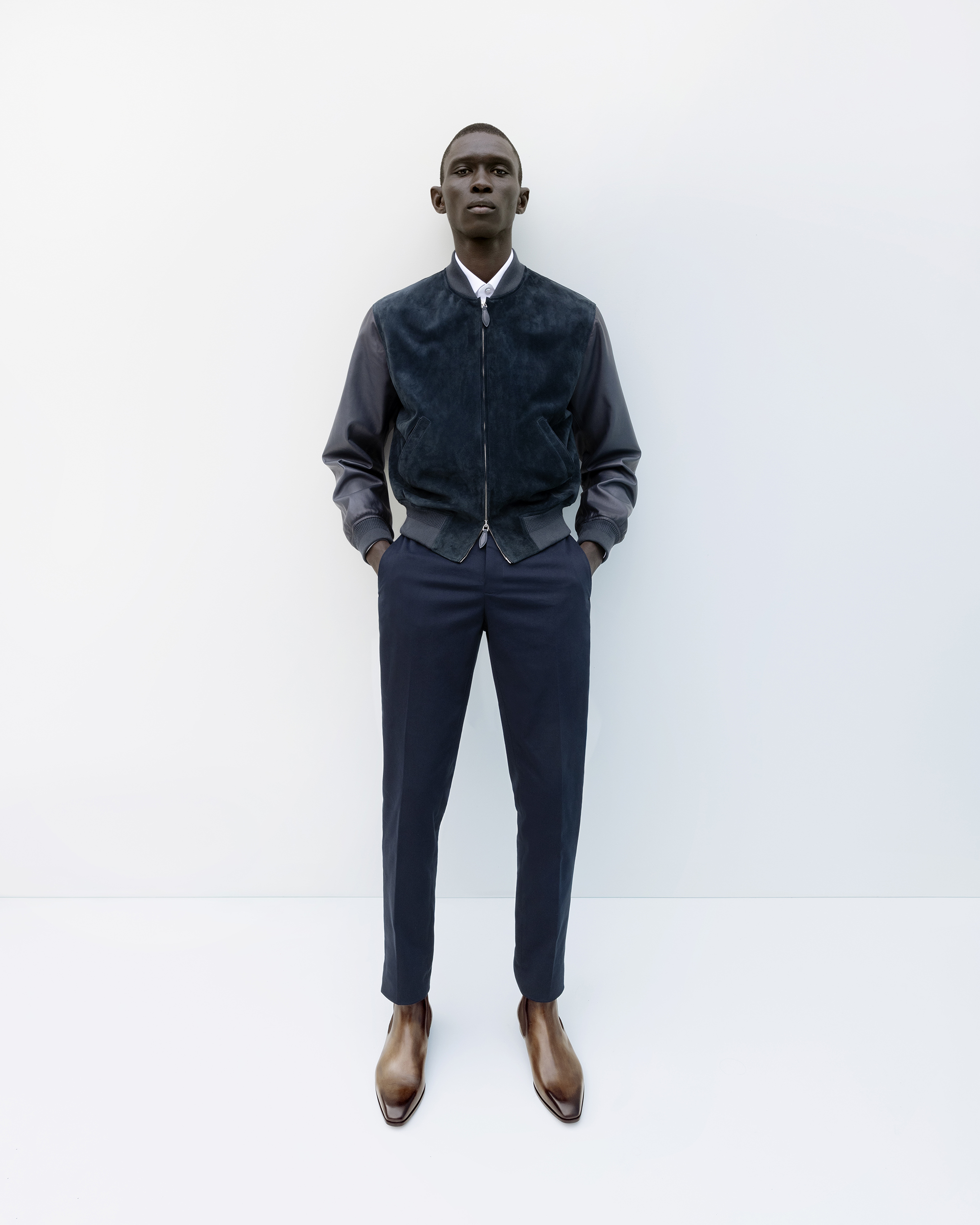 Le motif Scritto, héritage de Berluti, s’intègre aux vêtements, évoqué dans le tissu technique métallique d’un parka pliable, ou subtilement rappelé dans le tricot. Les vêtements adoptent des éléments des accessoires historiques de la Maison comme ornement, de la couture caractéristique de la sneaker Shadow au demi-zip emblématique du sac Un Jour. De même, les blousons en daim et en cuir s’inspirent des couleurs et des textures de la Patina.