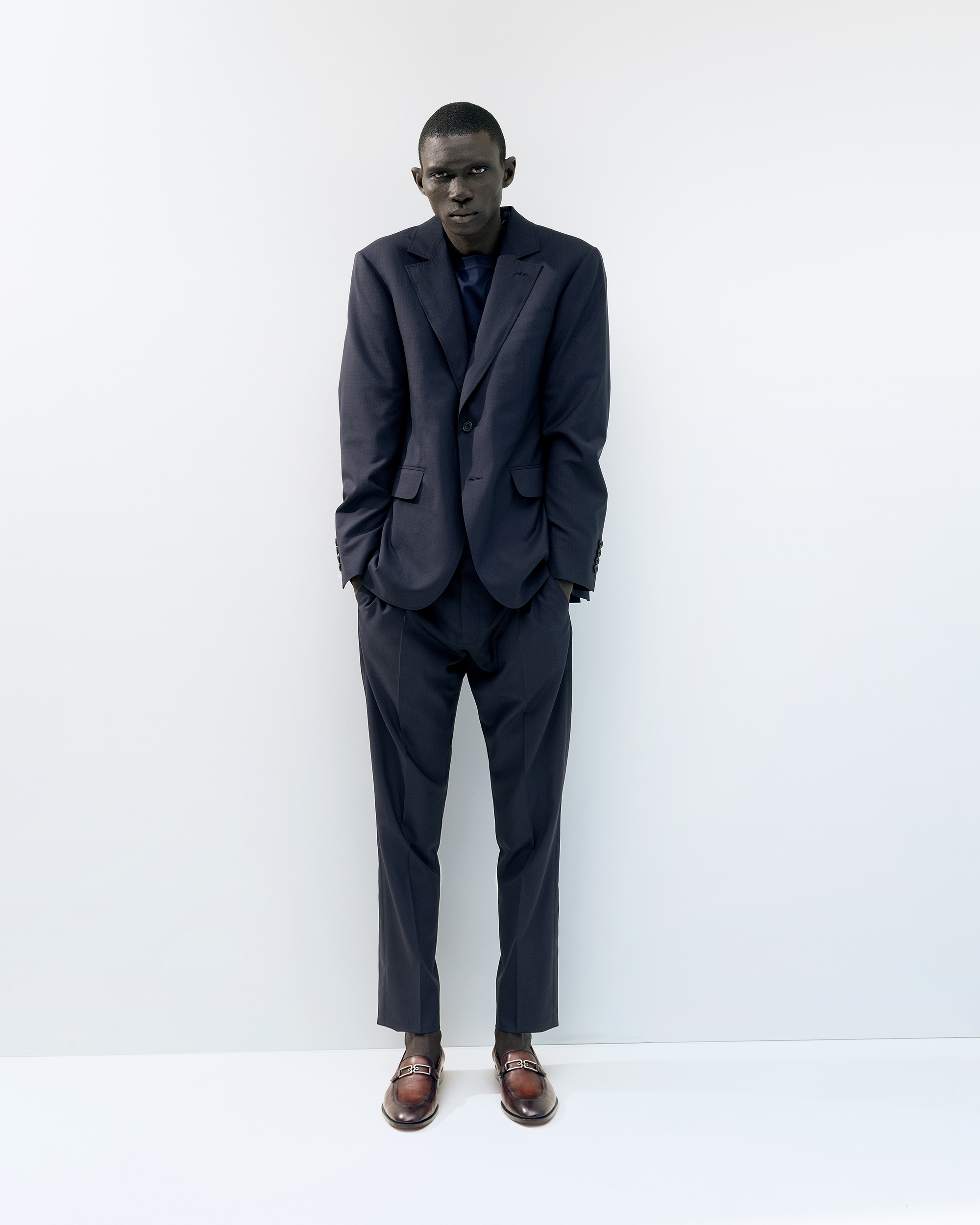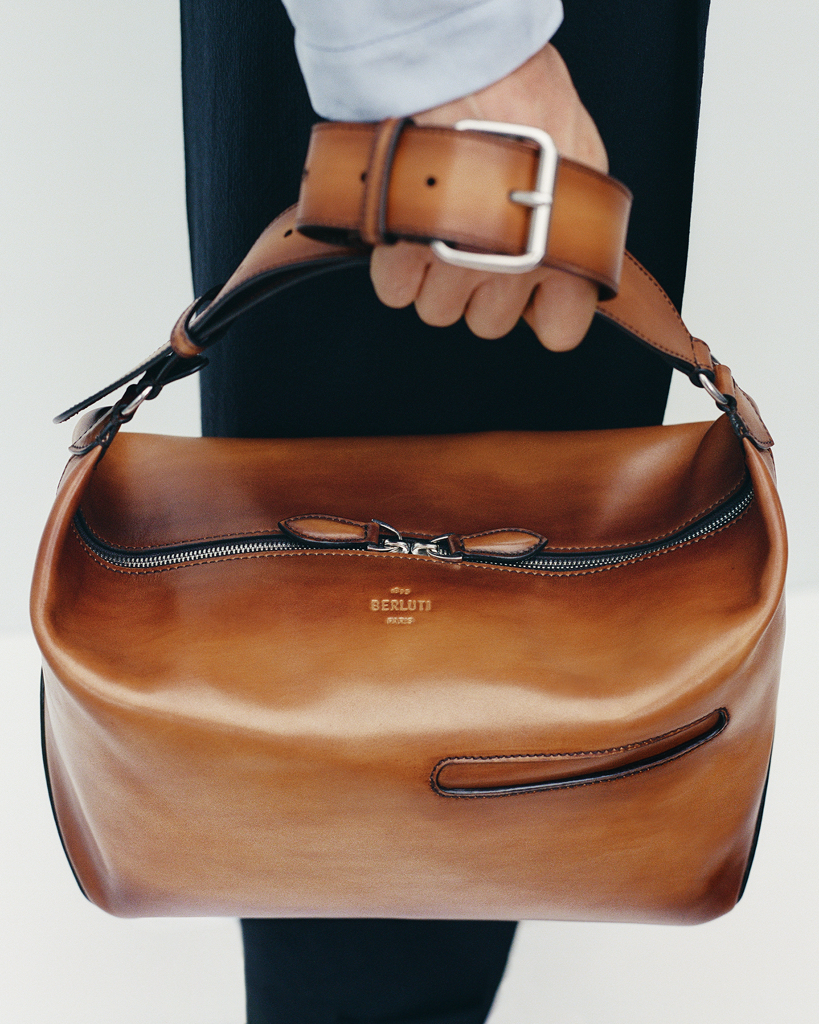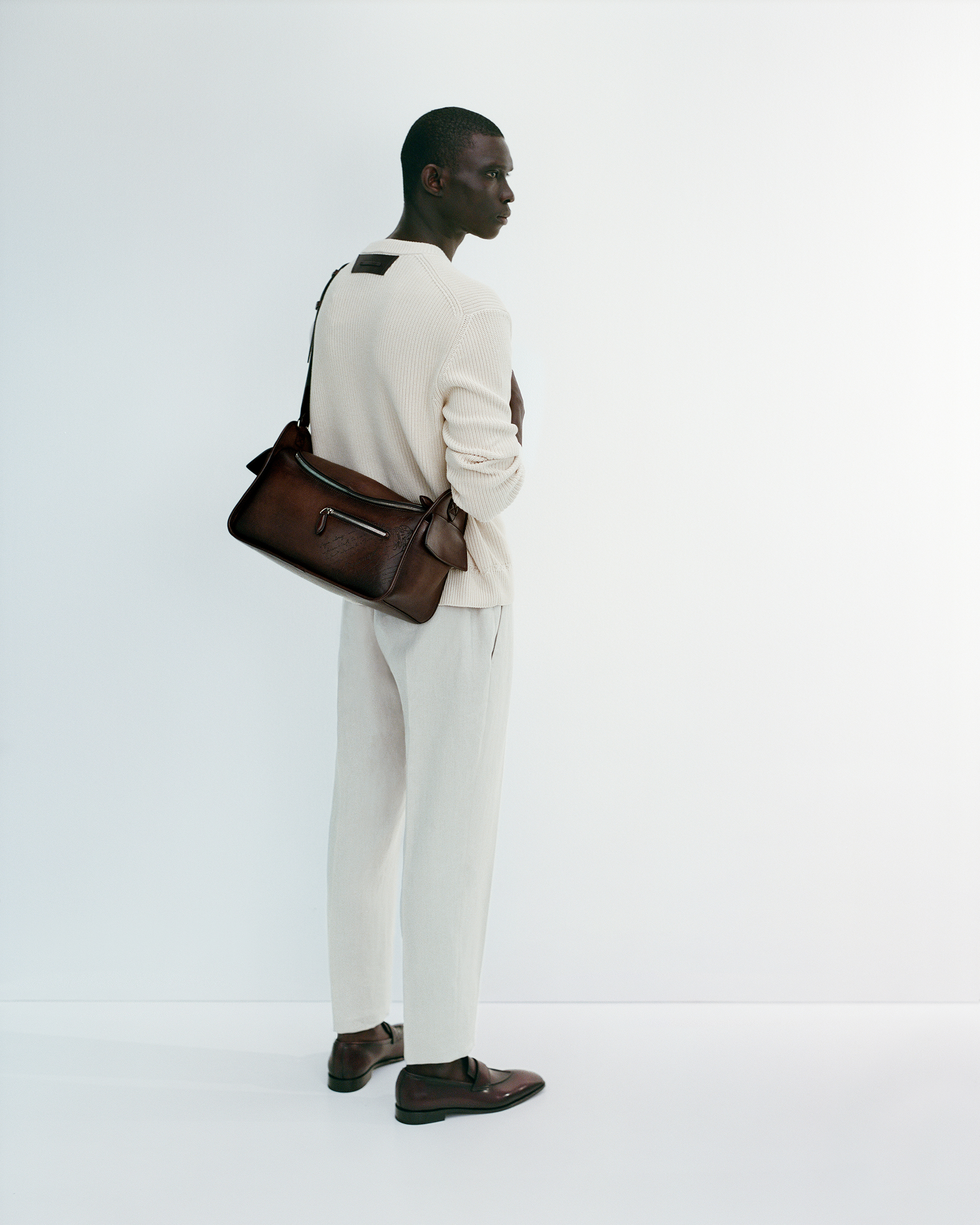 Les accessoires d’été adoptent une sensibilité décontractée élevée par des signatures historiques. Cementant ce sentiment, la sneaker Shadow se transforme en une nouvelle sandale tricotée, présentée aux côtés de la chaussure originale en tricot ou en cuir. La sneaker Playtime à semelle en caoutchouc puise dans les codes de la randonnée avec des lacets croisés encadrés de coutures en zigzag et se décline en textile d’inspiration daim pour plus de polyvalence. Taillé haut sur le pied, le mocassin Eden est une nouvelle slip-on en cuir grainé conçue selon des principes de confort. Pilier de l’iconographie de Berluti, la toile Marbeuf habille un nouveau sac à dos fonctionnel ainsi que le Baluchon, un nouveau sac à bandoulière agrandi.