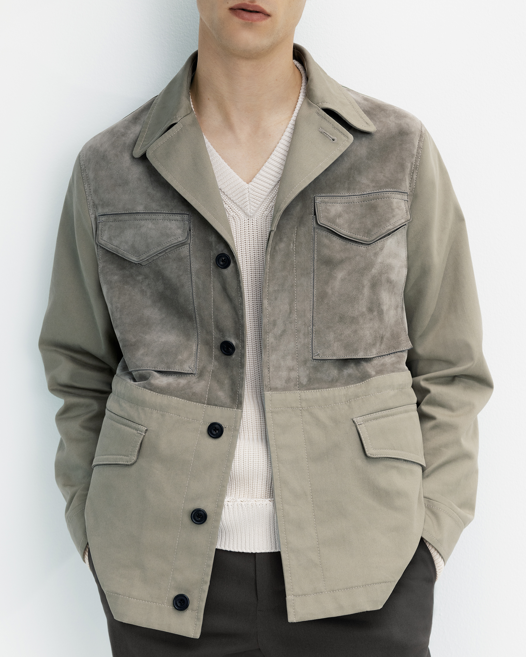 Cette histoire de « Luxe Vibrant » incarne la prémisse de fusion dans des vêtements qui brouillent les lignes entre tissu et cuir. On retrouve un blouson charbonnier bleu pétrole mêlant daim et laine technique, une veste militaire couleur sable qui marie des panneaux de daim et de coton, et un carcoat gris résistant à l’eau, rehaussé d’accents en cuir. L’accent est mis sur la légèreté avec un coupe-vent marine en daim non doublé et des tricots super-légers comme une veste non structurée en coton-soie vert militaire.