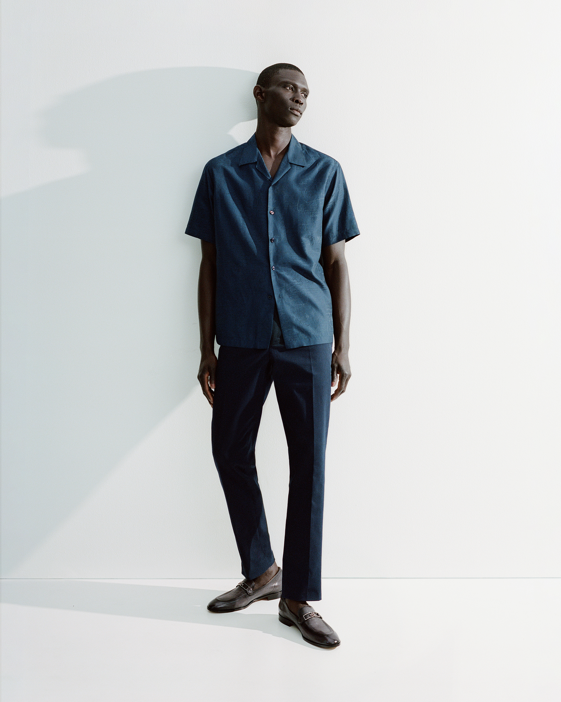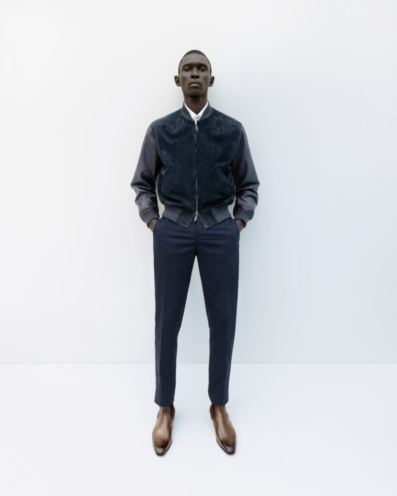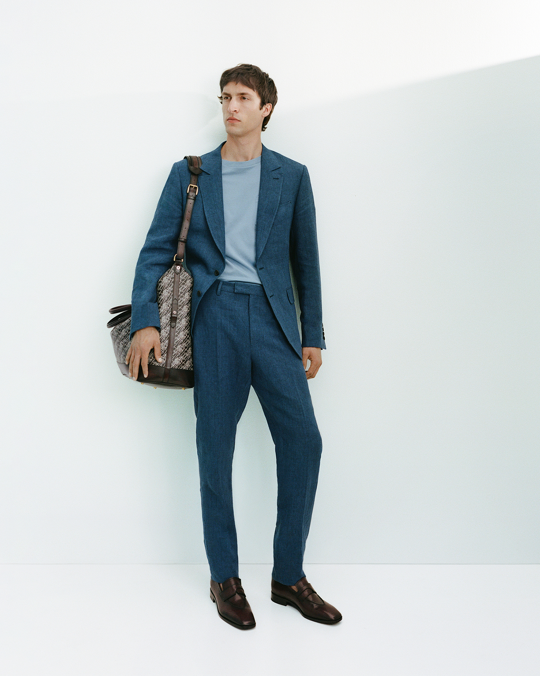 L’histoire de l’été Iconique cultive l’attention portée aux matériaux légers et à la légèreté de construction de la collection. Les costumes en lin délavé aux pantalons dans des tons de bleu adoucissent un classique de l’été. Un blouson ripstop marine avec pantalon assorti incarne la facilité de l’habillement générationnel. Un blouson en cuir perforé marine transpose un trope automnal dans le langage de l’été.