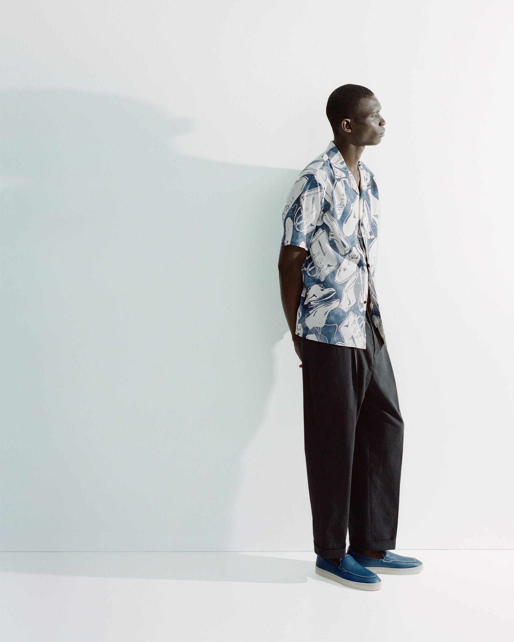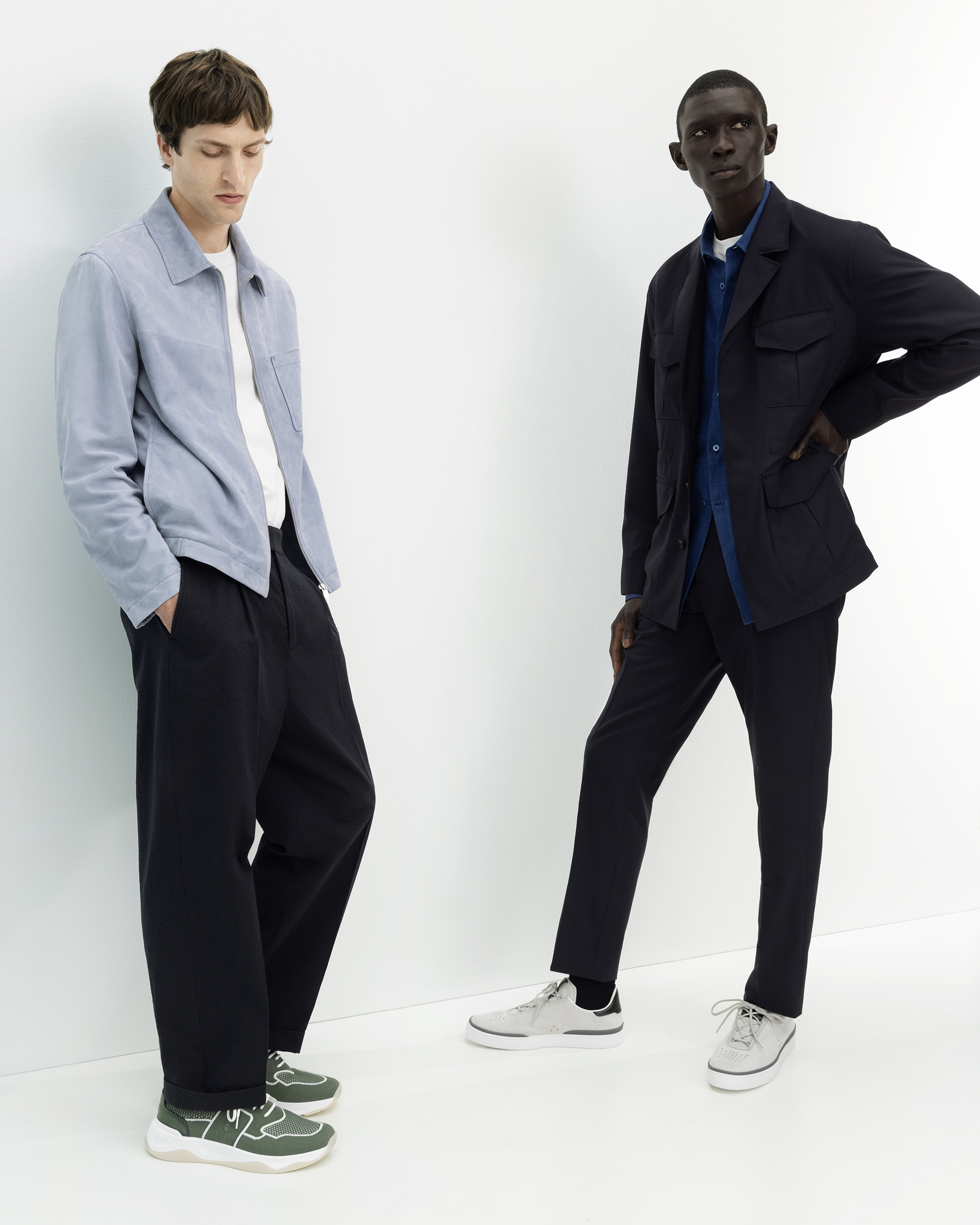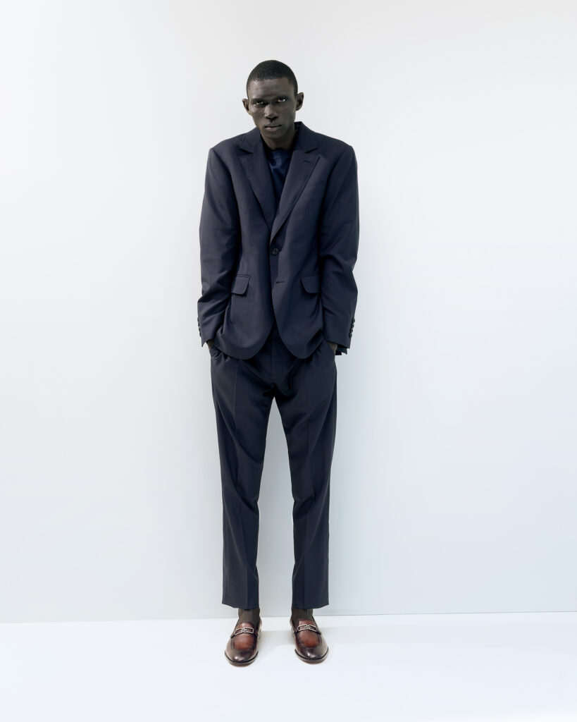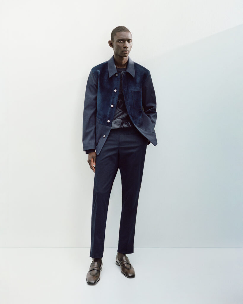 L’histoire de l’été Iconique cultive l’attention portée aux matériaux légers et à la légèreté de construction de la collection. Les costumes en lin délavé aux pantalons dans des tons de bleu adoucissent un classique de l’été. Un blouson ripstop marine avec pantalon assorti incarne la facilité de l’habillement générationnel. Un blouson en cuir perforé marine transpose un trope automnal dans le langage de l’été.
