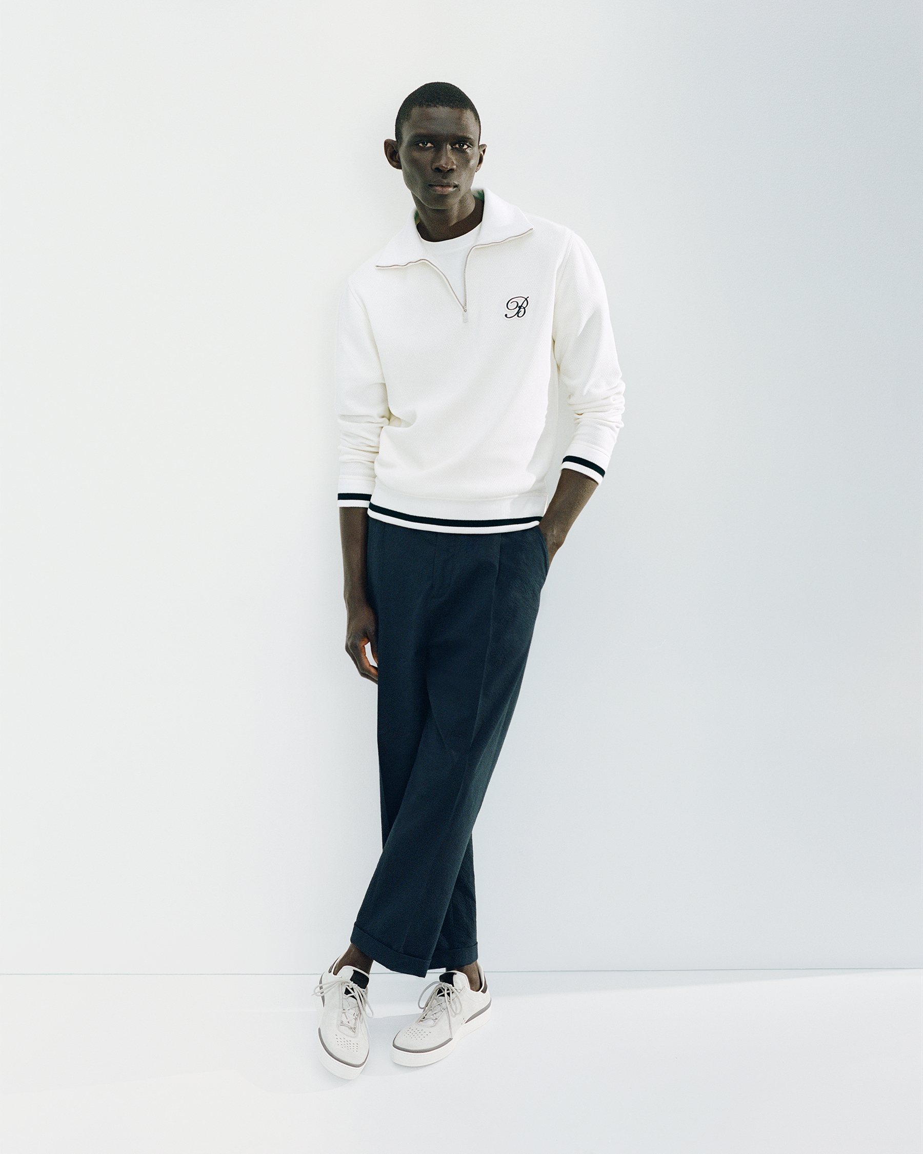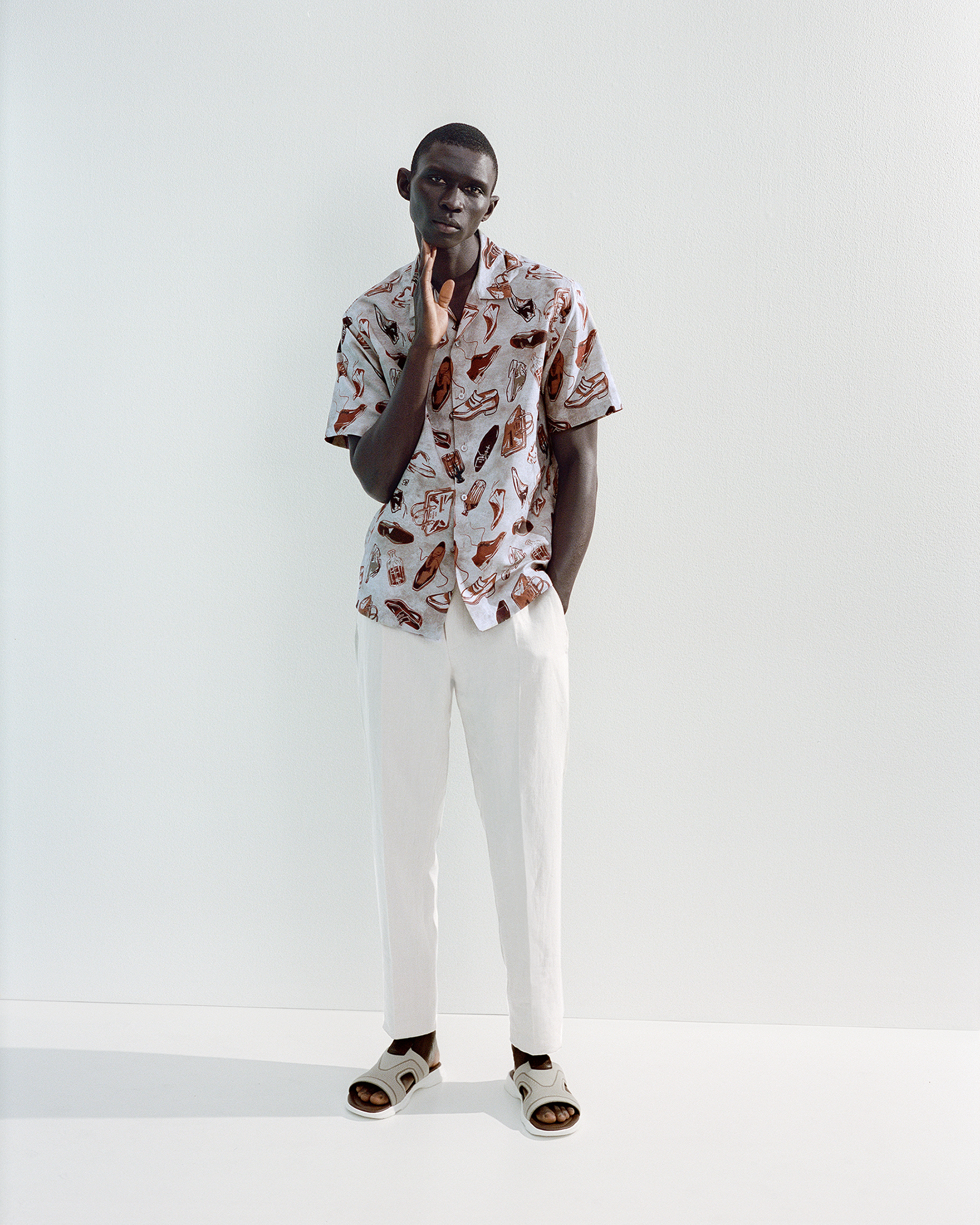 Les signes distinctifs connus des accessoires de la Maison sont convertis en vêtements : le motif Scritto embellit les poches des chemises en lin, le demi-zip du sac Un Jour se fond dans les chinos, et le logo B apparaît en broderies sur les tricots. Dans un esprit ludique de fusion des accessoires et des vêtements, un nouveau graphique composé d’illustrations de chaussures et de sacs apparaît dans les imprimés de chemises et l’intarsia de tricots.