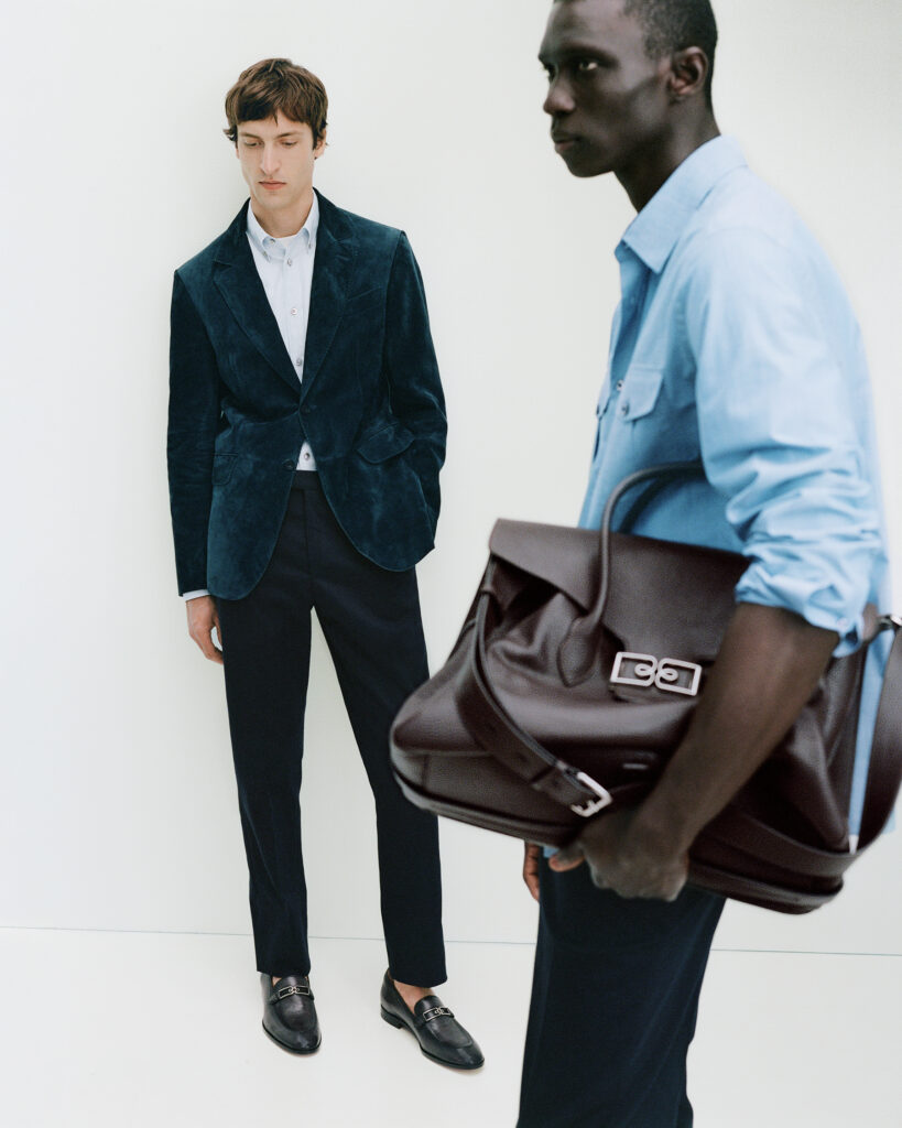 Les accessoires du printemps de Berluti mixent les signatures de la Maison. Le mocassin B Volute et le sac de 48 heures en cuir grainé intègrent un emblème de moulure de fer d’archive, adapté de l’escalier de la boutique historique de la rue Marbeuf. Un mocassin à bout carré et une botte en cuir grainé reprennent le double rabat de la mallette Grand Écritoire. Réalisé en cuir Venezia souple, le Demesure Flex est une version confortable de la chaussure formelle du même nom de la Maison. Avec son fond en forme d’enveloppe et sa poche trompe-l’œil, le messager Toujours évolue à partir de son sac fourre-tout homonyme dans un design doux et spacieux en cuir Venezia Ice Gold ou Jungle Green.