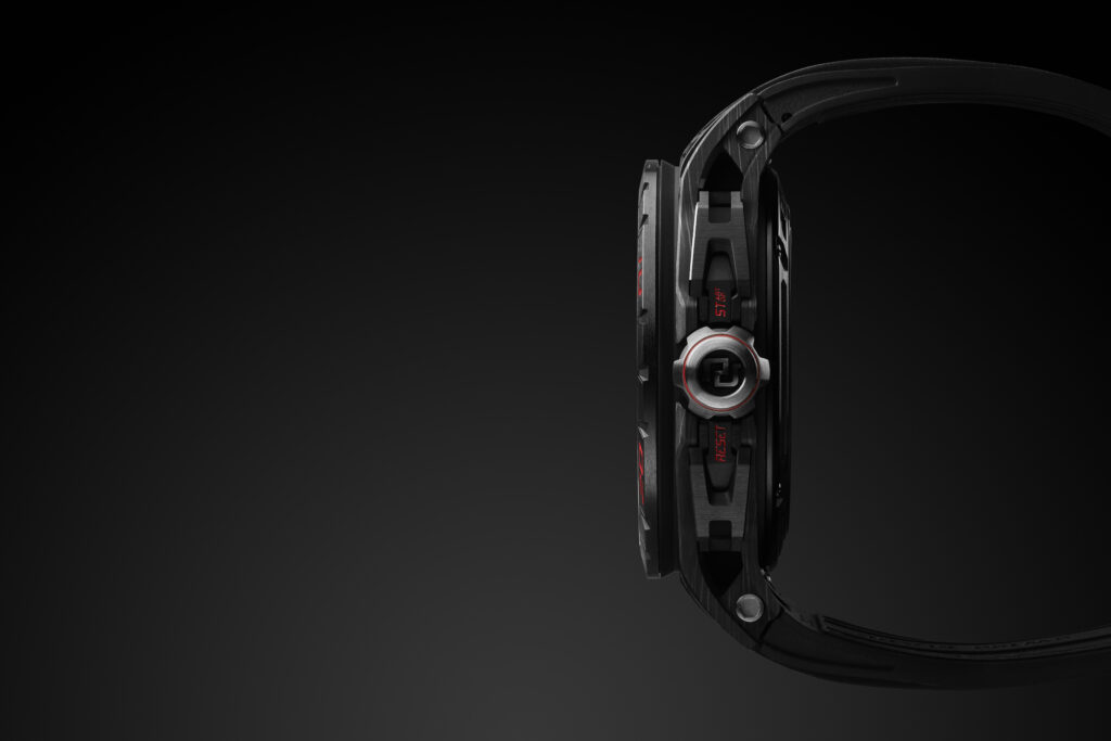 L’Excalibur Spider Flyback Chronograph se distingue également par son design extérieur audacieux. Le boîtier de 45 mm, fabriqué en carbone léger, arbore une combinaison parfaite de lignes tranchantes et d’encoches signature, et est doté de poussoirs squelettés. L’association de carbone et de céramique est un hommage à la construction des supercars. Le dos de la montre, inspiré des jantes de supercars, et le bracelet en caoutchouc noir, doté d’encoches pour créer plus de volume, complètent ce design exceptionnel.