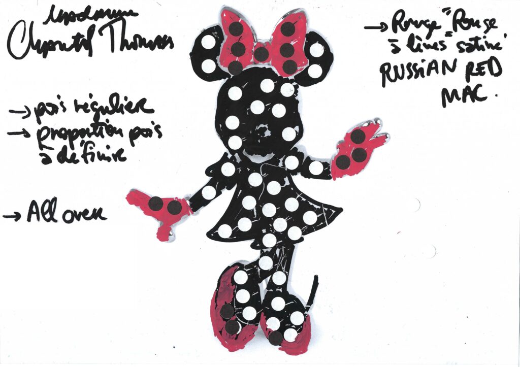 La créatrice plonge alors Minnie dans un bain de confettis noirs, blancs et rouges, clin d’œil à son rouge à lèvres emblématique. « Des confettis comme ses grains de beauté, dont les précieuses usaient et abusaient comme autant de messages de séduction ! » s’amuse Chantal Thomass.