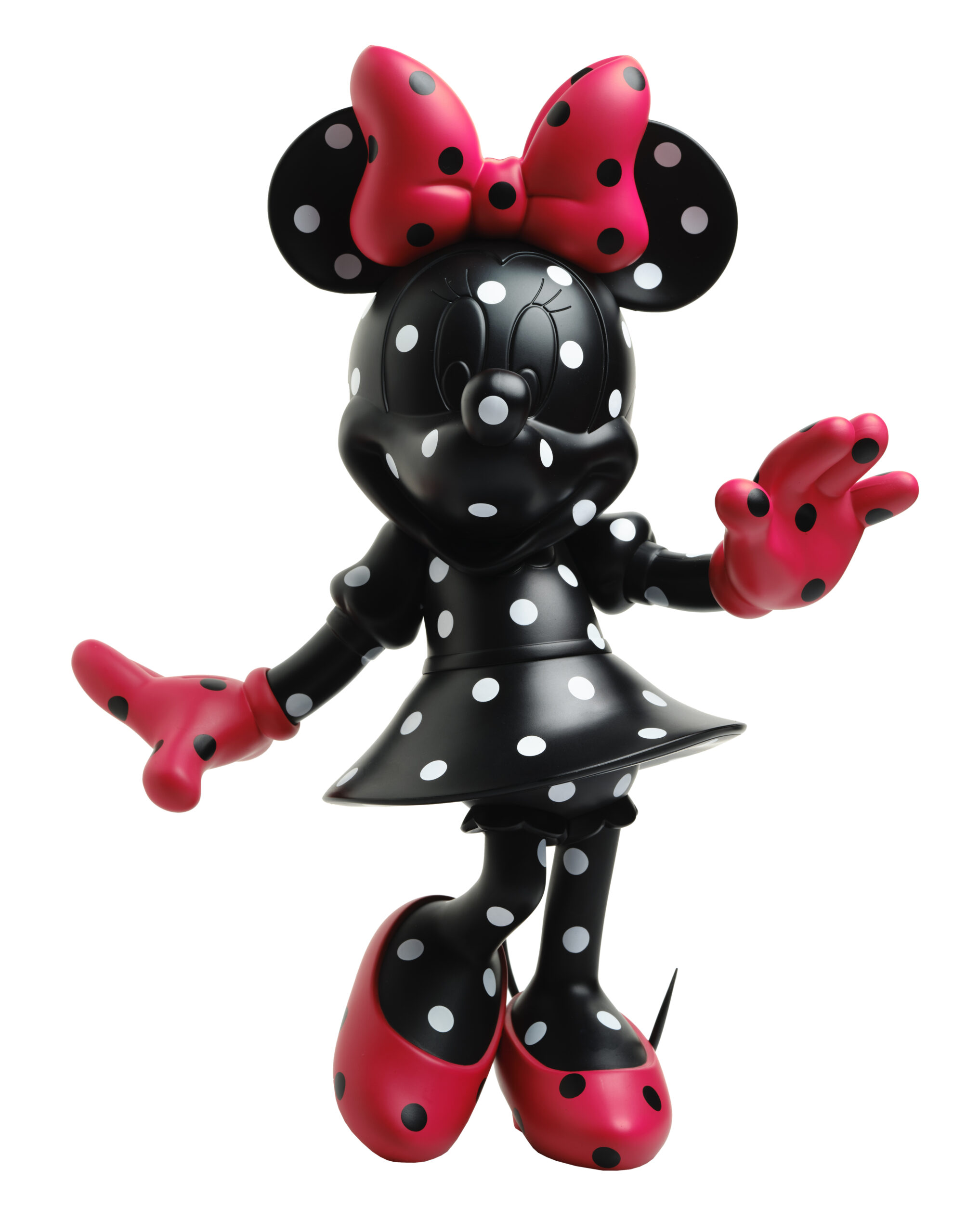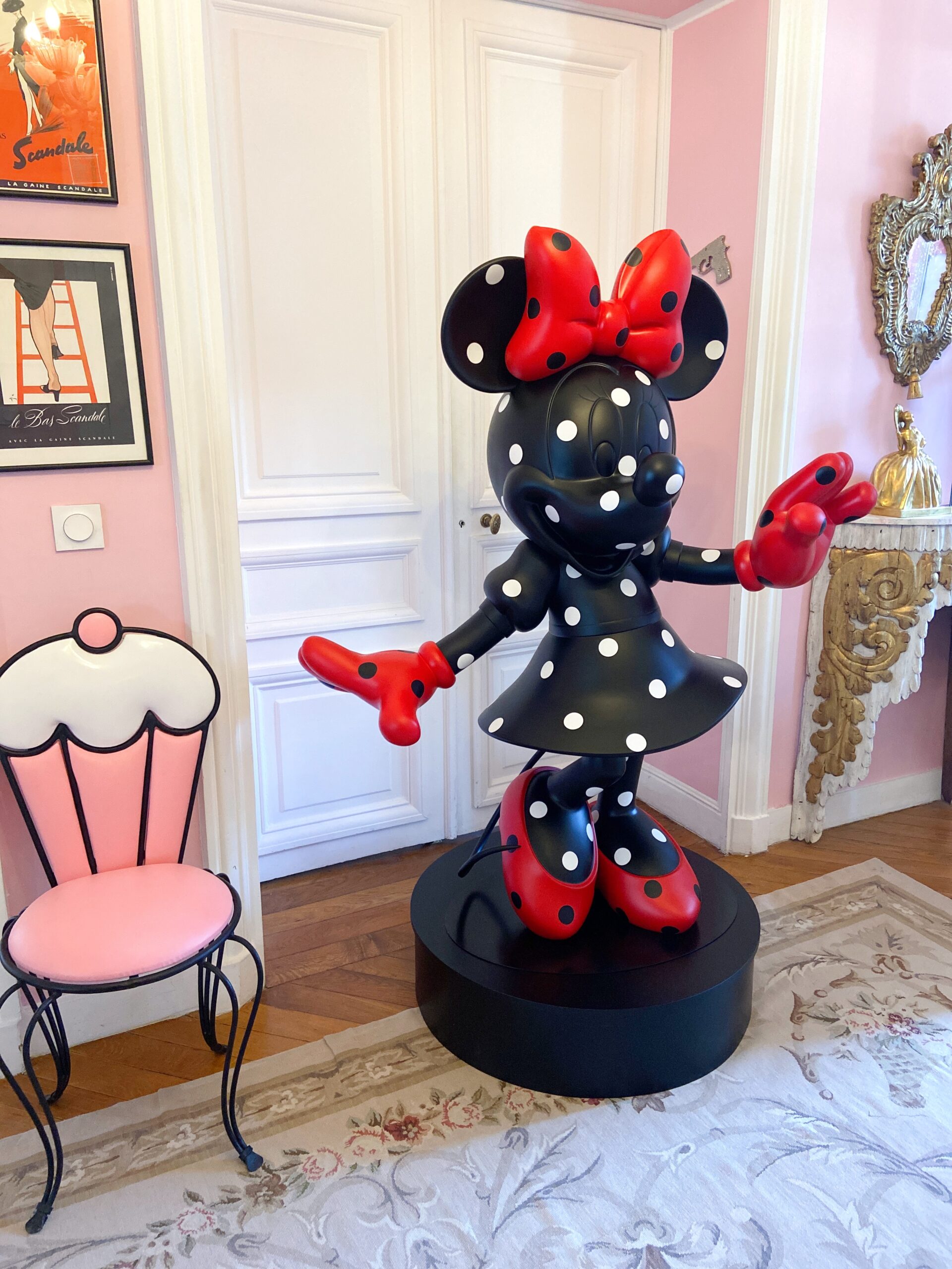 Cette réinterprétation donne naissance à une figurine Pop Art haute de 31 cm. Les couleurs fétiches de Chantal Thomass – le noir, le blanc et le rouge – habillent avec punch cette Minnie new-wave.
