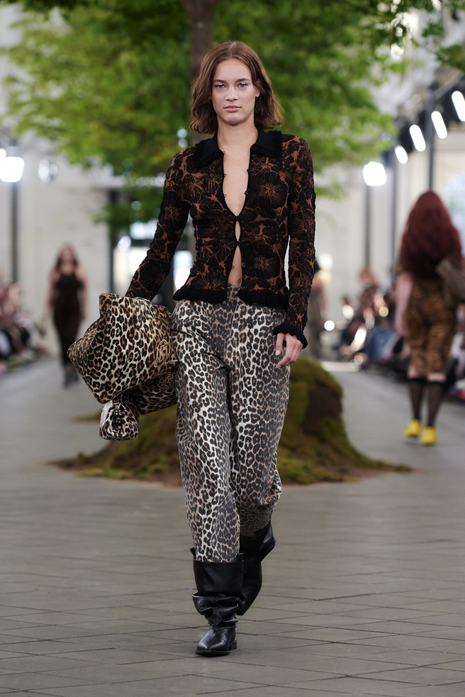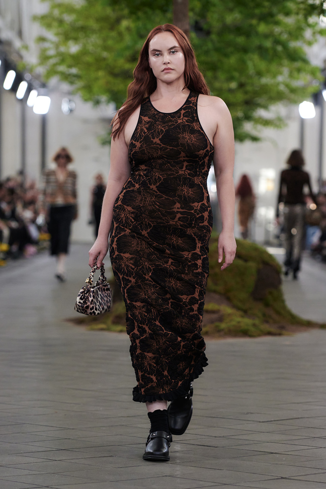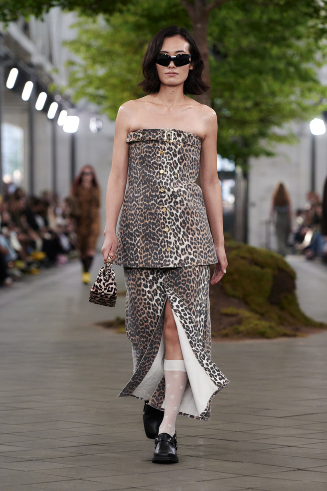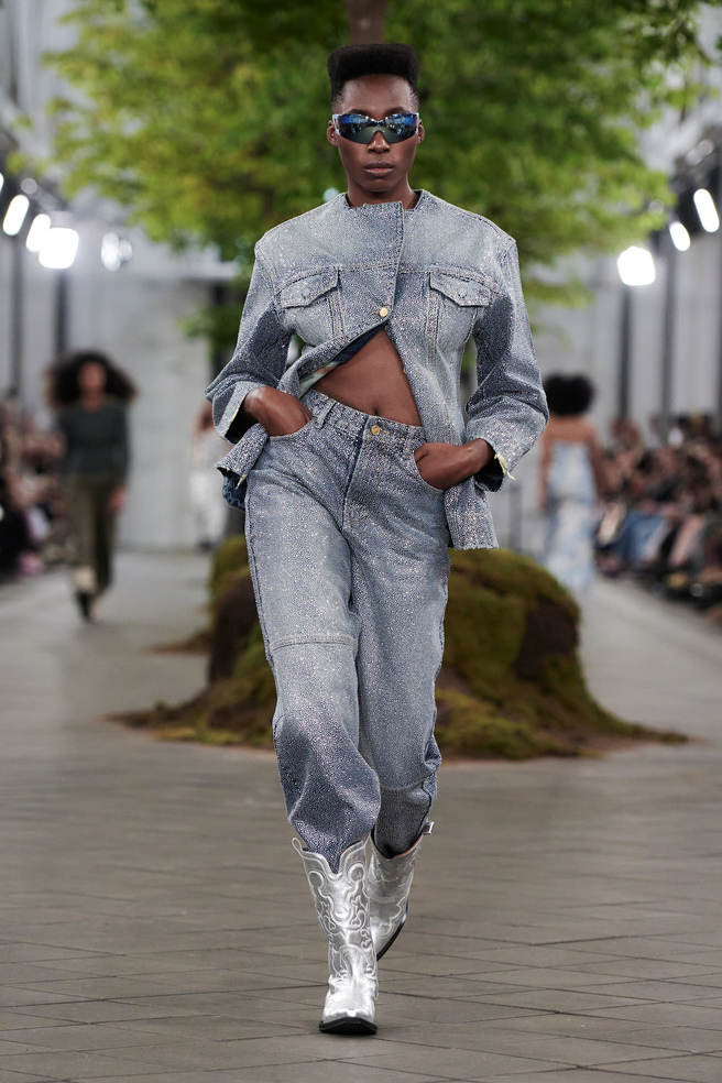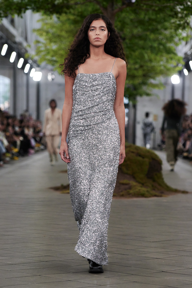 Au-delà de l’innovation technologique, GANNI SS24 s’efforce d’incarner la responsabilité environnementale. Des termes tels qu’Oleatex et Algreen ne sont pas simplement des jargons techniques, mais des symboles de l’engagement de GANNI en faveur de l’écologie. Oleatex, fabriqué à partir de déchets d’huile d’olive, et Algreen, qui transforme les algues en sequins recyclables, incarnent le futur de la mode durable.
