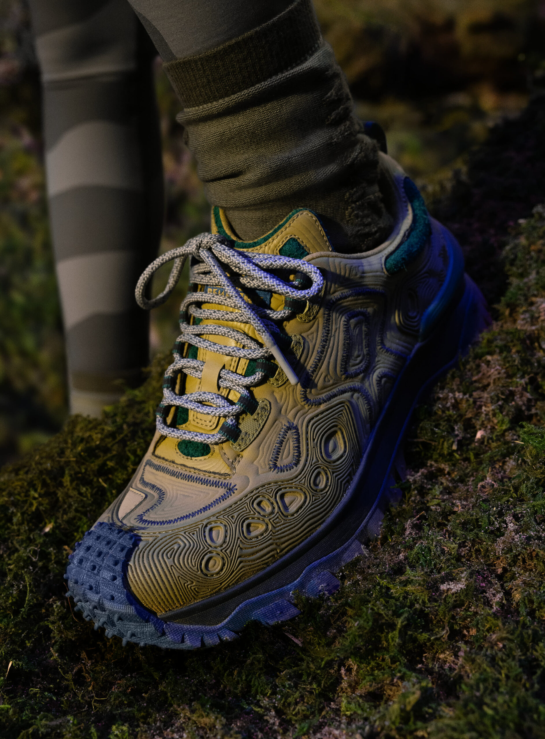Les chaussures suivent le même esprit. La sneaker signature Trailgrip est réimaginée pour la nouvelle génération d’aventuriers et d’amateurs de plein air. Agrémentée du fini « grain » caractéristique, la Trailgrip Grain par Salehe Bembury est proposée en vert, orange et taupe pastel.