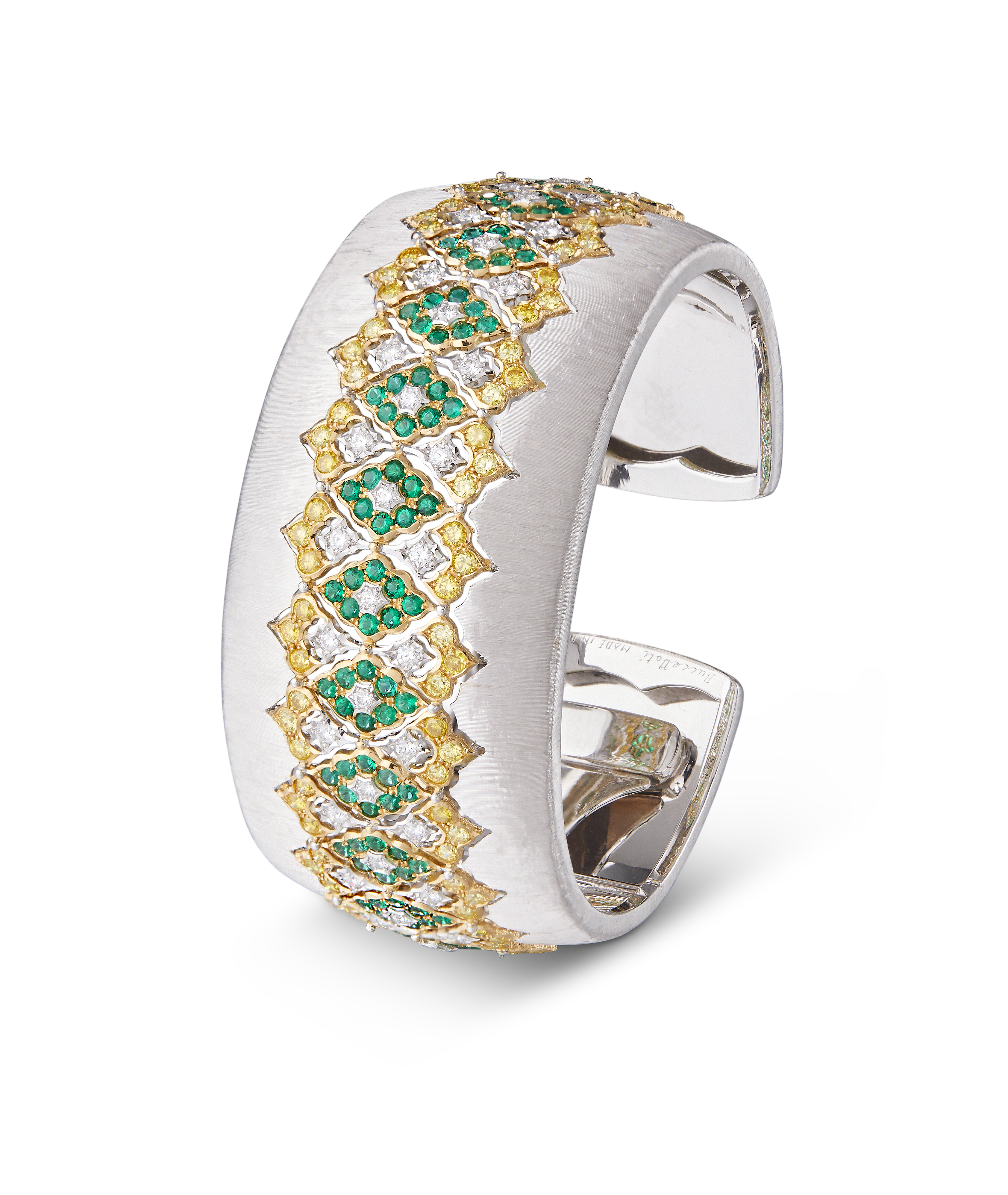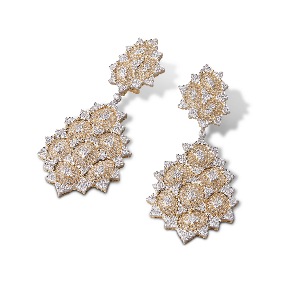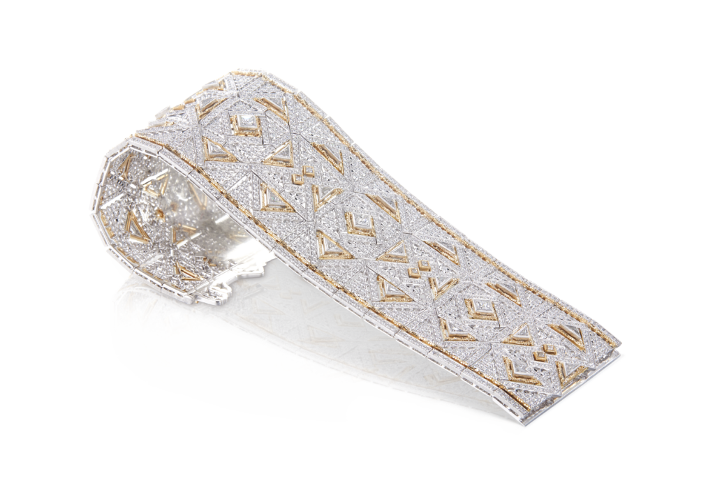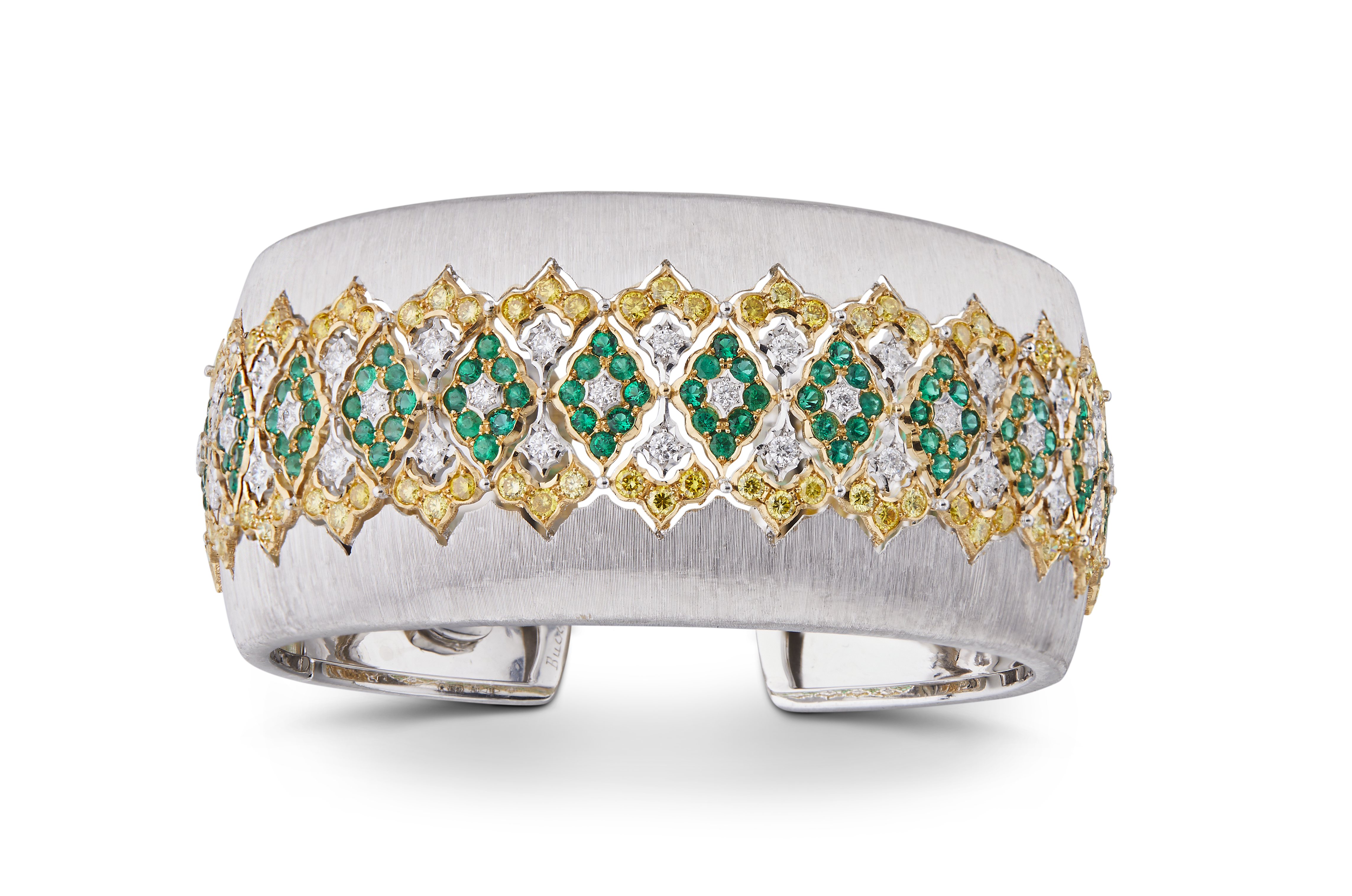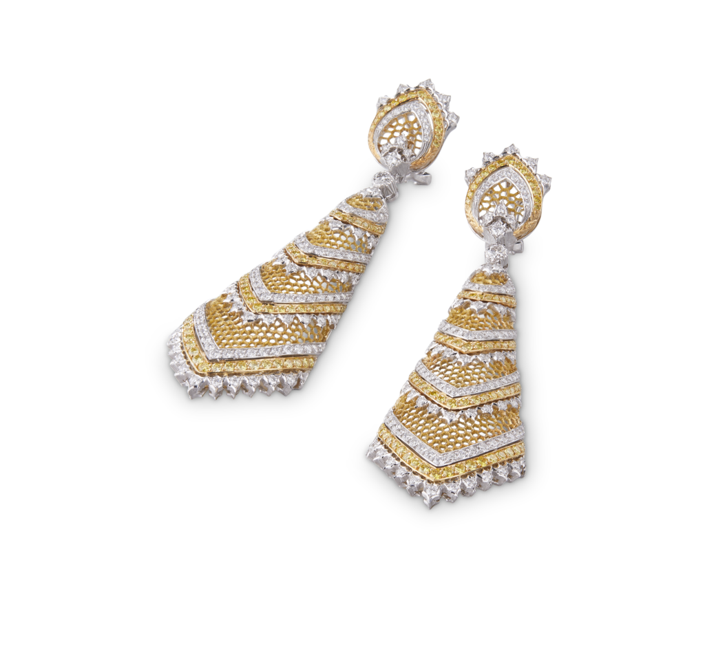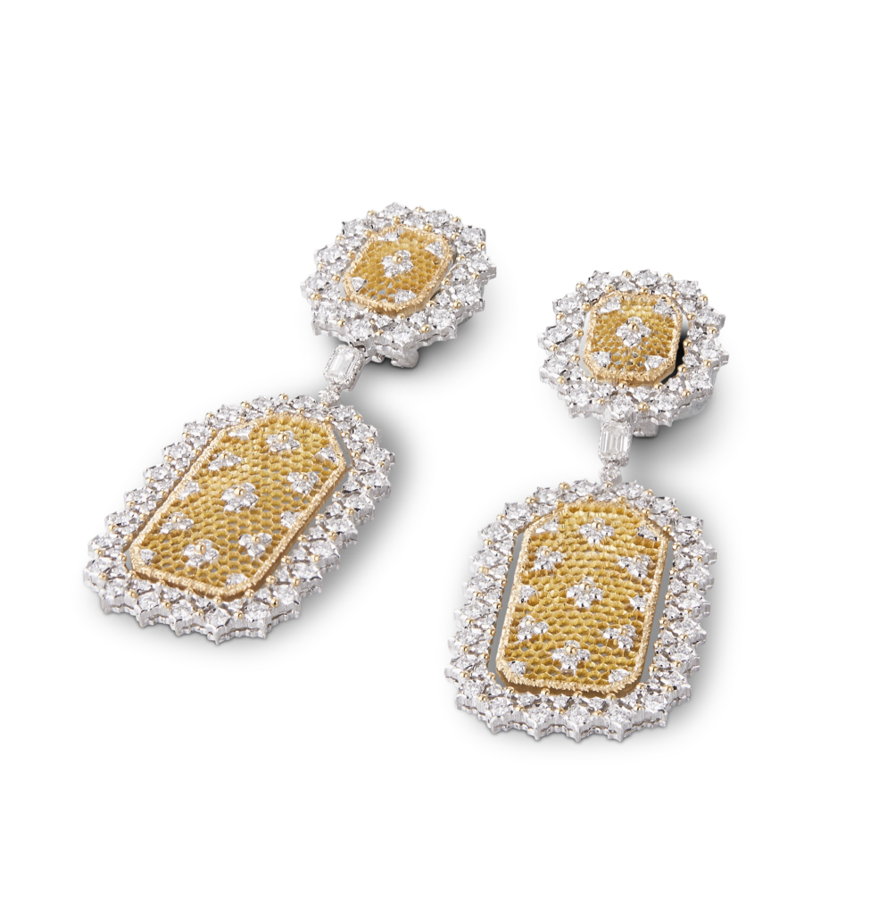 Les bijoux de la collection Mosaico sont en or jaune et or blanc gravés, agrémentés de diamants blancs, de diamants jaunes et de pierres de couleur. Chaque pièce est unique et le prix est disponible sur demande.