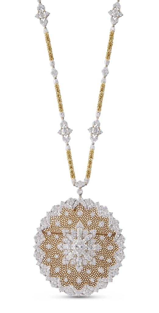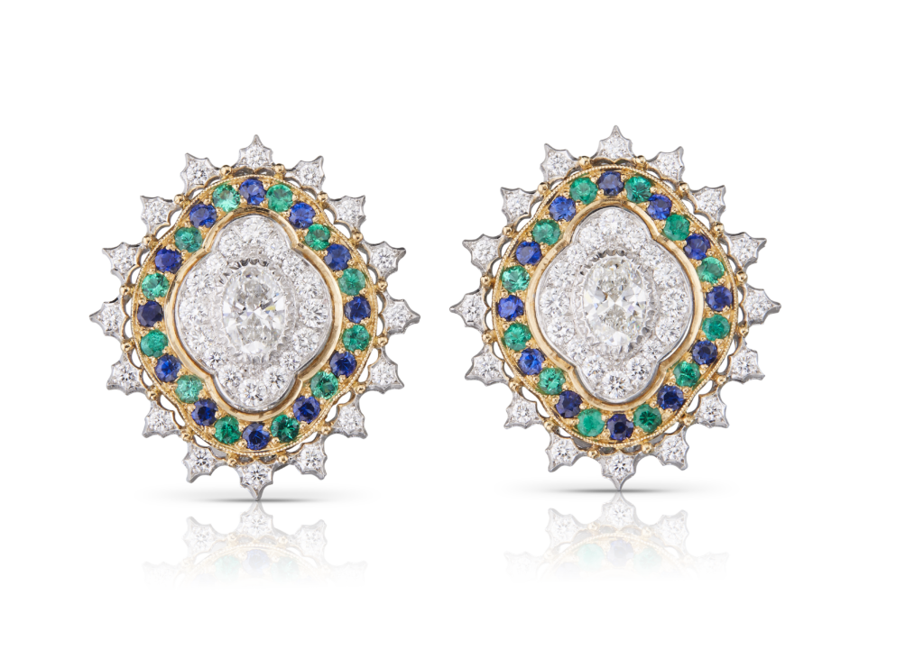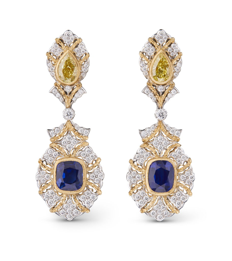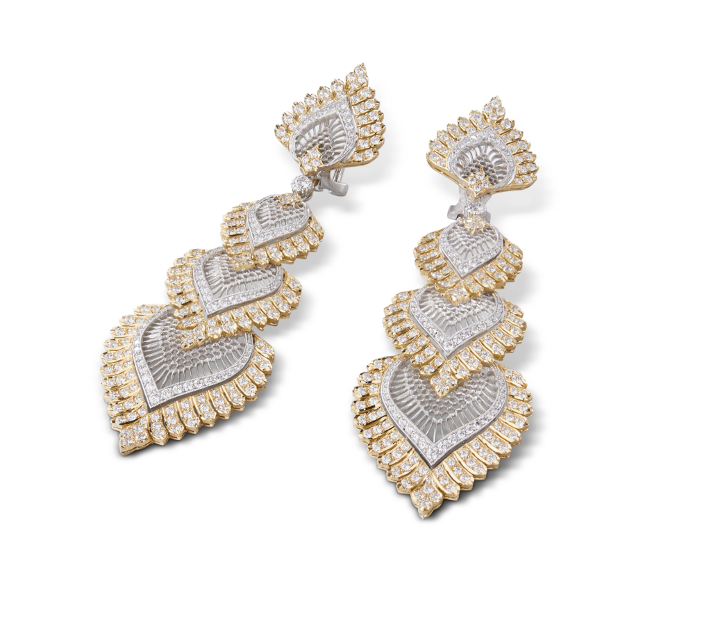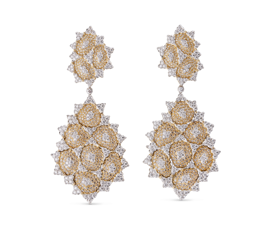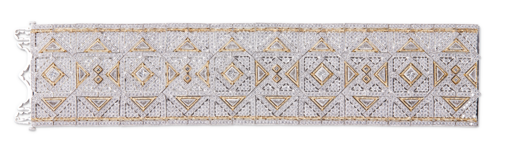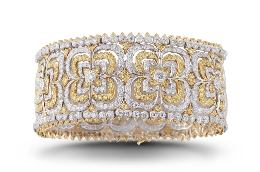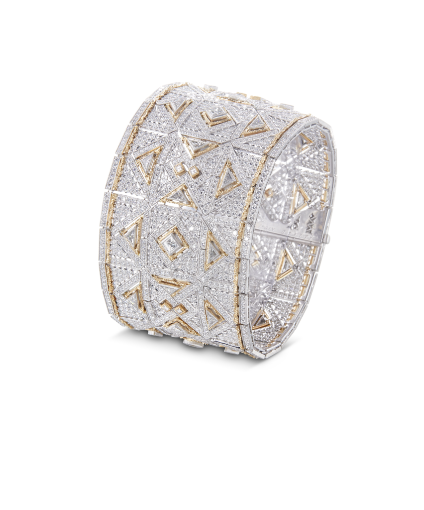 Les bijoux de la collection Mosaico sont en or jaune et or blanc gravés, agrémentés de diamants blancs, de diamants jaunes et de pierres de couleur. Chaque pièce est unique et le prix est disponible sur demande.
