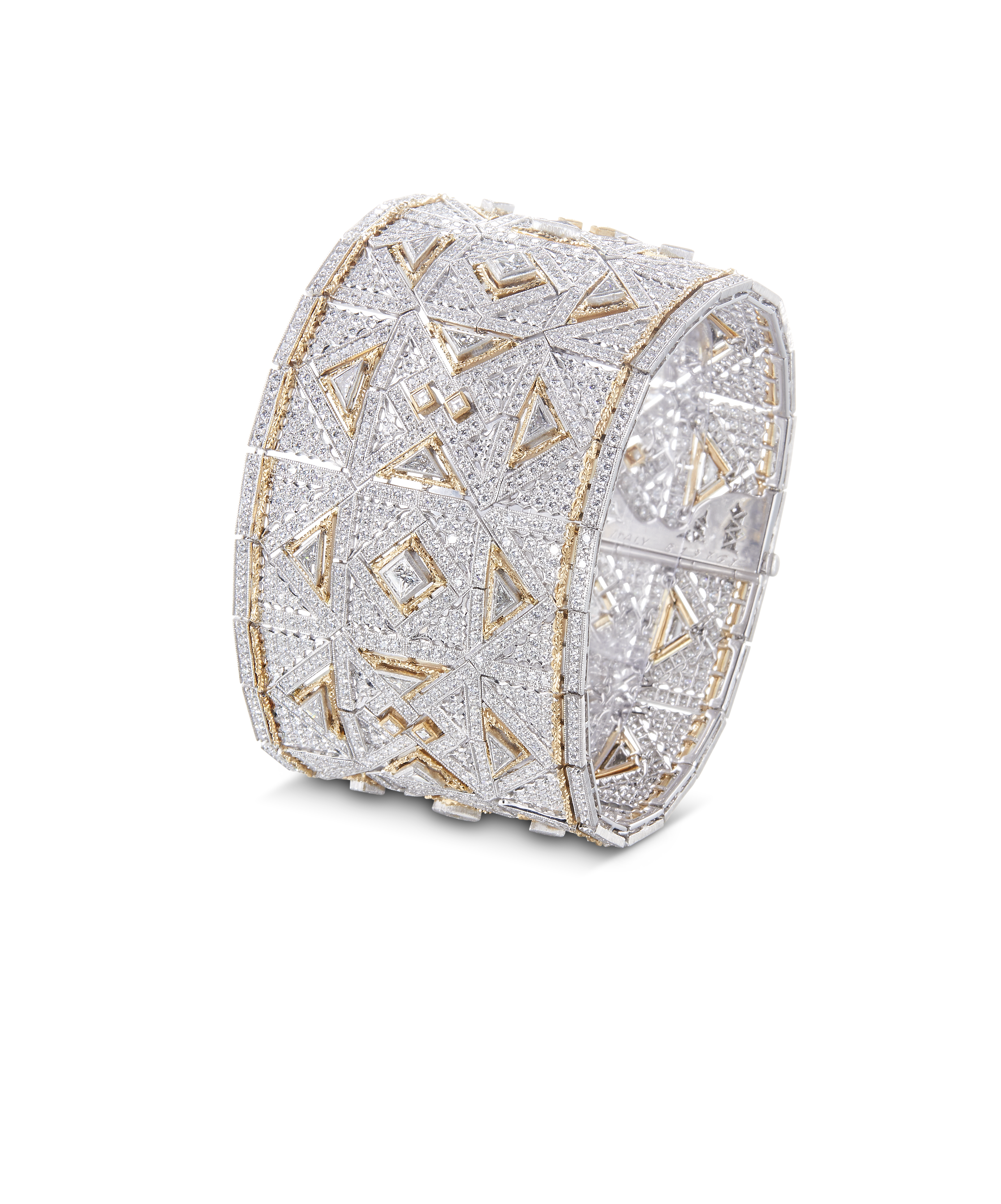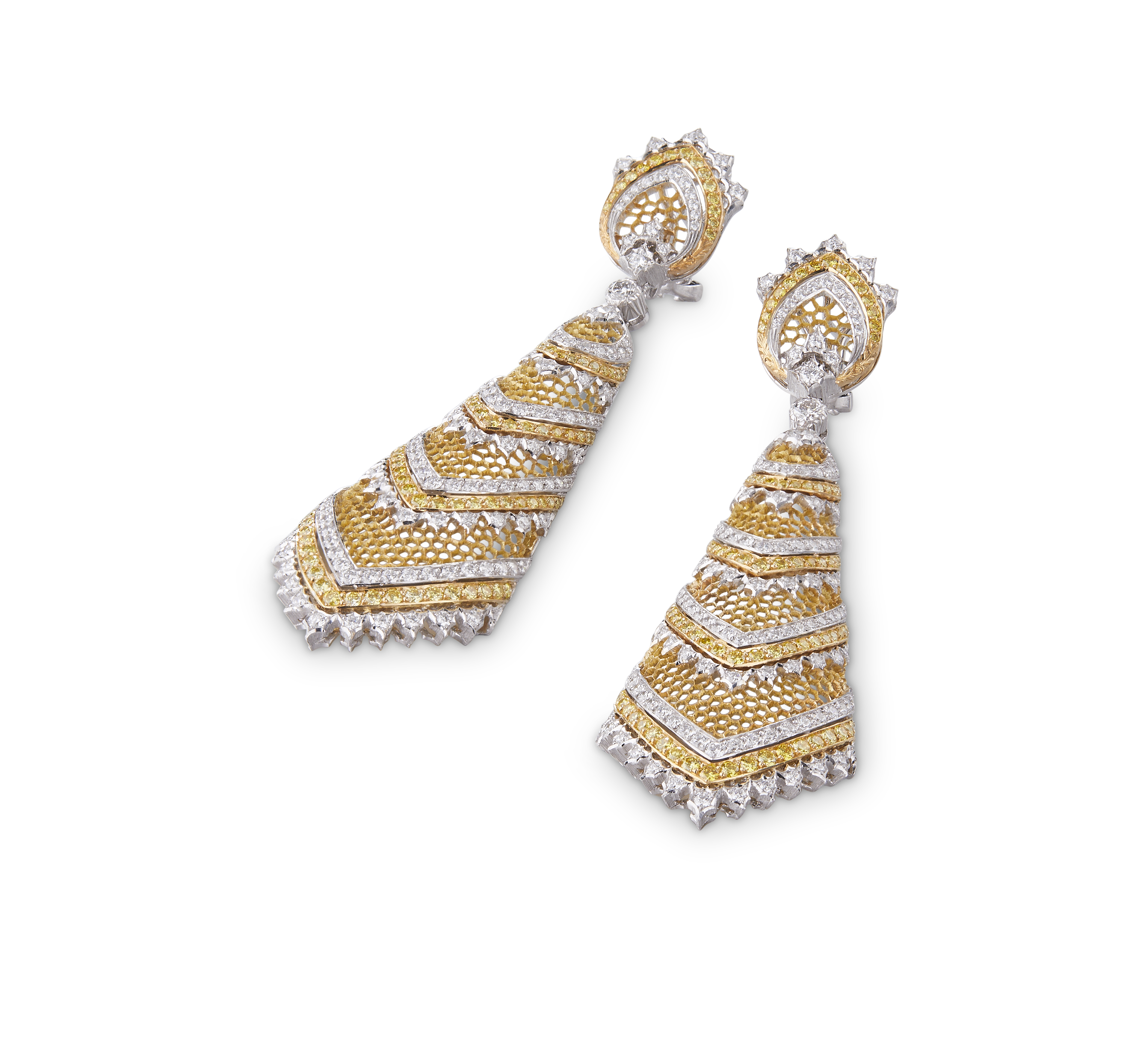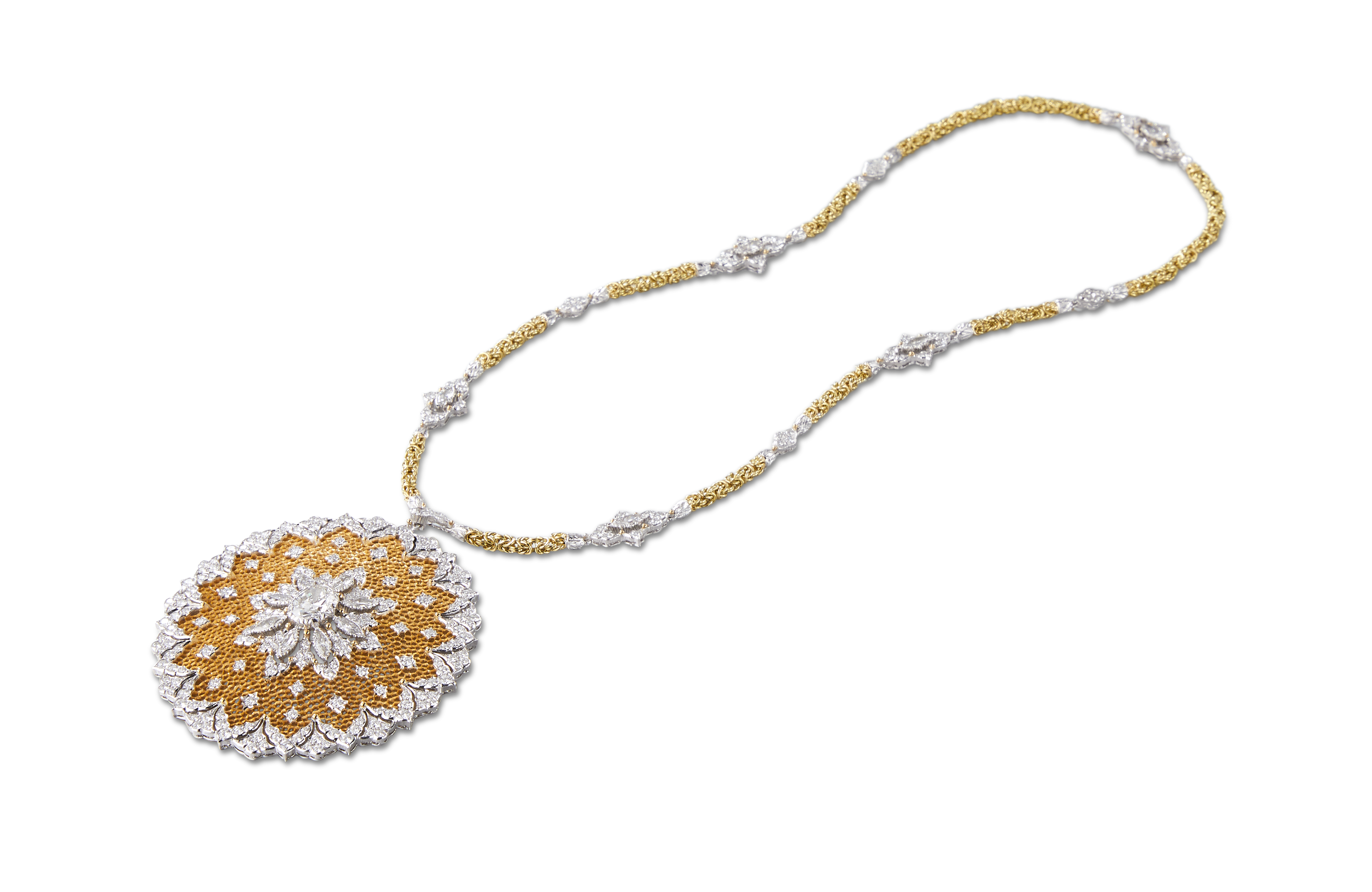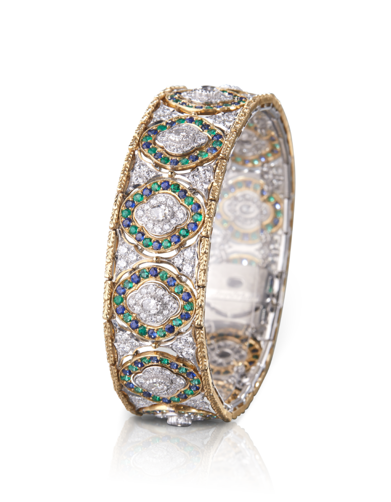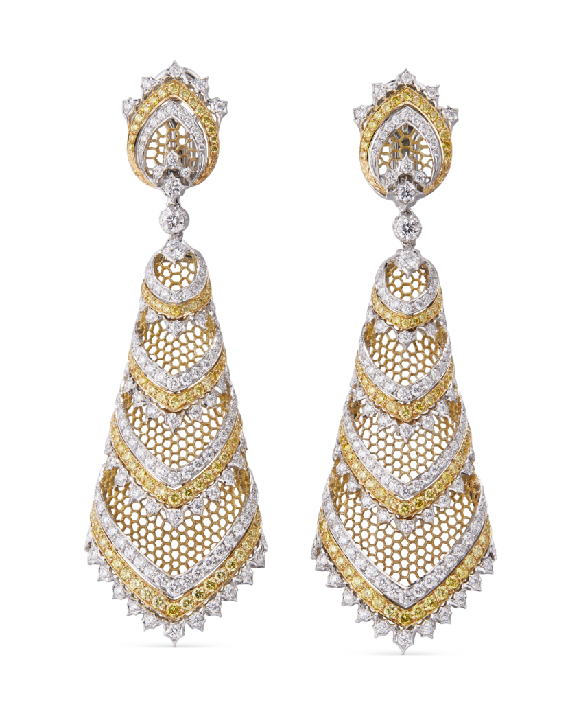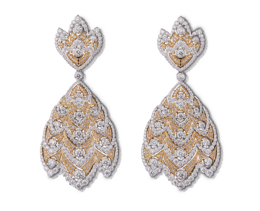 Les bijoux de la collection Mosaico sont en or jaune et or blanc gravés, agrémentés de diamants blancs, de diamants jaunes et de pierres de couleur. Chaque pièce est unique et le prix est disponible sur demande.