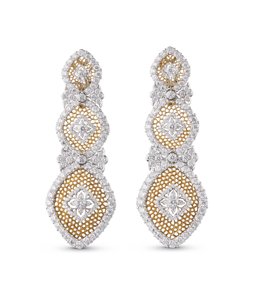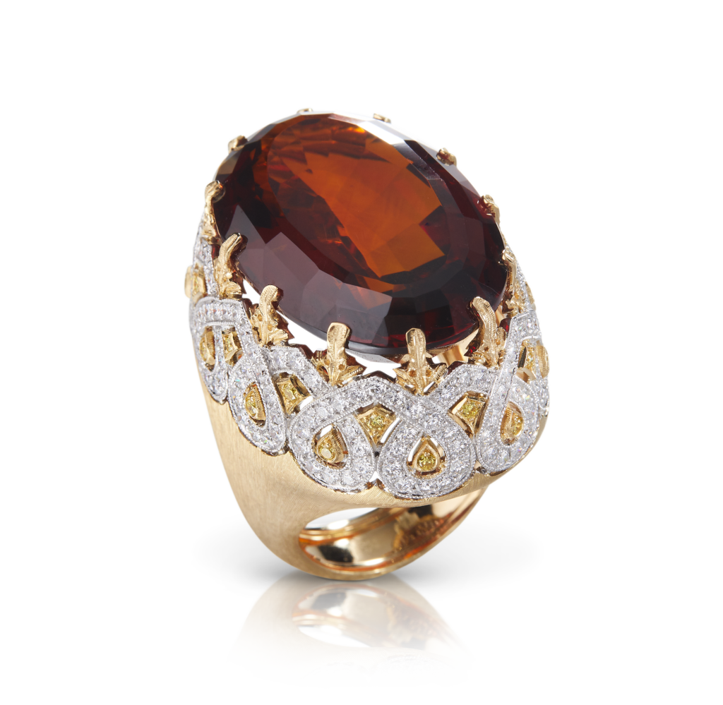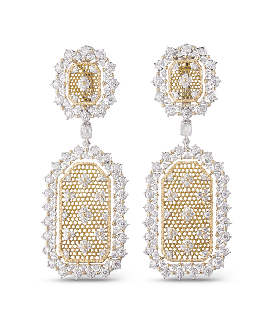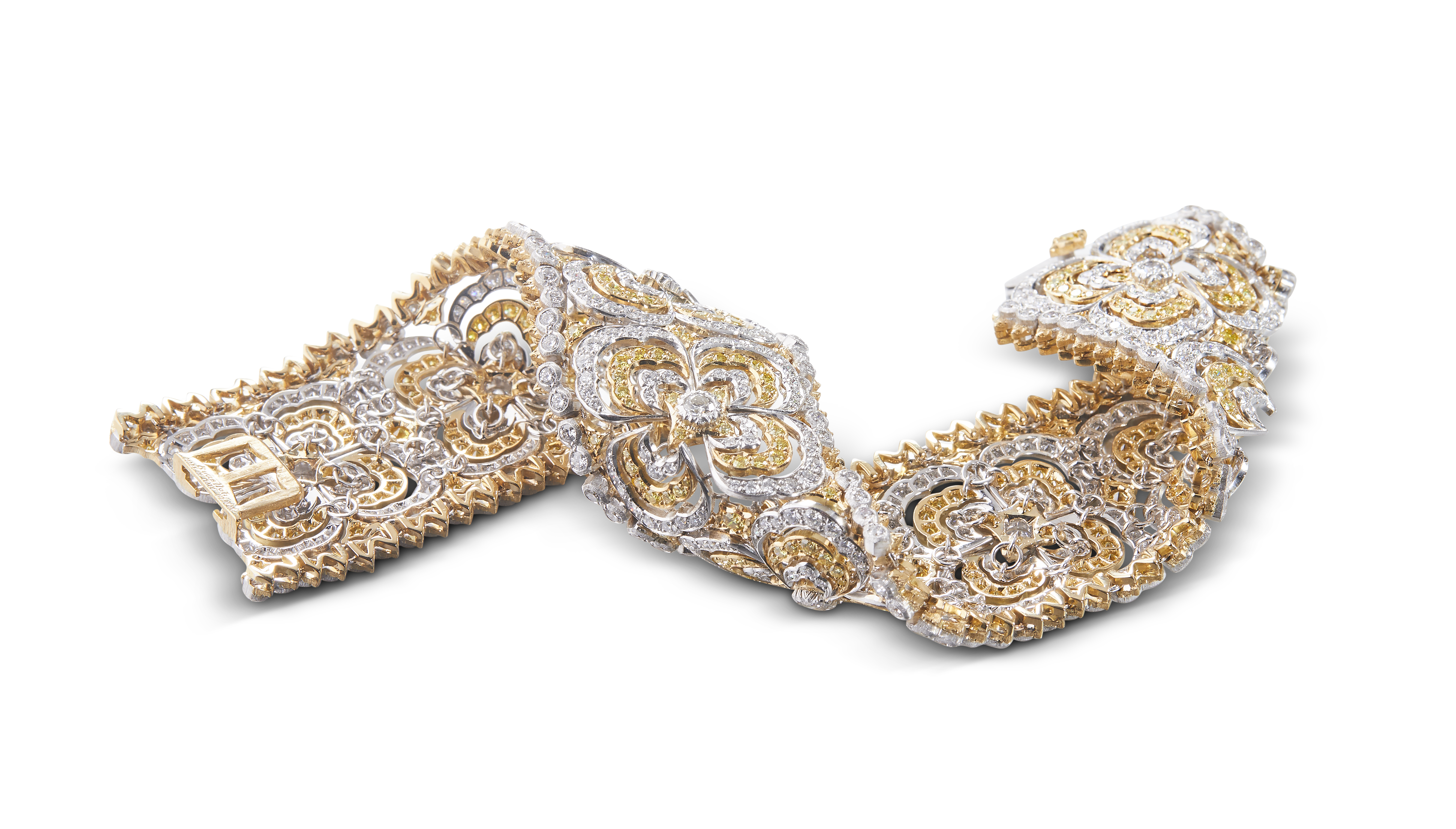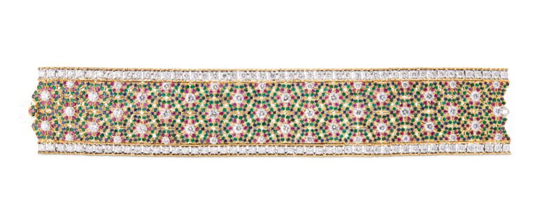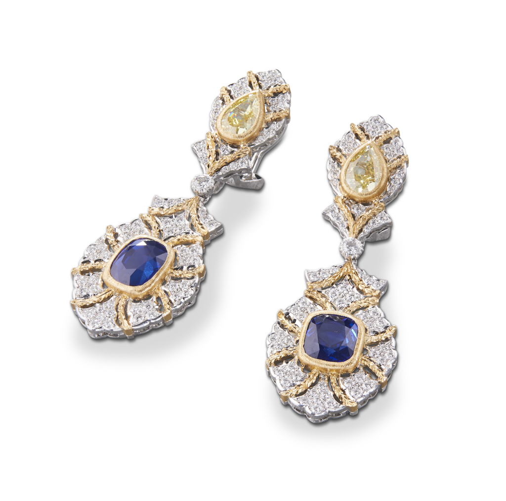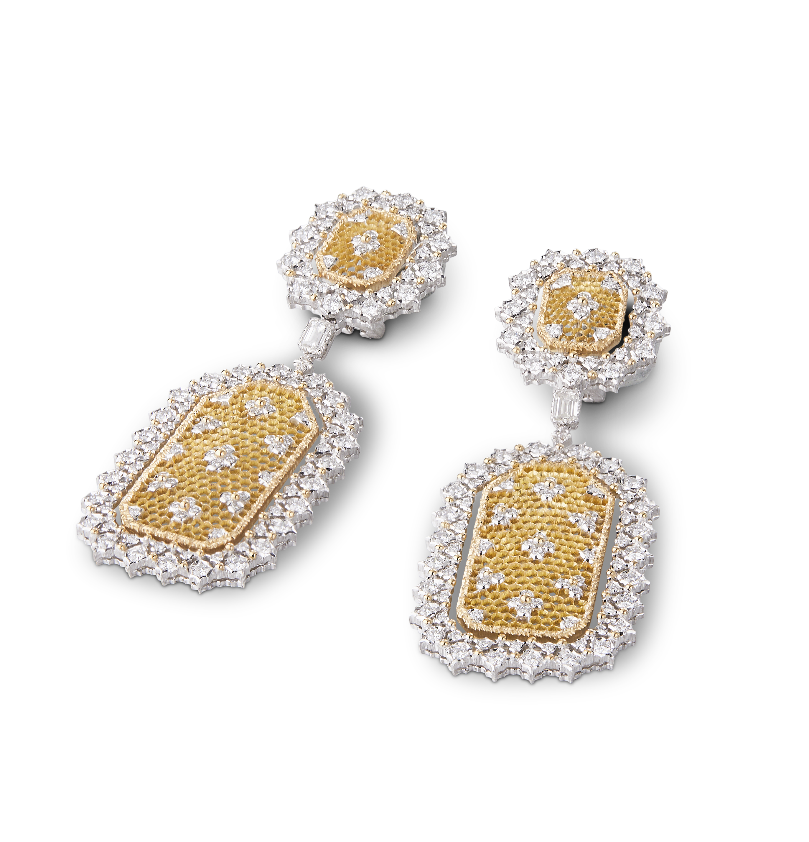 Les bijoux de la collection Mosaico sont en or jaune et or blanc gravés, agrémentés de diamants blancs, de diamants jaunes et de pierres de couleur. Chaque pièce est unique et le prix est disponible sur demande.
