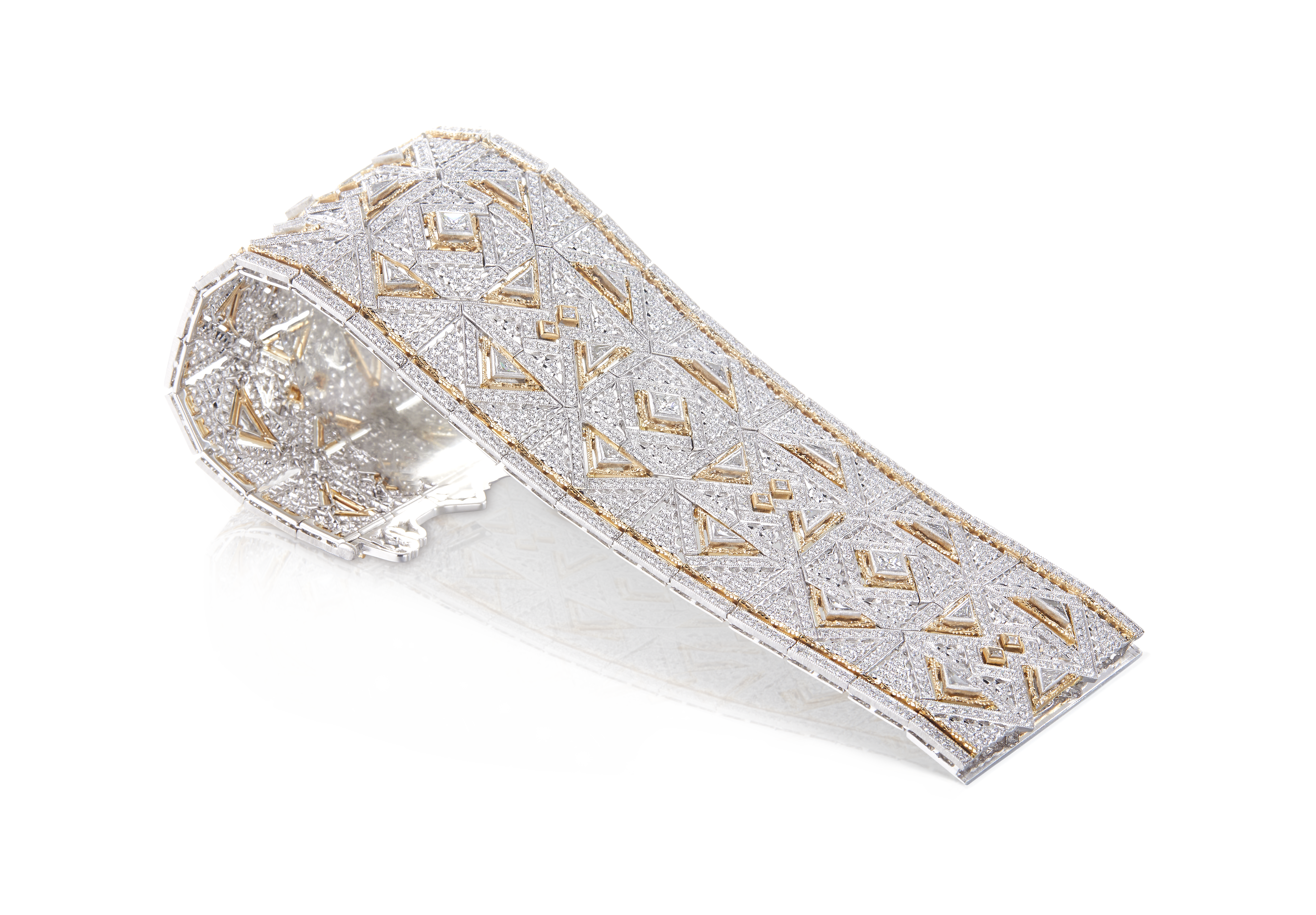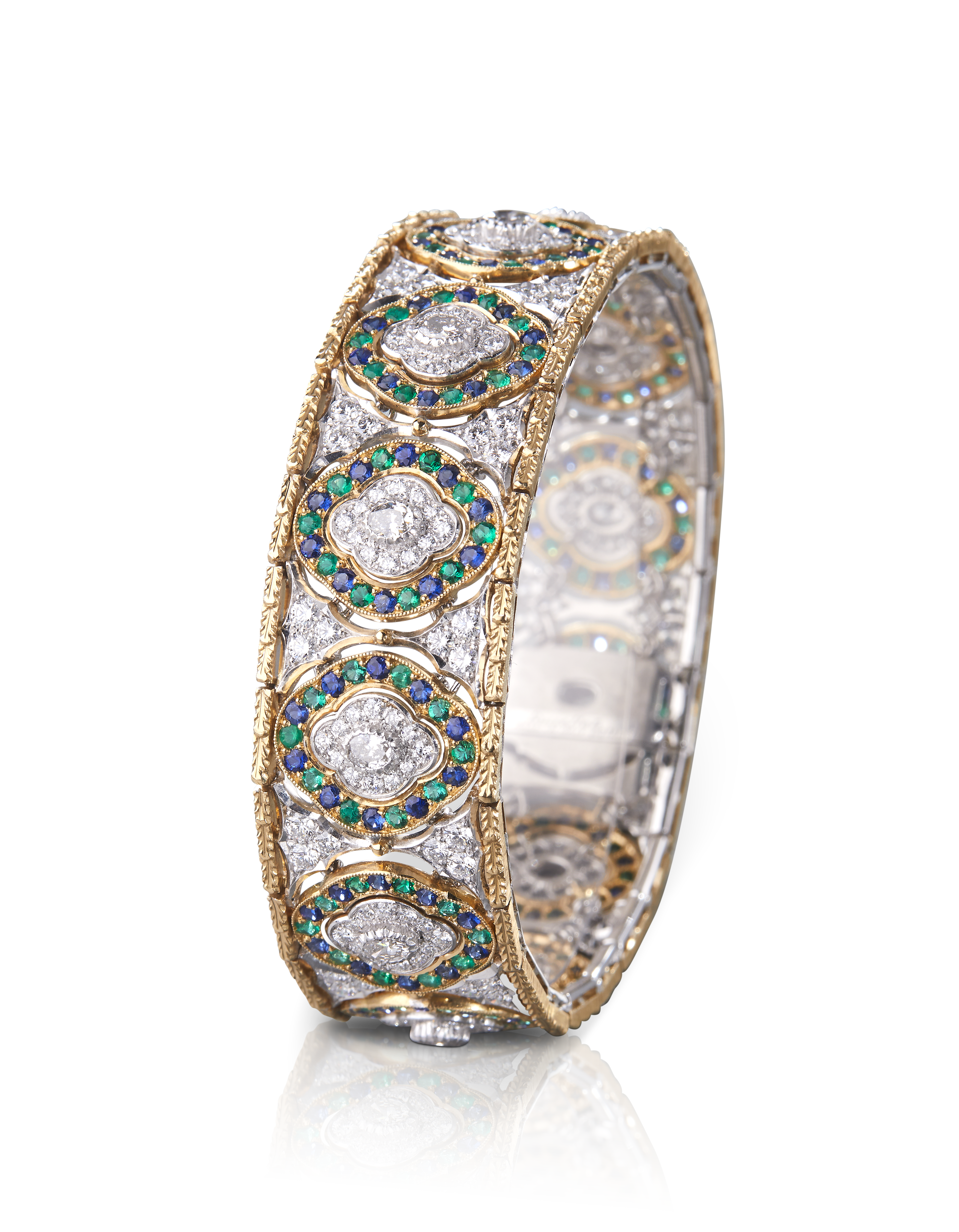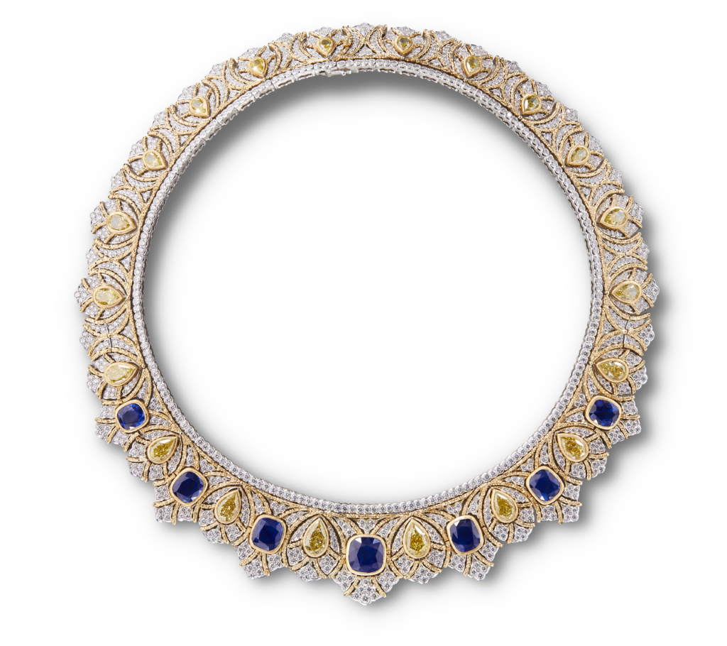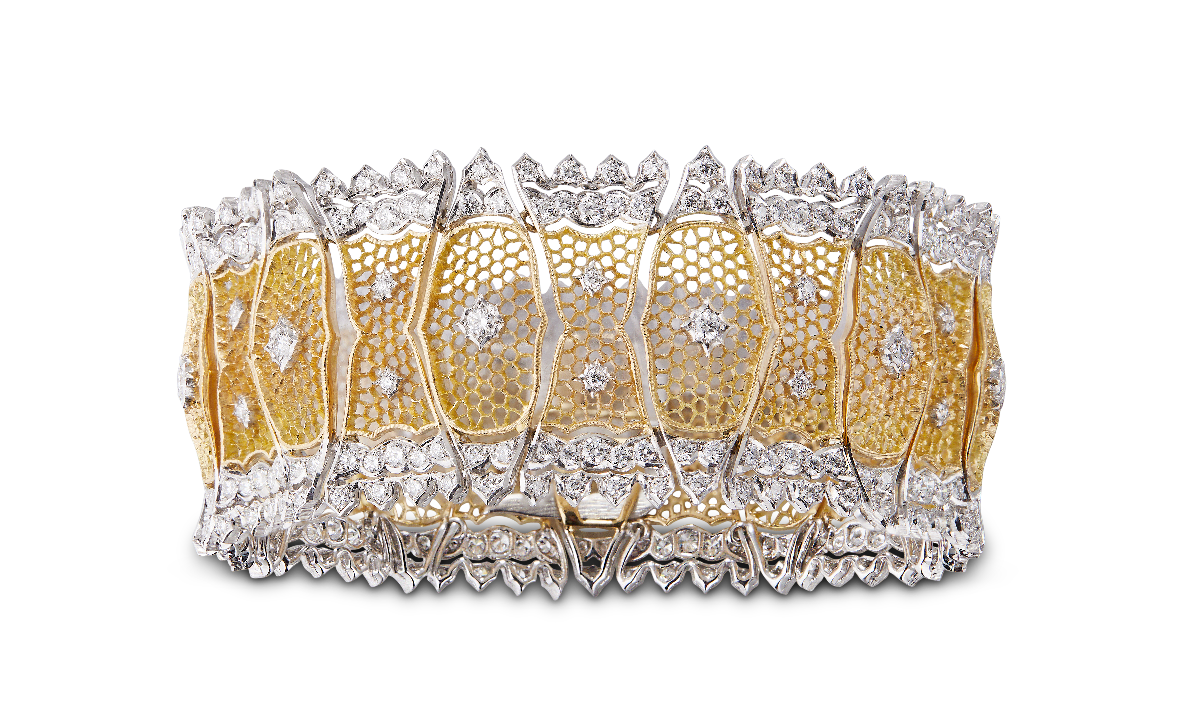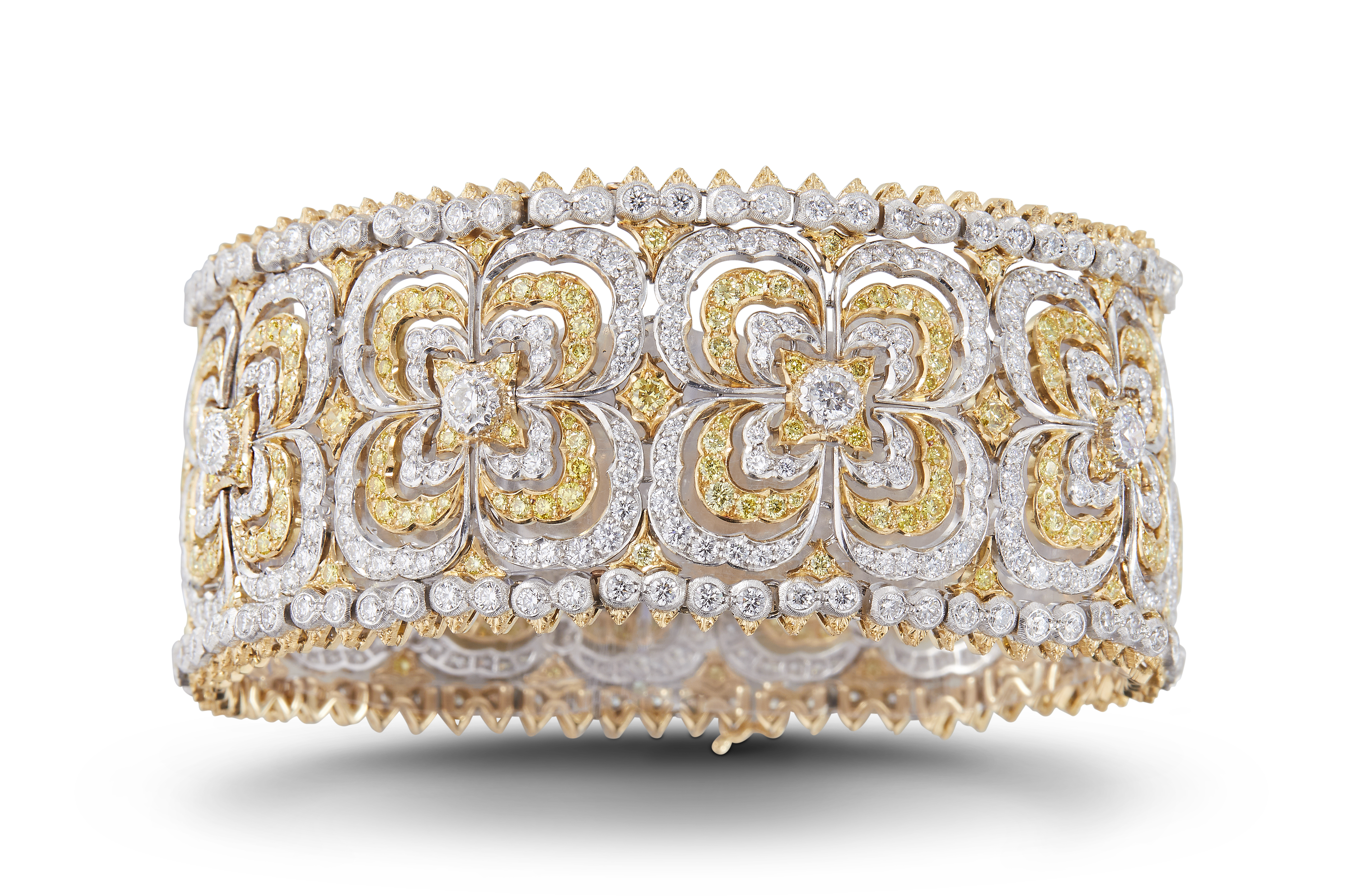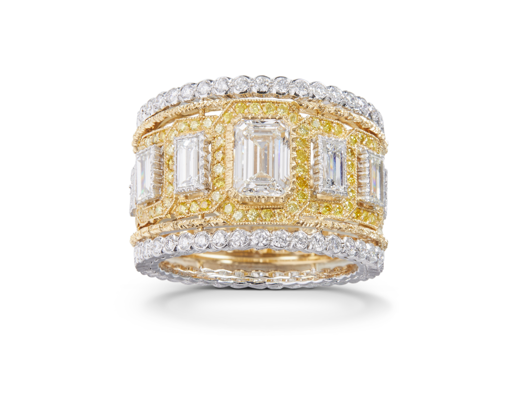 Les bijoux de la collection Mosaico sont en or jaune et or blanc gravés, agrémentés de diamants blancs, de diamants jaunes et de pierres de couleur. Chaque pièce est unique et le prix est disponible sur demande.