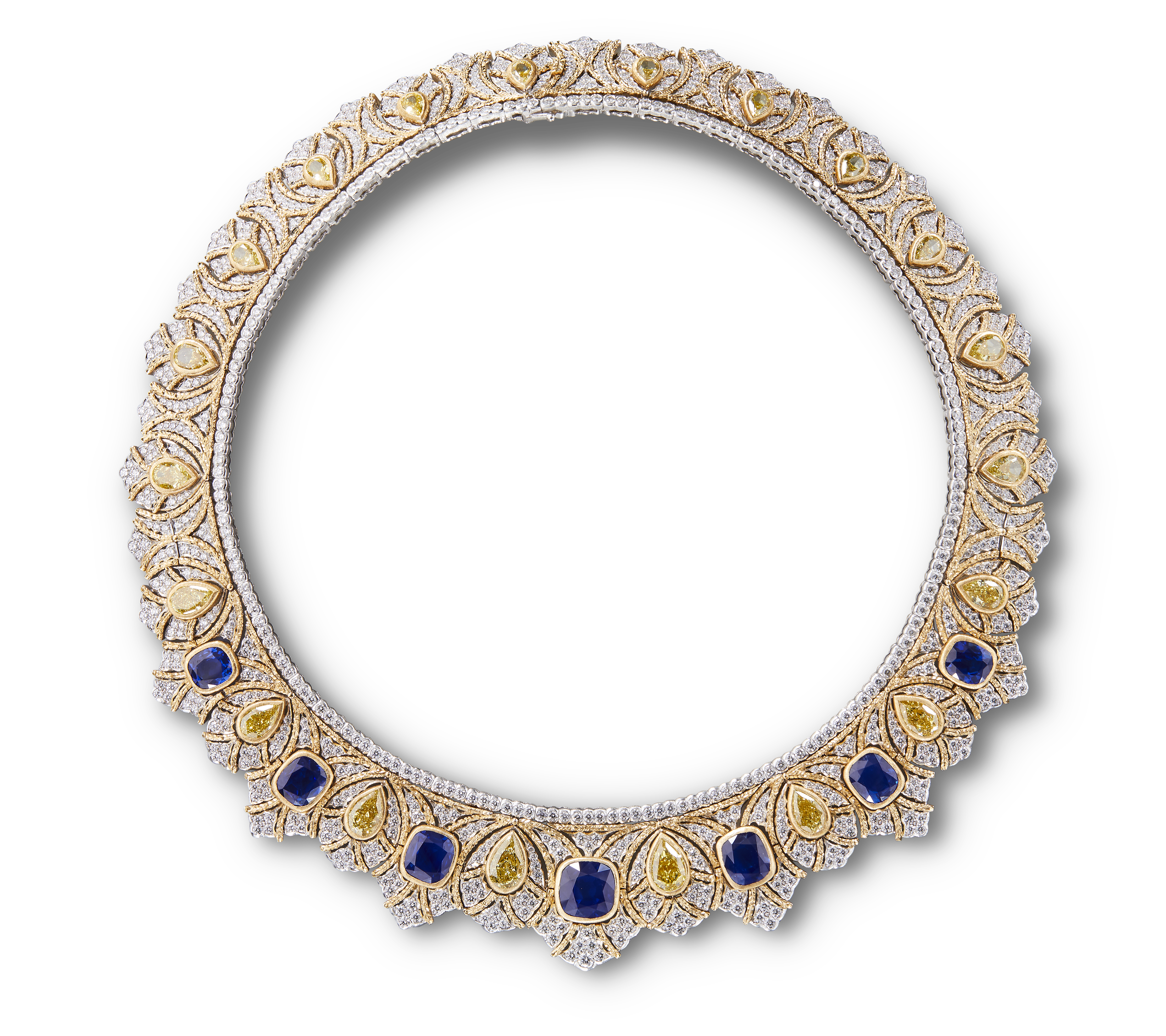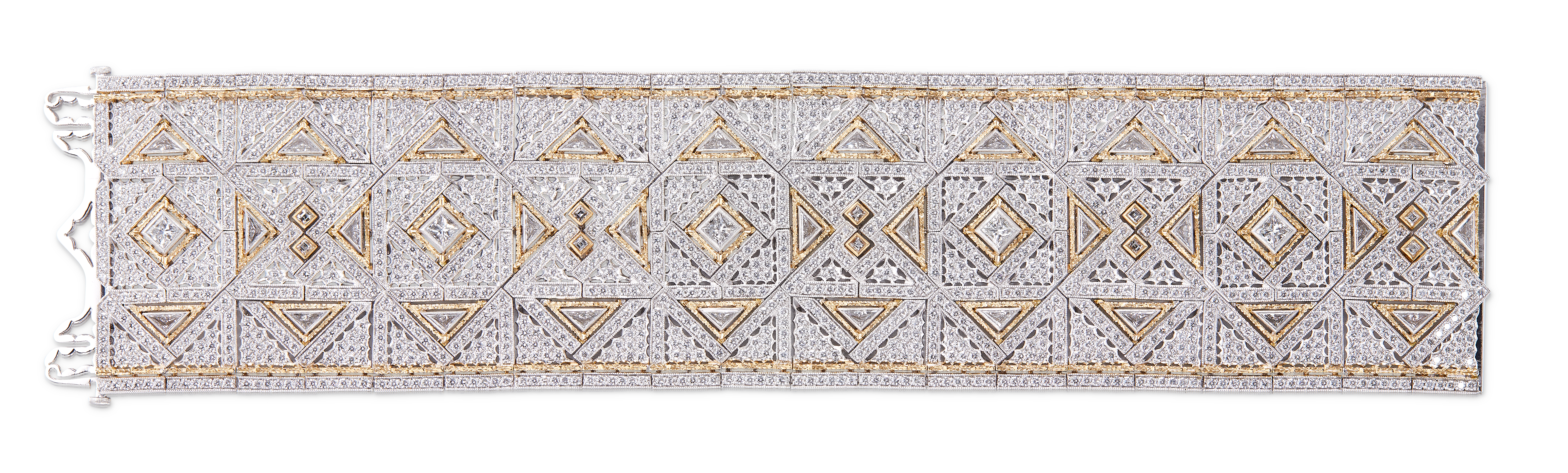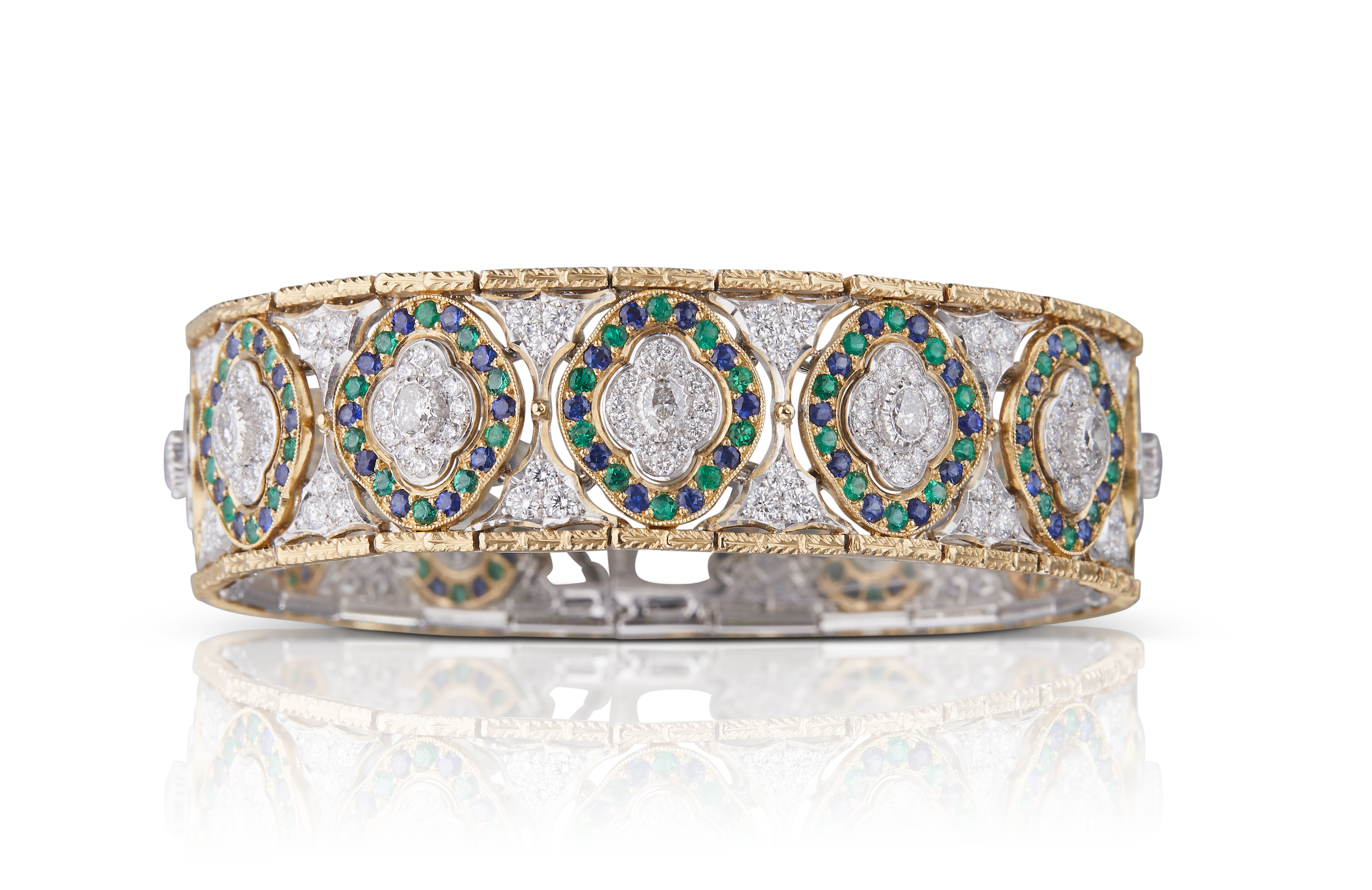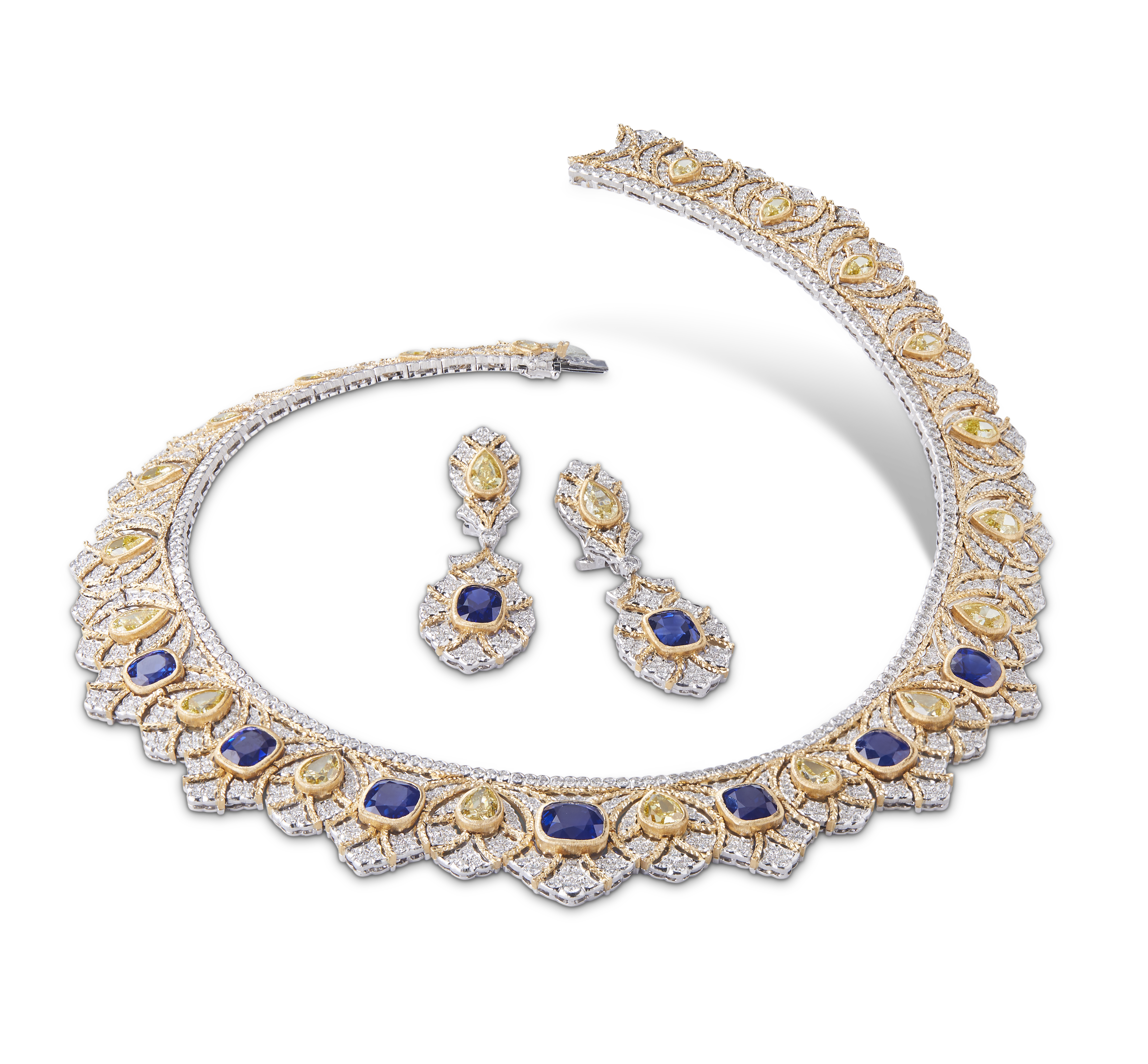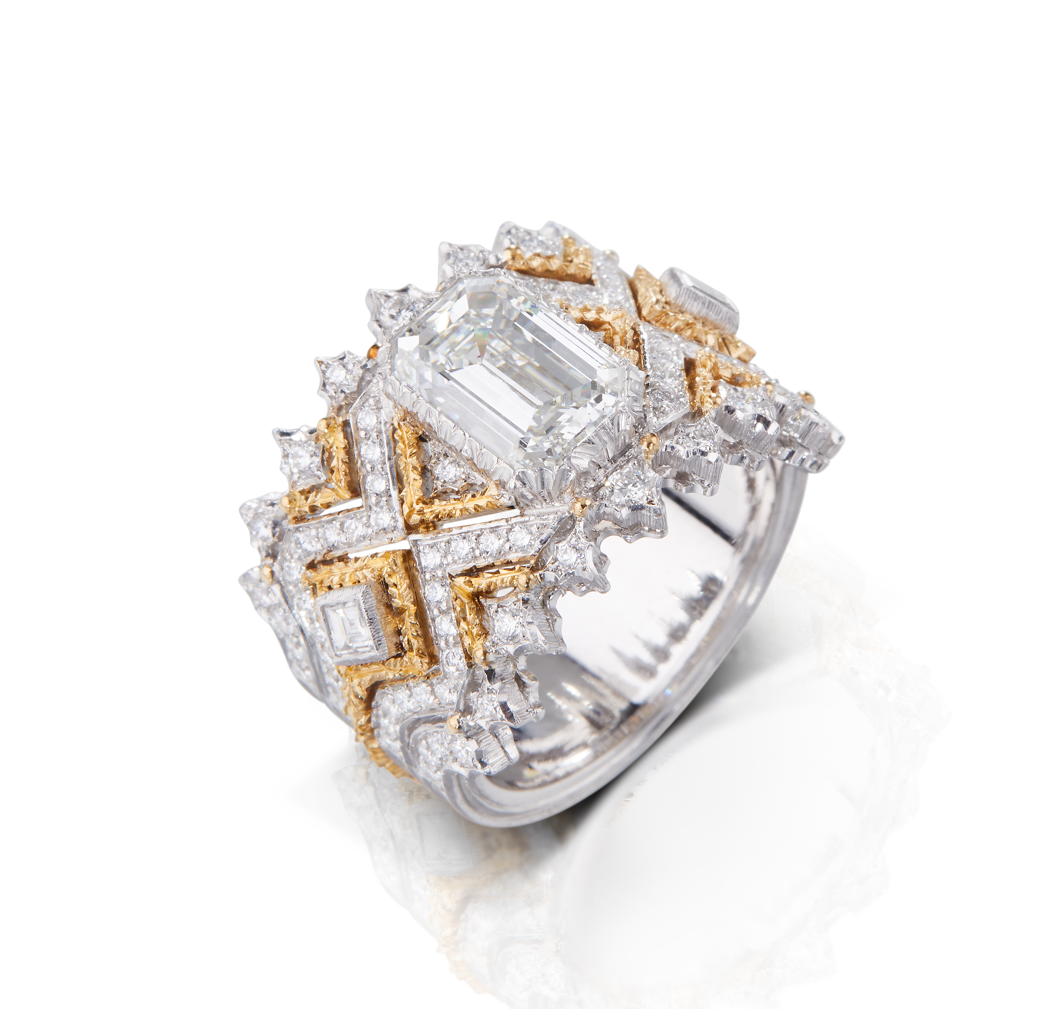 Les bijoux de la collection Mosaico sont en or jaune et or blanc gravés, agrémentés de diamants blancs, de diamants jaunes et de pierres de couleur. Chaque pièce est unique et le prix est disponible sur demande.