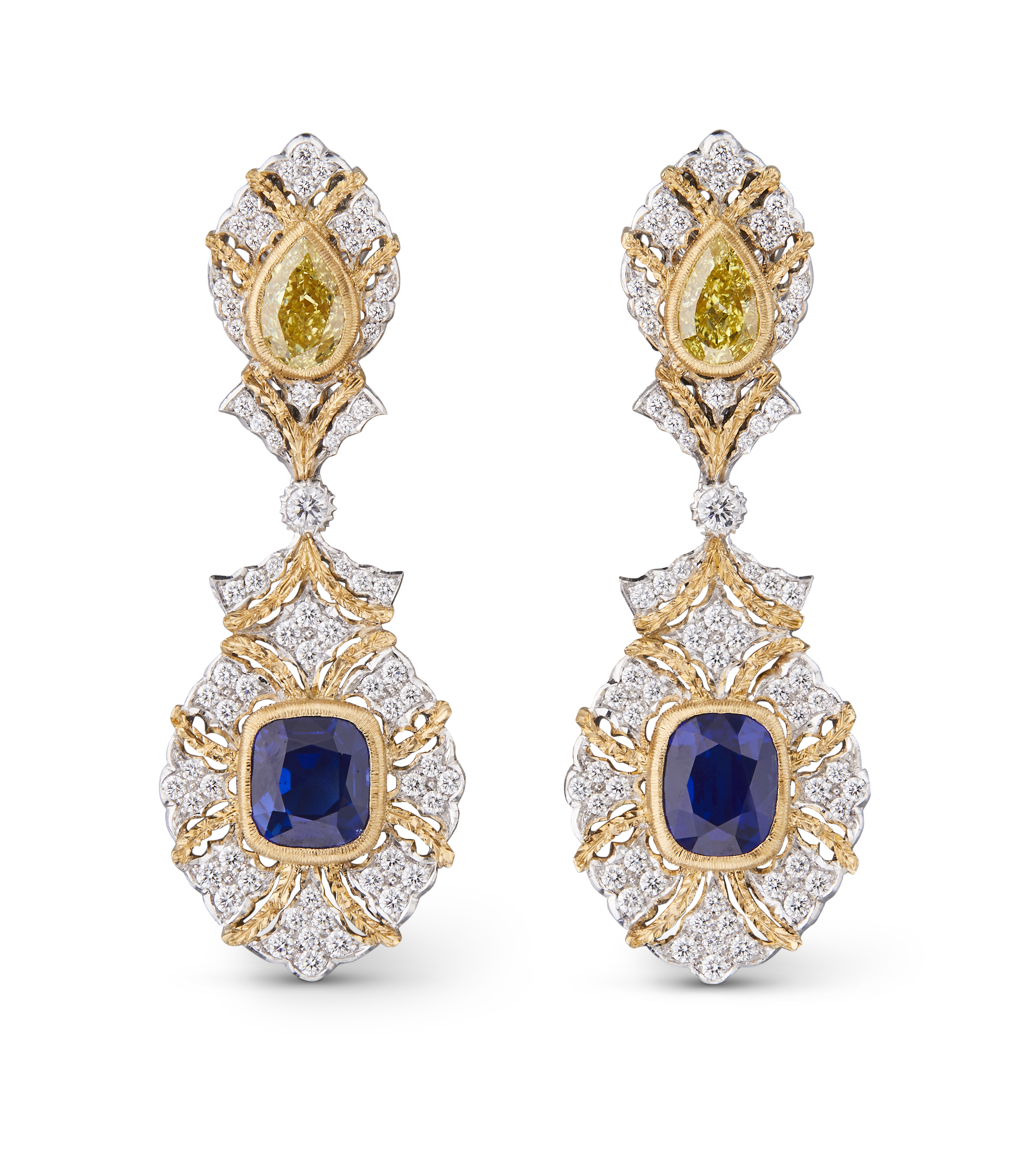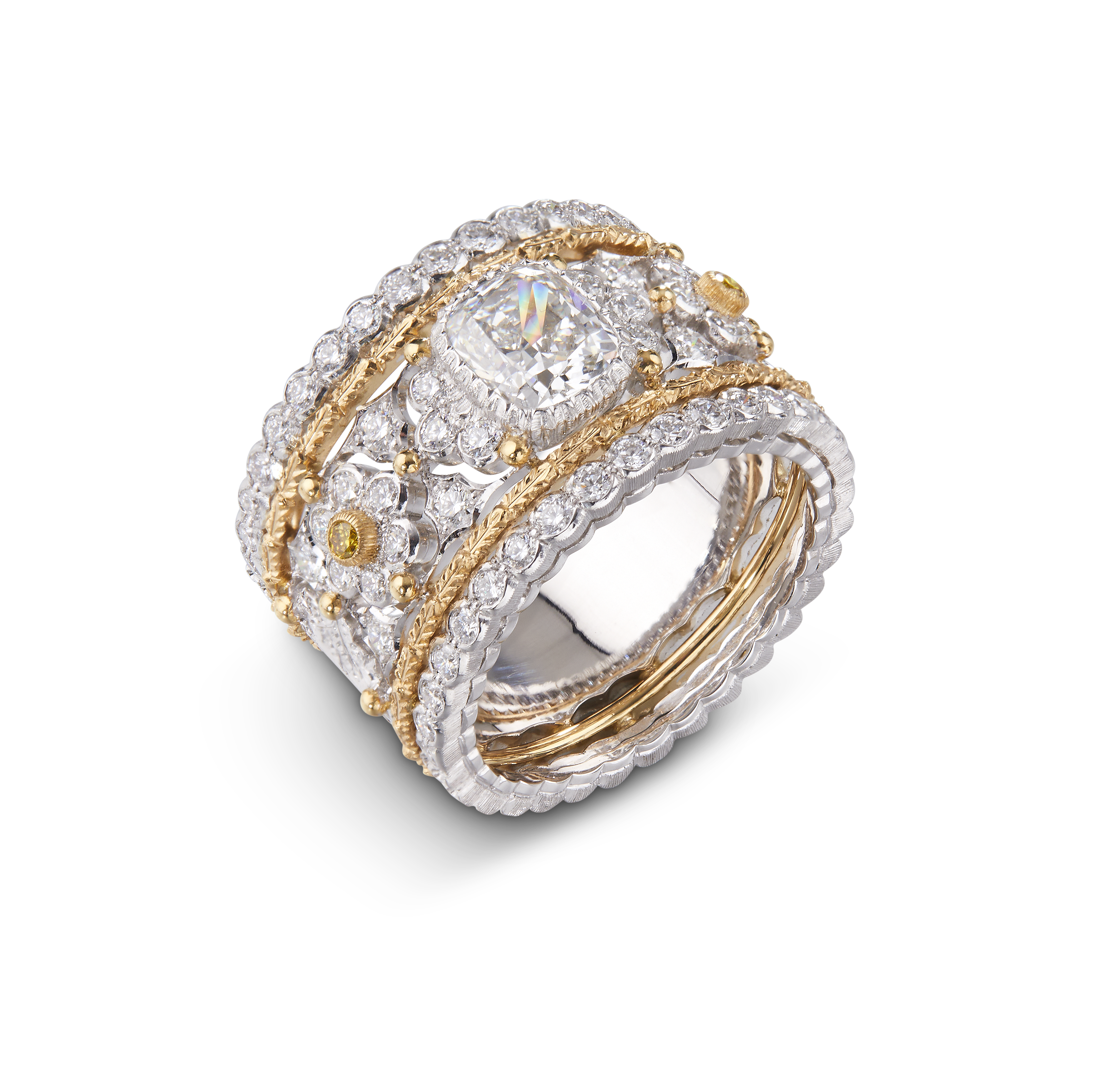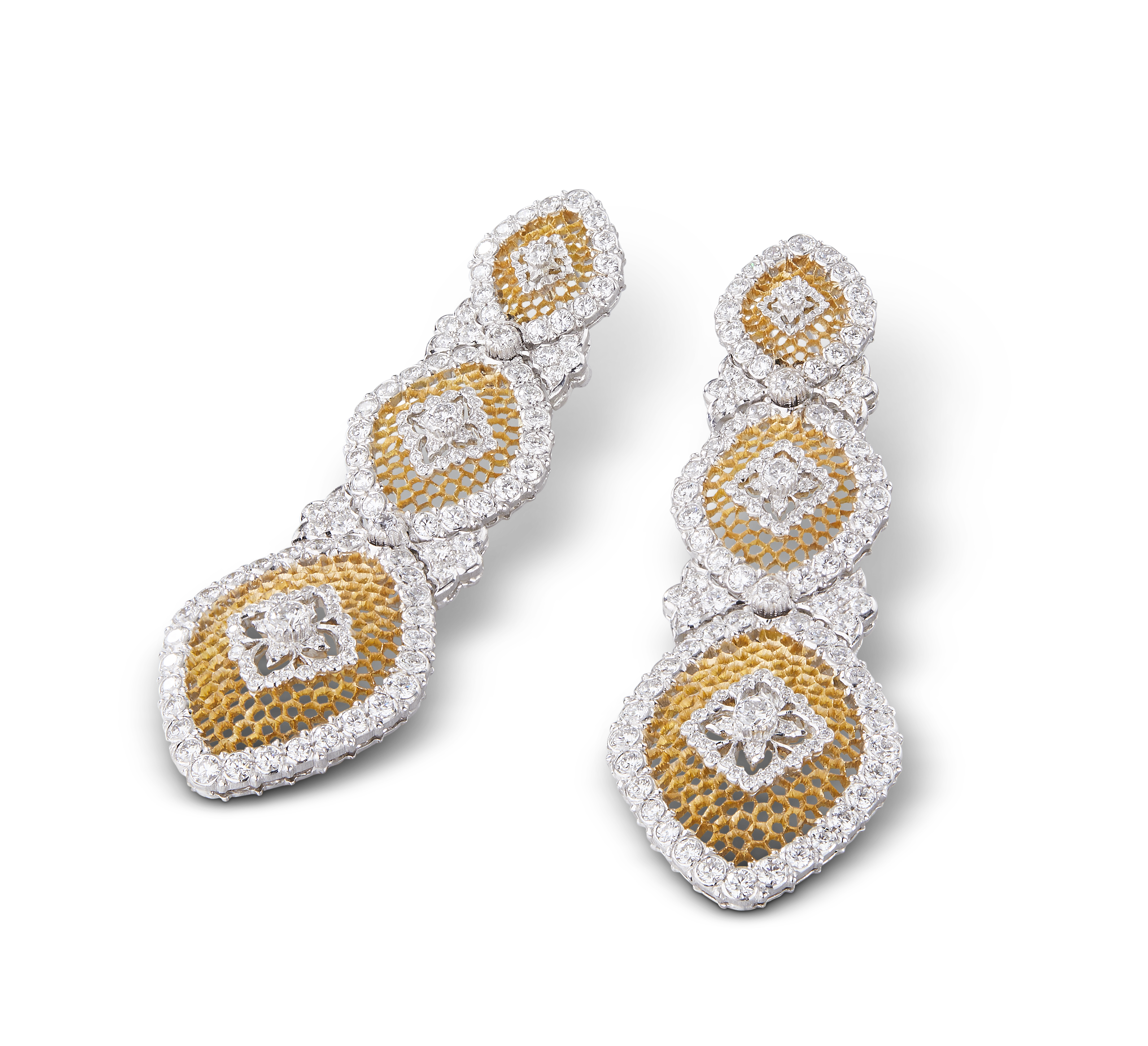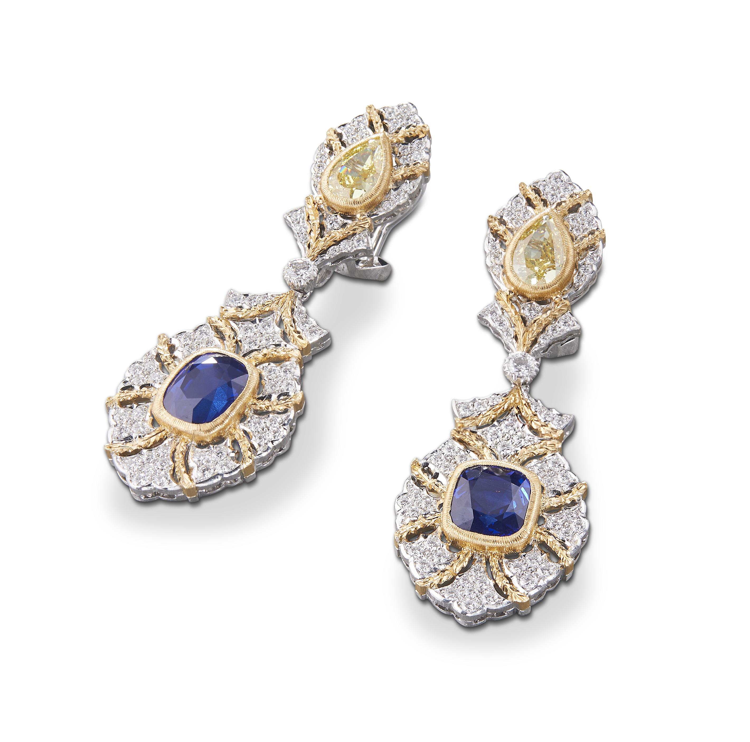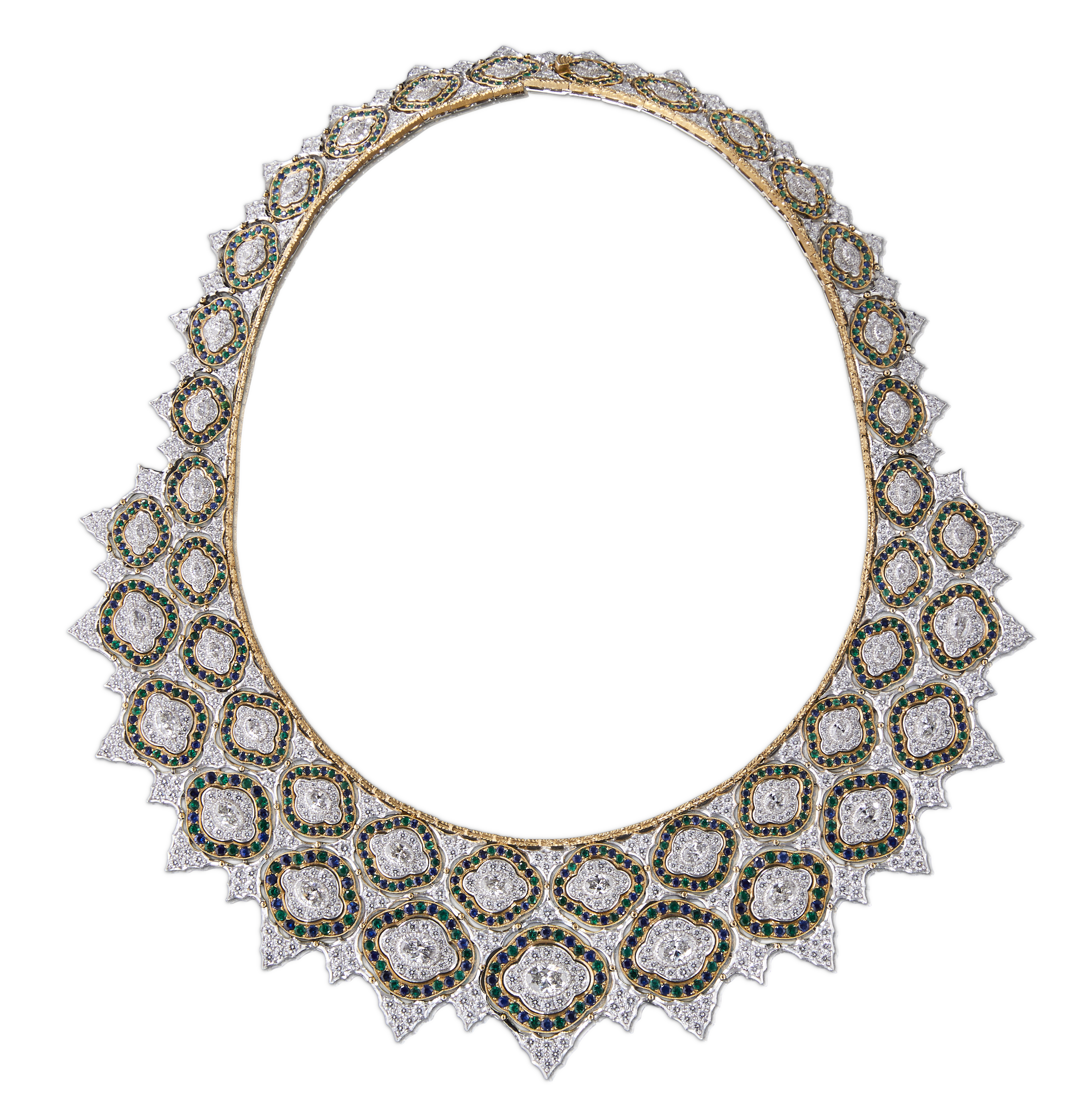 Les bijoux de la collection Mosaico sont en or jaune et or blanc gravés, agrémentés de diamants blancs, de diamants jaunes et de pierres de couleur. Chaque pièce est unique et le prix est disponible sur demande.