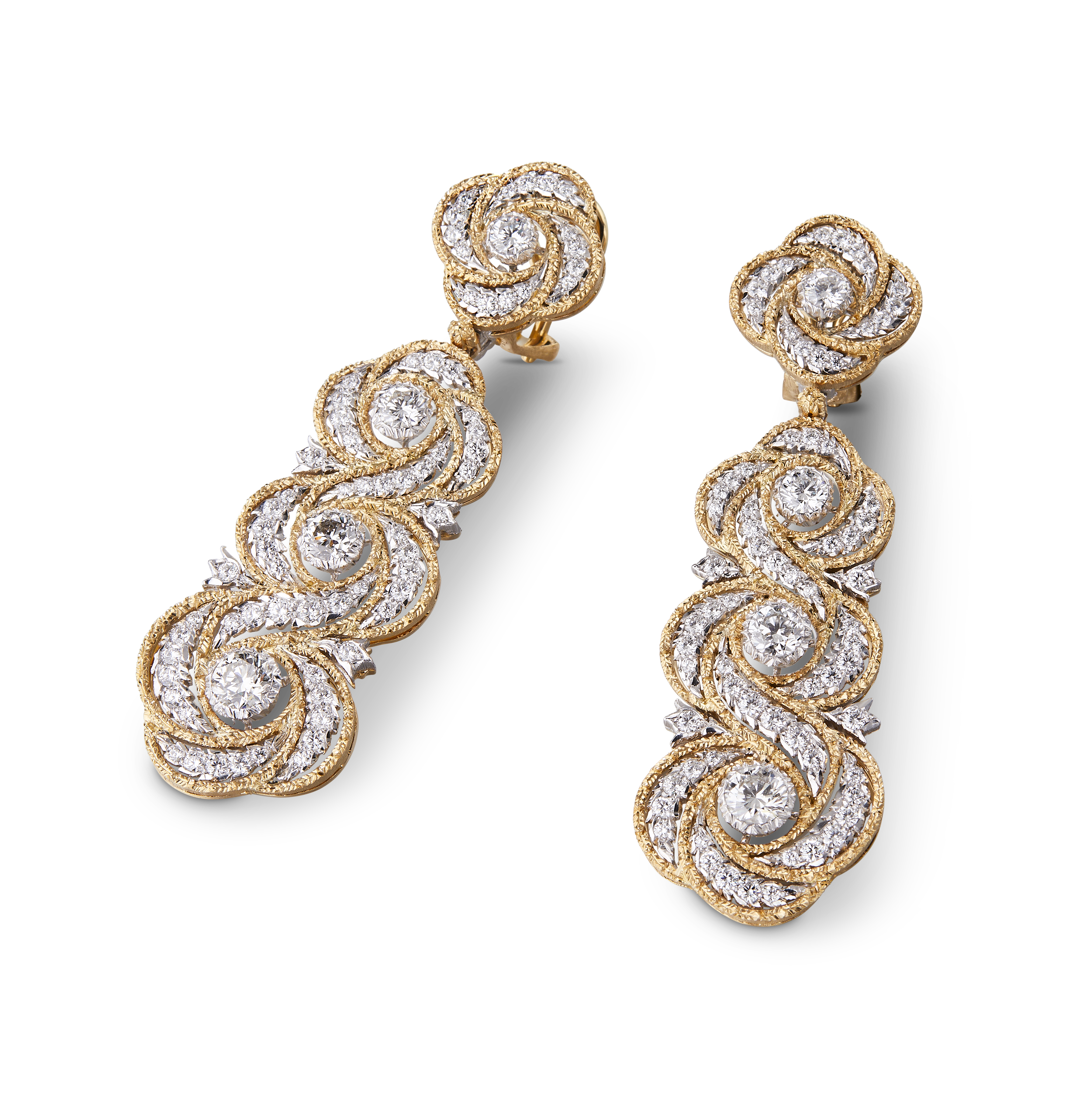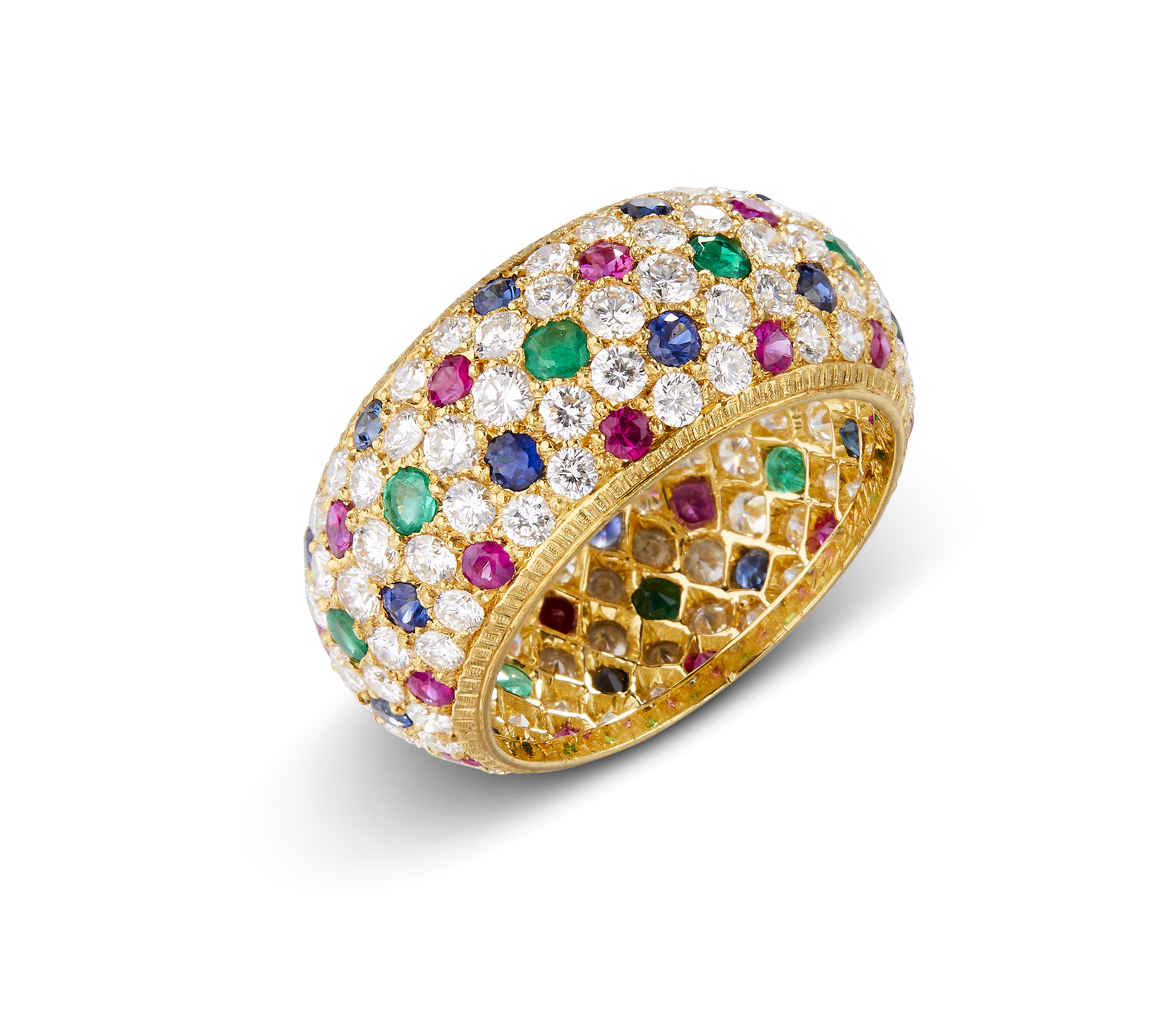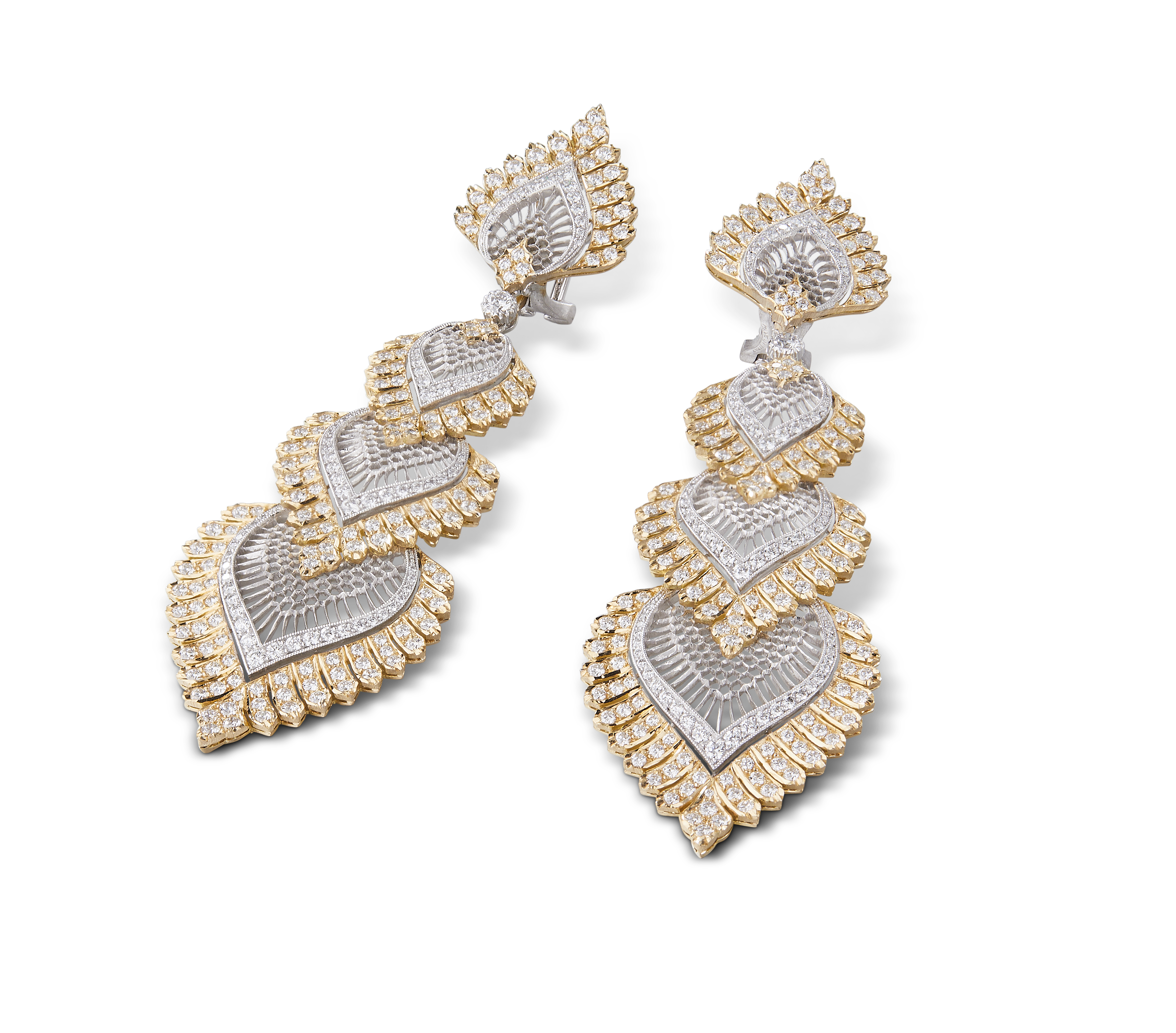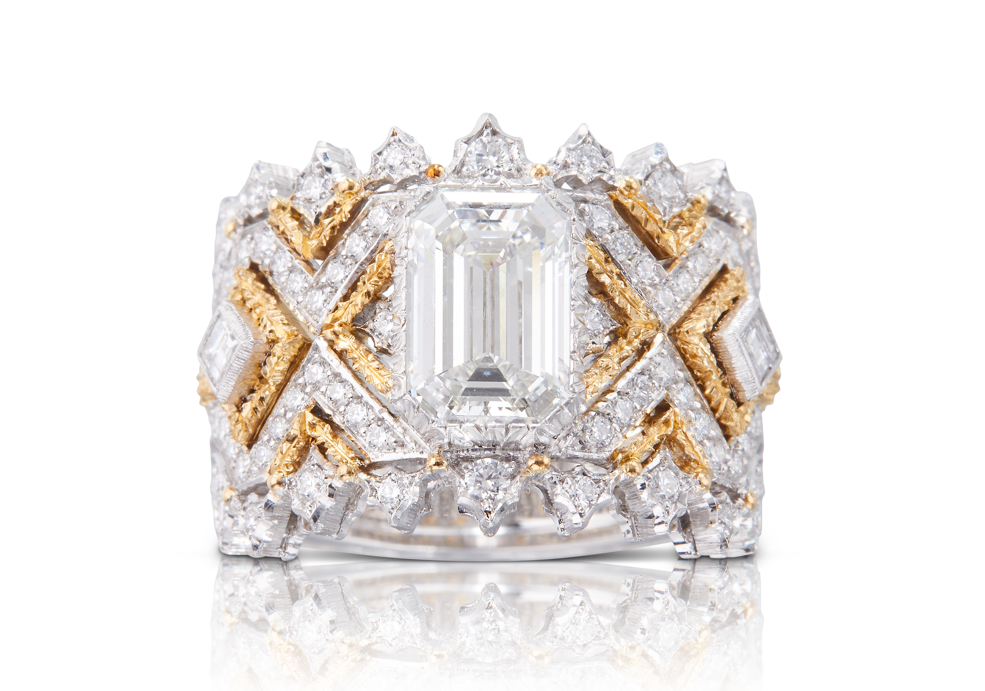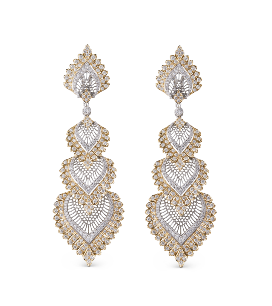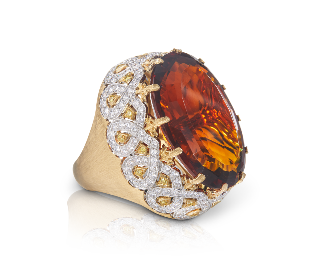 Les bijoux de la collection Mosaico sont en or jaune et or blanc gravés, agrémentés de diamants blancs, de diamants jaunes et de pierres de couleur. Chaque pièce est unique et le prix est disponible sur demande.