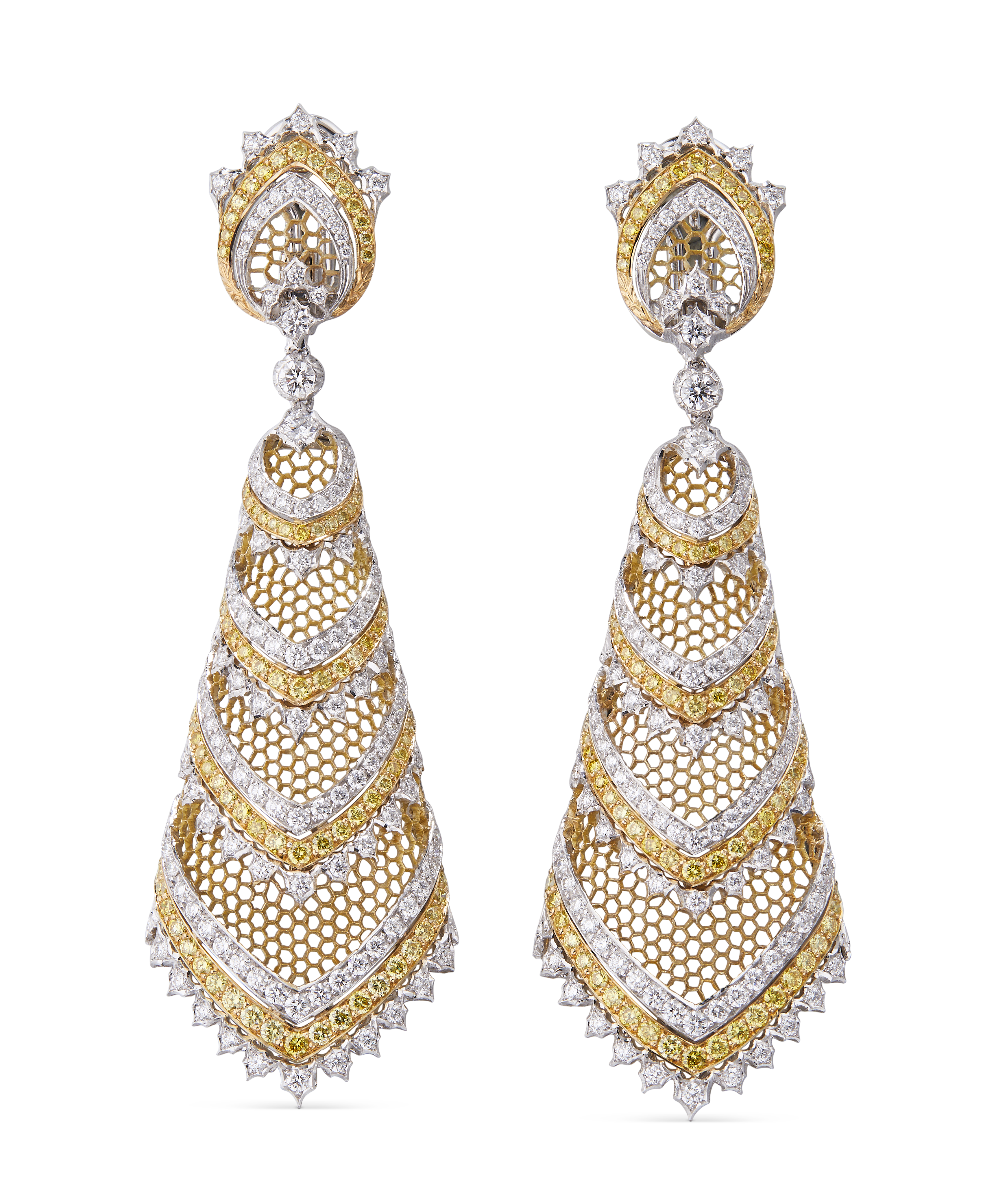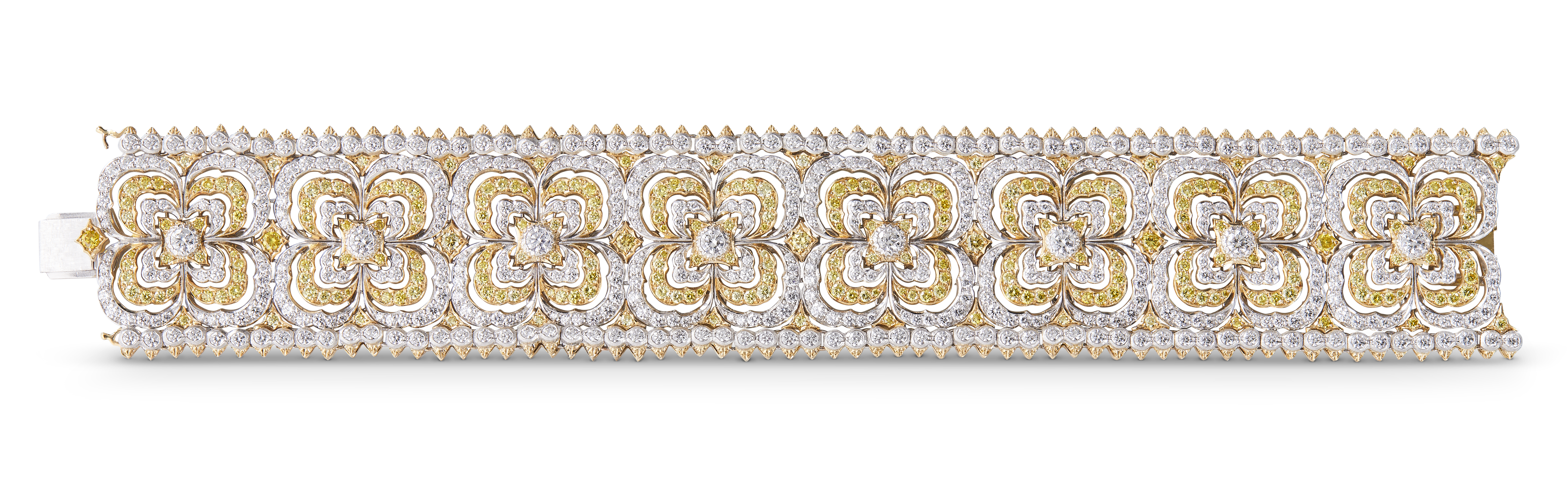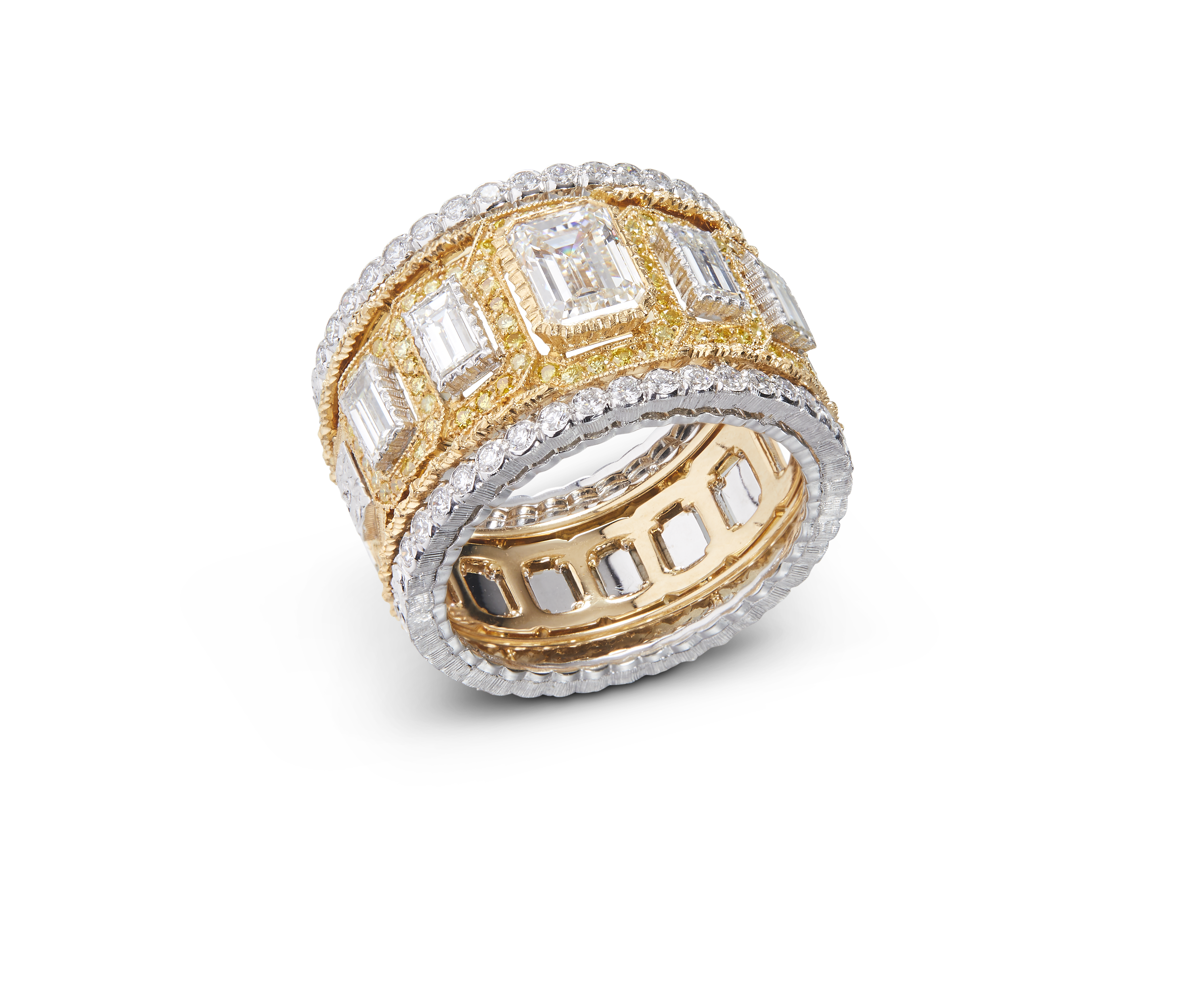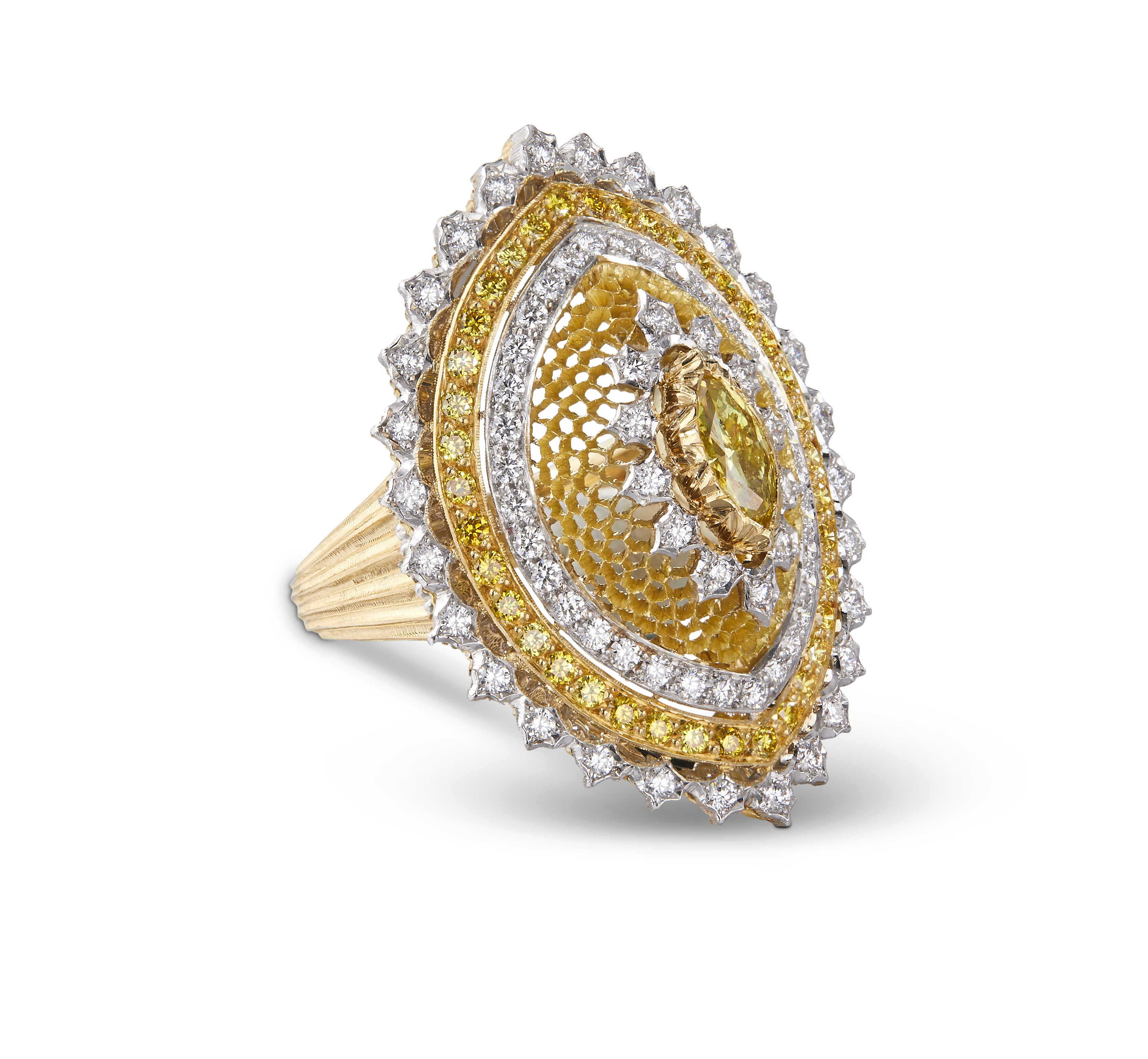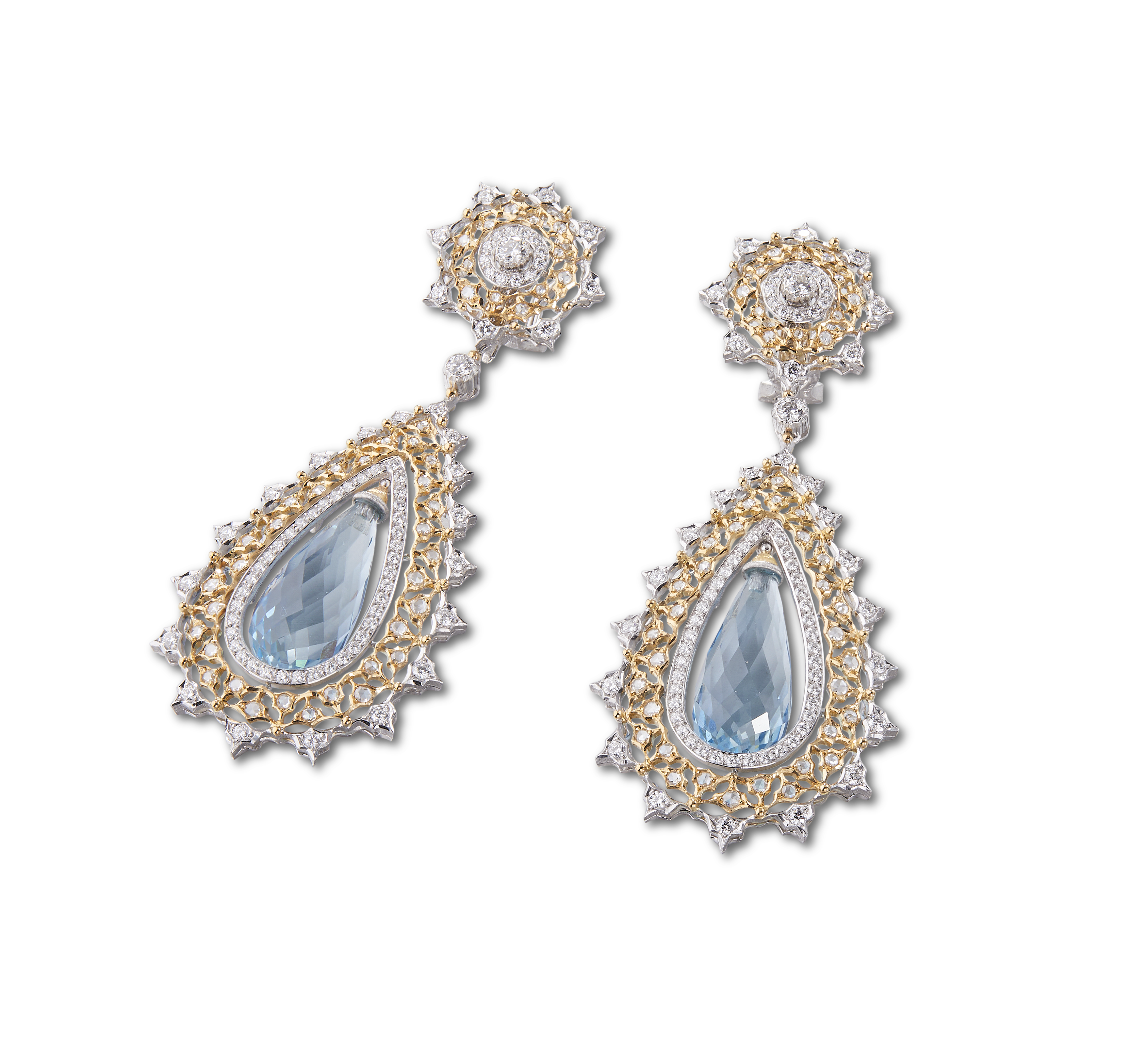Les bijoux de la collection Mosaico sont en or jaune et or blanc gravés, agrémentés de diamants blancs, de diamants jaunes et de pierres de couleur. Chaque pièce est unique et le prix est disponible sur demande.