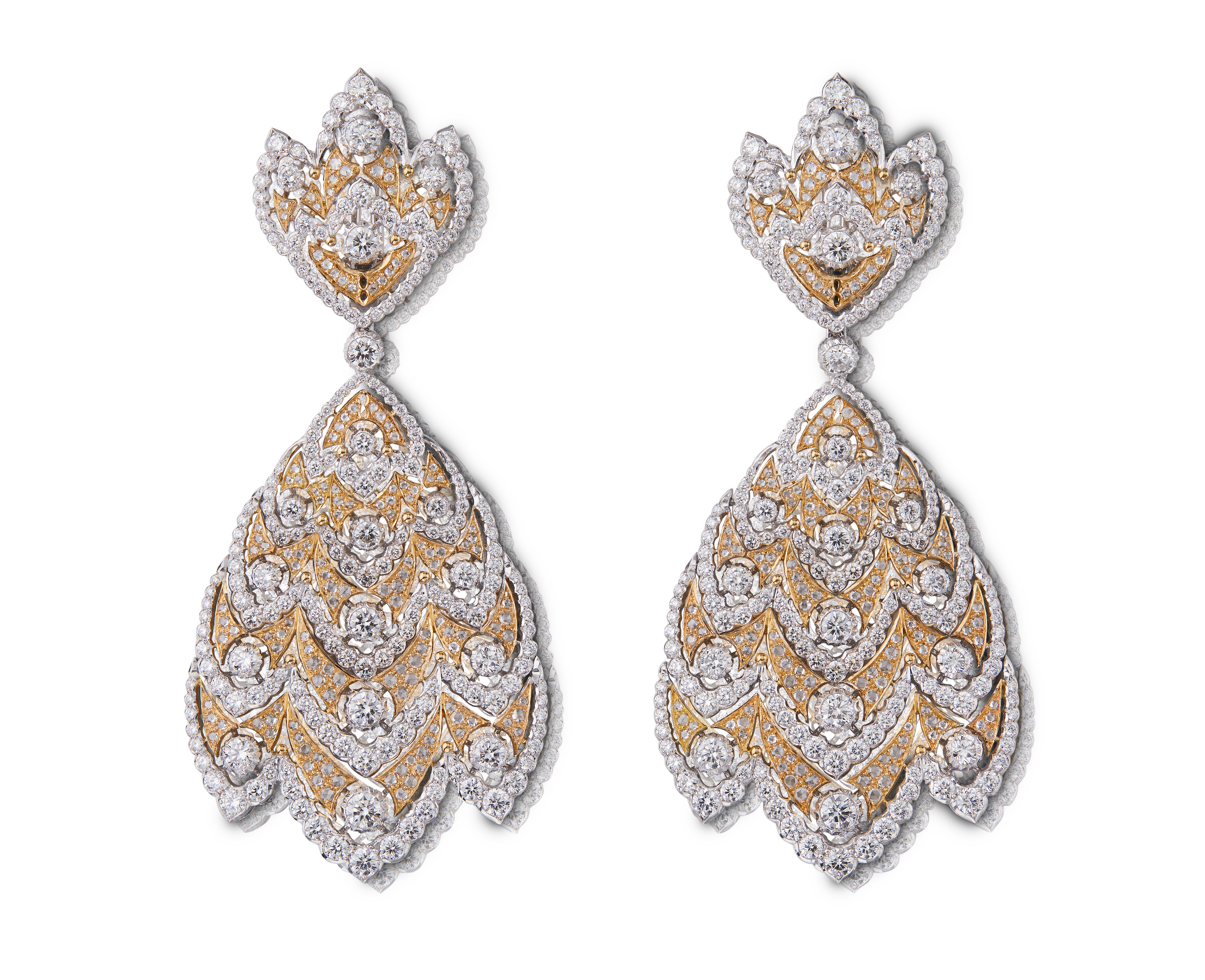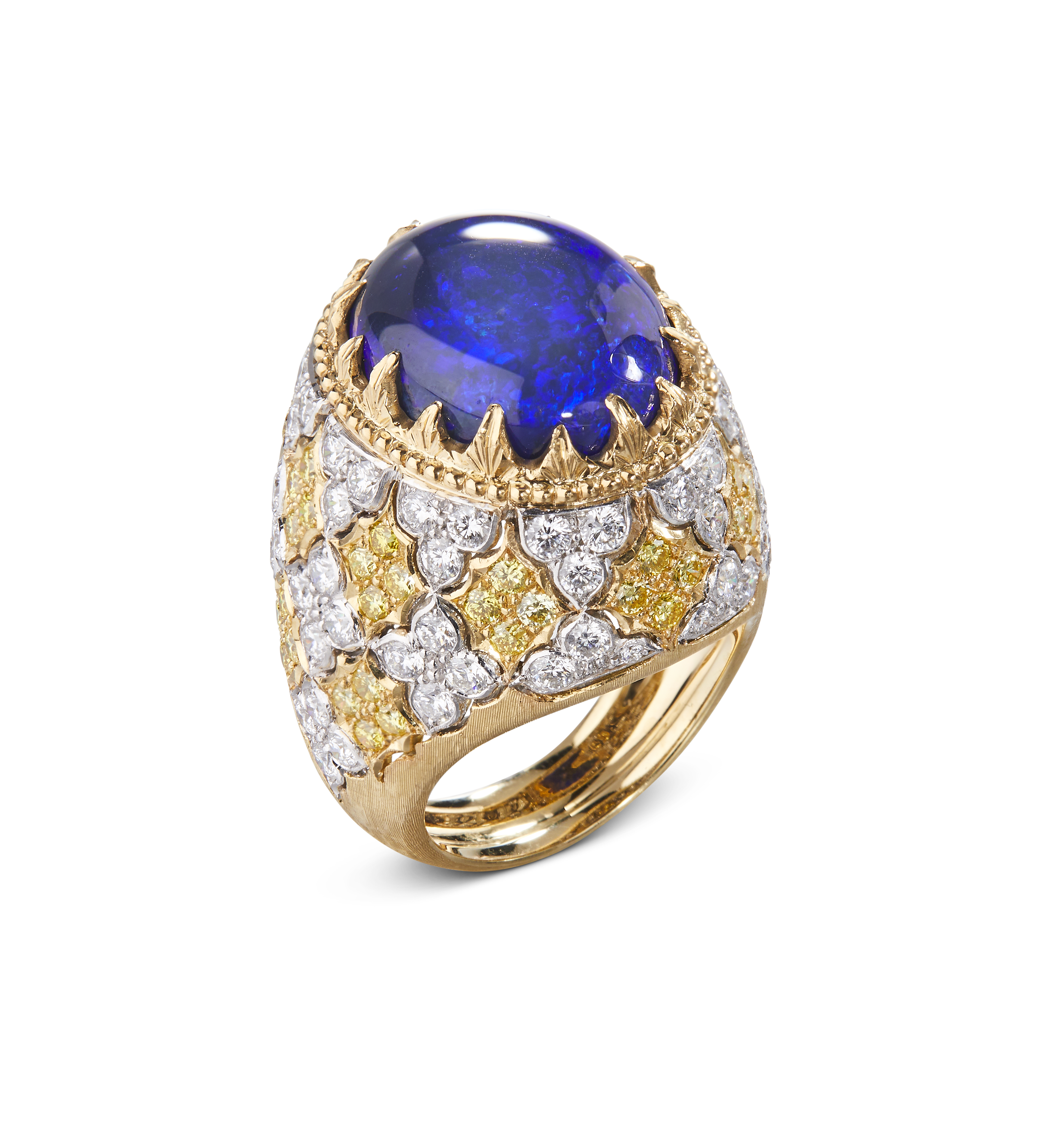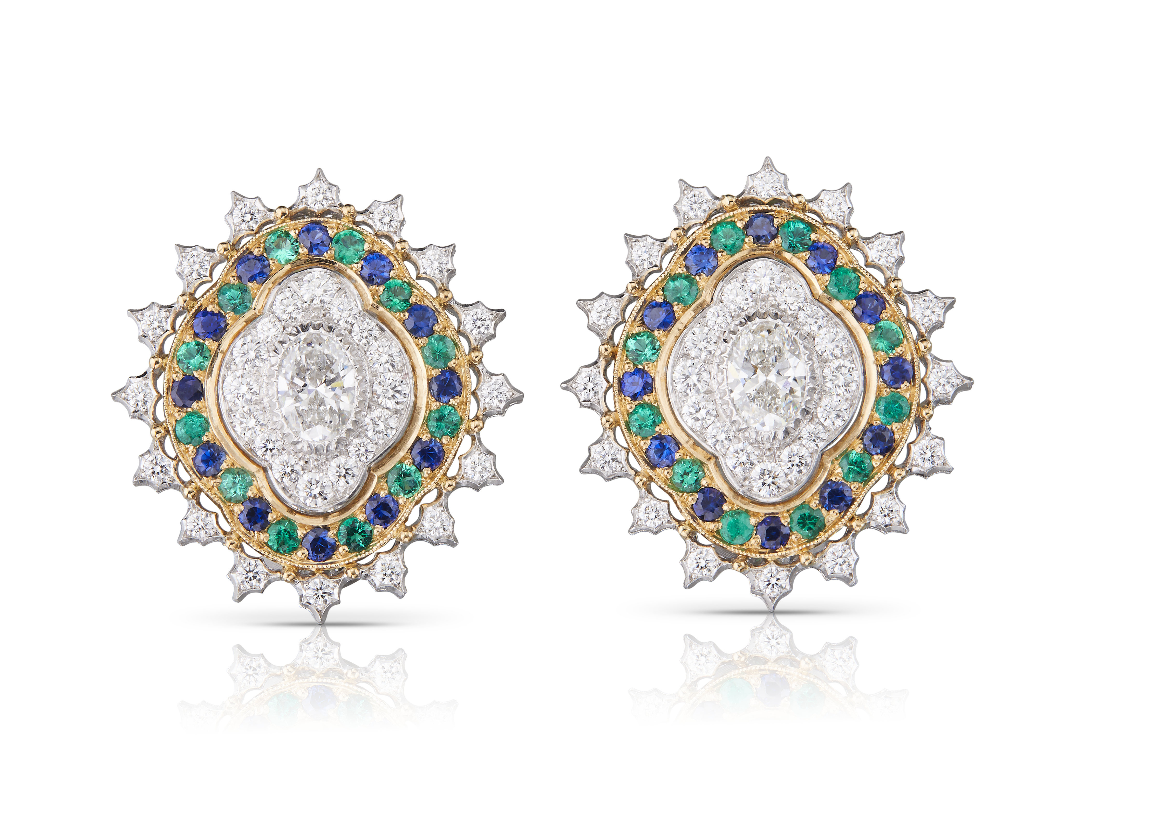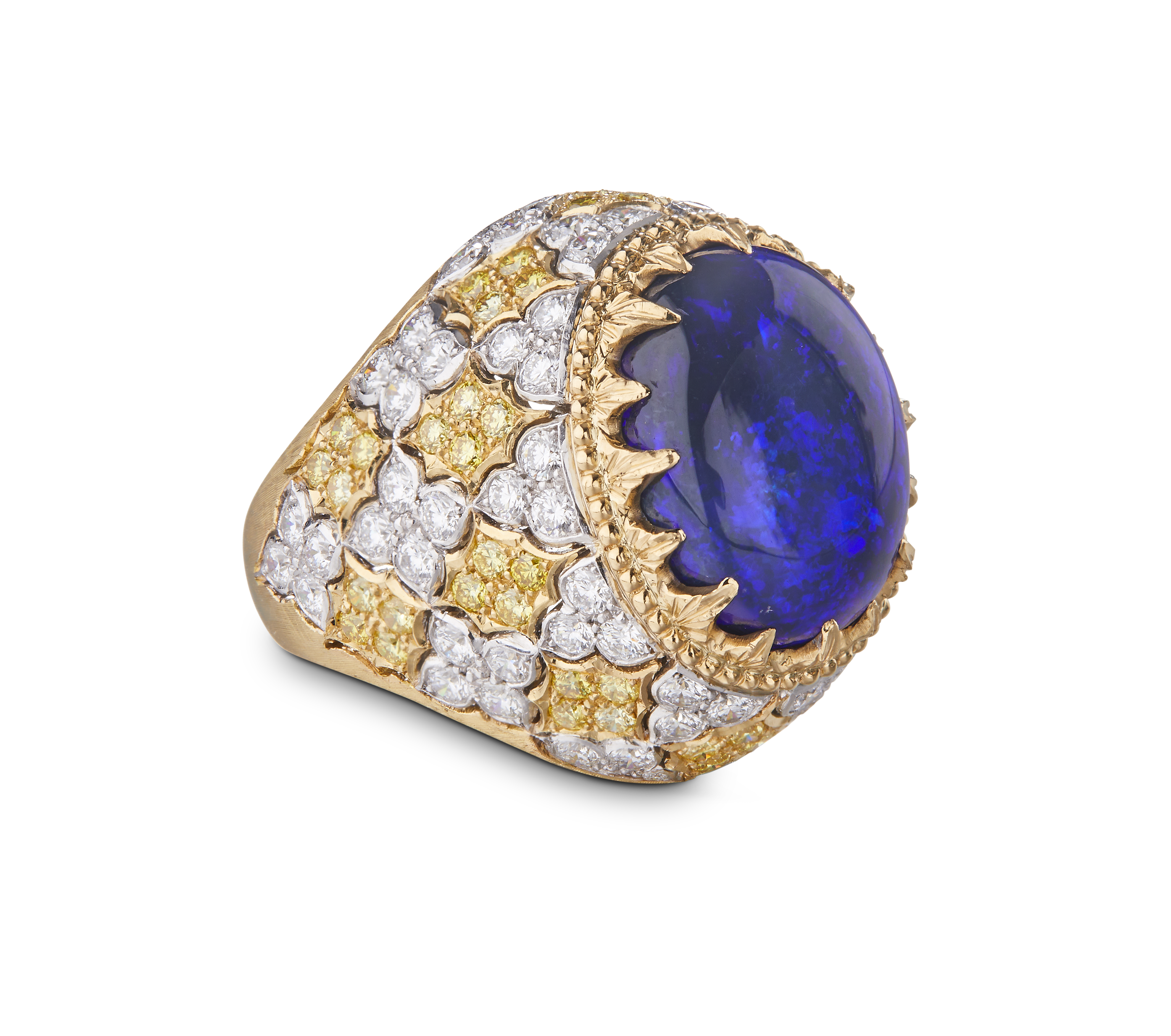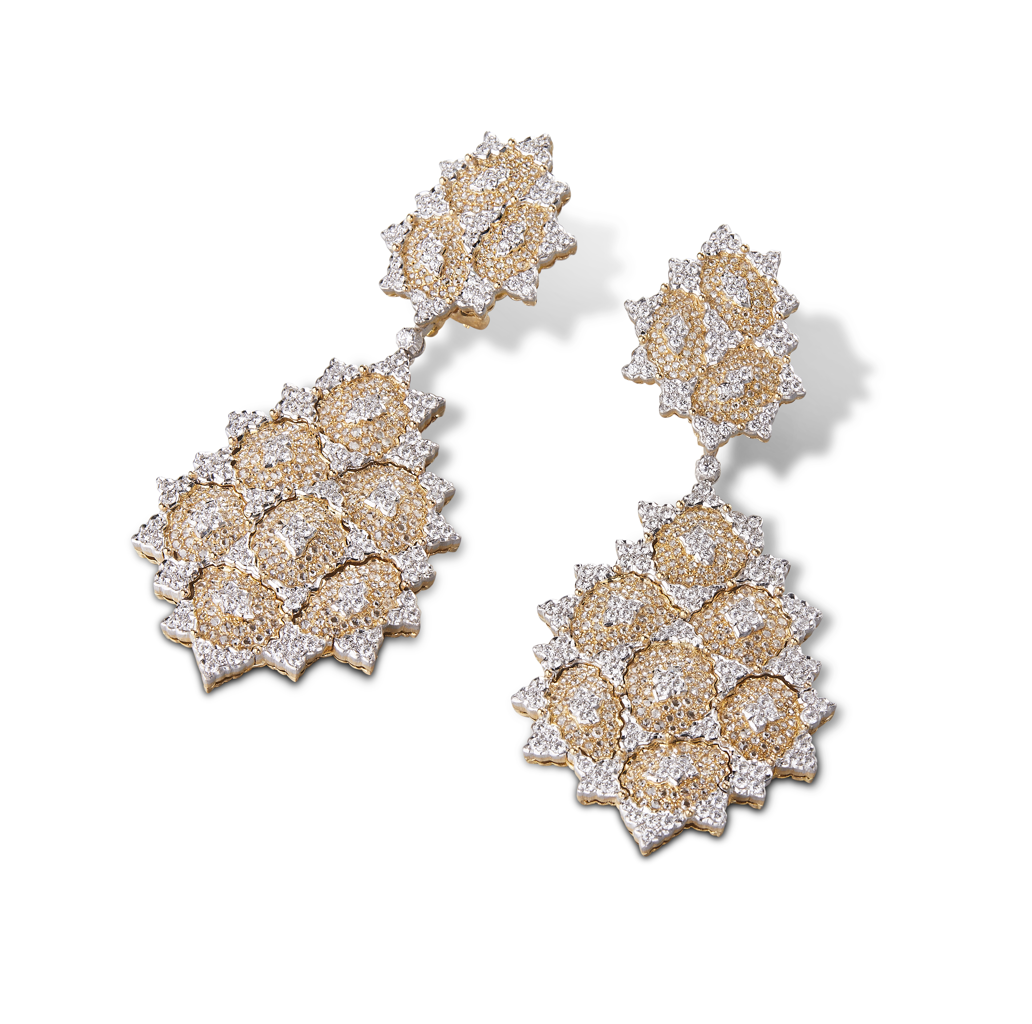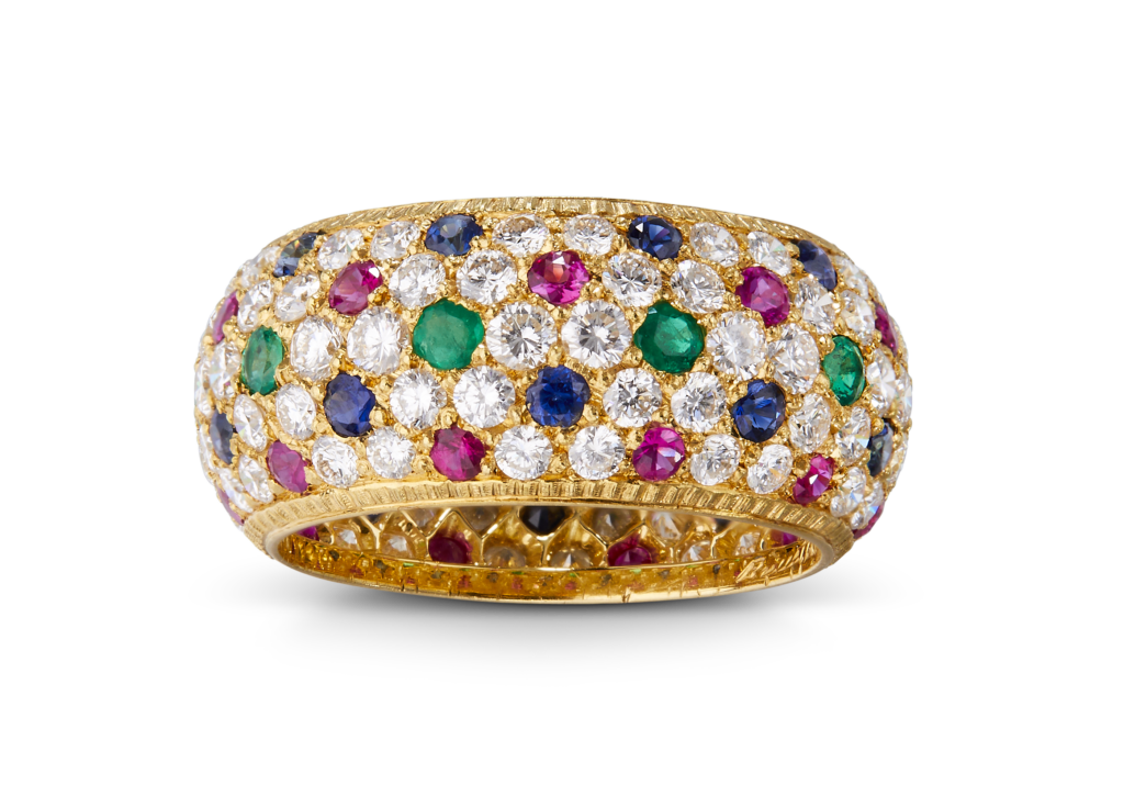 Les bijoux de la collection Mosaico sont en or jaune et or blanc gravés, agrémentés de diamants blancs, de diamants jaunes et de pierres de couleur. Chaque pièce est unique et le prix est disponible sur demande.