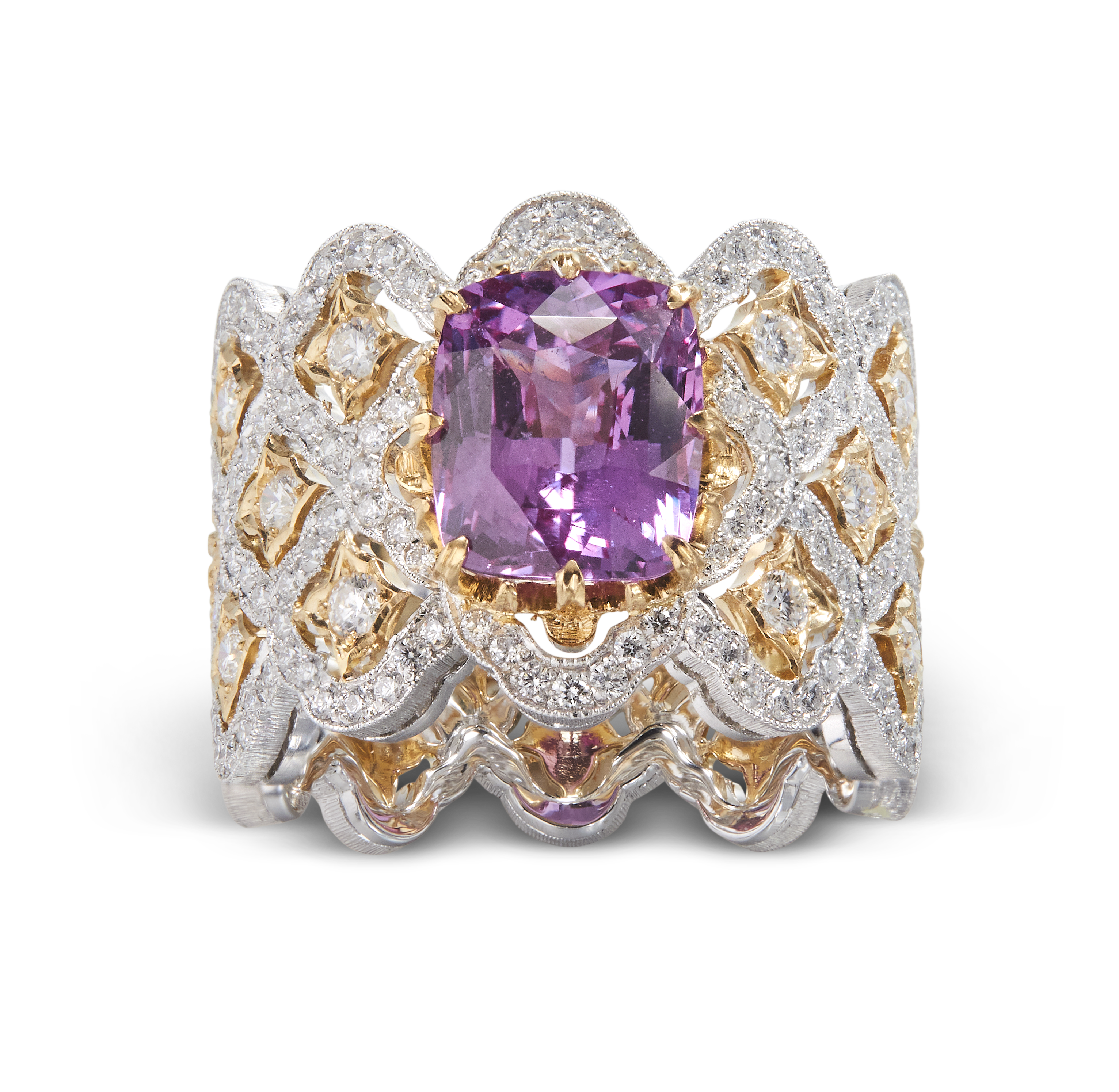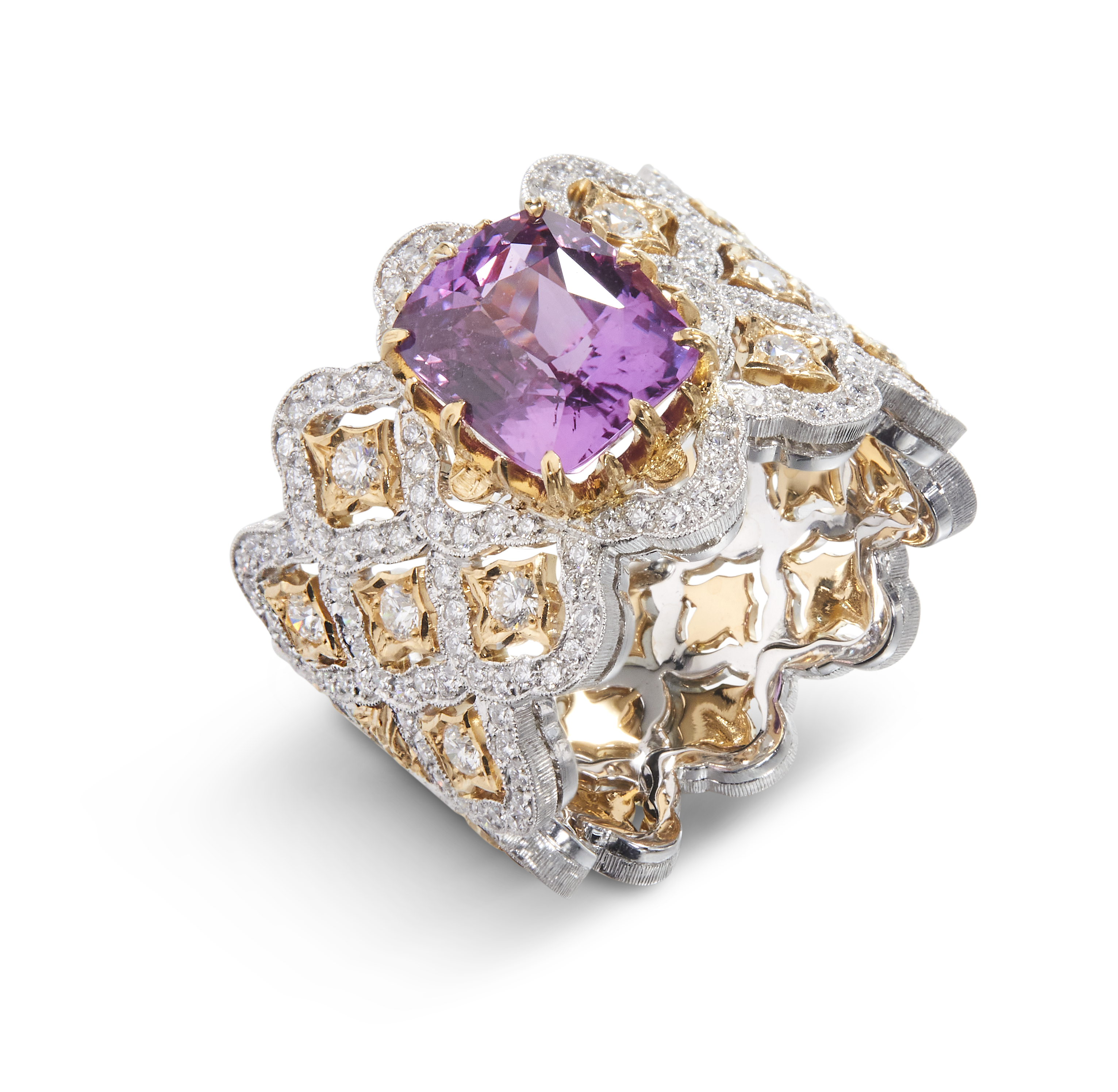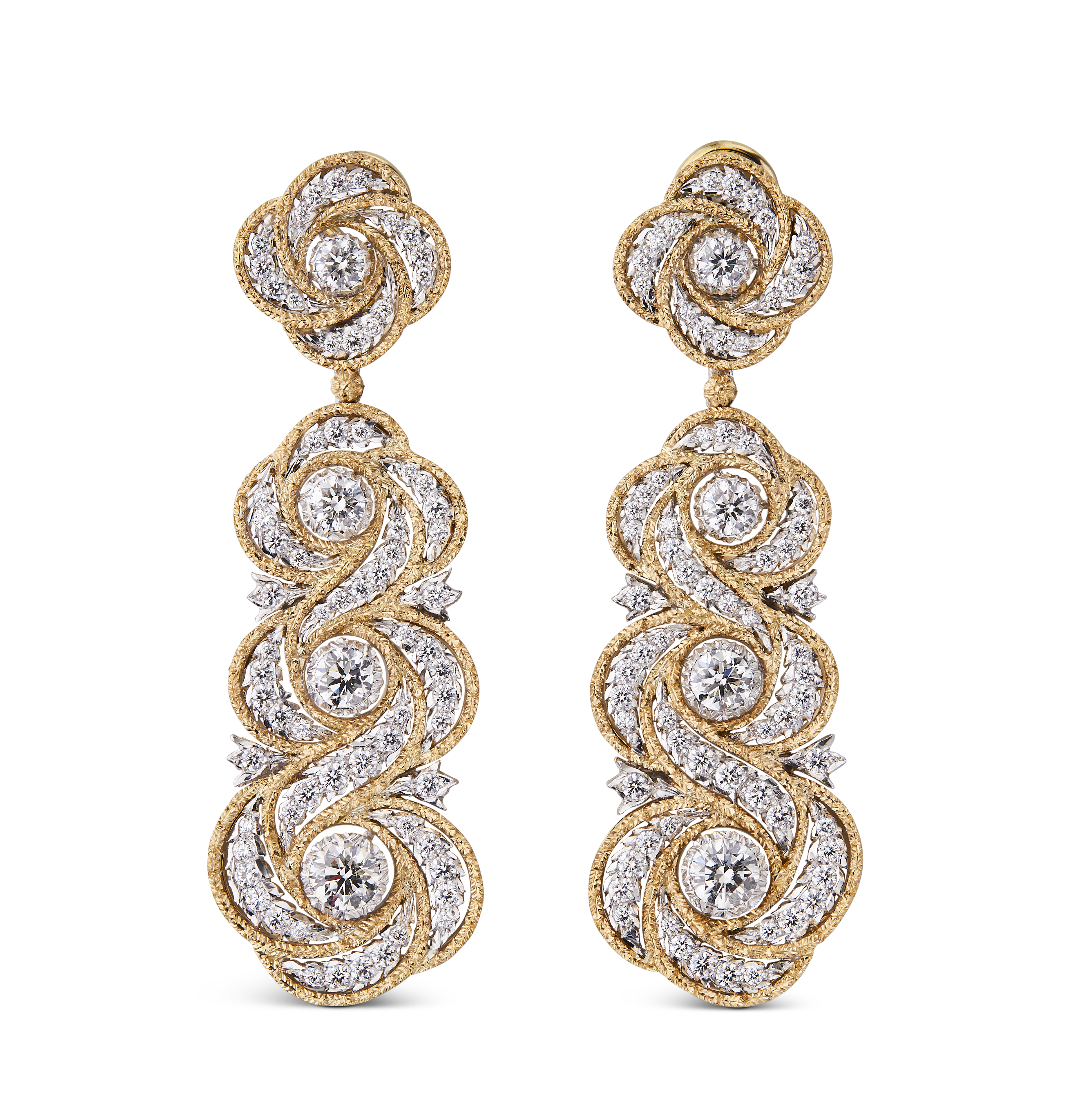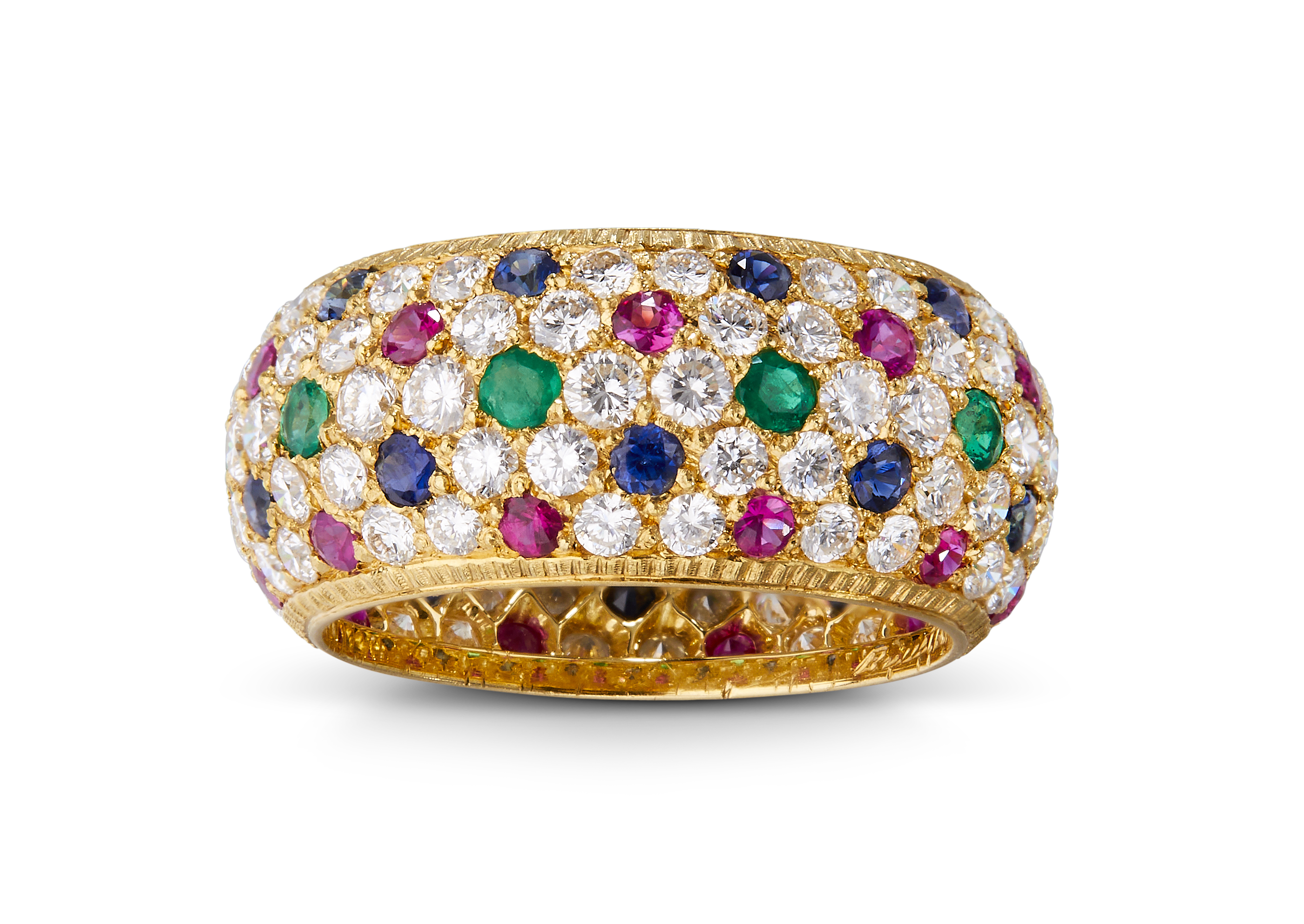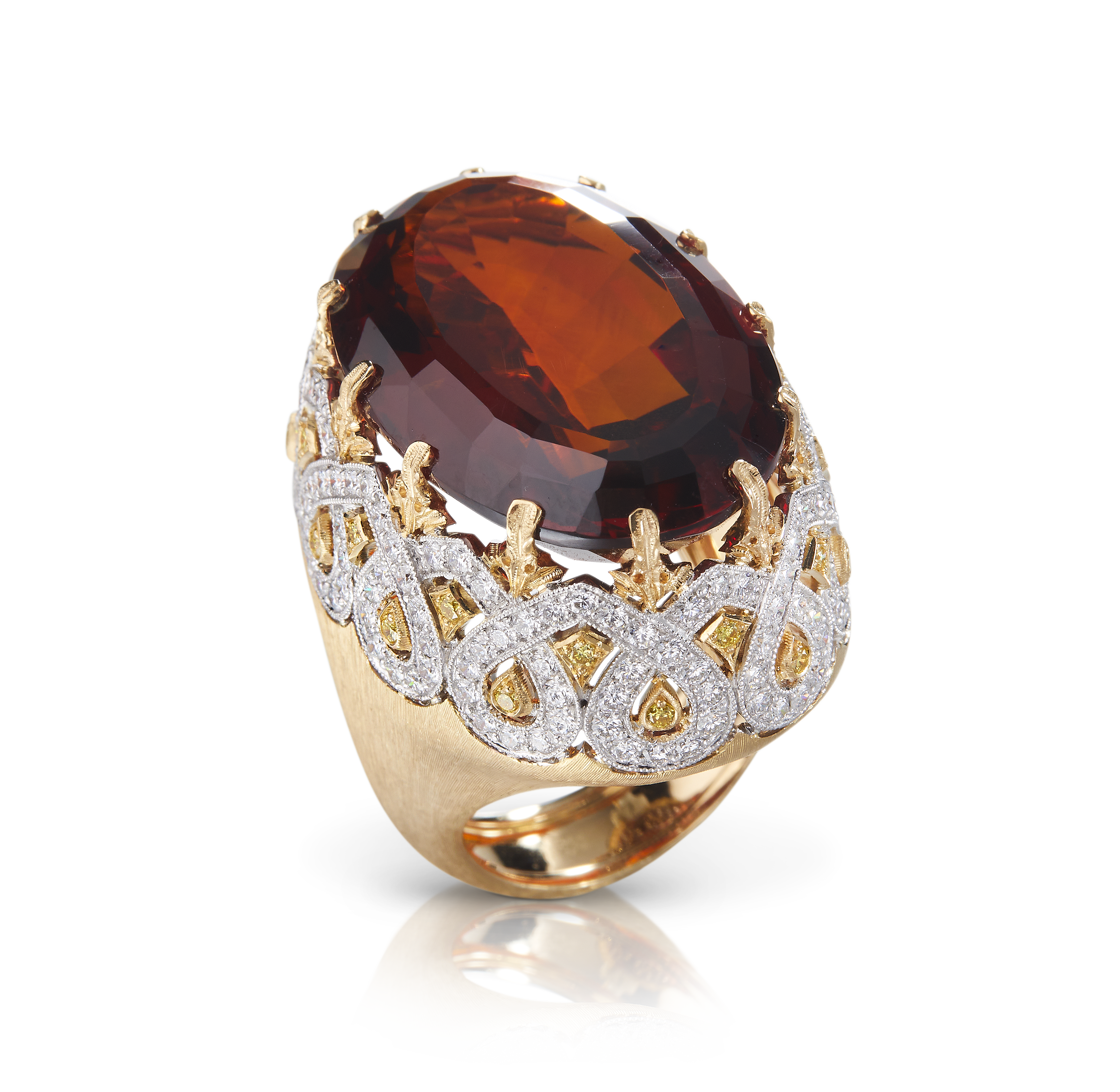 Les bijoux de la collection Mosaico sont en or jaune et or blanc gravés, agrémentés de diamants blancs, de diamants jaunes et de pierres de couleur. Chaque pièce est unique et le prix est disponible sur demande.