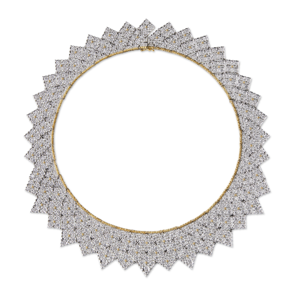 La collection Mosaico inclut des bracelets, colliers plastrons, bagues cocktail et boucles d’oreilles pendantes, tous inspirés des couleurs et des formes des tesselles en pâte de verre des mosaïques byzantines. L’éclat des diamants et des pierres précieuses évoque la lumière captée et reflétée par ces mosaïques.