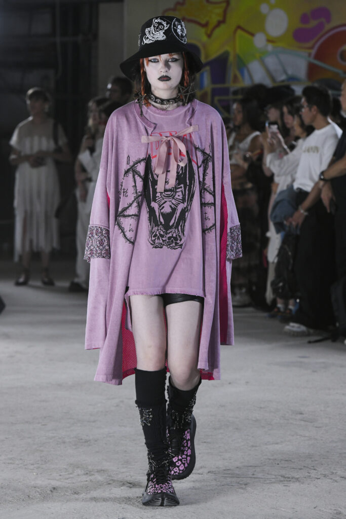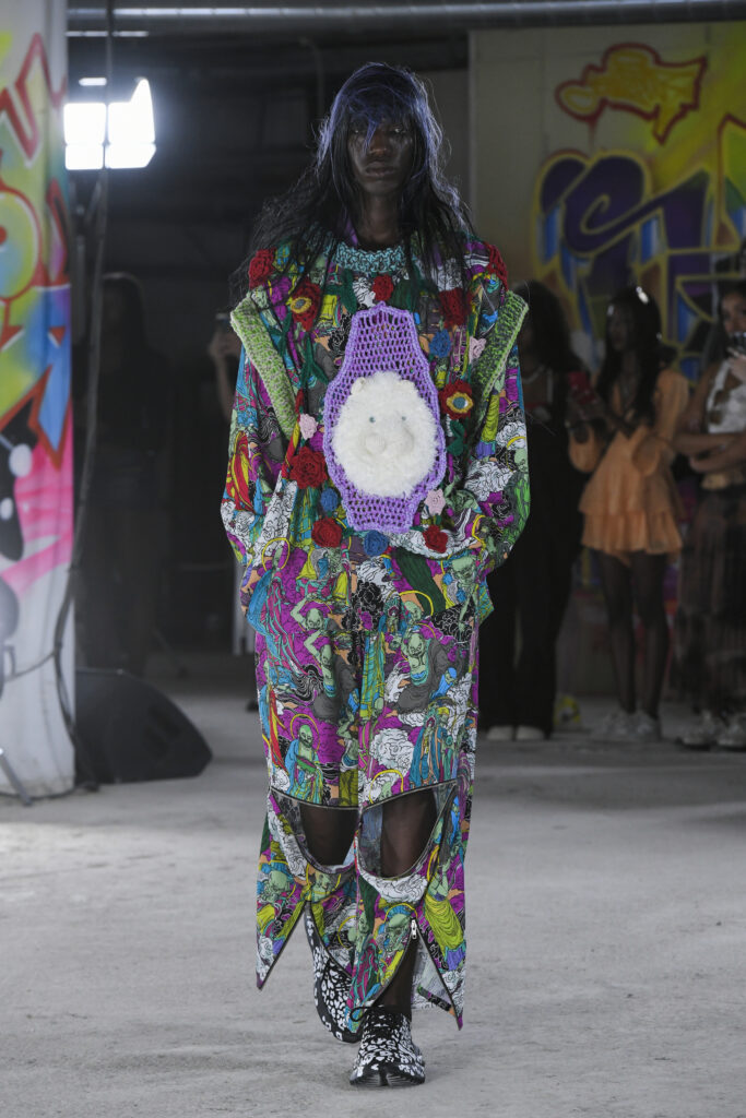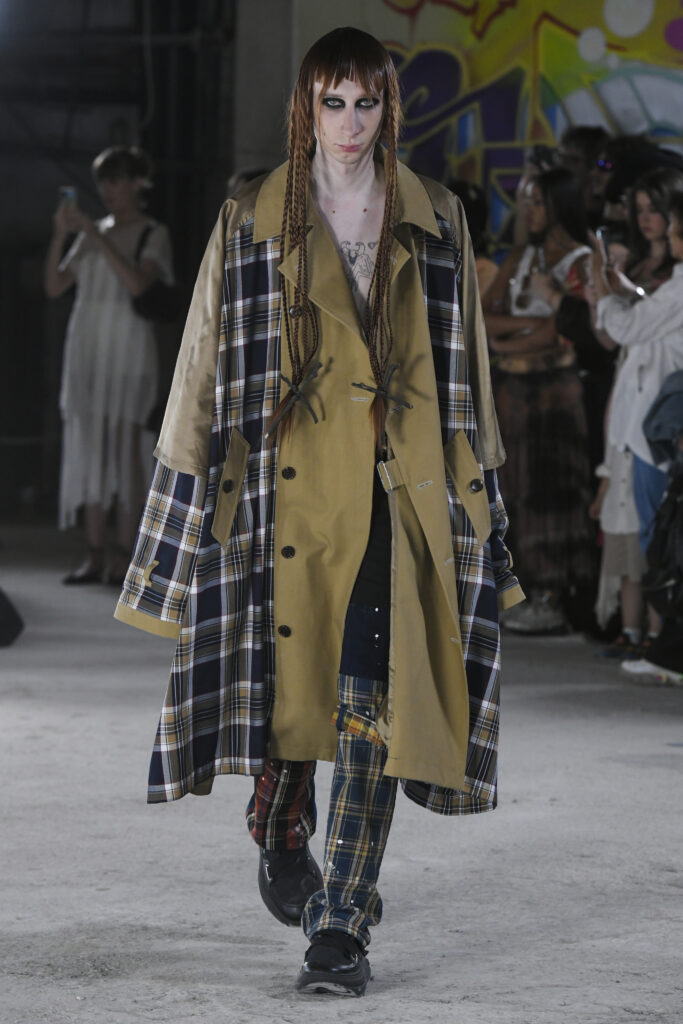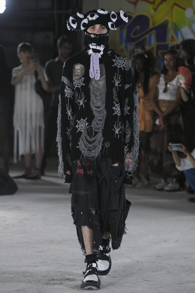 Les vestes oversize patchwork, les robes couture froissées et les pantalons déchirés composent un vestiaire instinctif, où percent la rage et la mélancolie. Les imprimés psychédéliques, le denim délavé et les franges apportent une touche punk décomplexée.