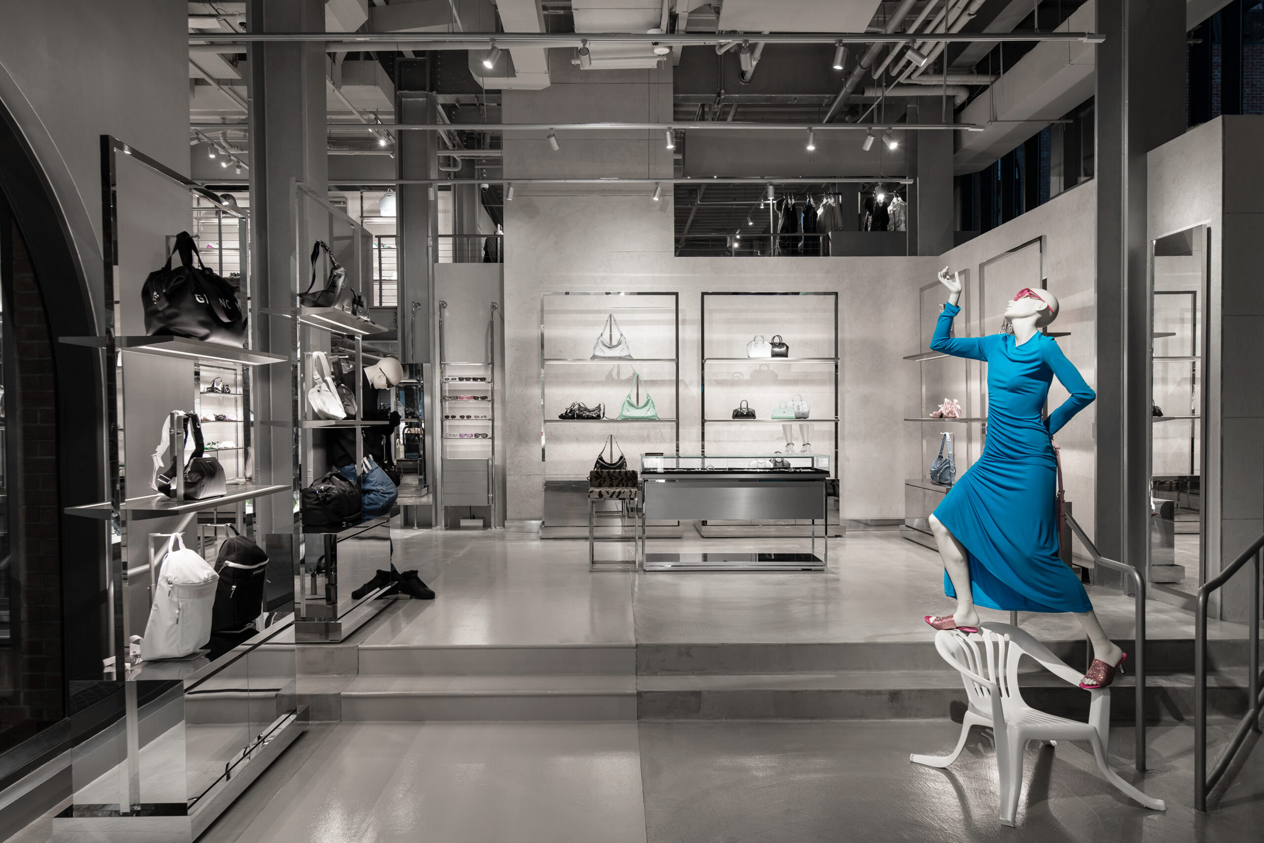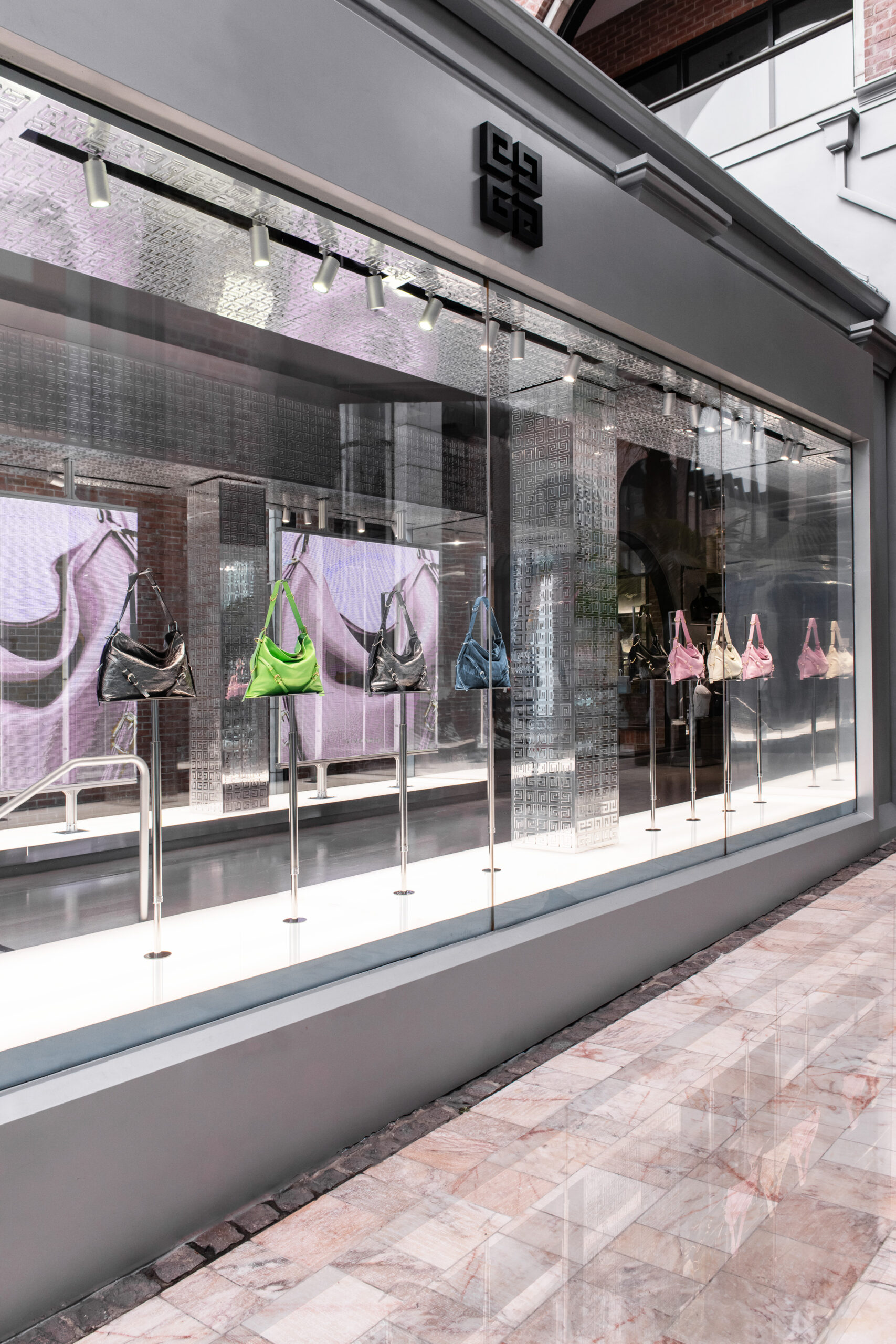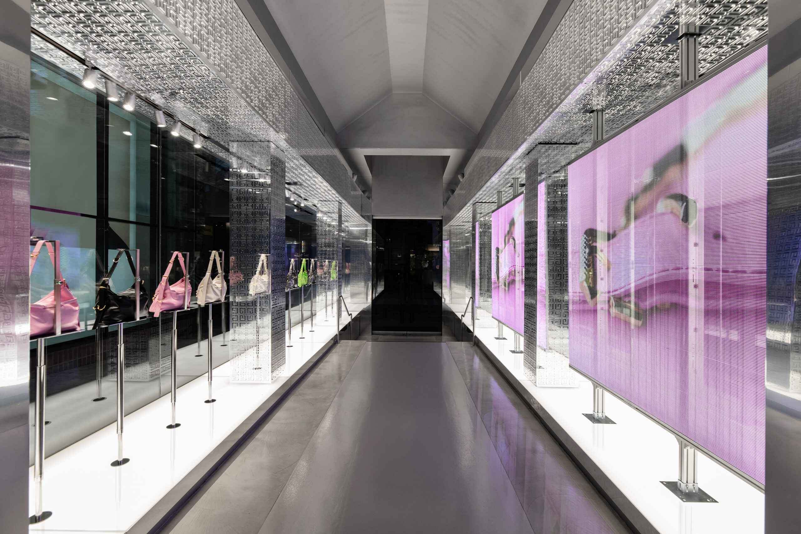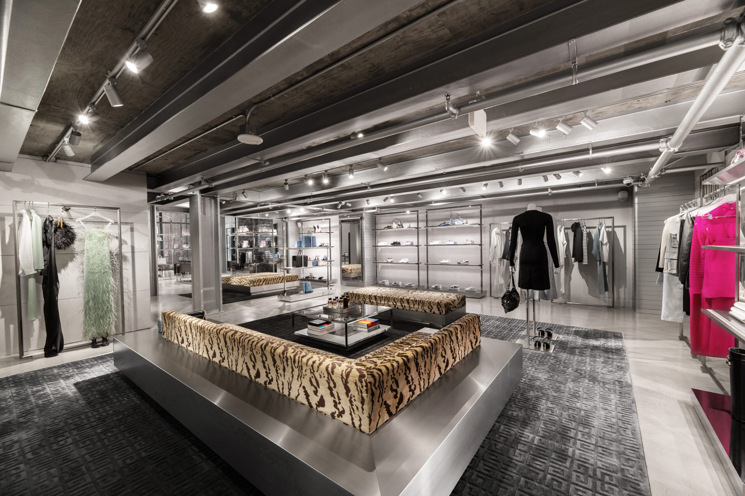 Côté design, la boutique Givenchy sur Rodeo Drive est un bijou d’architecture, avec une sculpture 4G suspendue à sa coupole et des intérieurs miroitants. Le design unique de la boutique brouille les frontières grâce à une approche minimaliste élevée qui joue sur le contraste entre les tons et les matériaux, mêlant le tranchant et le doux, l’industriel et le naturel. Des sculptures conçues en collaboration avec l’artiste britannique Ewan MacFarlane ajoutent une touche dynamique à l’espace, fusionnant art et mode.