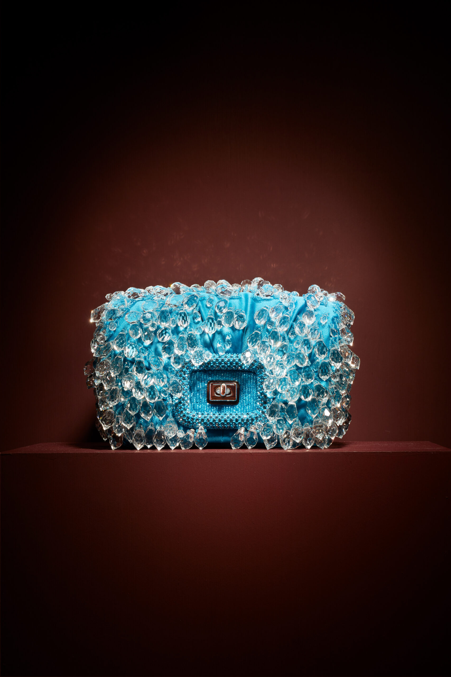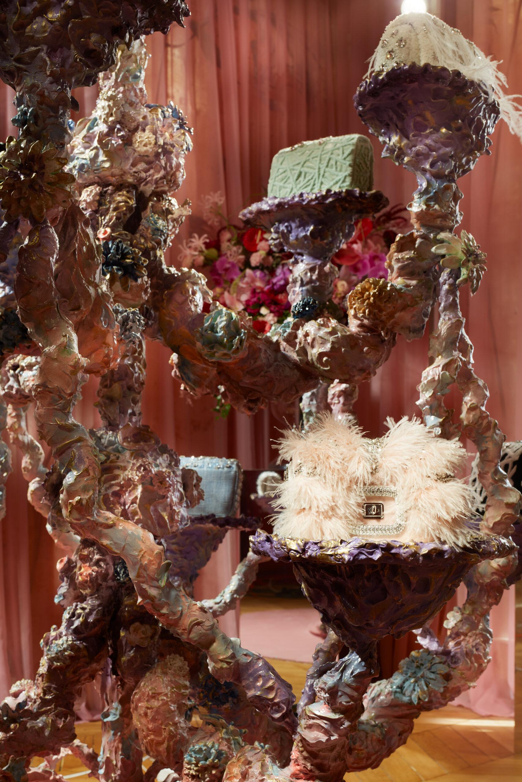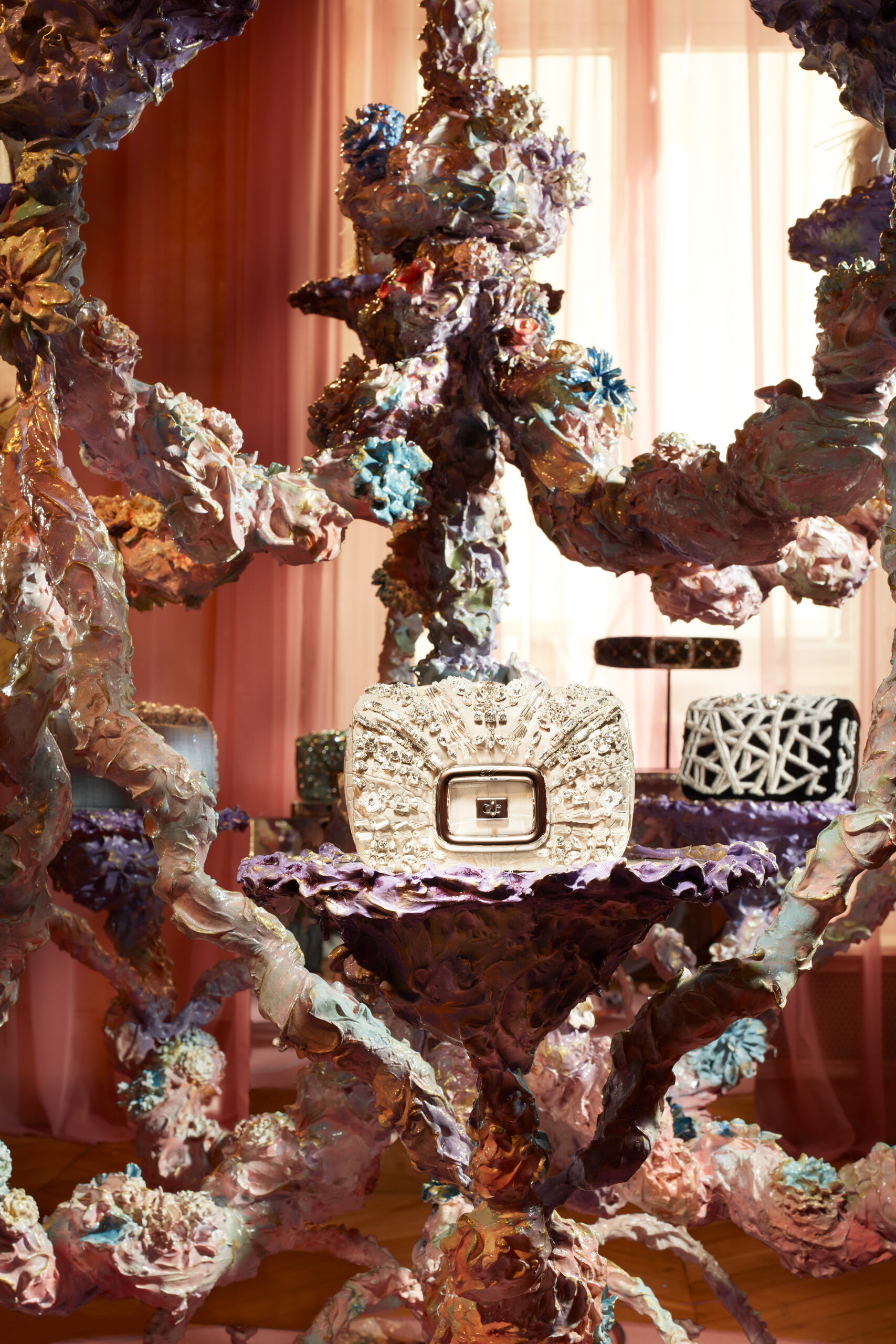 À l’occasion des collections de haute couture automne-hiver 2023 à Paris, la Maison Vivier offre à un public restreint une invitation à découvrir Viv’ Choc Pièce Unique. Cette collection rêveuse de sacs à main uniques, créée par le directeur créatif Gherardo Felloni, explore les sommets du savoir-faire français le plus aspirant. Chaque création, une délicate fantaisie de broderie et de textiles précieux, est exposée sur un magnifique lustre en céramique aux couleurs variées à l’intérieur de la Salle d’Argent de la Maison Vivier à Paris.