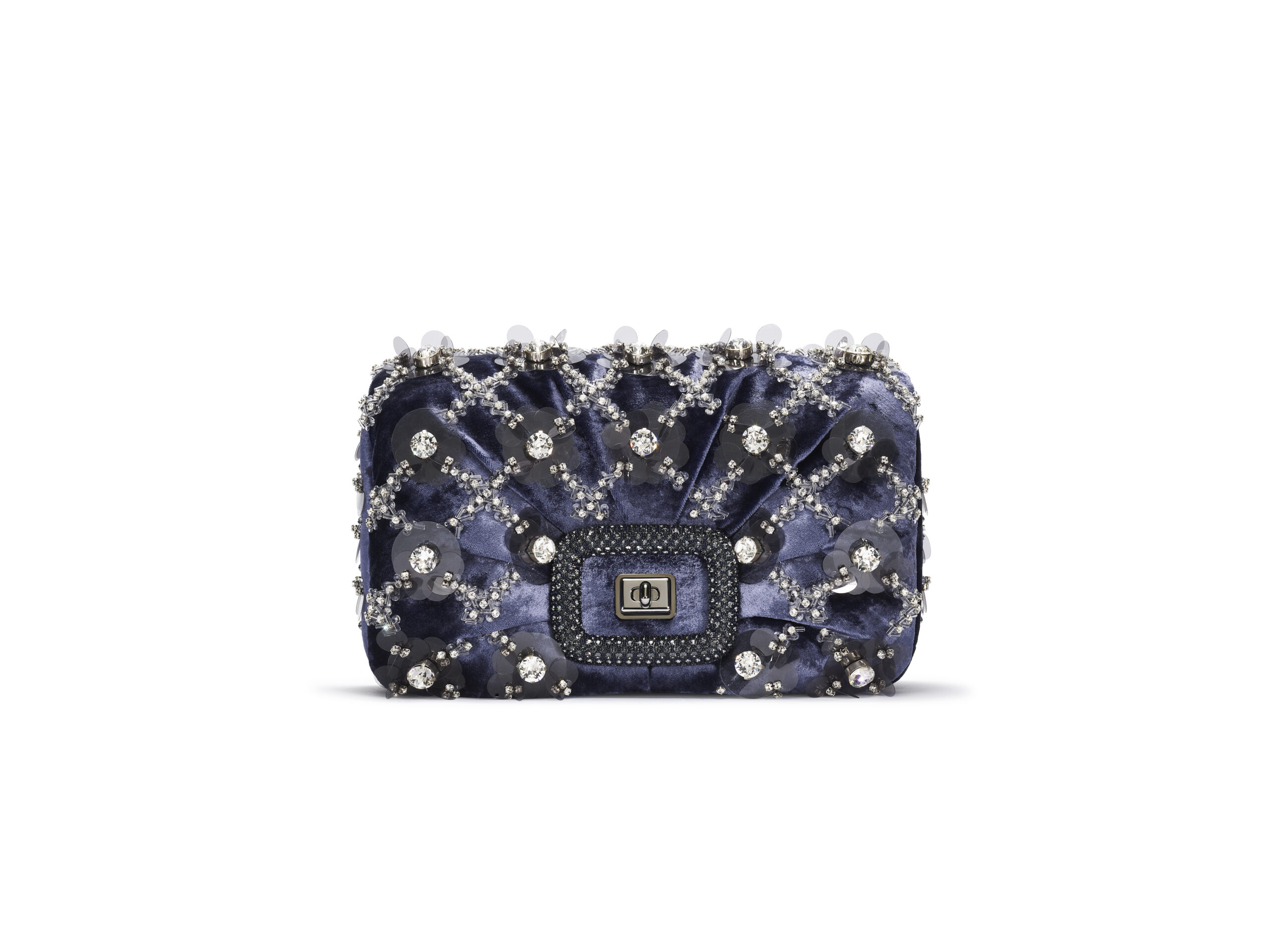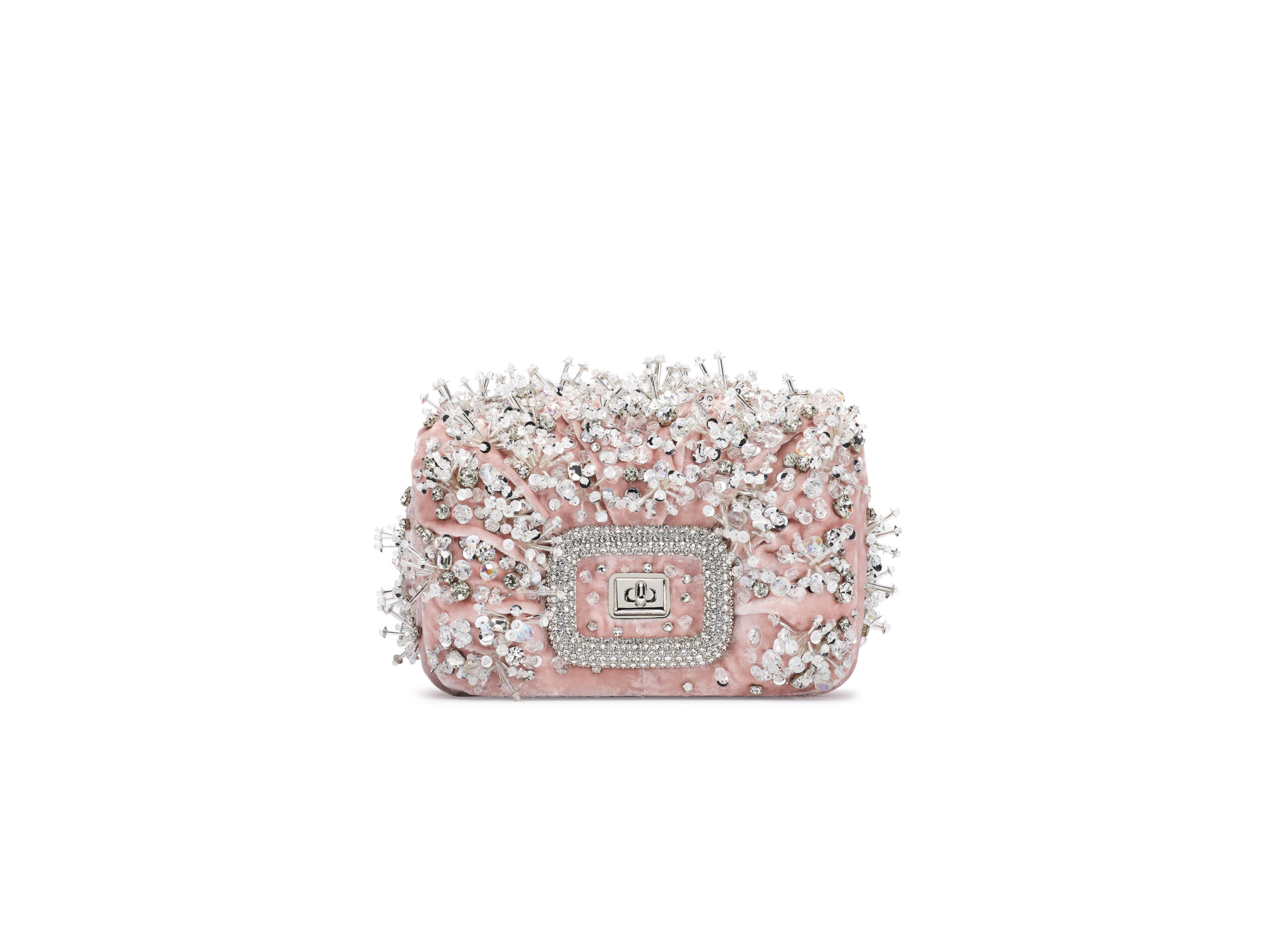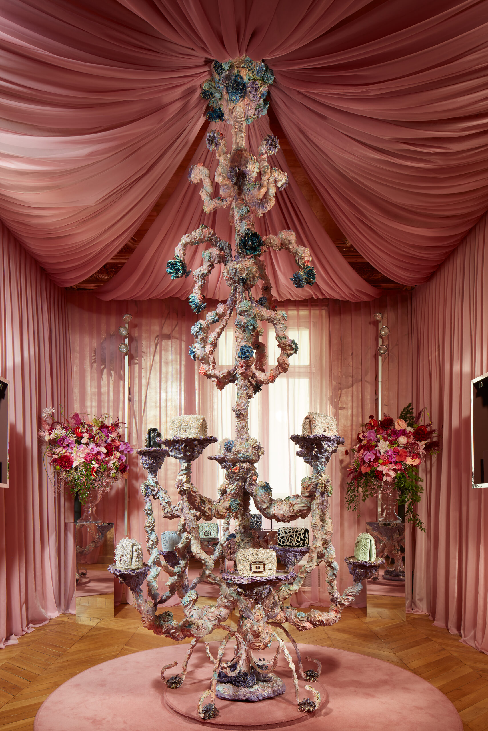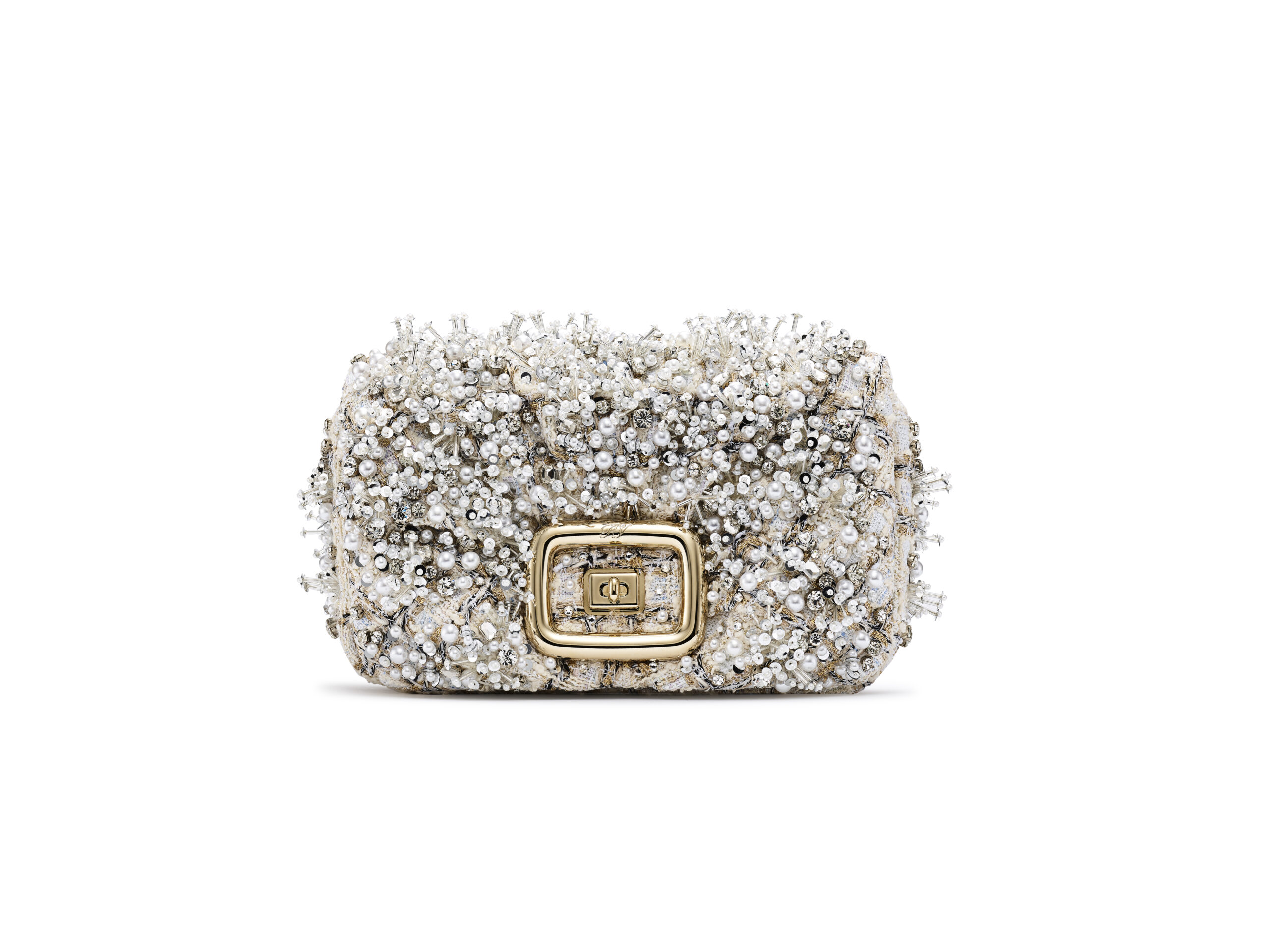Dans une échelle standard et miniature, chaque pièce est montée et brodée à la main, avec jusqu’à 13 000 perles et cristaux appliqués à la main. Parmi eux, des techniques complexes mettent en avant des motifs et des textures florissantes, allant de perles de bugle en treillis et de maille de tulle cristalline à des grappes de perles naturelles et de strass qui frissonnent en tremblant.