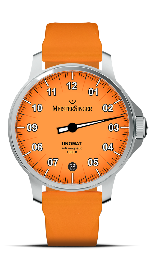 L’Unomat se distingue par son cadran orange, animé par une seule aiguille qui indique les heures et les minutes via 144 segments de 5 minutes. Les chiffres et les index appliqués brillent dans l’obscurité, tout comme l’aiguille elle-même, grâce à un revêtement lumineux. Le bracelet en caoutchouc, de la même couleur éclatante que le cadran, est résistant, flexible et facile à nettoyer, accentuant le look sportif de la montre tout en garantissant un confort optimal.