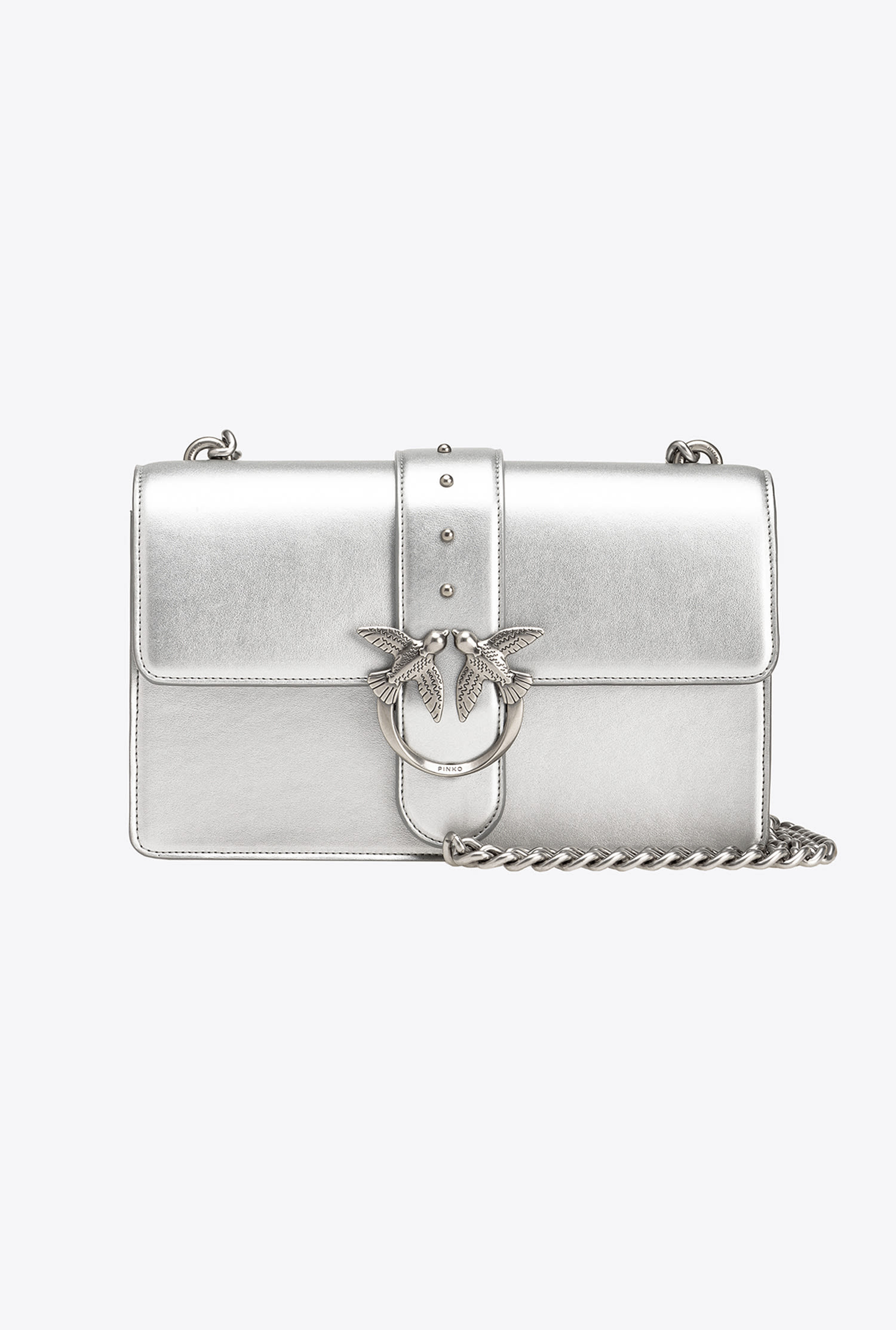 Le sac « Eva » est doté de la célèbre boucle Love en forme d’anneau, ornée de deux petits oiseaux, un symbole emblématique de la marque PINKO. De plus, le sac comporte des mini clous en forme de pomme, rappelant la matière première innovante utilisée pour sa fabrication.