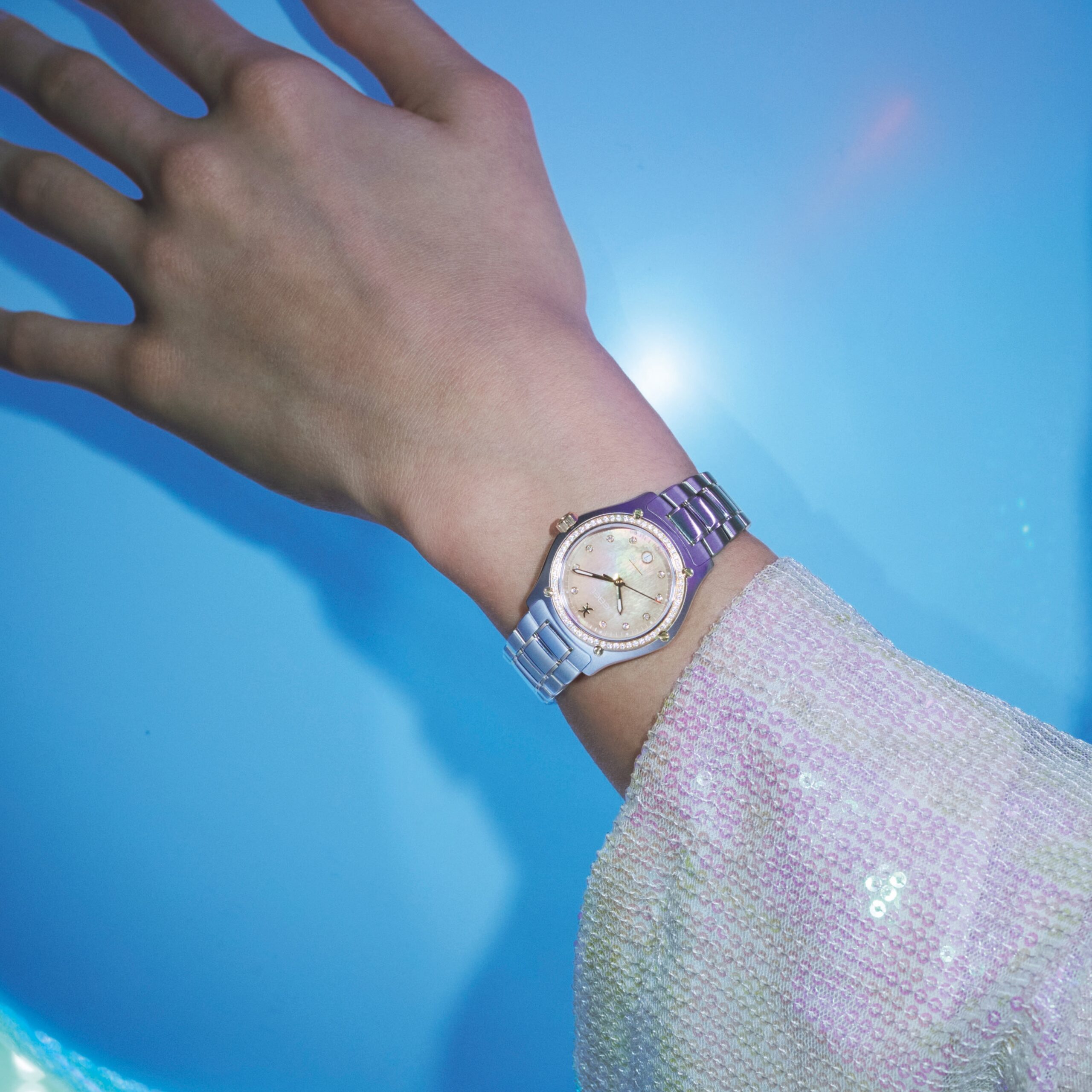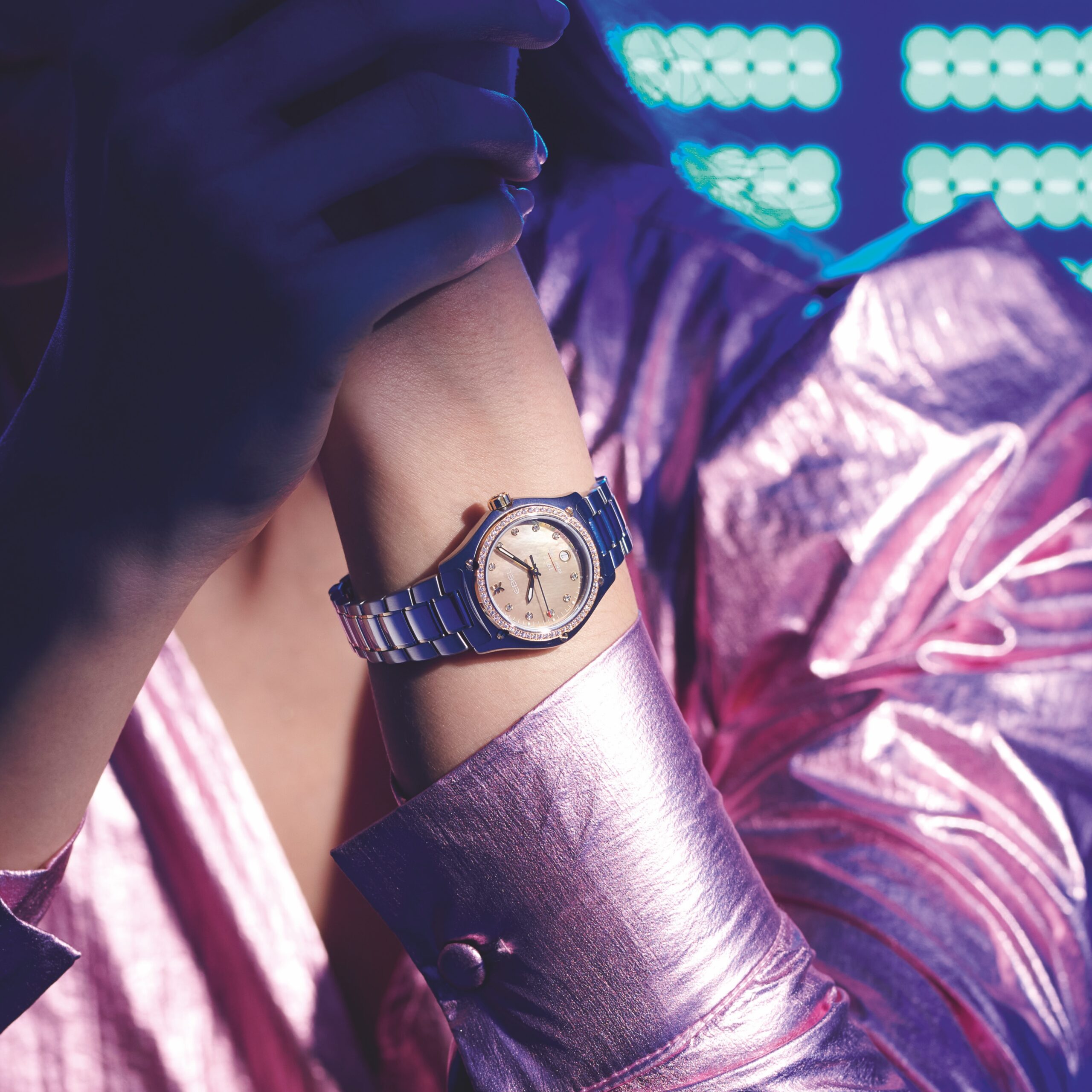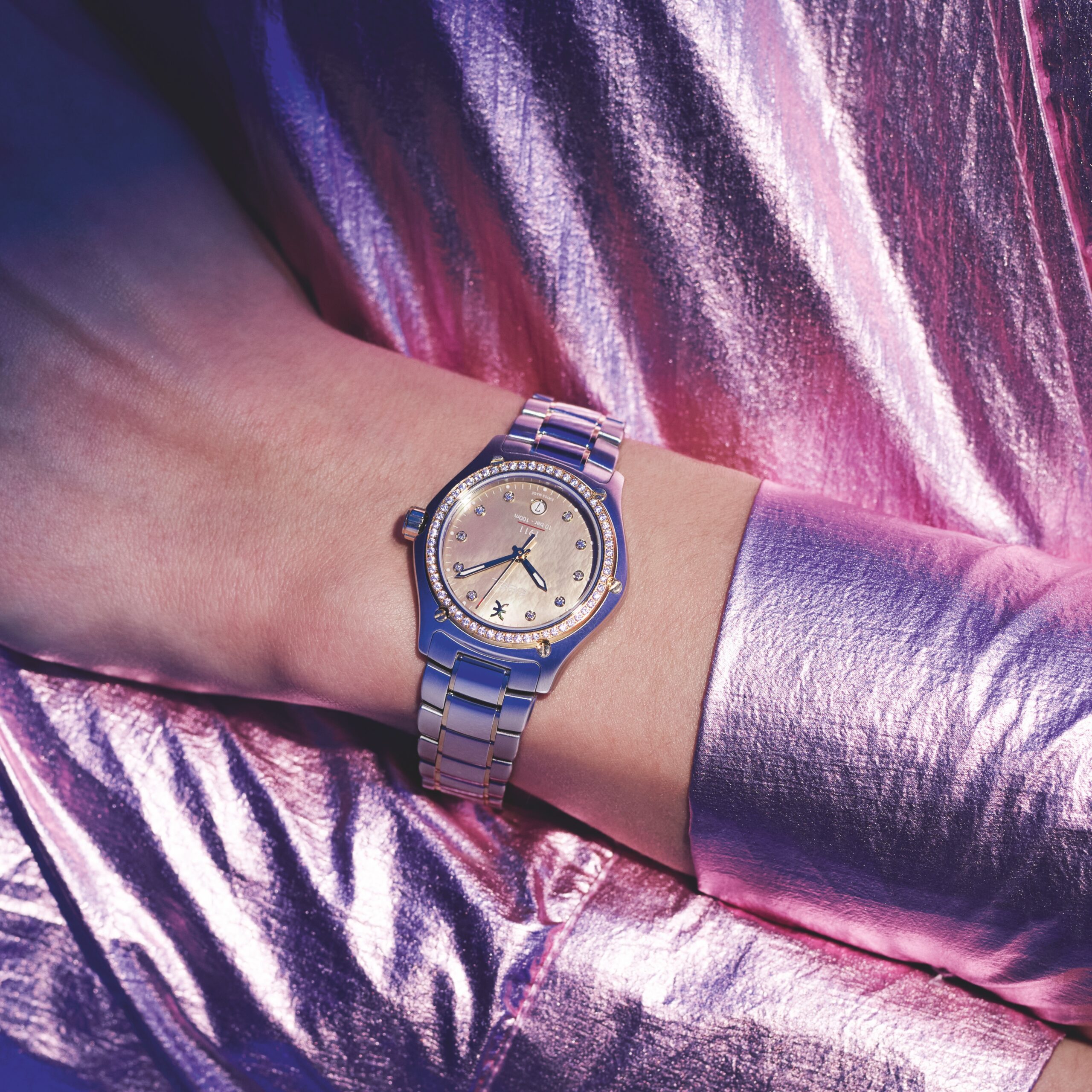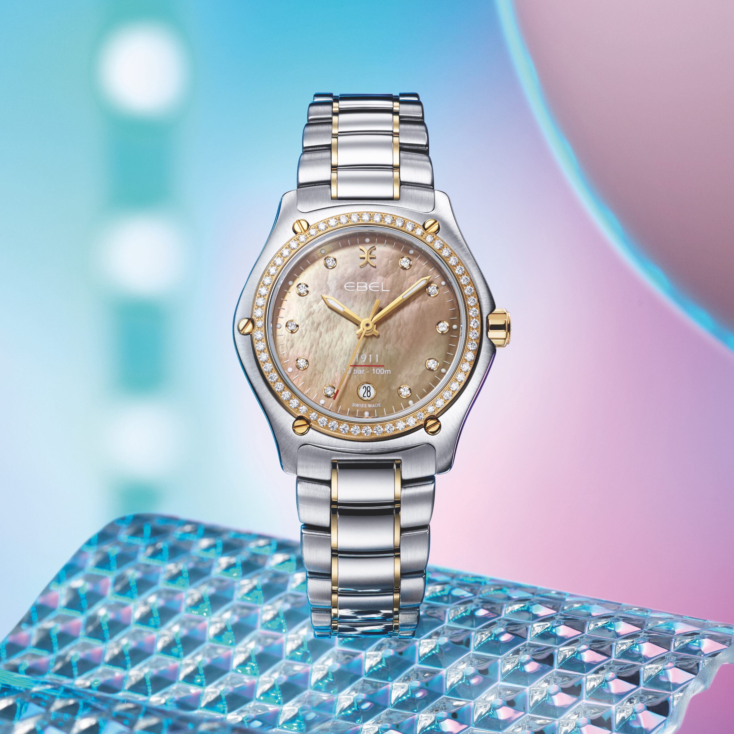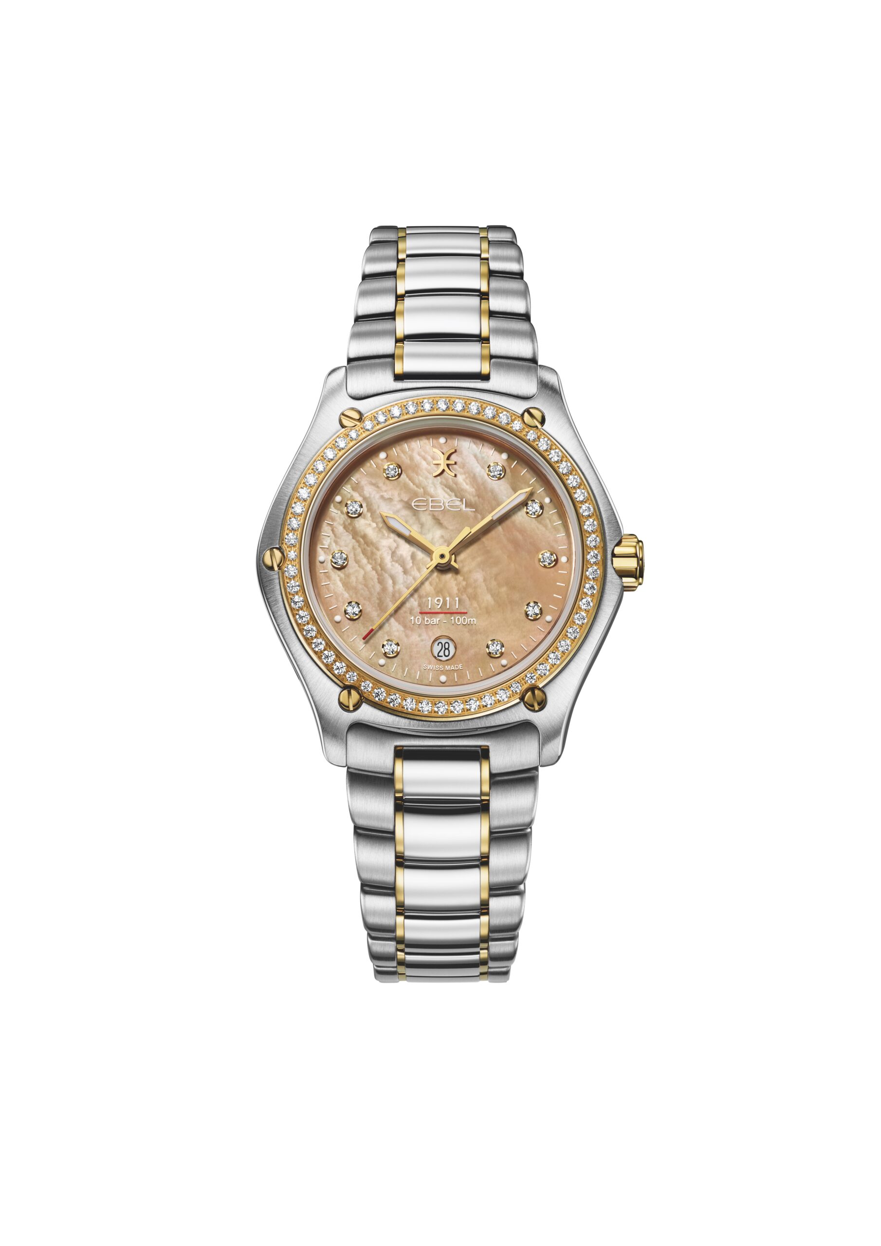 EBEL dévoile sa nouvelle montre EBEL 1911 en nacre beige avec index et une lunette diamants. Elle est dotée d’un deuxième bracelet beige en tissu recyclé.