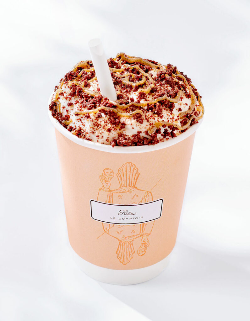 - Transformant l’entremets marbré en boisson pâtissière avec lait biscuité, caramel, vanille et crumble de cacao.
